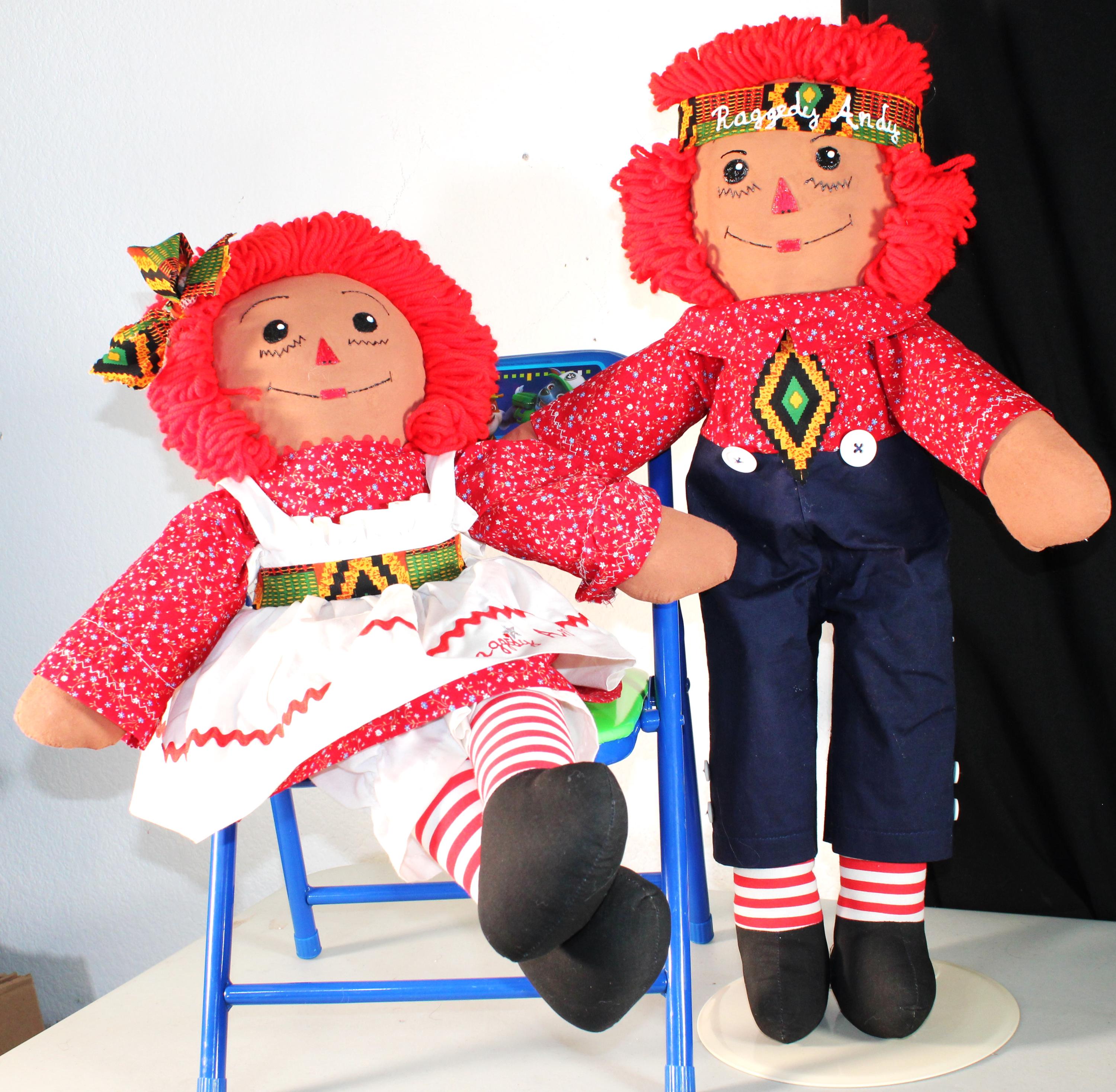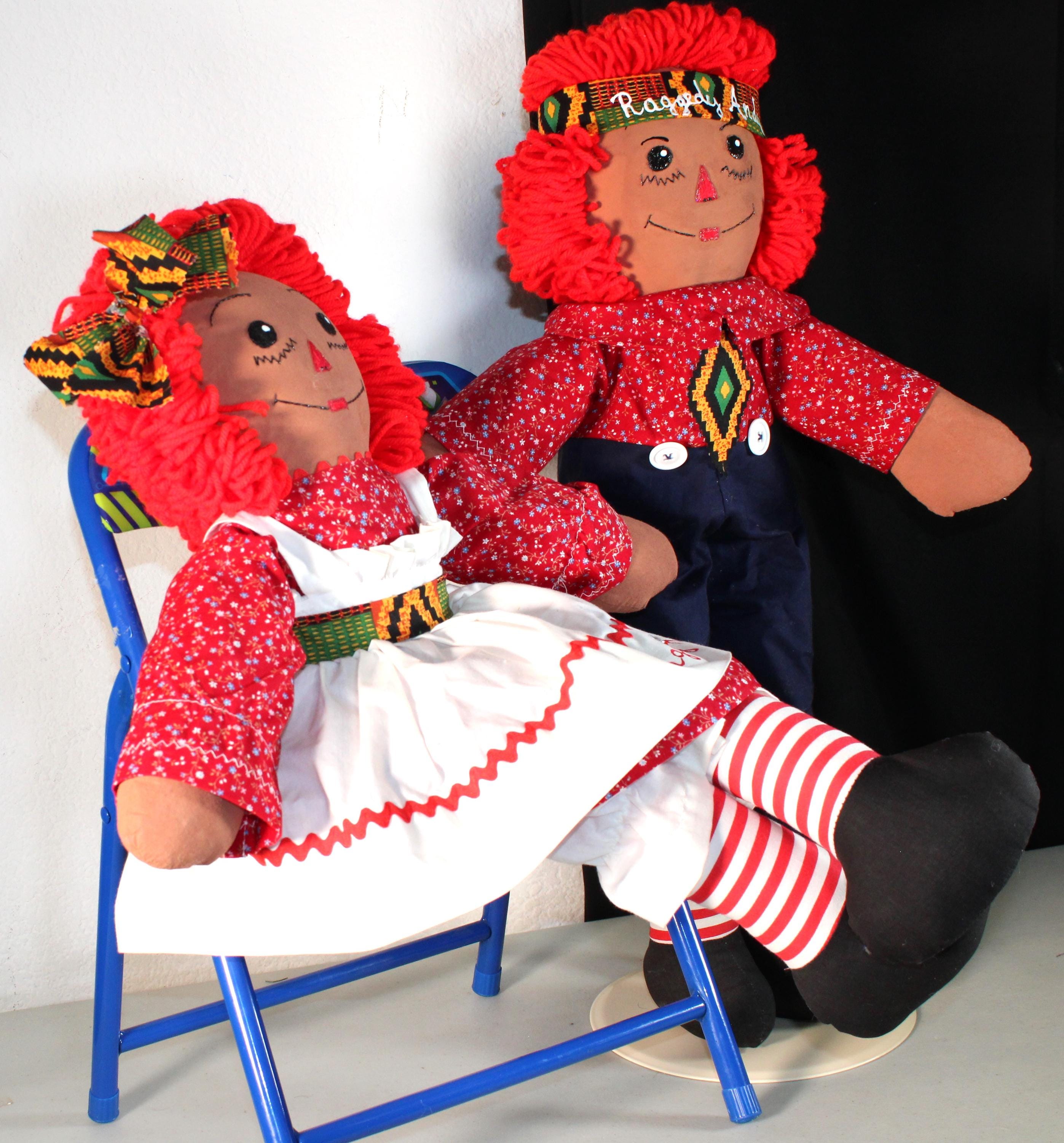 A pair of Large (24") African American (caramel colored) Raggedy Ann/ Andy dolls with colorful dress and britches with a touch of African print. Matching shirt and headband. Bright red yard hair. Made of fabric. Handpainted. Folding Chair included.