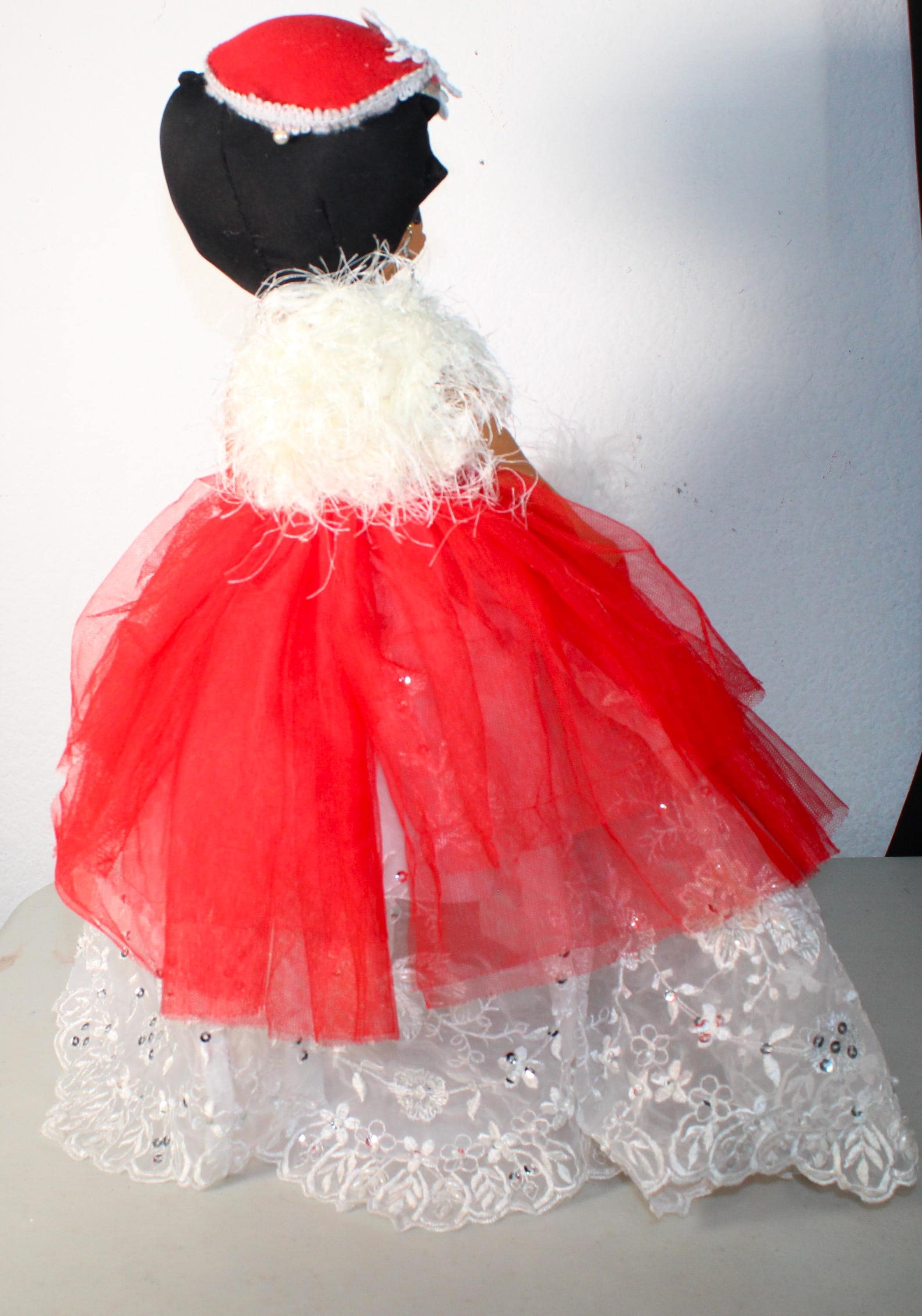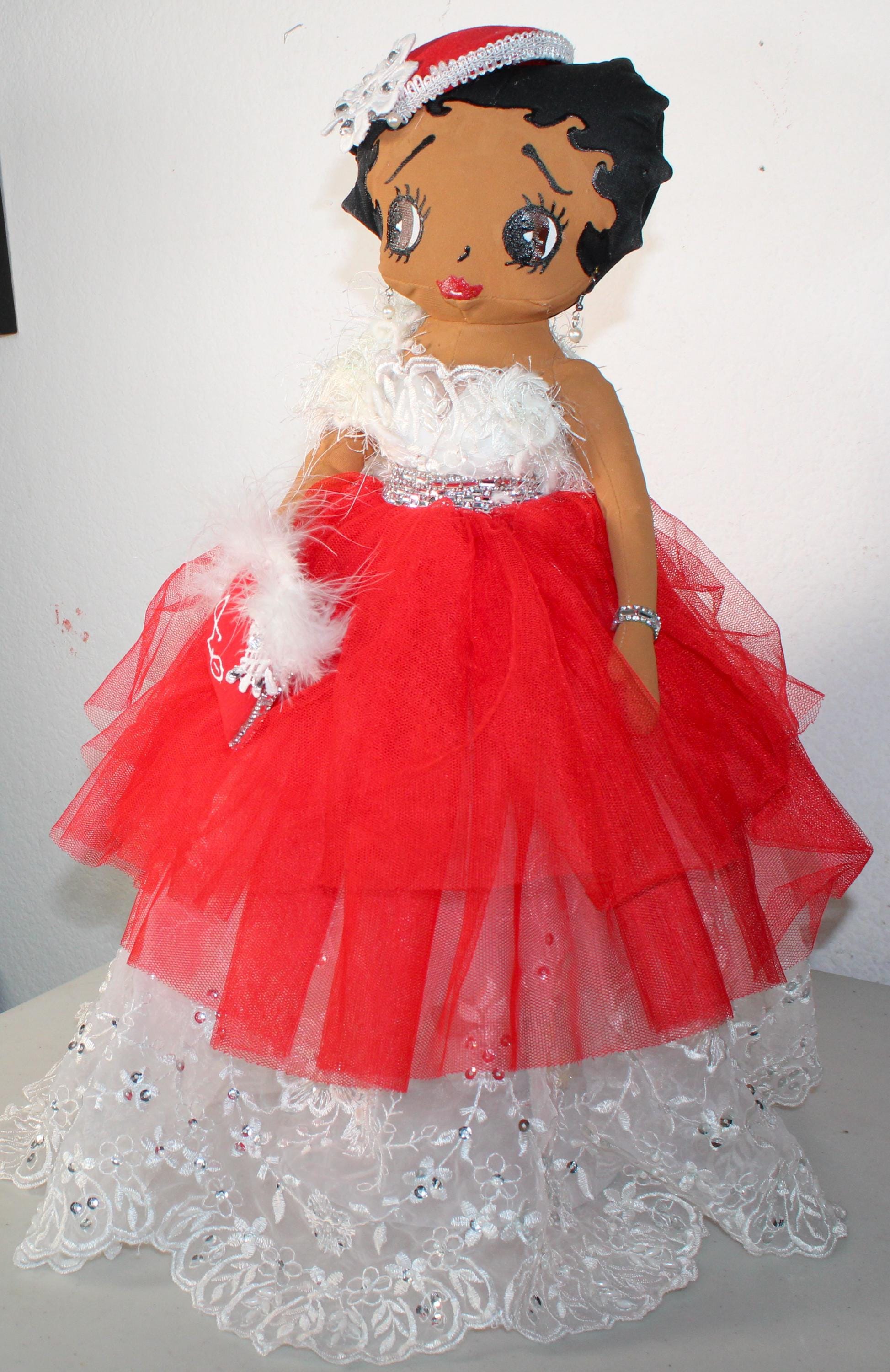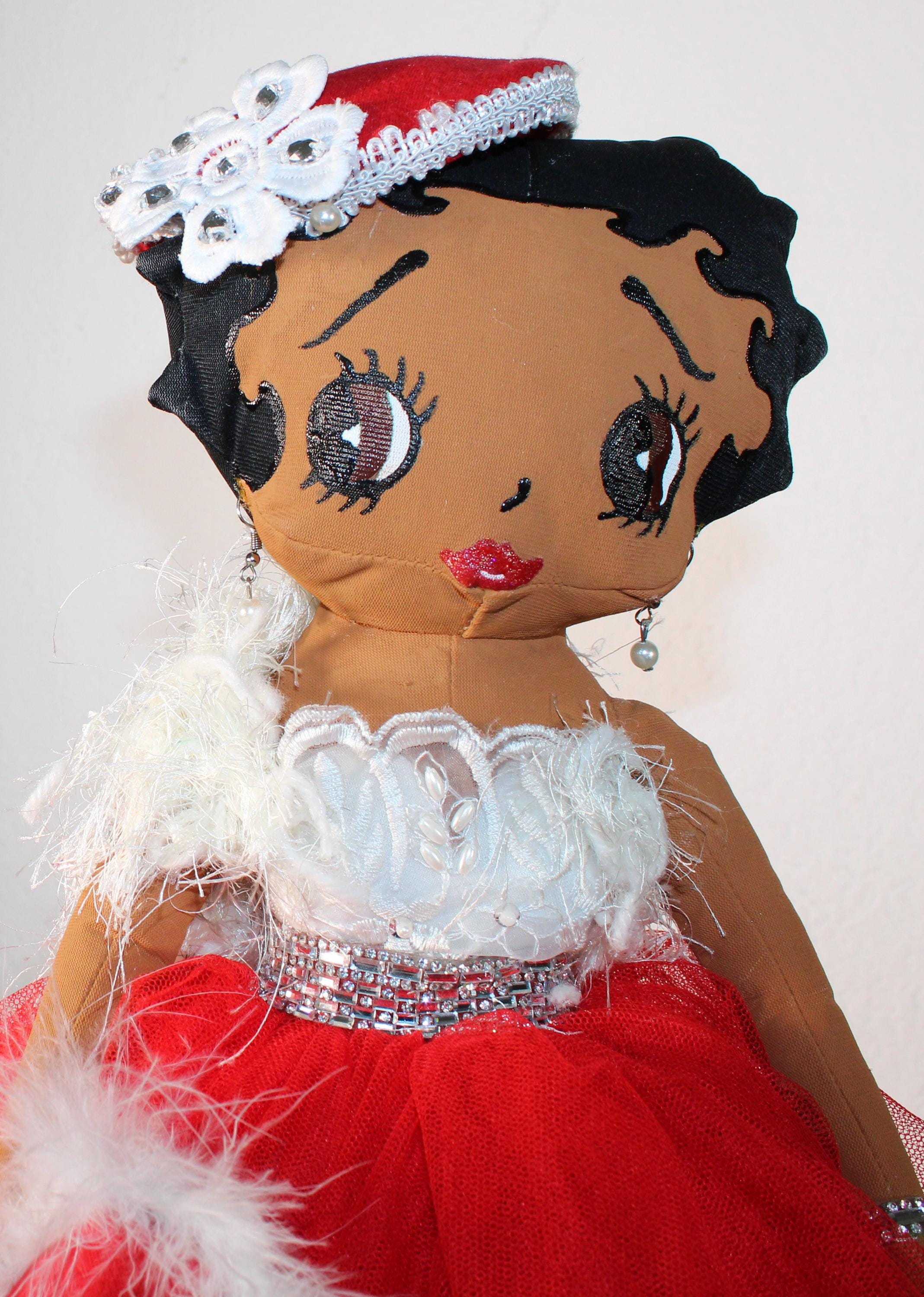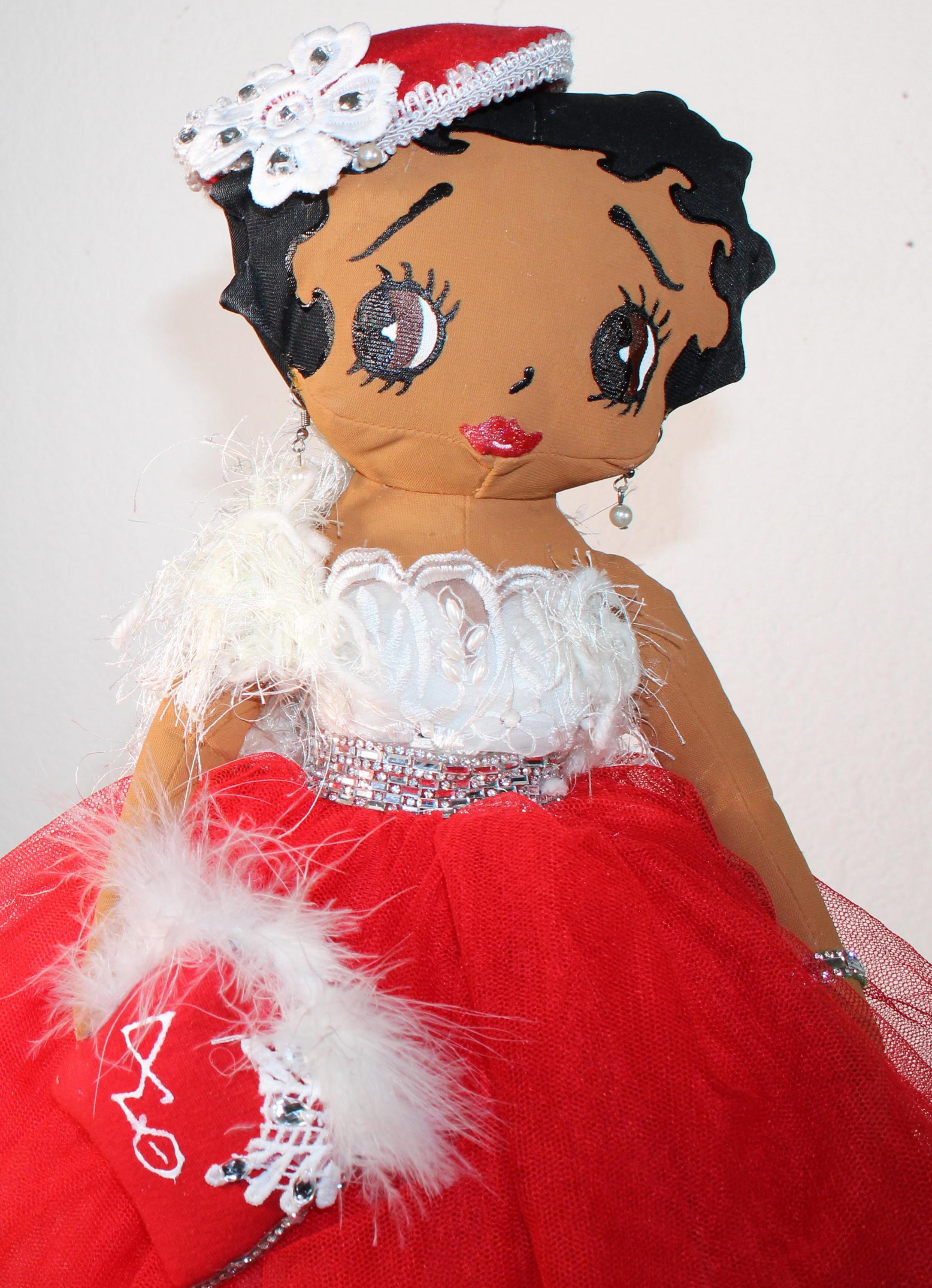 "DELTA Soror".....A 17" African American Betty Boop Soror. Dressed in an evening ball gown featuring signature colors. Embellished with feathered trim, rhinestones and florals. Accent faux fur wrap, matching hat and handbag. Dangle earrings and satin shoes to complete the look.