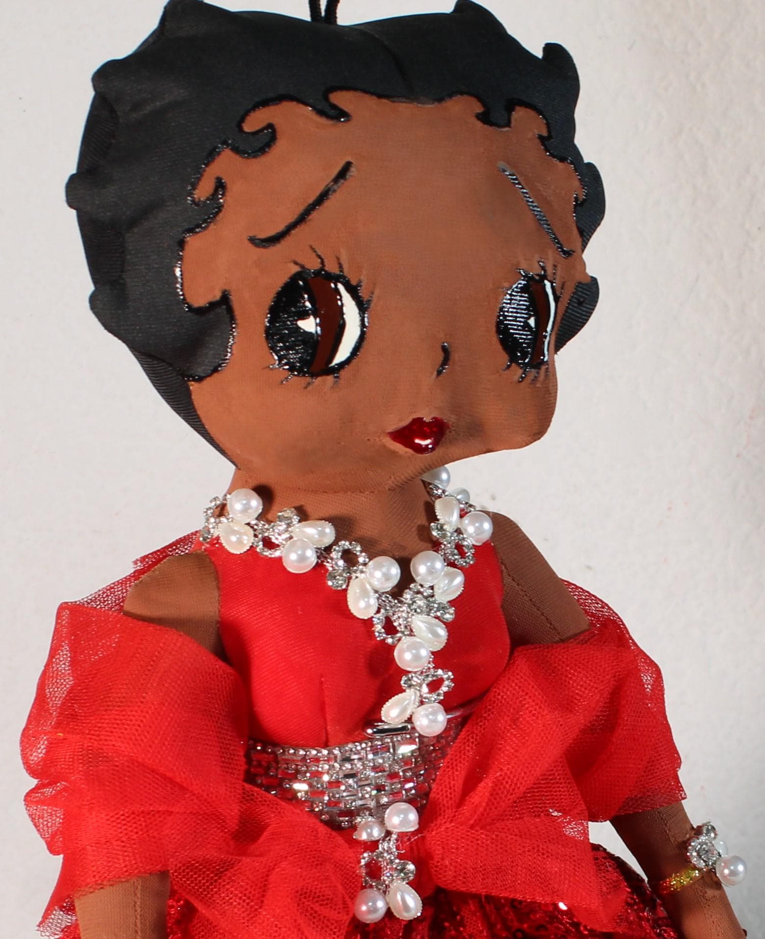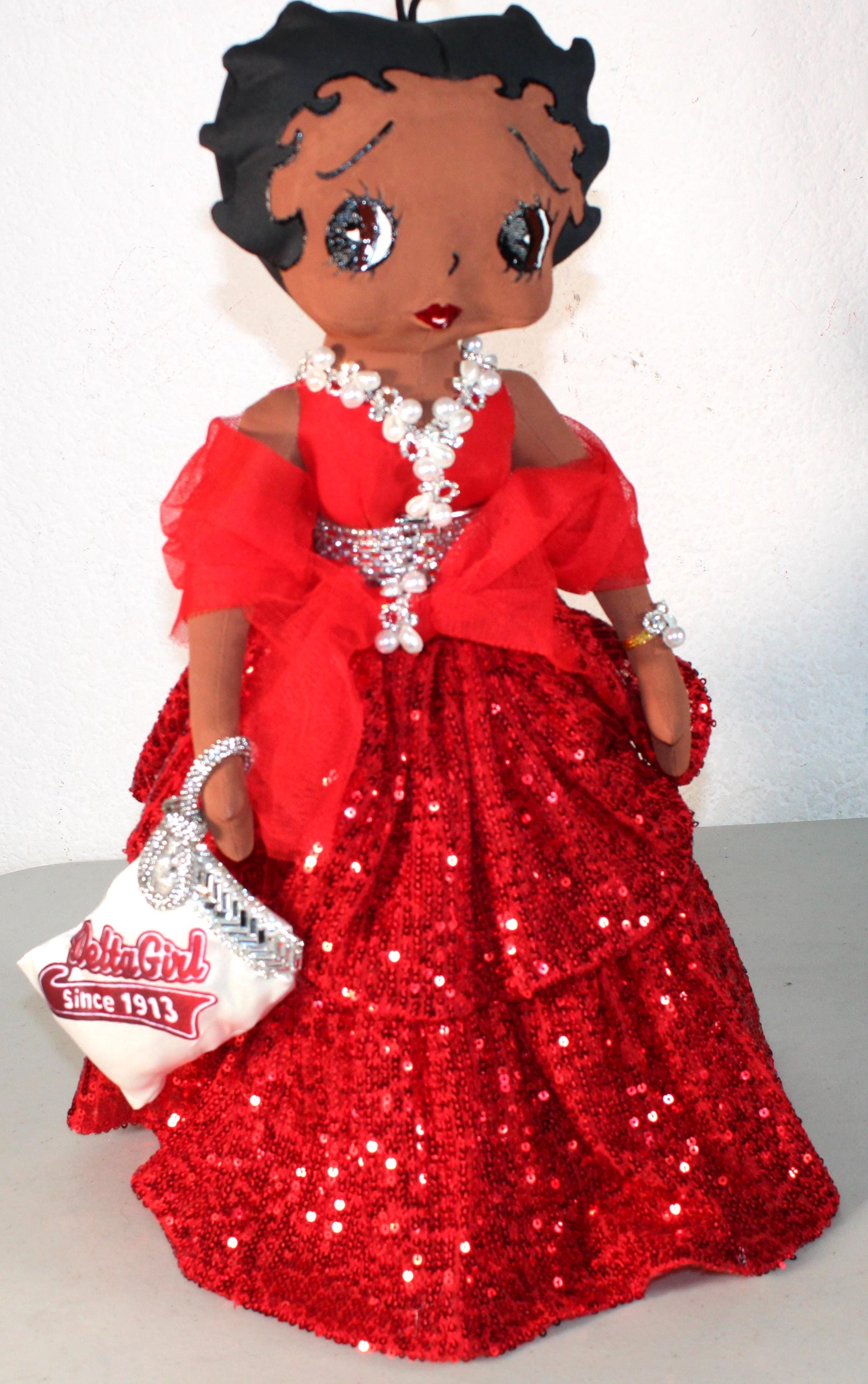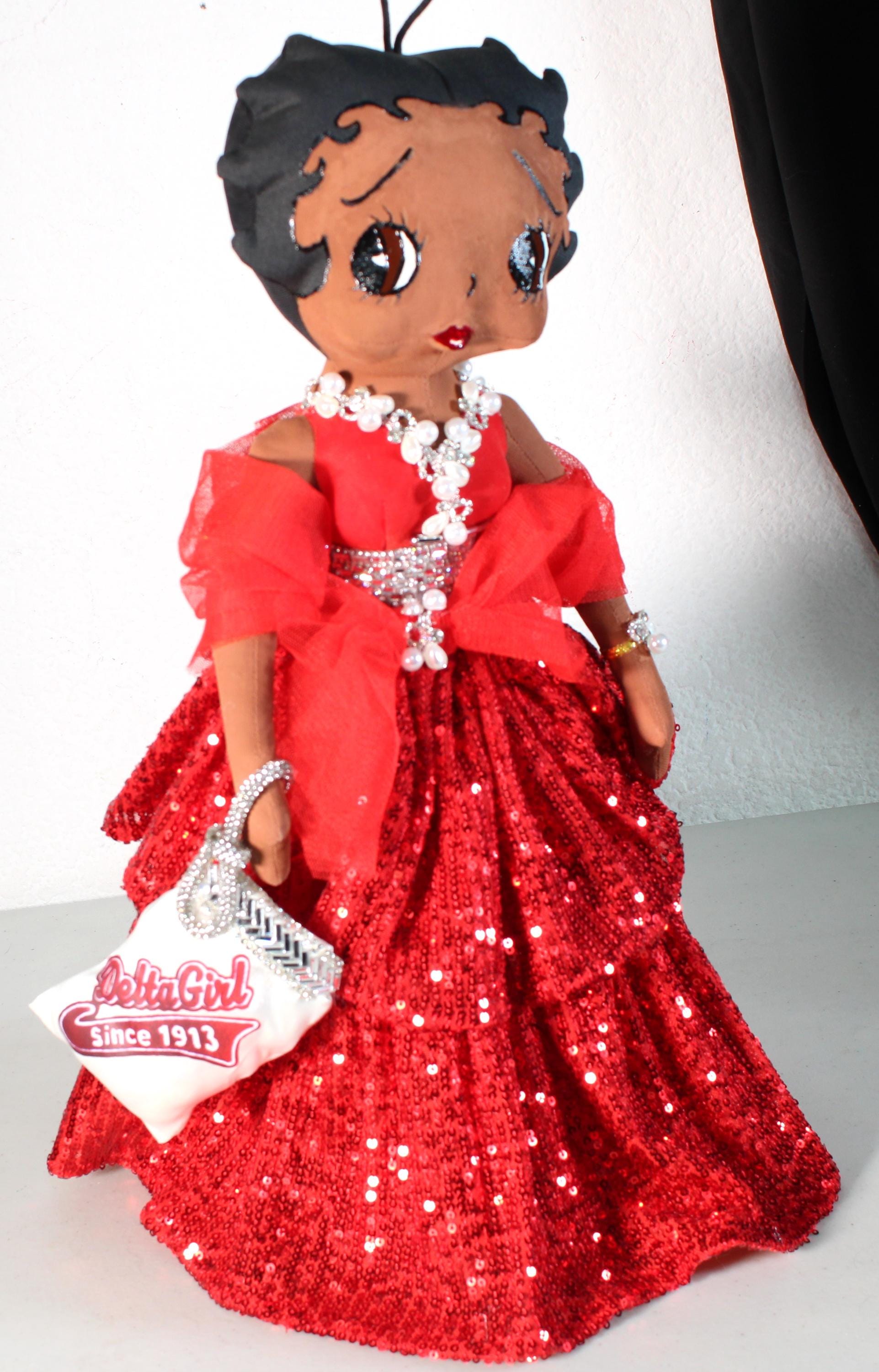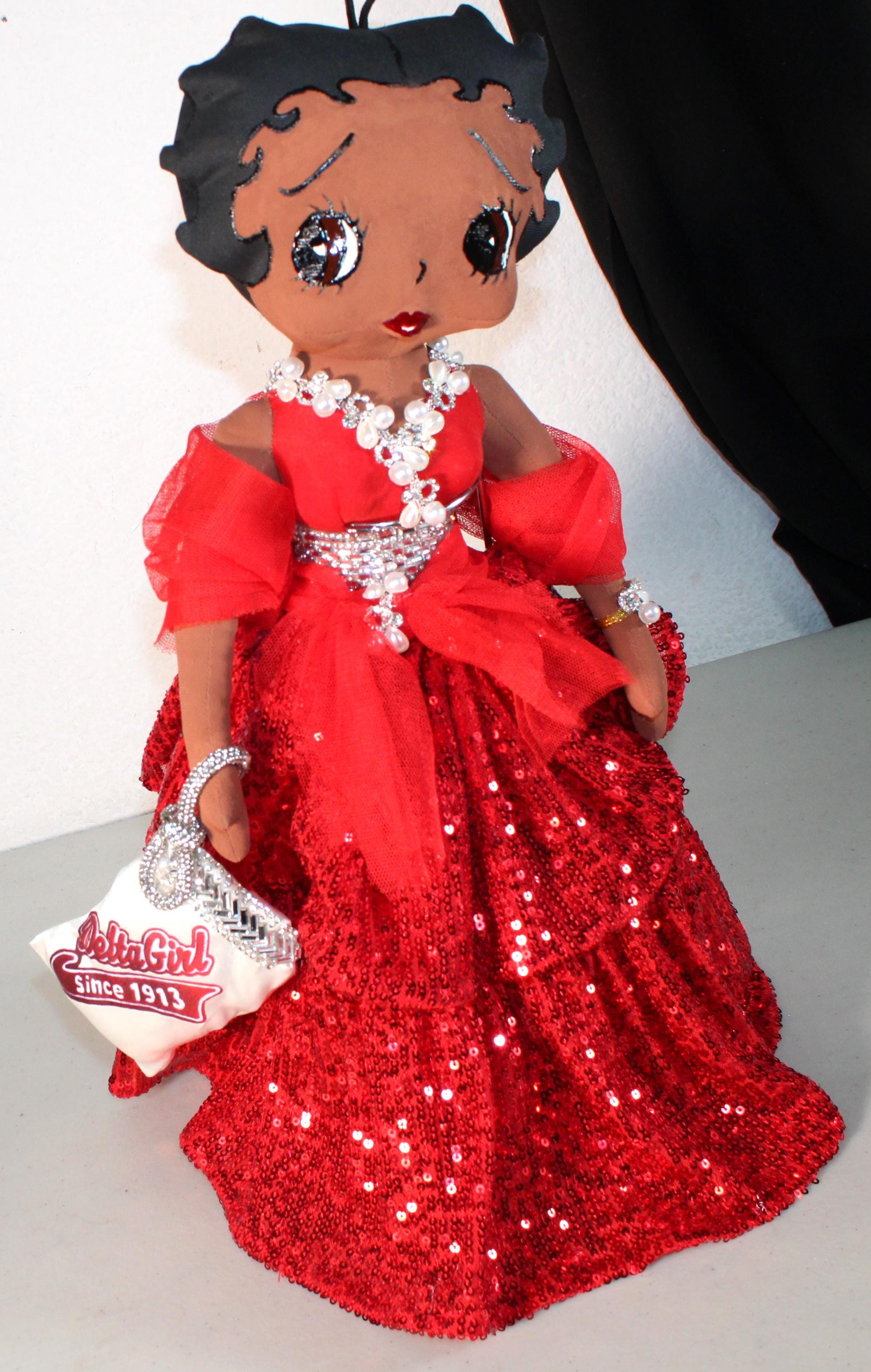 "DELTA Soror".....A 17" African American Betty Boop Soror. Dressed in an evening ball gown featuring signature colors. Accented with jewels and rhinestones and florals. Accent shawl and logo handbag. Satin shoes and earrings to complete the look. Made of handpainted fabric.