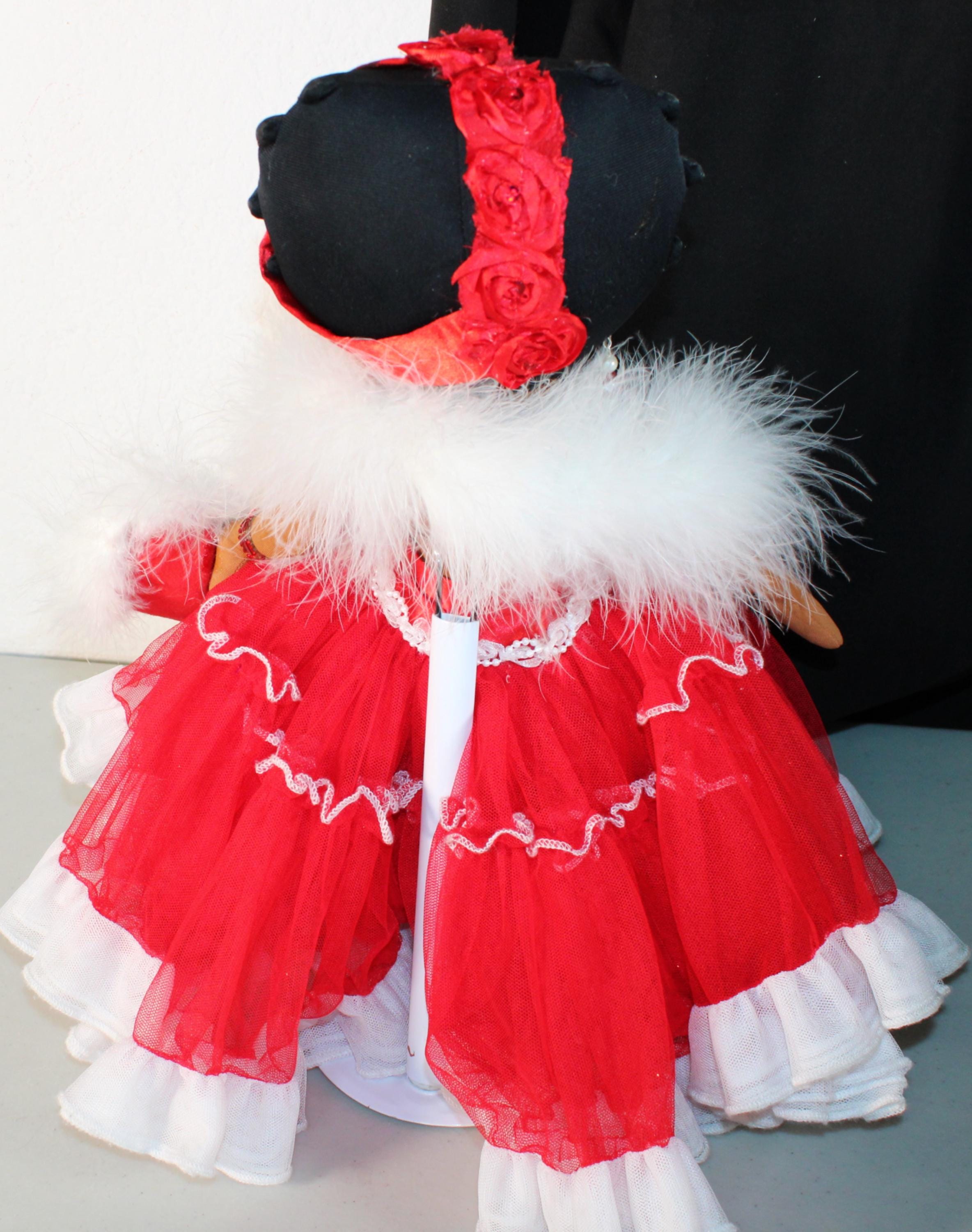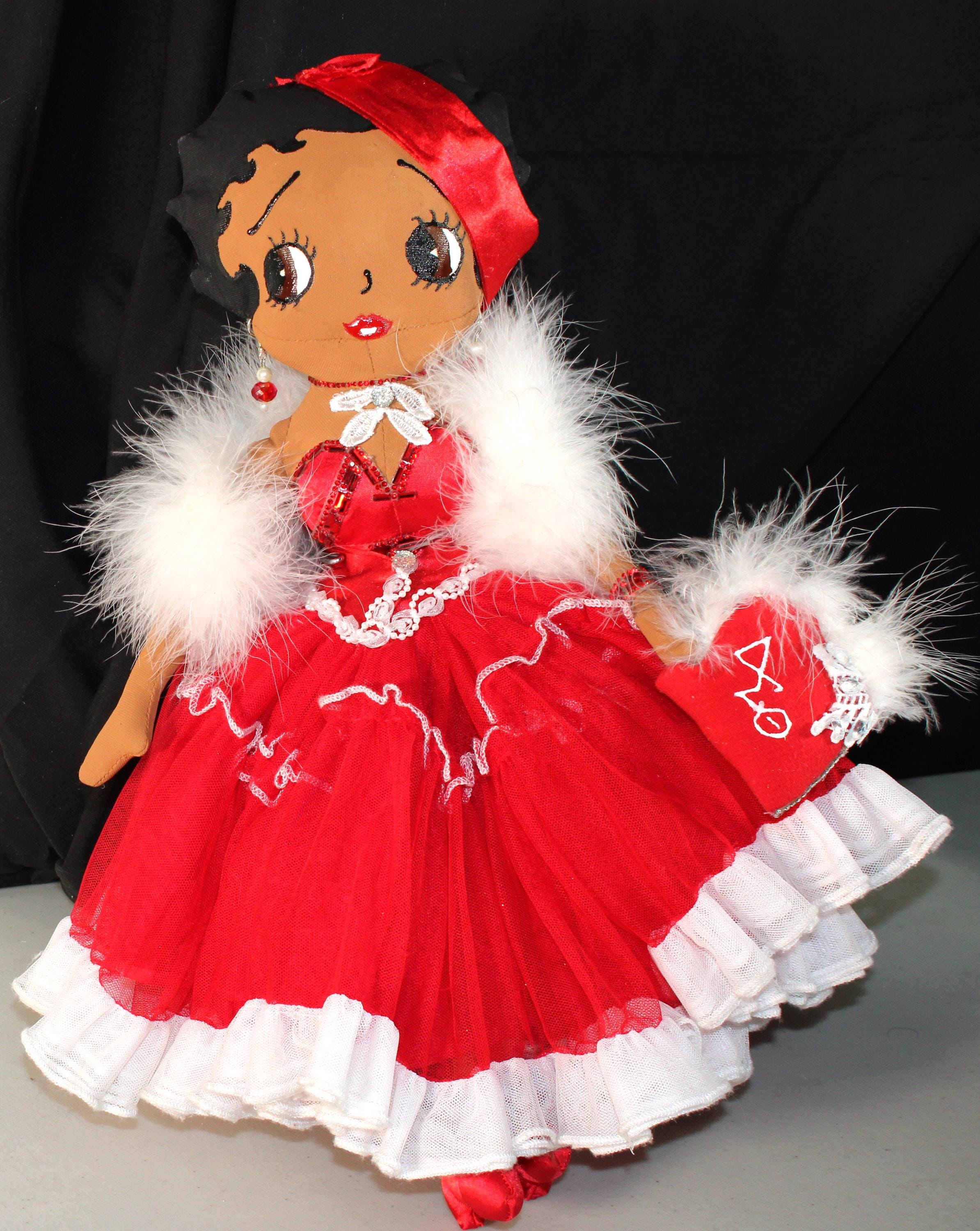 "DELTA Soror".....A 16" African American Betty Boop. Dressed in an evening ensemble featuring signature colors accented with beading and pearl lace trim. Embellished bustier and handbag bearing the Delta logo. Ribbon headband and crystal dangle earrings with boa feather shawl satin shoes to complete the look.
