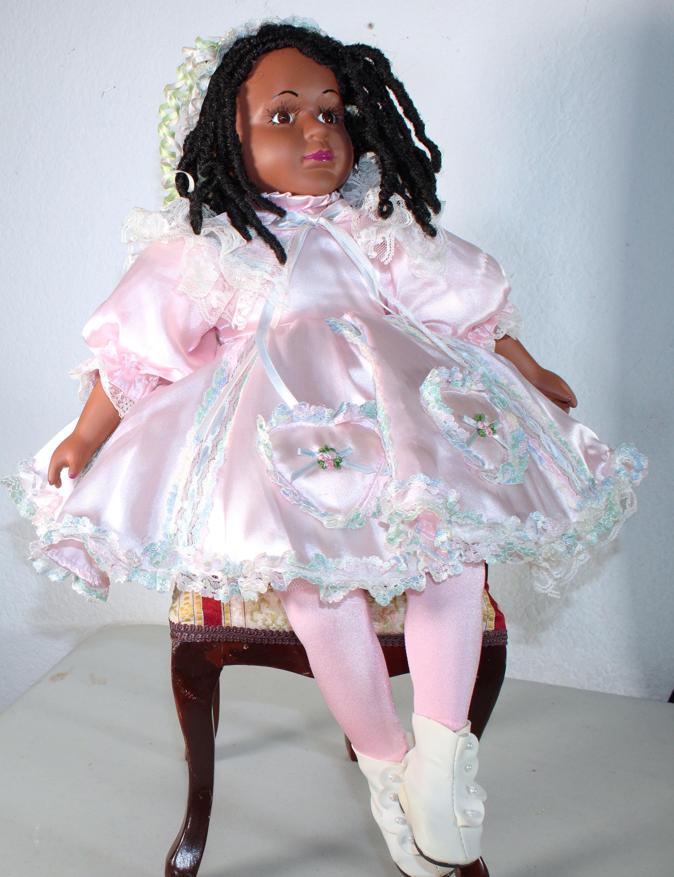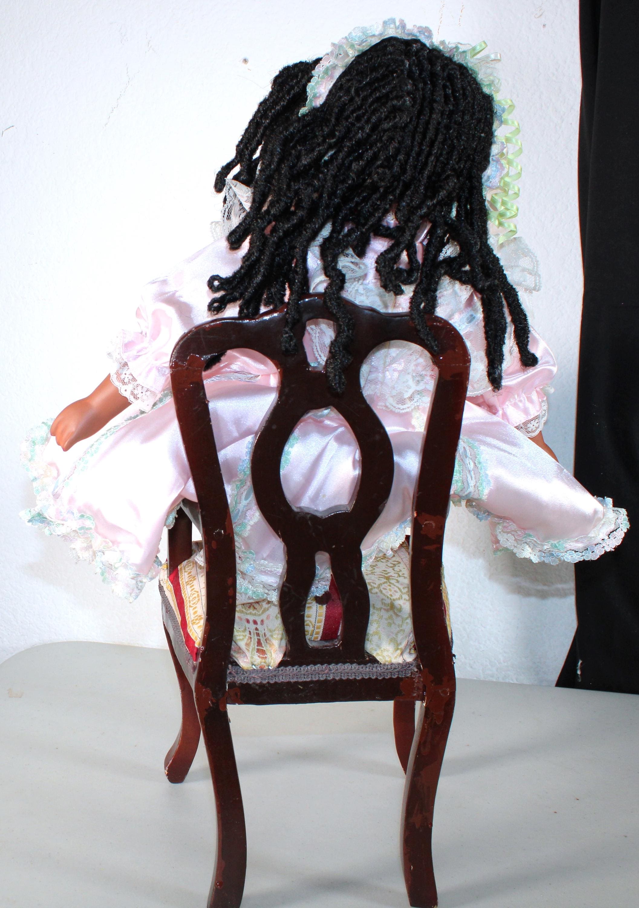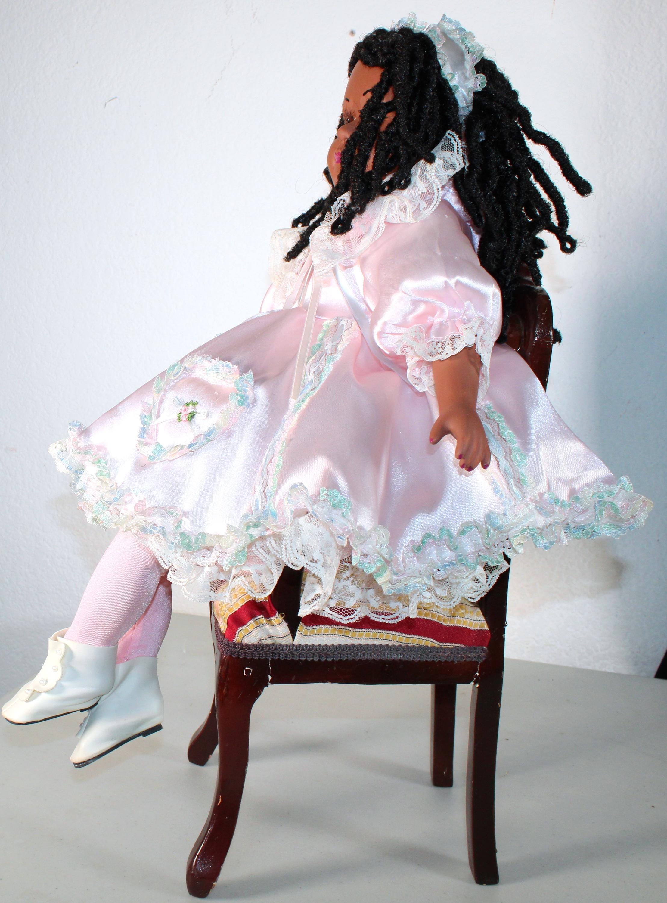 SHANNA....A 21" Porcelain Doll all pretty in pink and ready for the tea party. Matching boots, tights and accessories. Long black curly coiled hair with matching floral headband. Made of handpainted porcelain and fabric. Tea cup, saucer and chair comes with.
