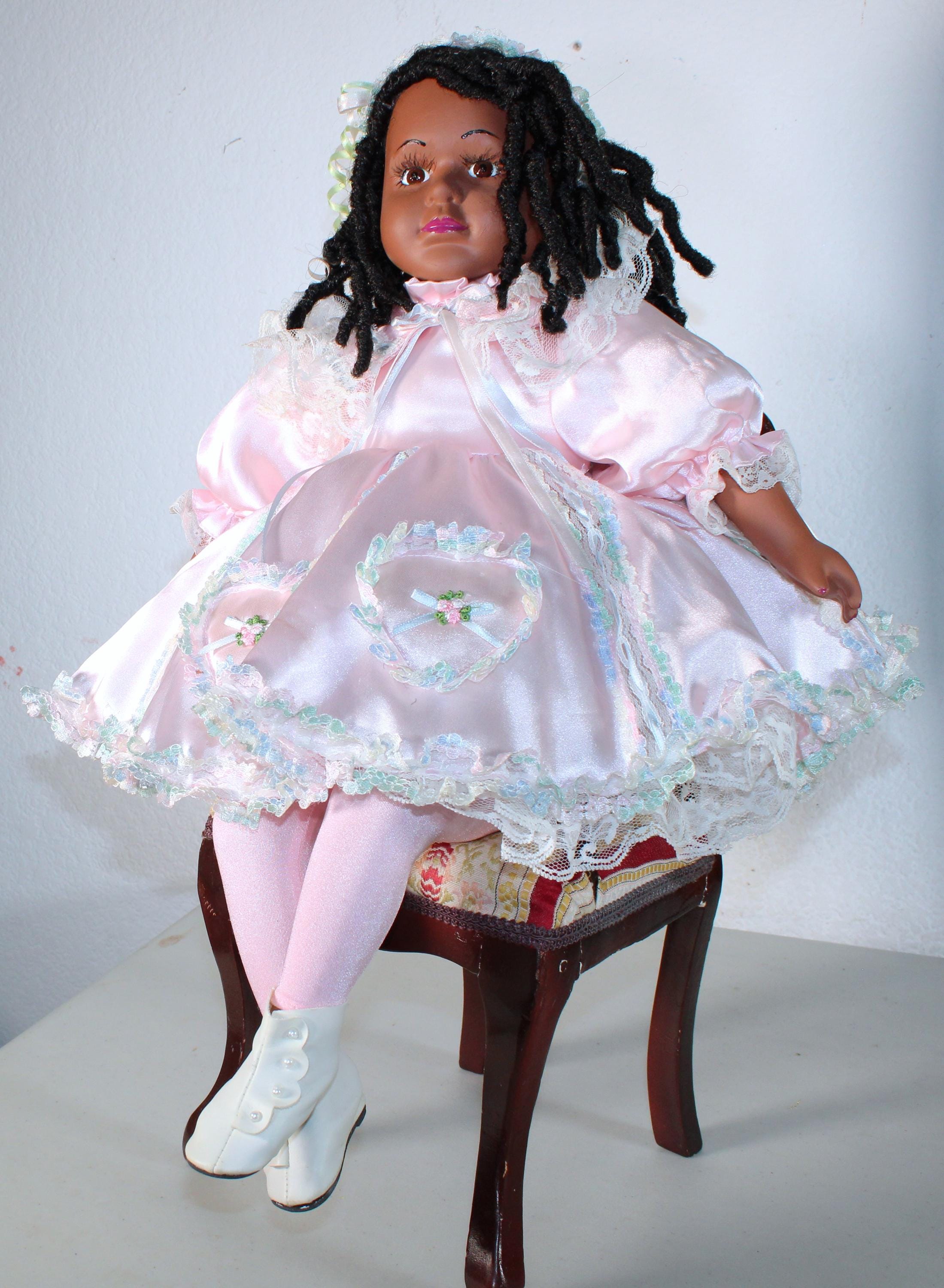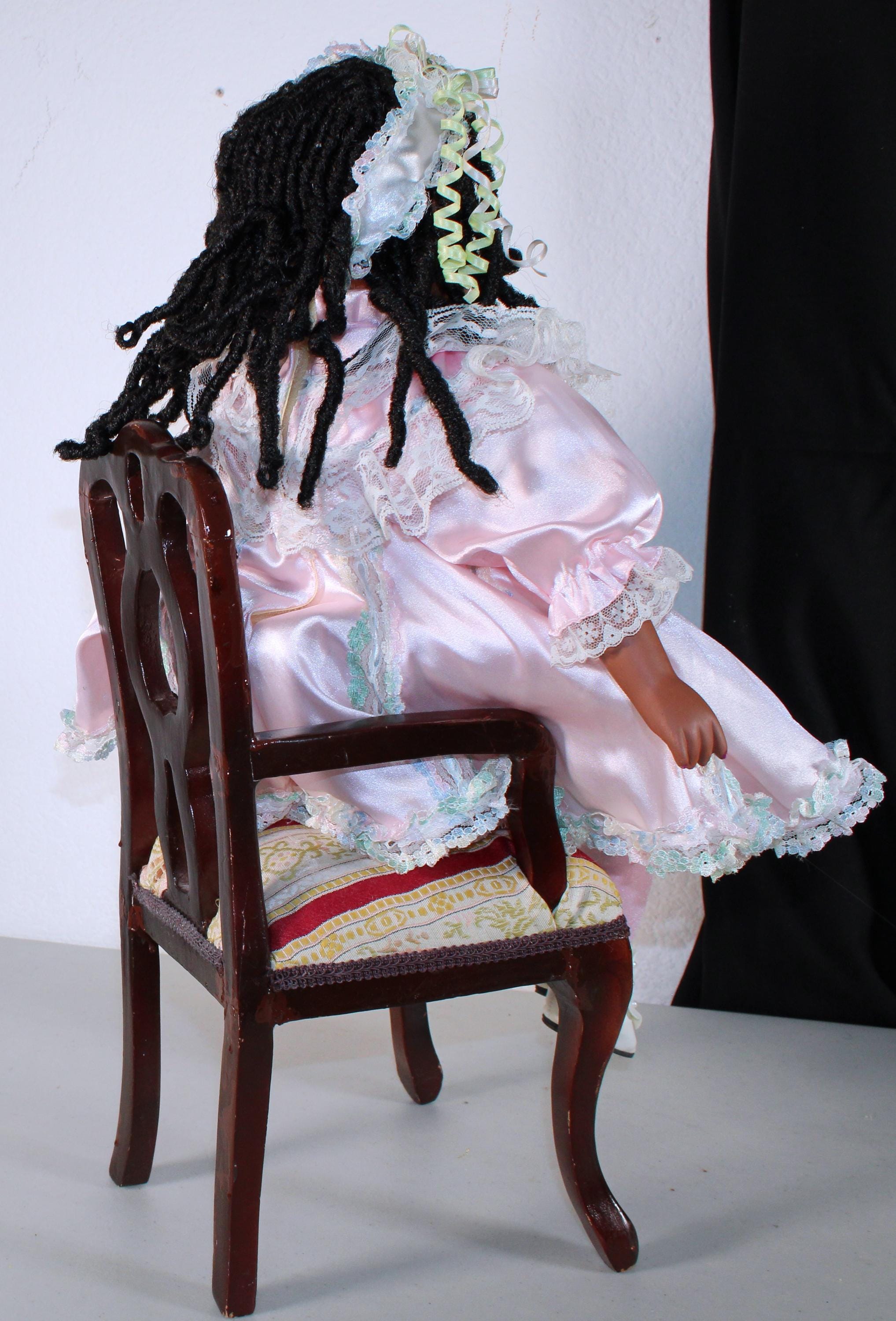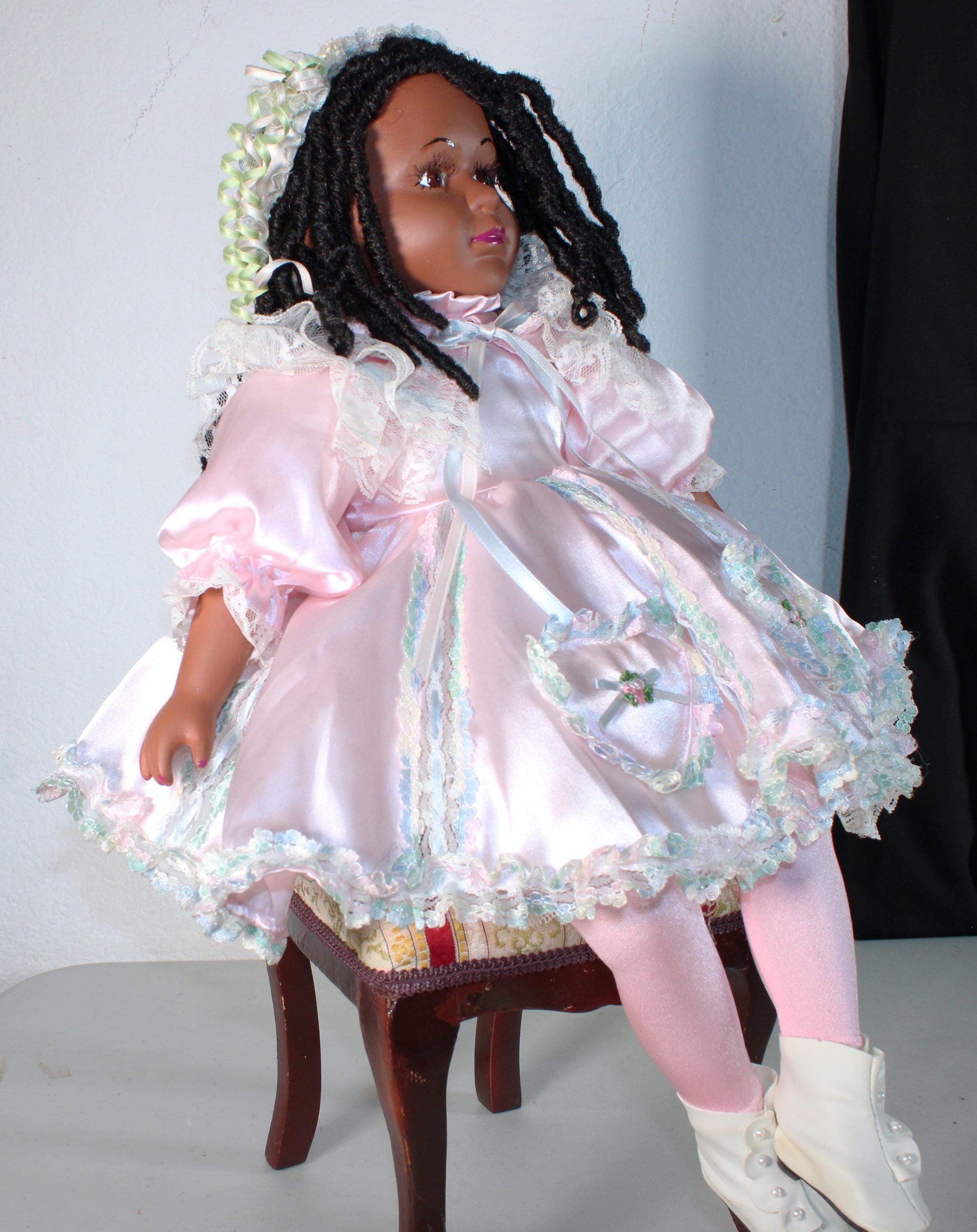 SHANNA....A 21" Porcelain Doll all pretty in pink and ready for the tea party. Matching boots, tights and accessories. Long black curly coiled hair with matching floral headband. Made of handpainted porcelain and fabric. Tea cup, saucer and chair comes with.