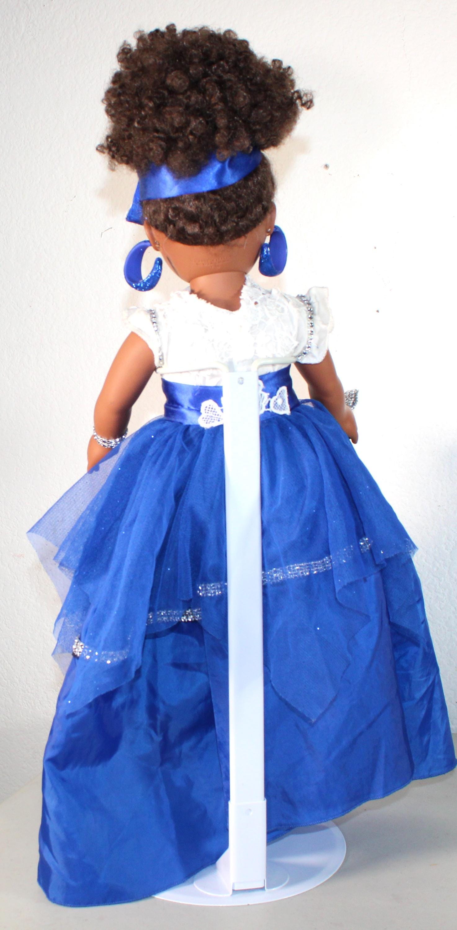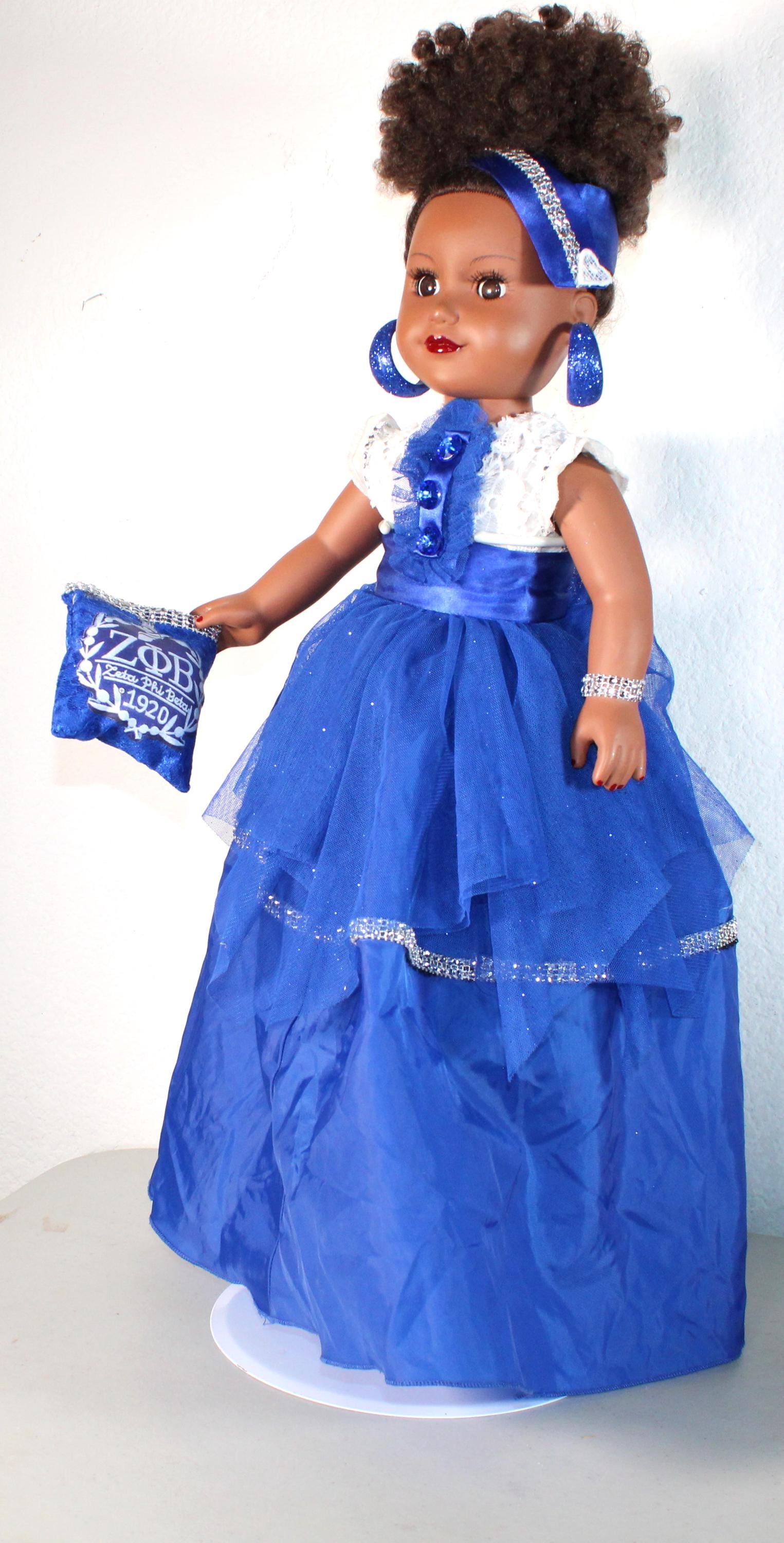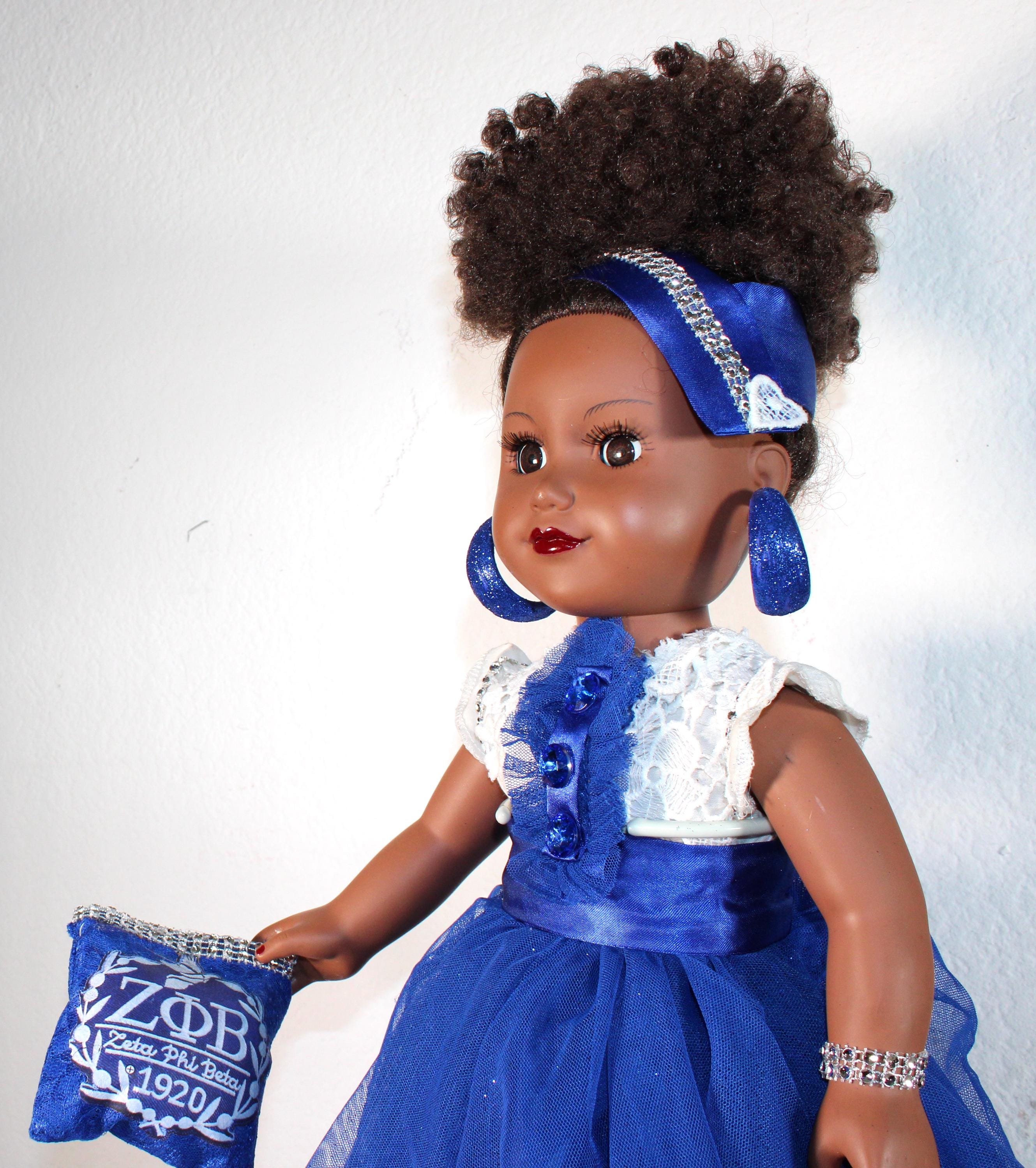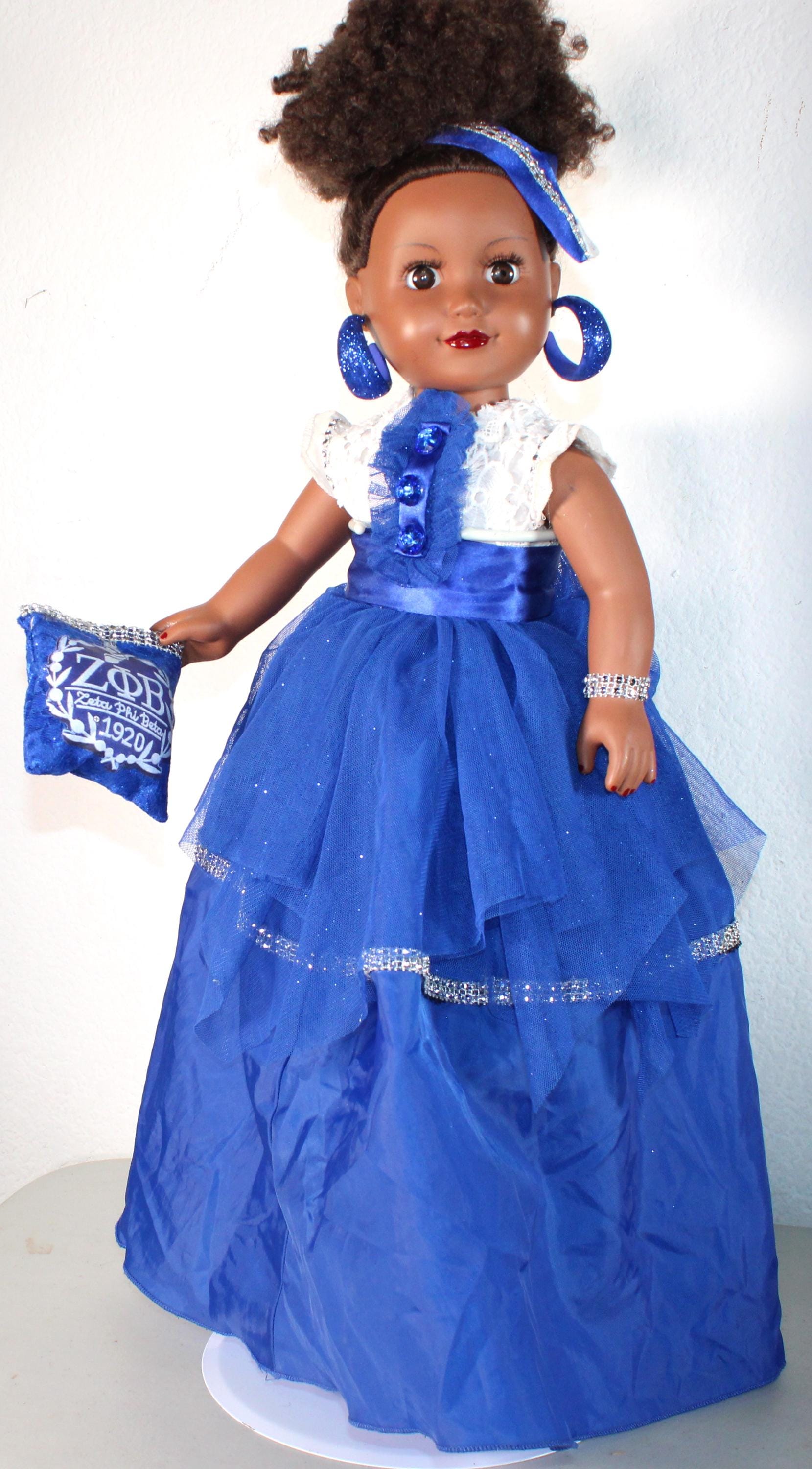 An 18" African American Porcelain Soror doll, Zeta Phi Beta. Dressed in signature colors of blue and white. Cocktail ensemble with long blue satiny skirting and cap sleeved blouse, accented with a touch of bling . Kinky dark brown hair in an updo with matching head band and earrings. Logo handbag in hand. Beautiful brown eyes. Made of soft vinyl and fabric.