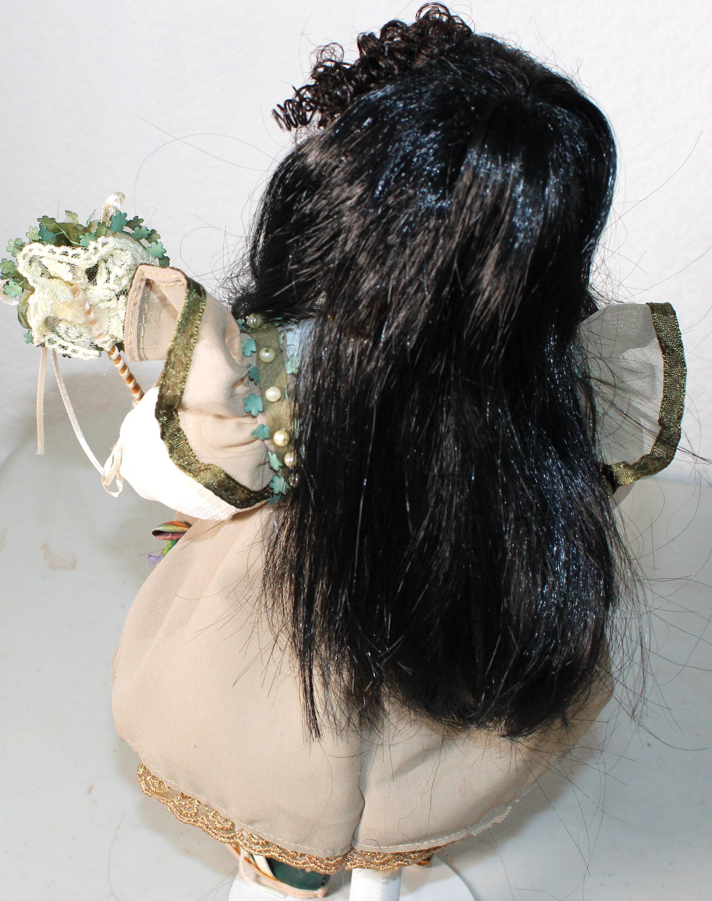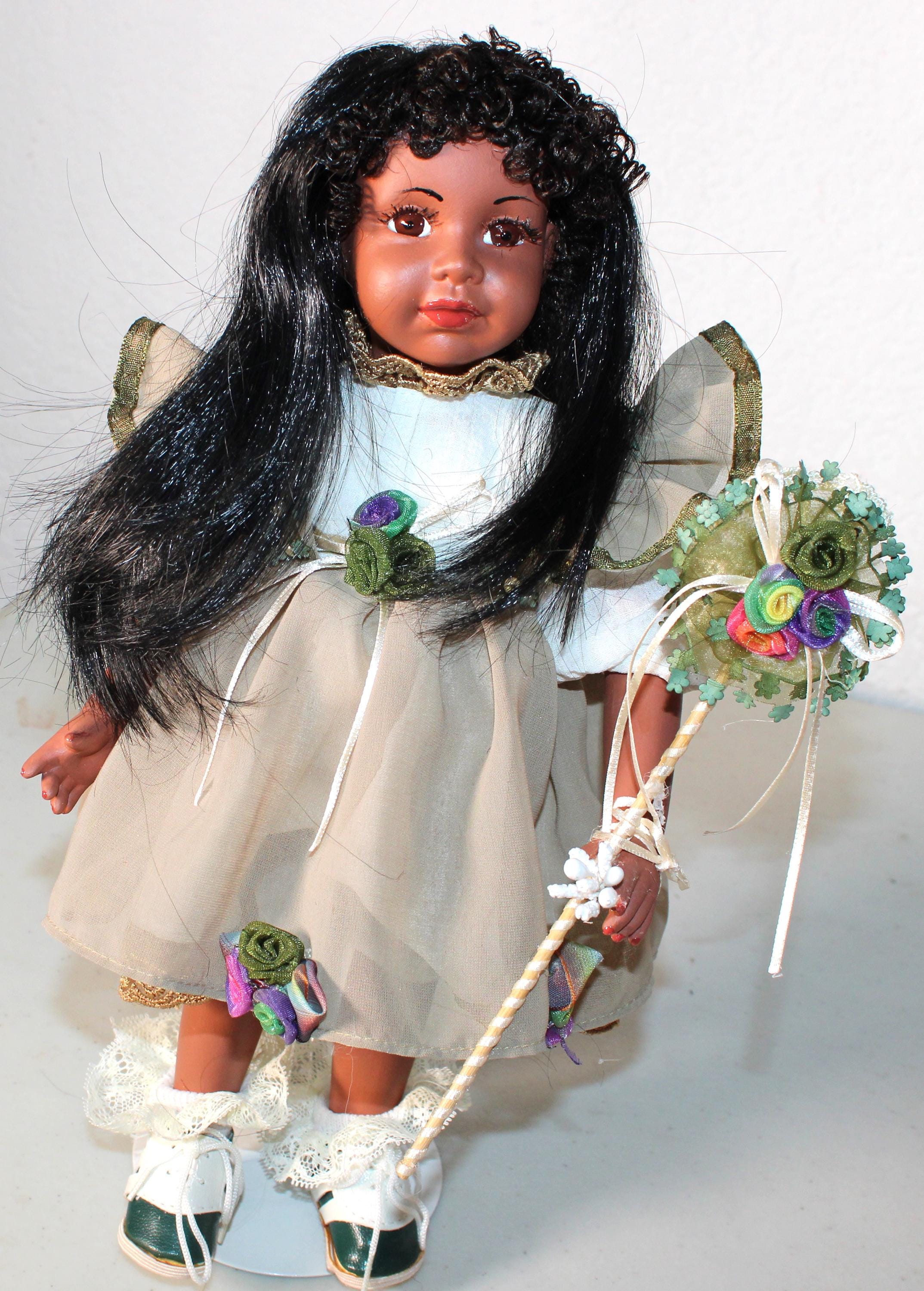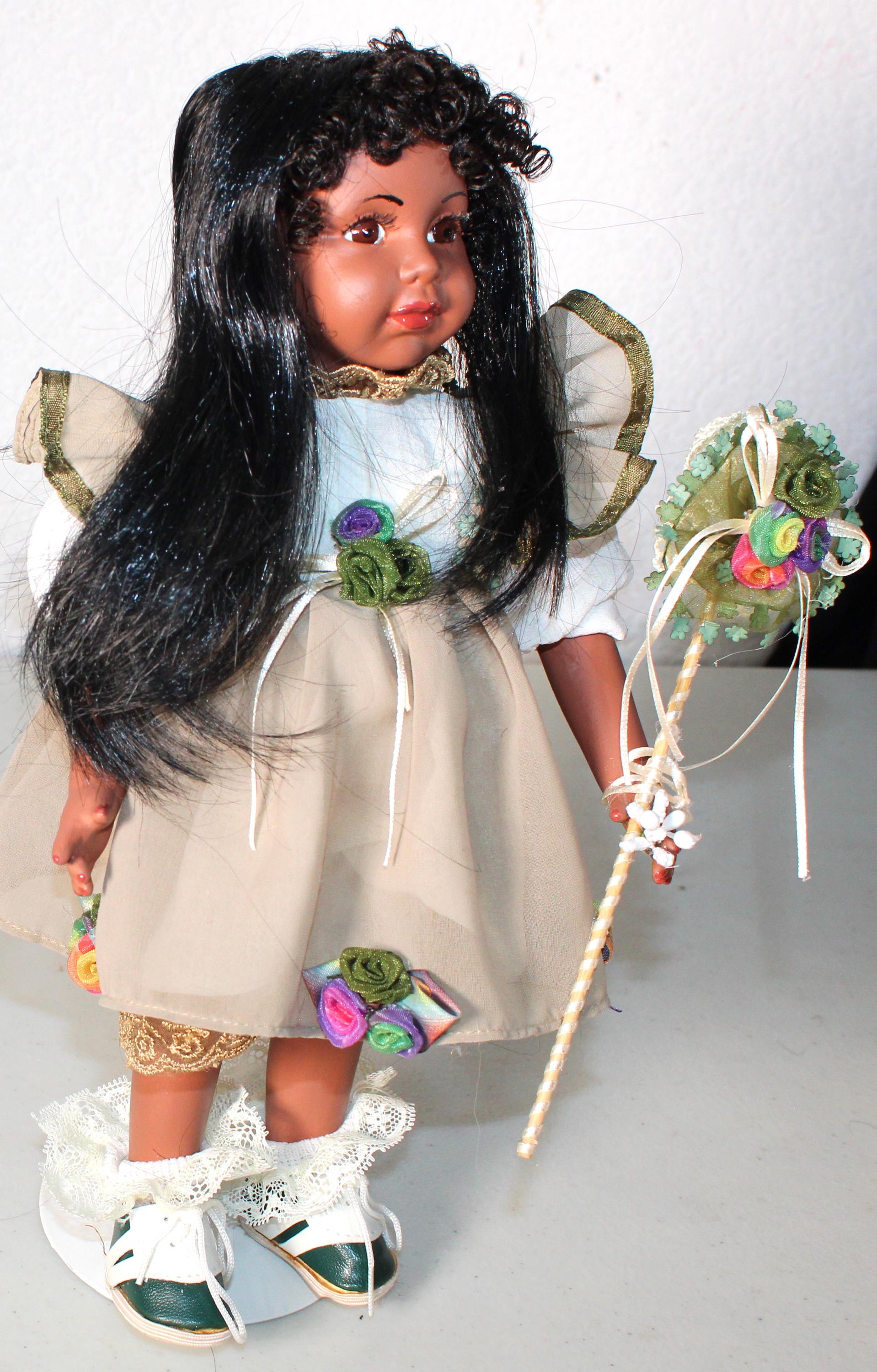 KENYAH...a 13" mini porcelain doll with floral scepter. Dressed in khaki and cream with multi colored florals. Matching shoes and socks. Long black wavy hair with curly bangs. Rich caramel colored handpainted skin. Stand comes with.
