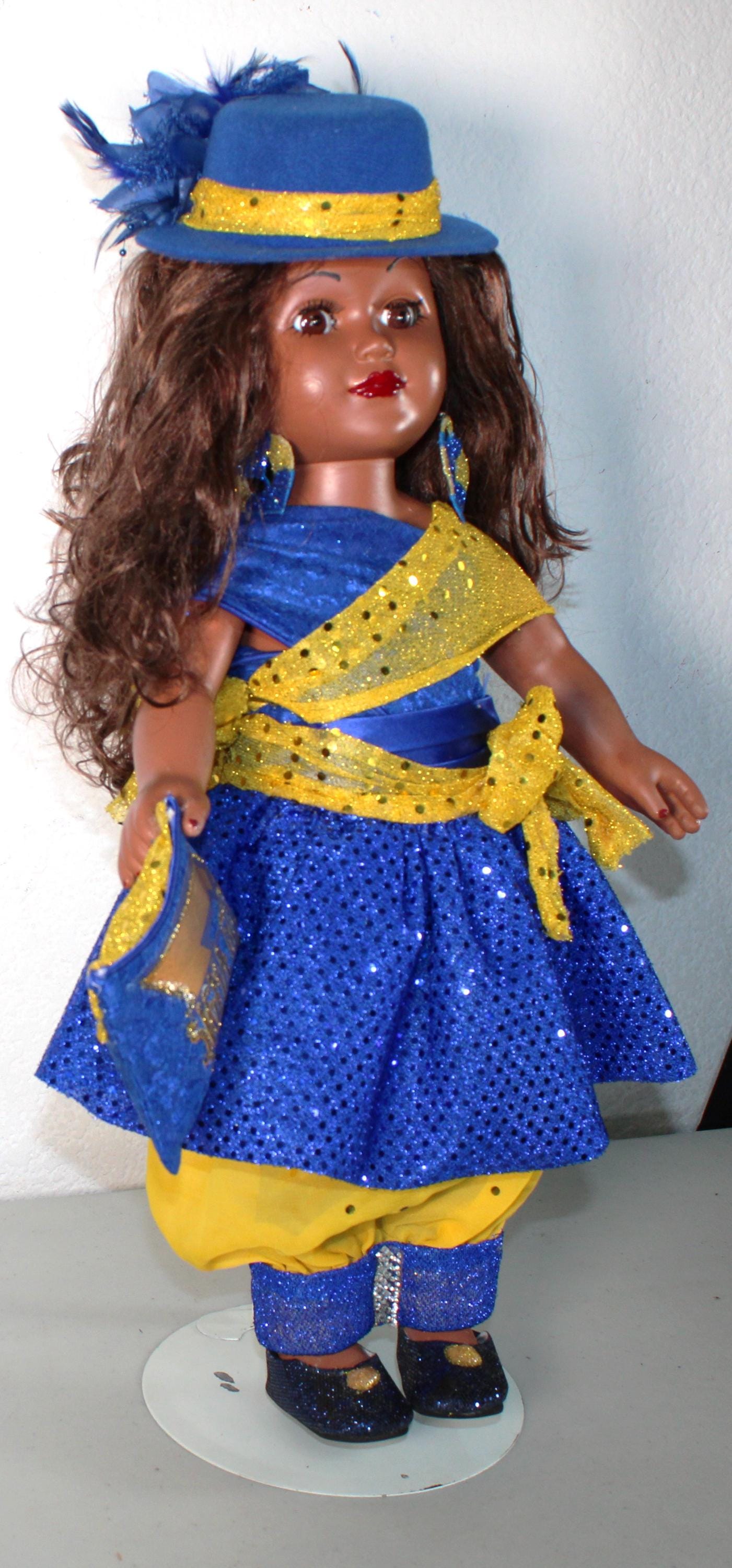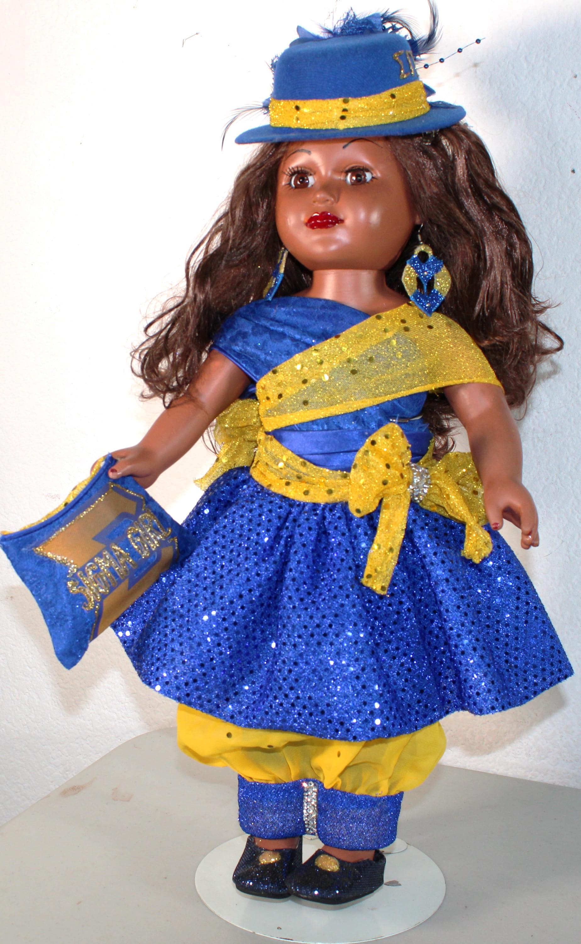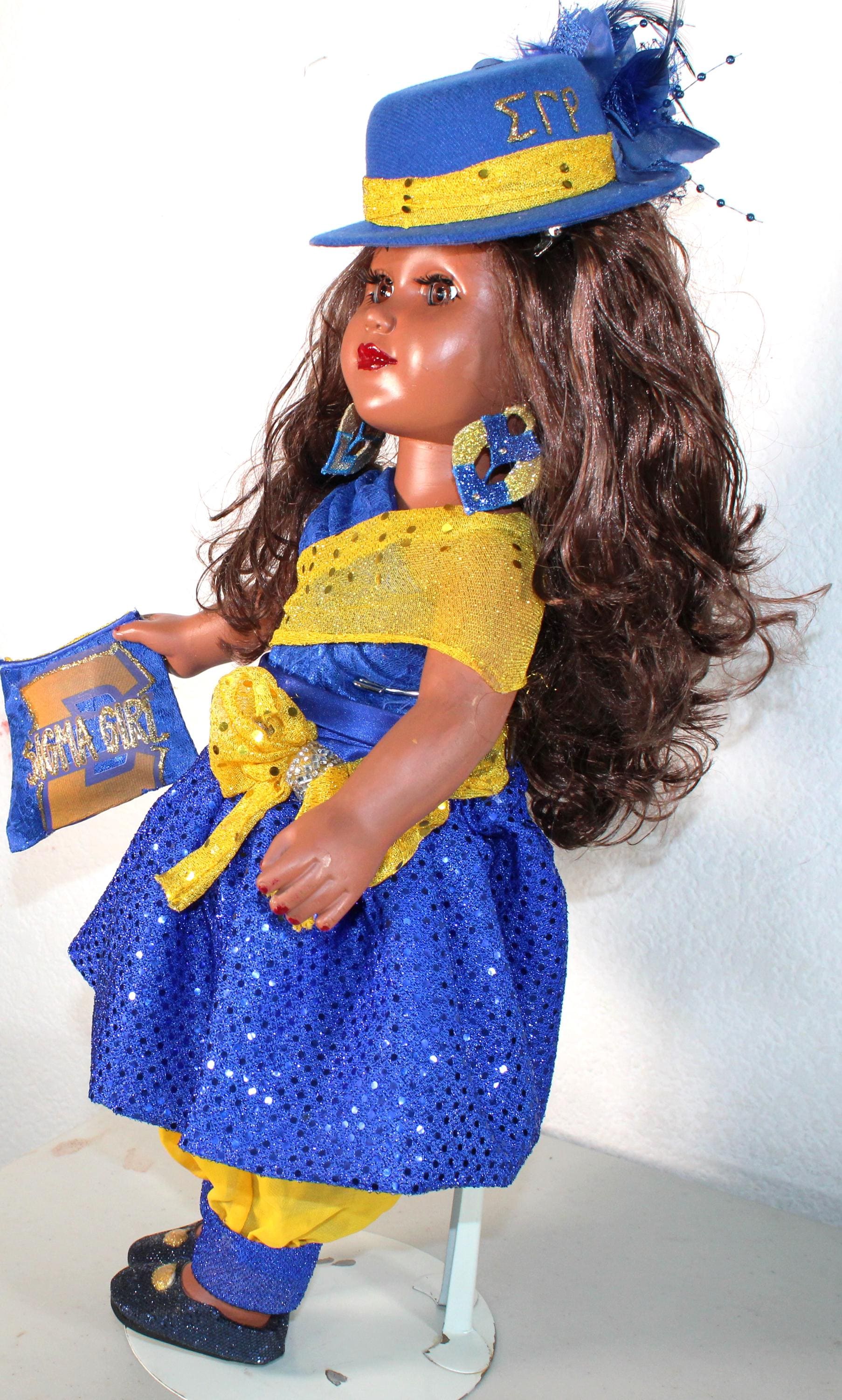 SIGMA GAMMA RHO.....An 18" African American Soror Girl with beautiful brown eyes. Dressed in an ensemble that bares her signature colors of blue and gold with a touch of bling. Matching shoes, handbag and dangle earrings. Long dark brown wavy hair topped with a matching fedora. Made of hard vinyl and fabric.