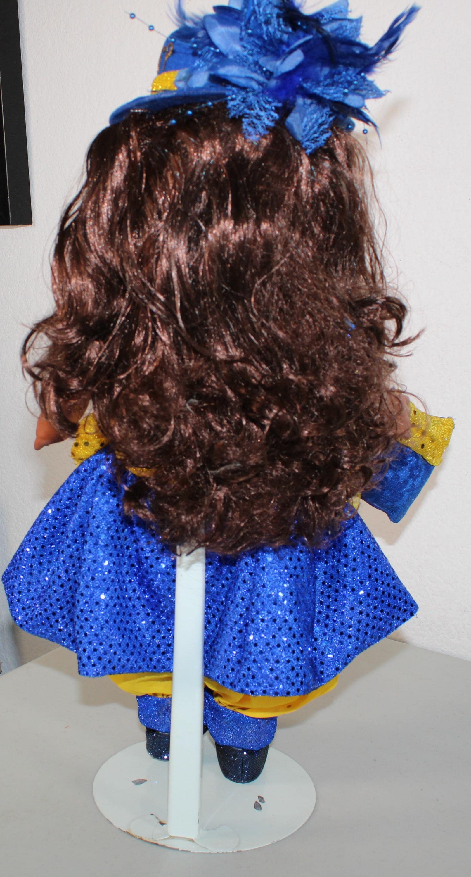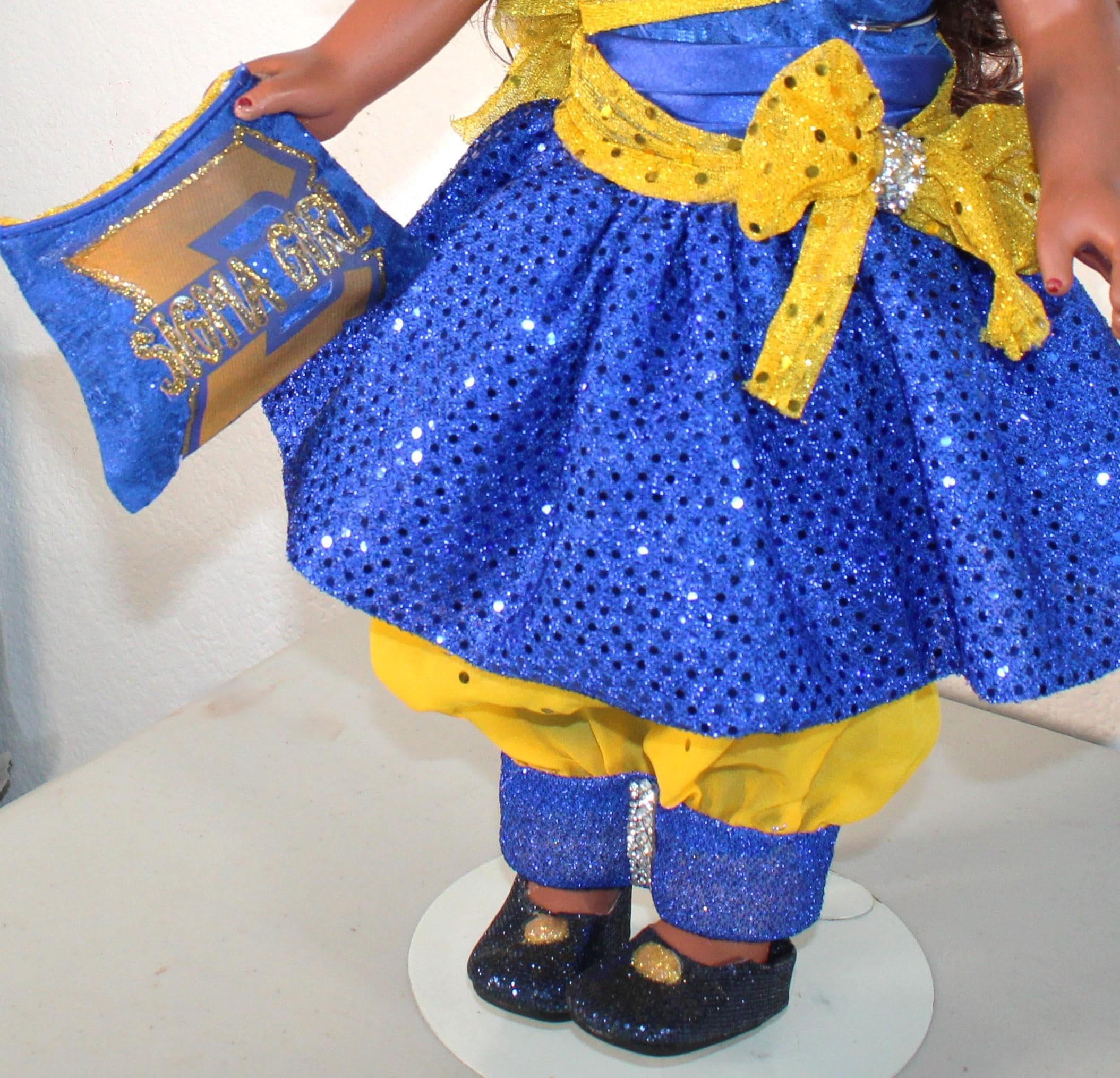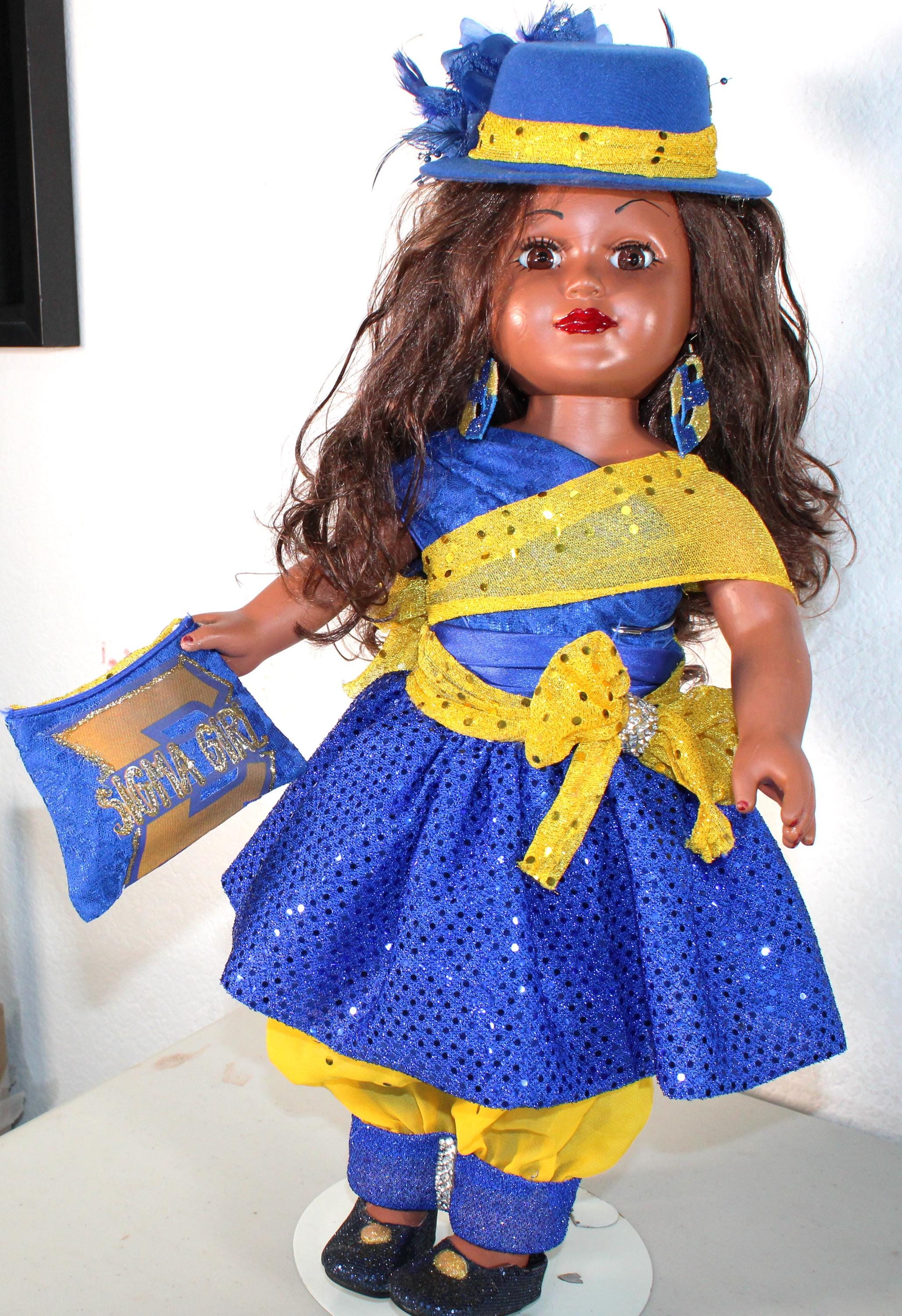 SIGMA GAMMA RHO.....An 18" African American Soror Girl with beautiful brown eyes. Dressed in an ensemble that bares her signature colors of blue and gold with a touch of bling. Matching shoes, handbag and dangle earrings. Long dark brown wavy hair topped with a matching fedora. Made of hard vinyl and fabric.
