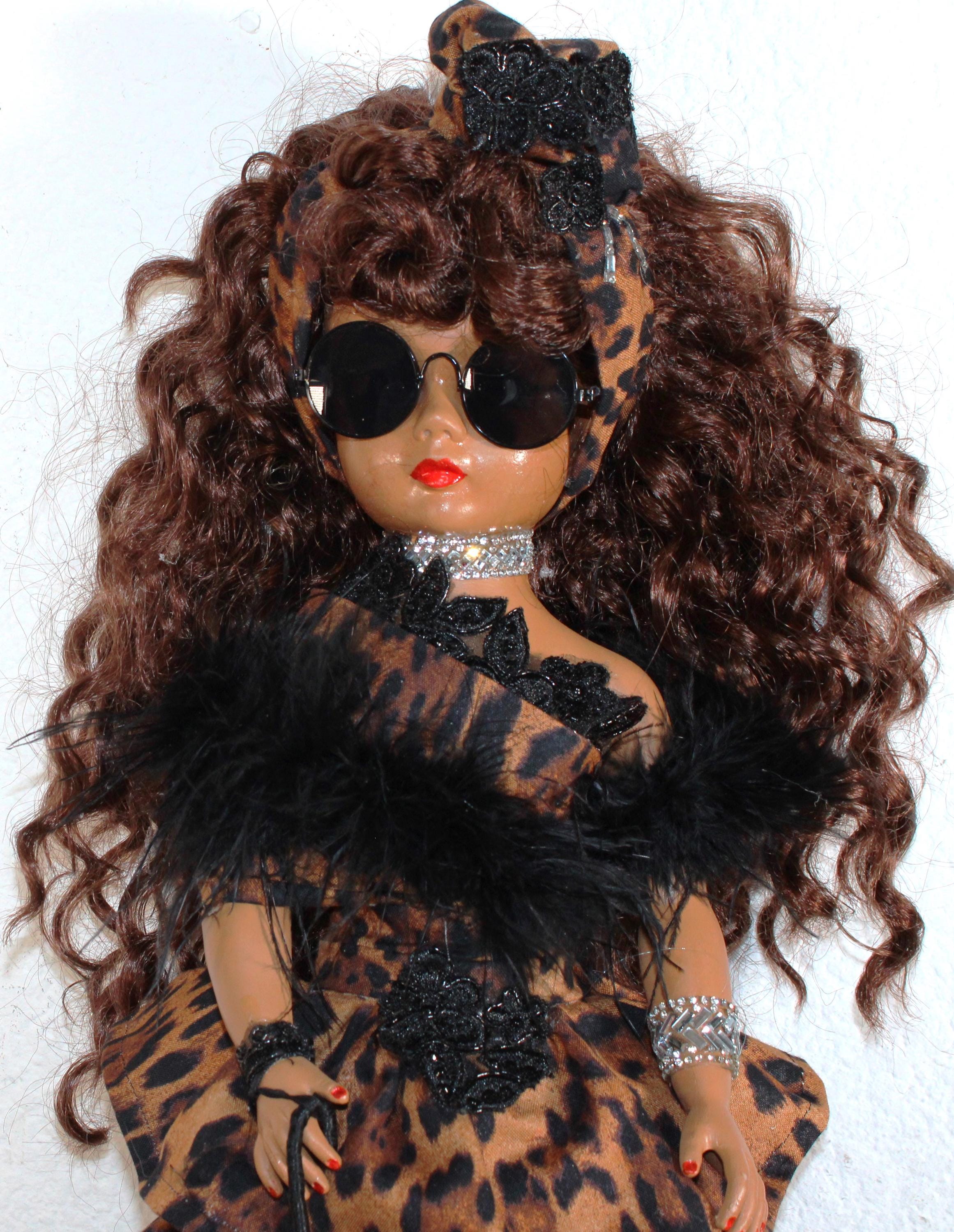 MEGHE...A 21" hi society African American girl dressed in a leopard print ball gown, trimmed with a touch of bling. Long wavy brown hair, topped with a matching headband. Boa feather to shoulders to chase the chill on what might be a cool rainy evening and of course the DIVA shades. Matching umbrella in hand...just in case! Made of handpainted hard vinyl and rubber.