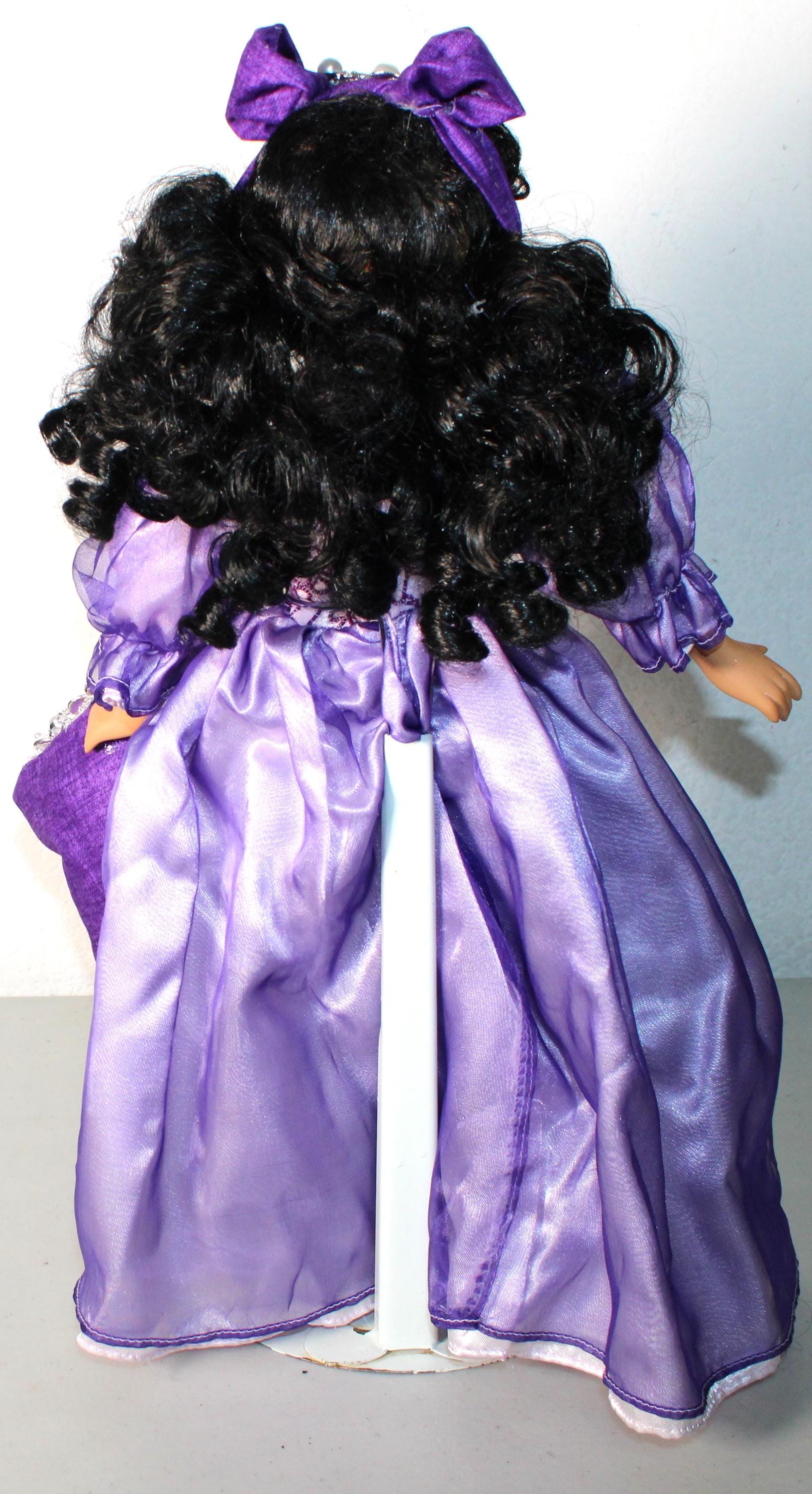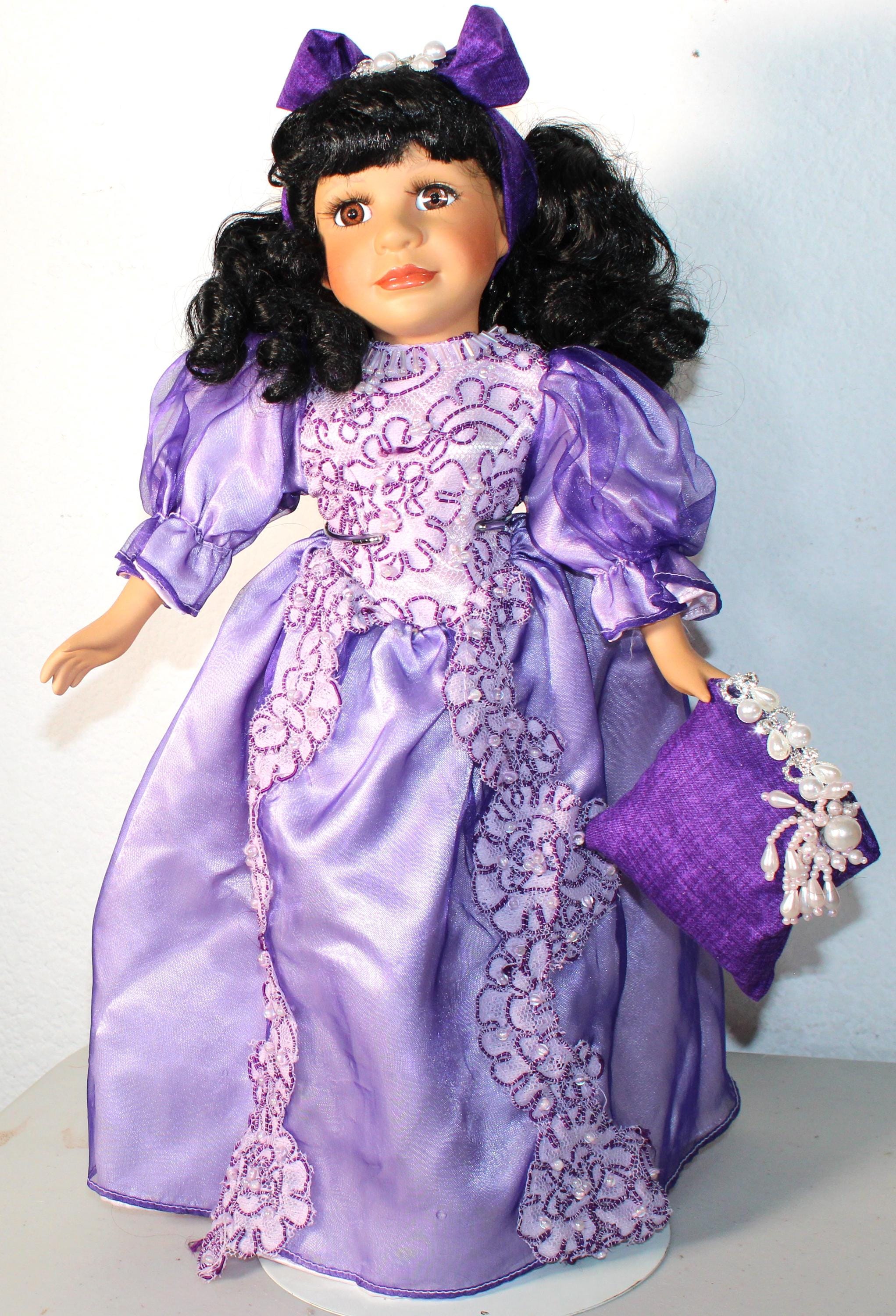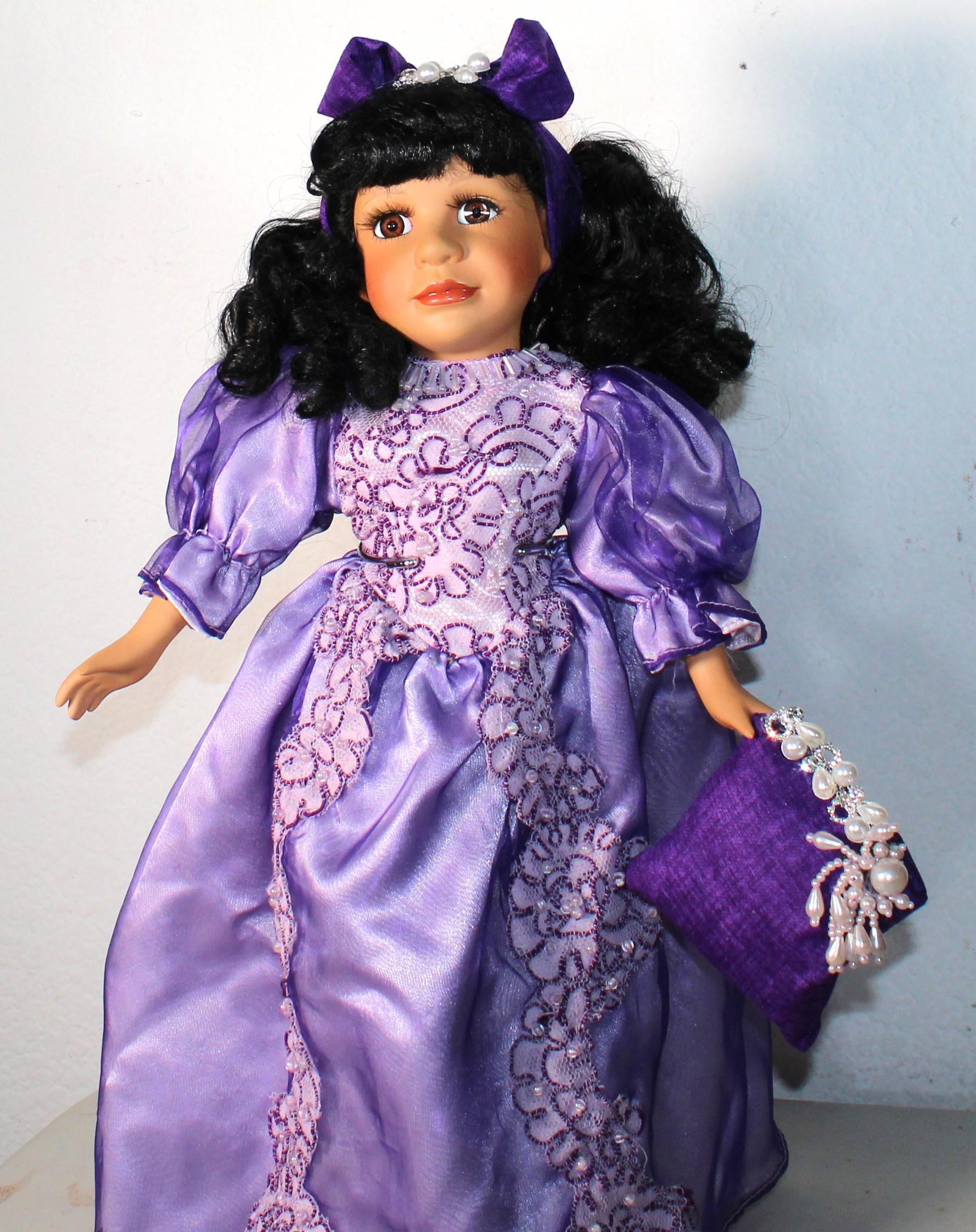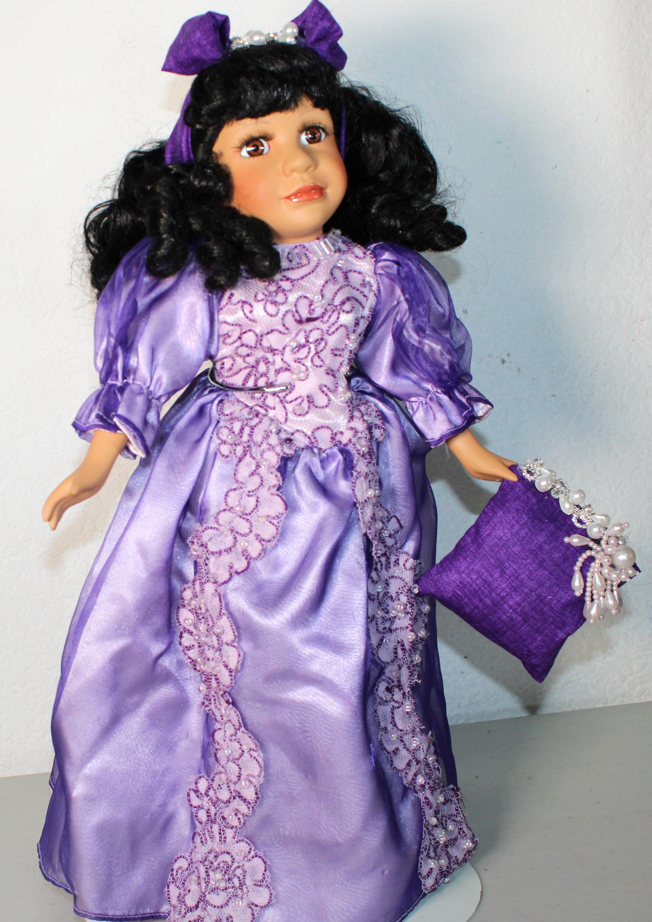 DIASIA....A 16" African American Porcelain doll dressed in tones of purple, accented with beaded lace appliques. Matching handbag. Black long curly hair with headband and rhinestone/pearl hair comb.