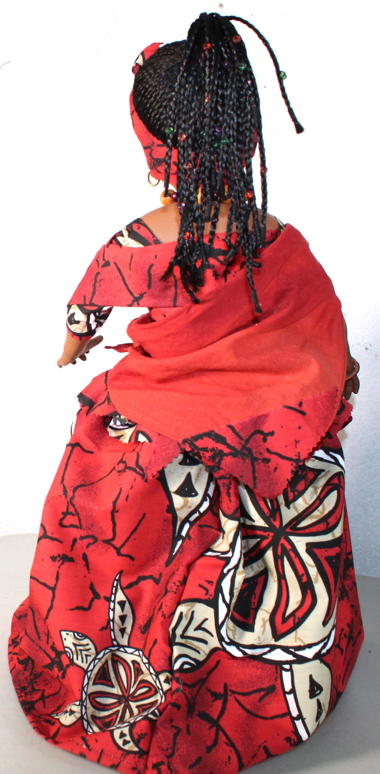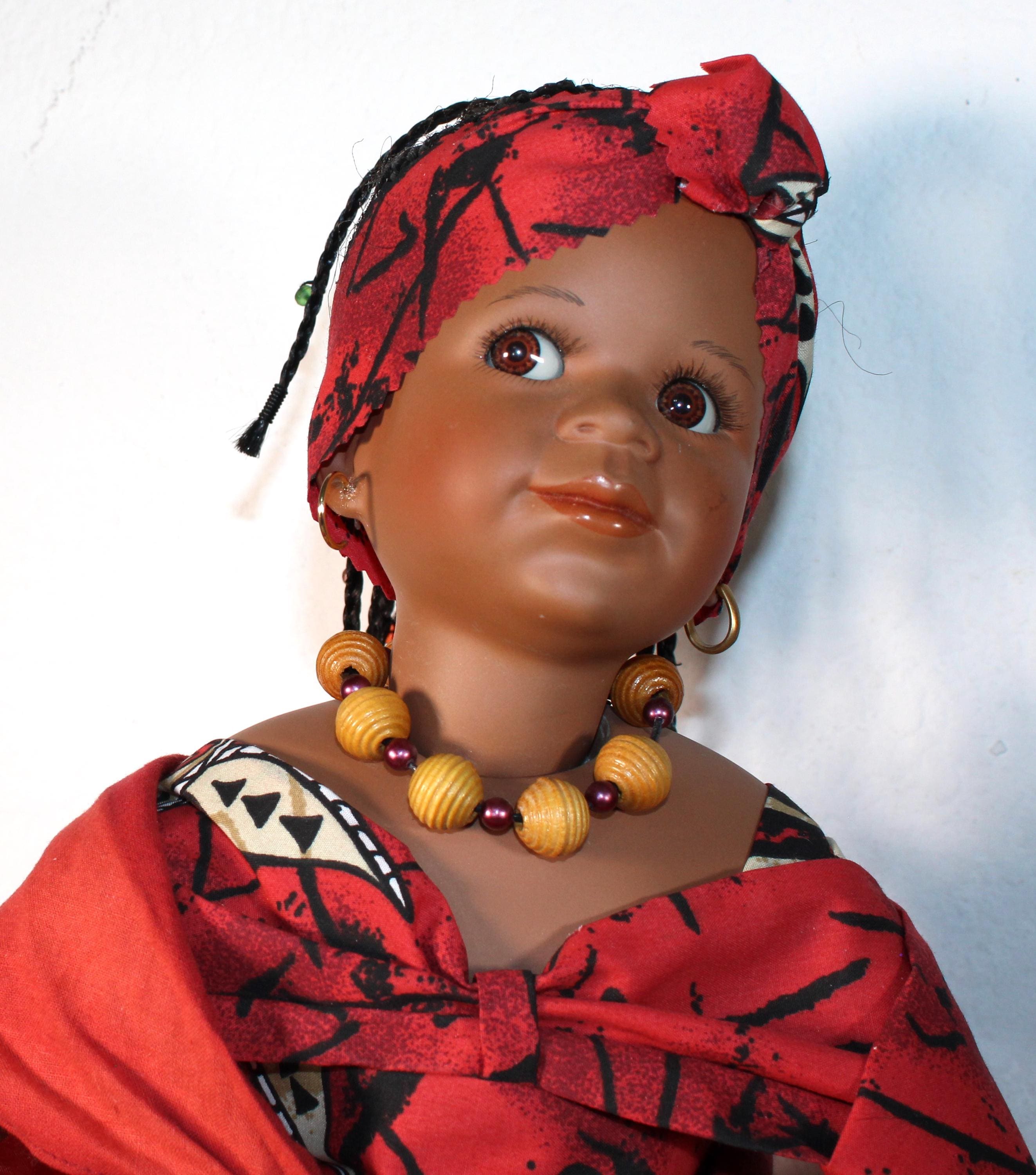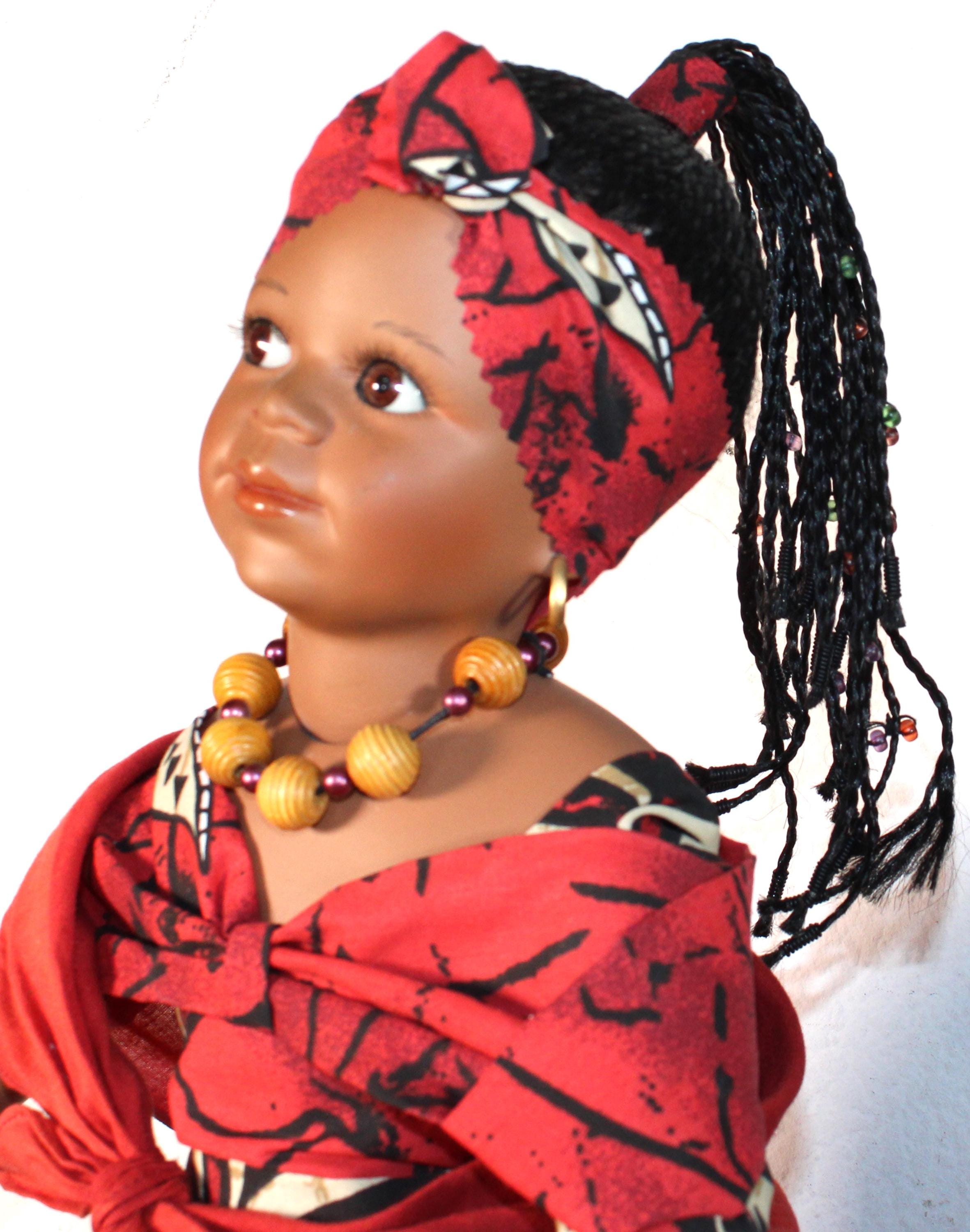 UJANAH (U'jan'nah)...African name meaning a bold young woman. A 20" African American Porcelain doll dressed in an ethnic ensemble with matching headwrap and handbag. Hoop earrings and beaded necklace.