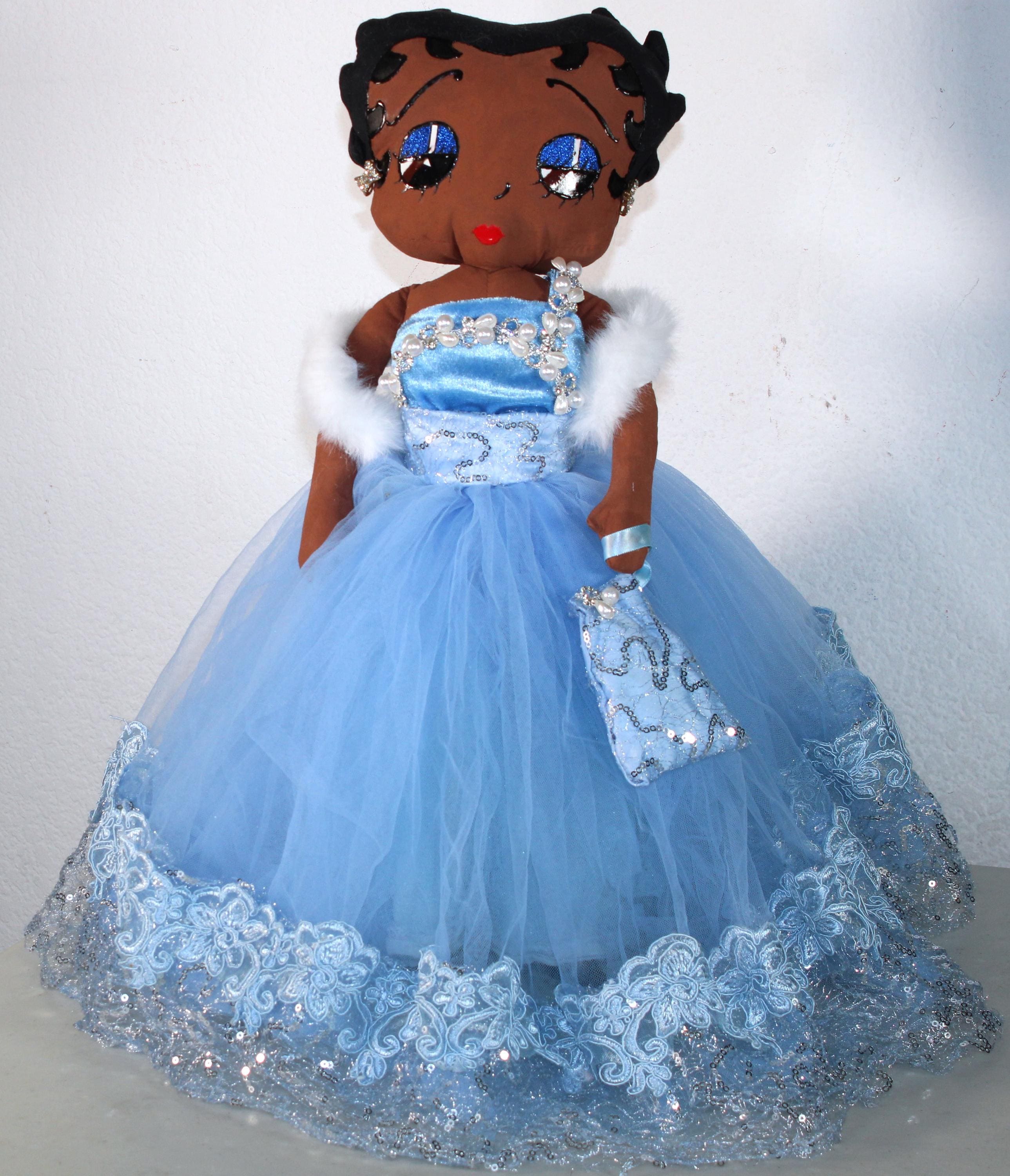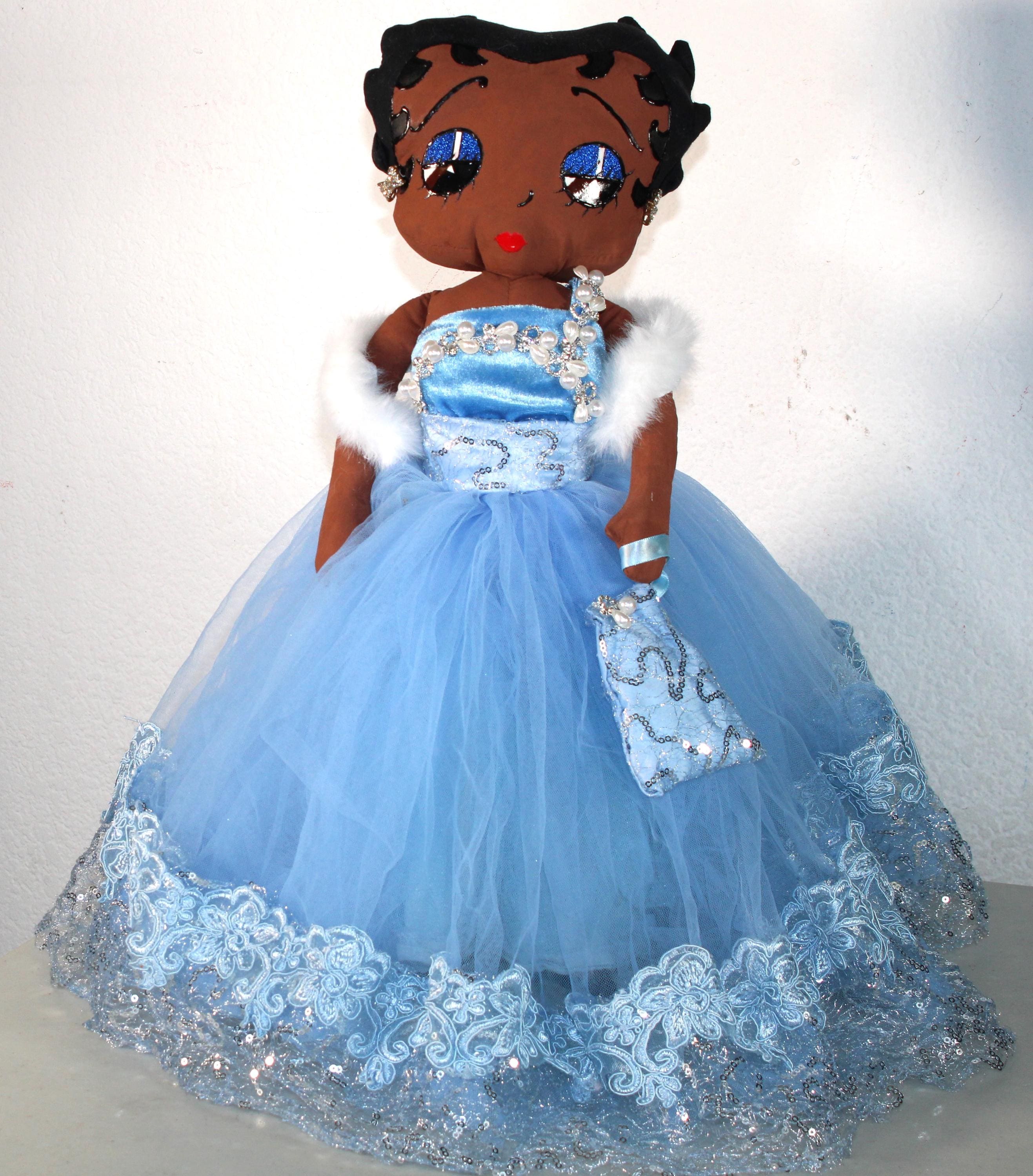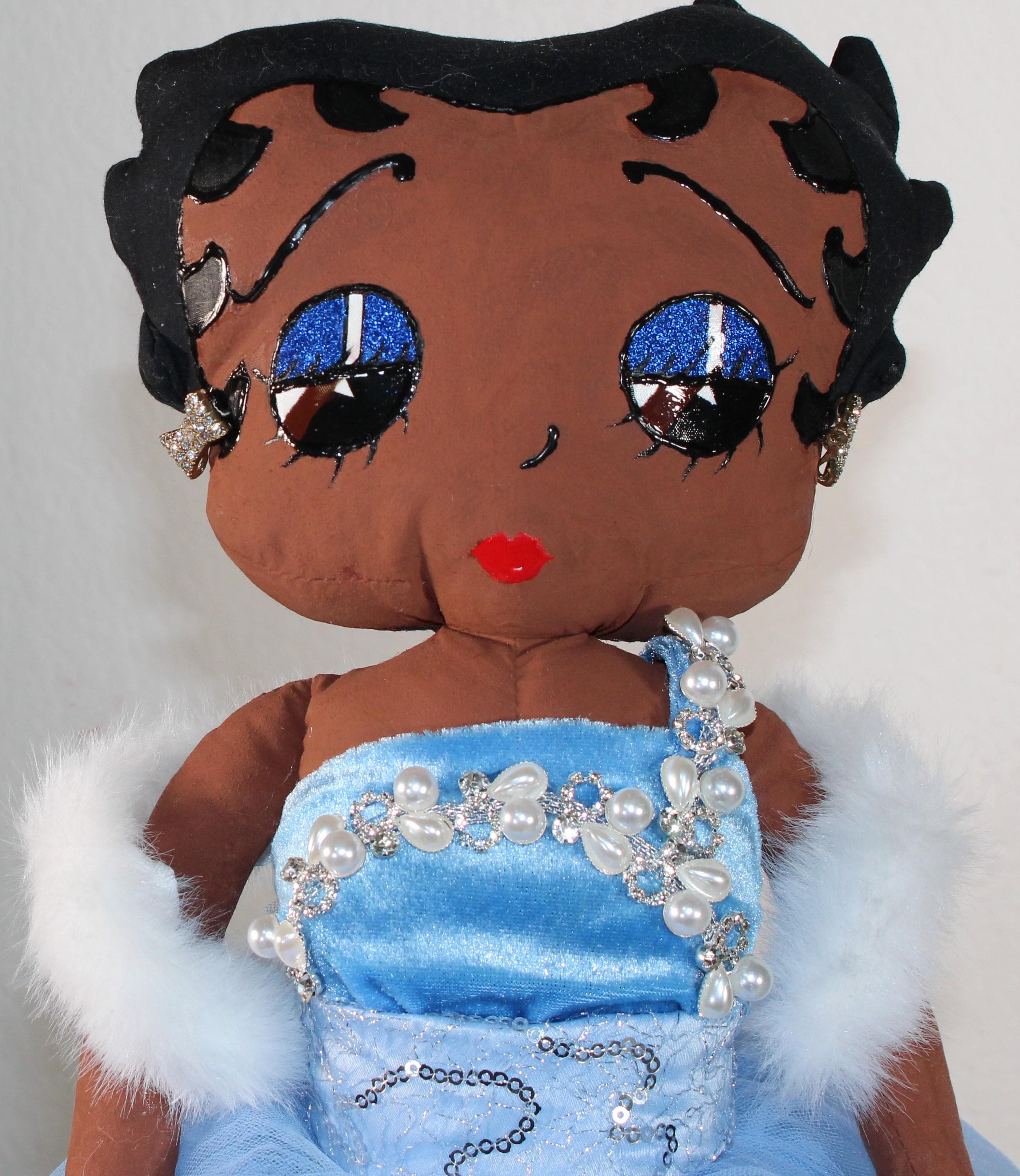 "BELLA BLEU".....An 18" African American Betty Boop with a touch of class and sass! Dressed in a lace and sequin ball gown in sparkling blue. One shoulder ball gown trimmed with rhinestones and pearls. Matching handbag. Faux mink fur shawl. Rhinestone earrings and satin shoes. Made of handpainted fabric.