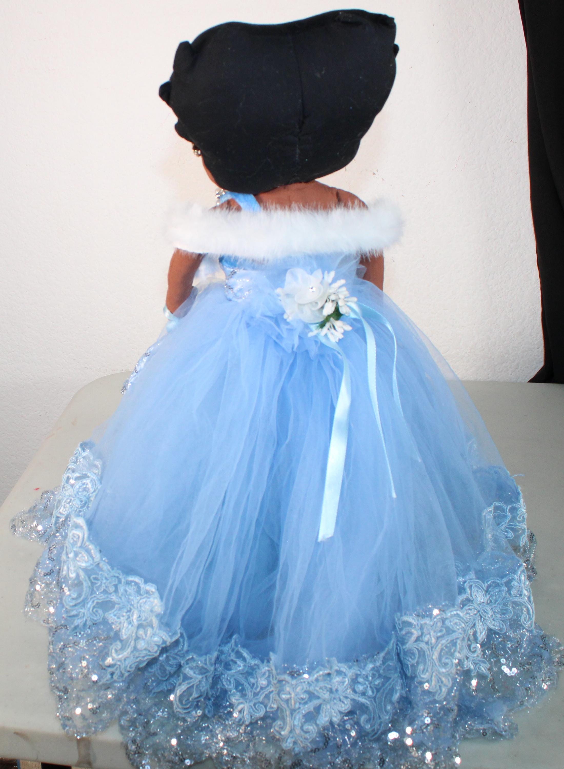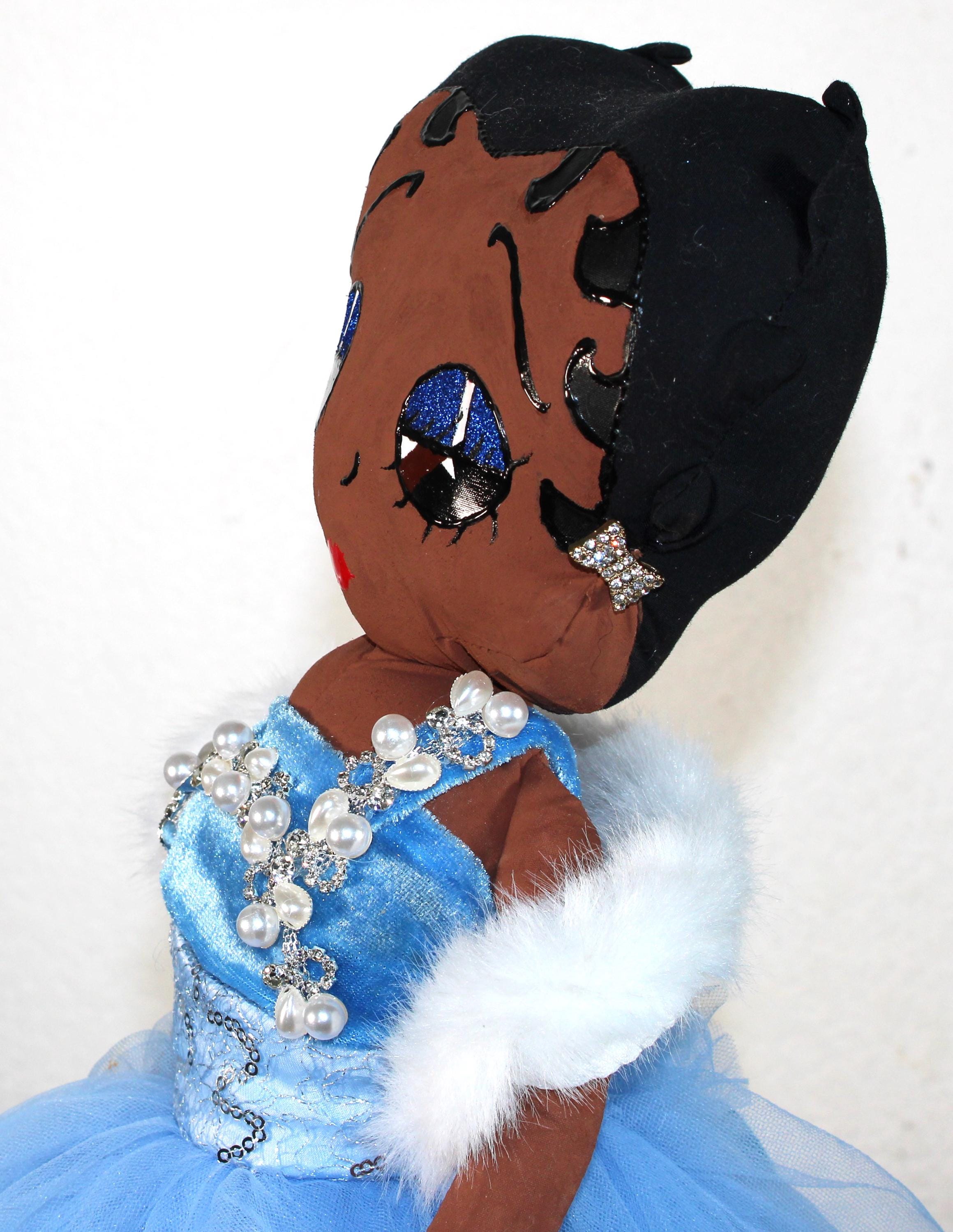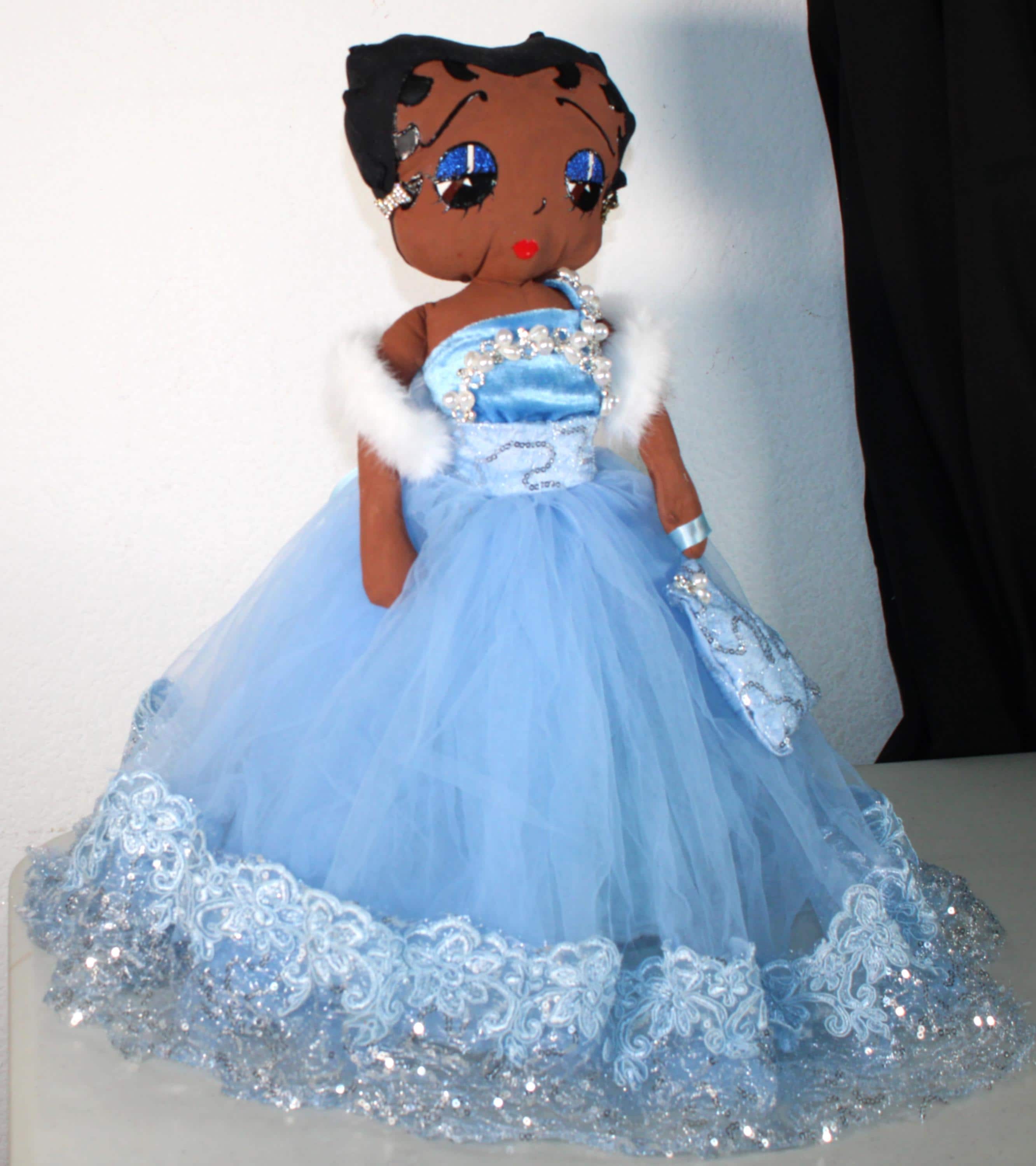 "BELLA BLEU".....An 18" African American Betty Boop with a touch of class and sass! Dressed in a lace and sequin ball gown in sparkling blue. One shoulder ball gown trimmed with rhinestones and pearls. Matching handbag. Faux mink fur shawl. Rhinestone earrings and satin shoes. Made of handpainted fabric.