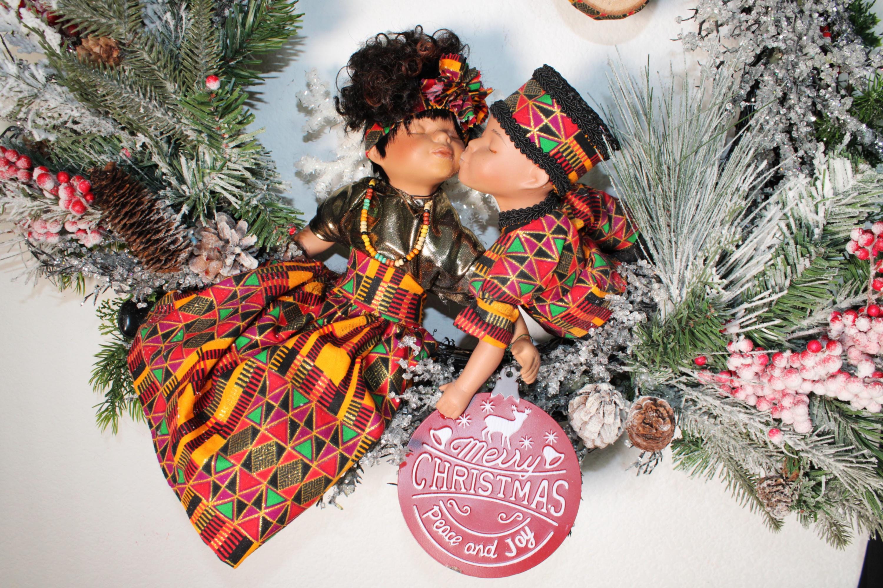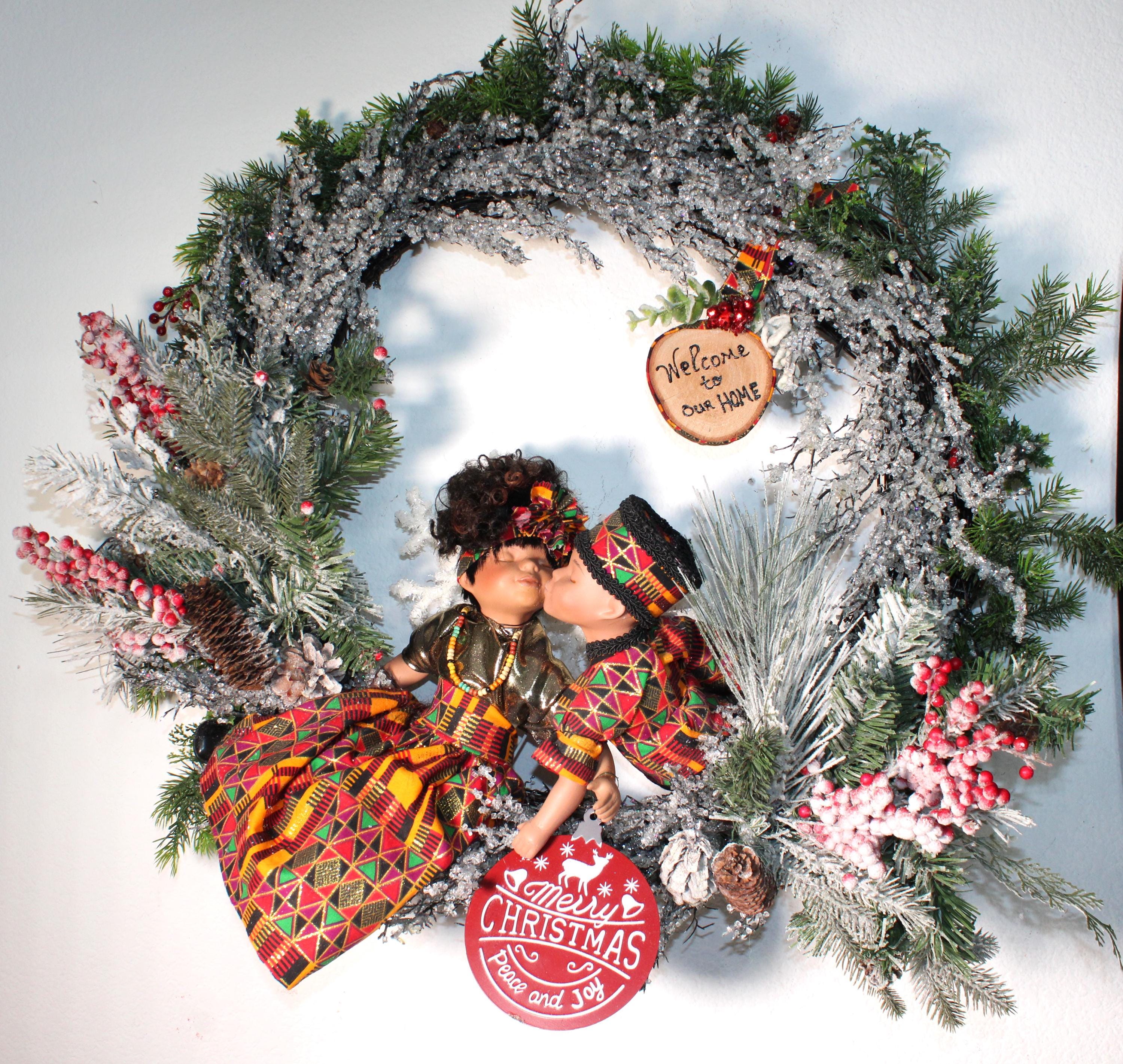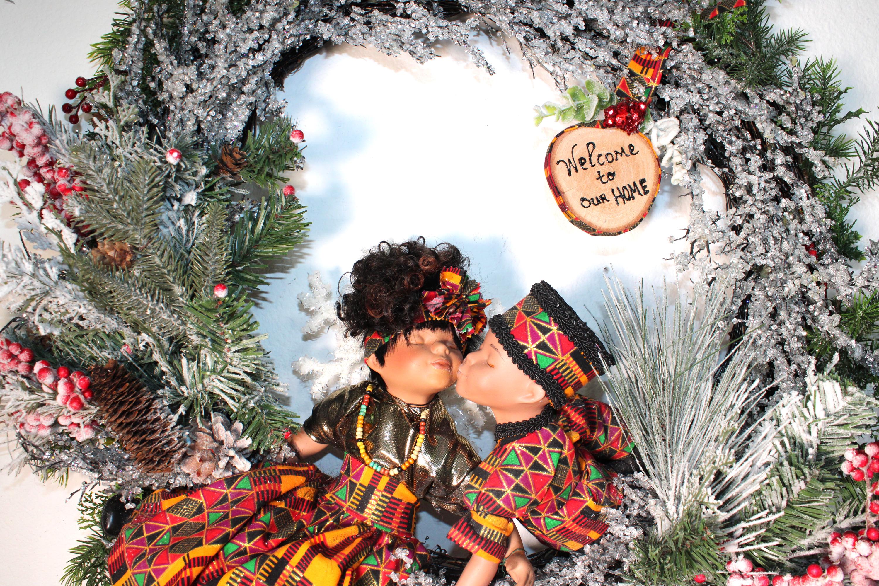 WELCOME TO OUR HOME...An African American Holiday Crystal Ice and Garland Door Wreath featuring kissing dolls dressed in ethnic attire with tones of brick red, deep yellow, black and metallic gold. Wreath accented with flocked Christmas florals, a xmas greeting and a misteltoe WELCOME sign.