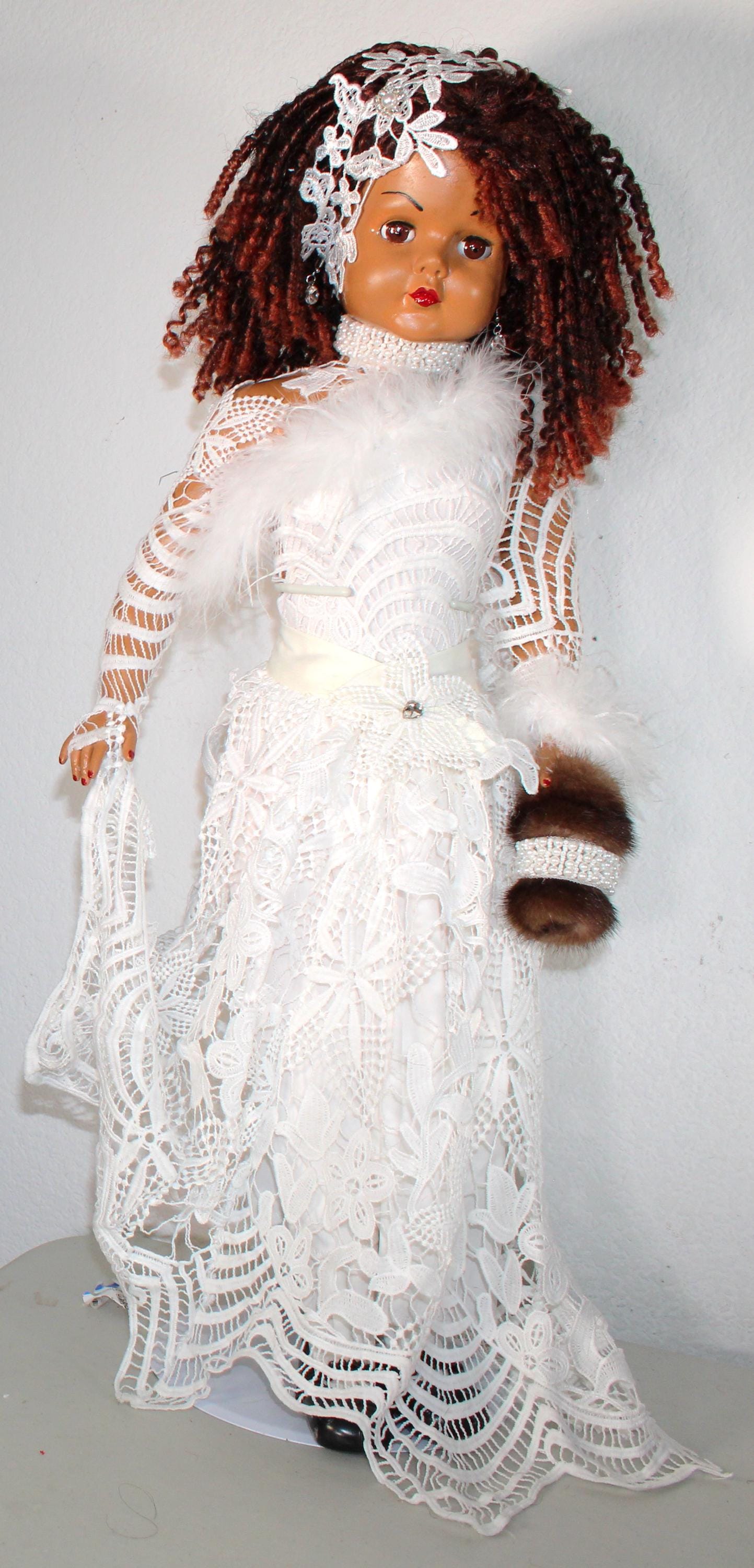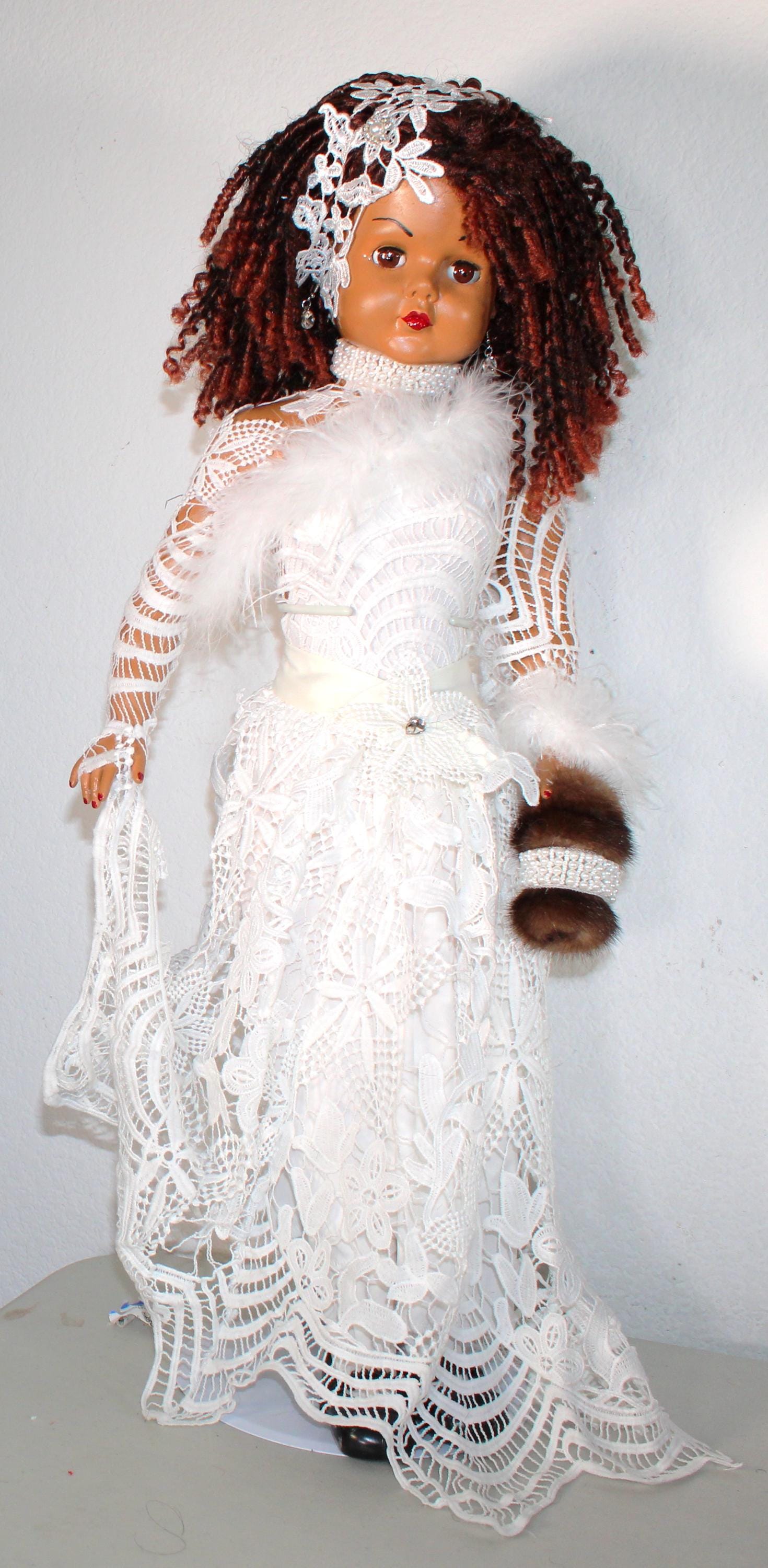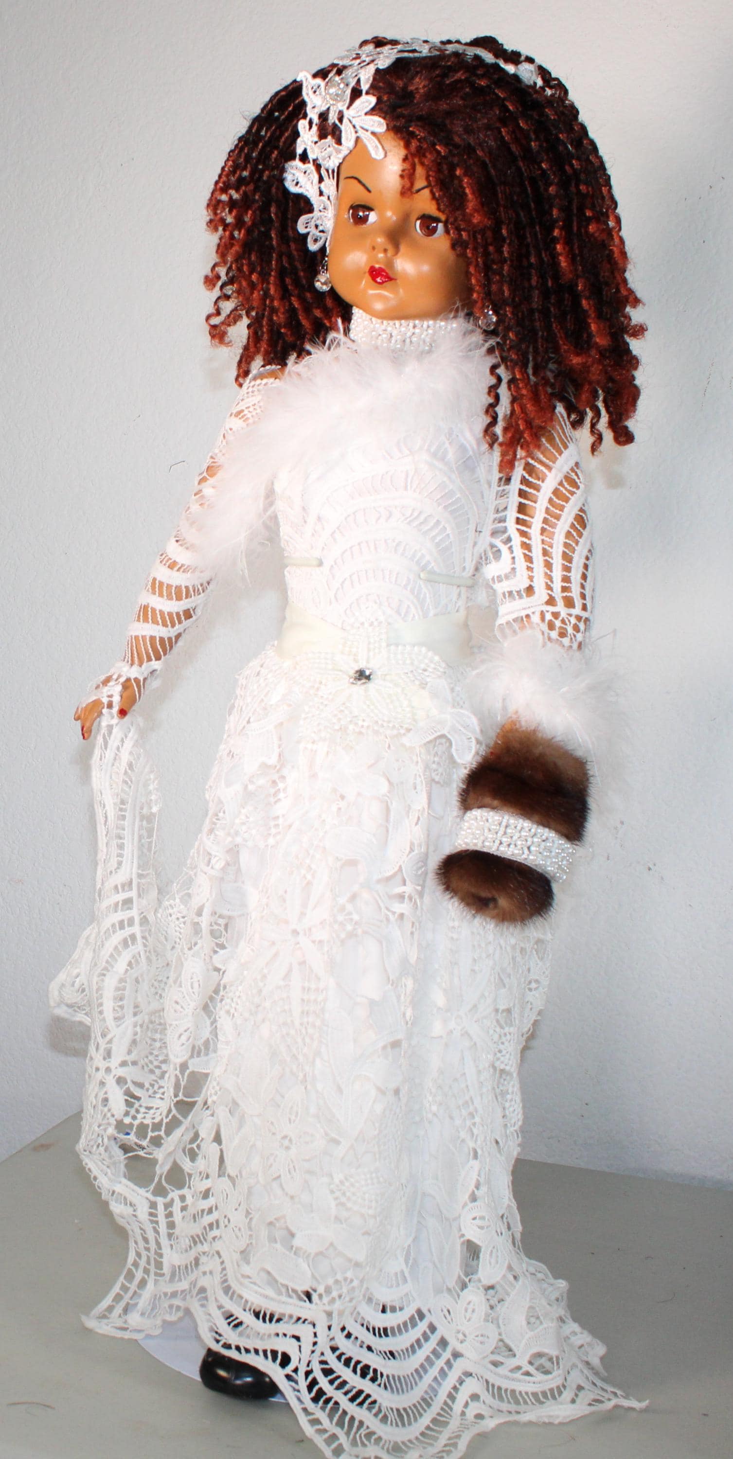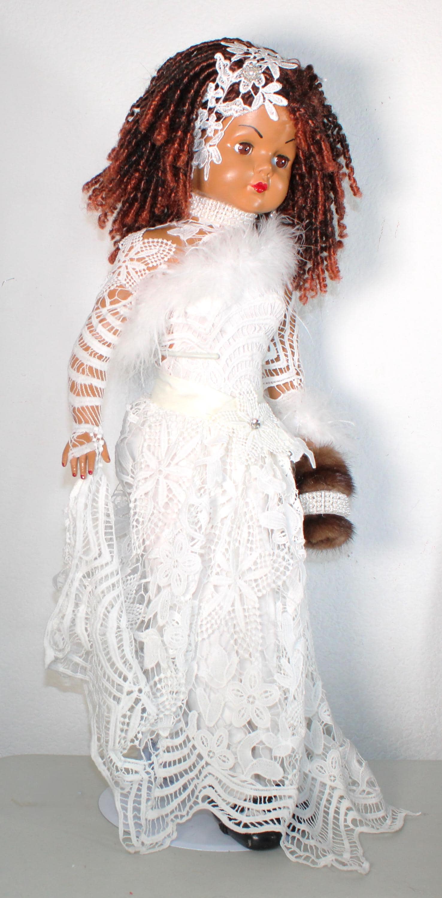 "MEESHAH"....A very tall 30" African American Doll. Dressed to the 9's in an elegant white applique lace evening ensemble. One shoulder dress accented with a touch of bling and boa feather trim. Long kinky curled hair with matching head band. Rhinestone dangle earrings to the ears and wearing black slippers. Mink muff in hand. Made of handpainted soft rubber and vinyl.