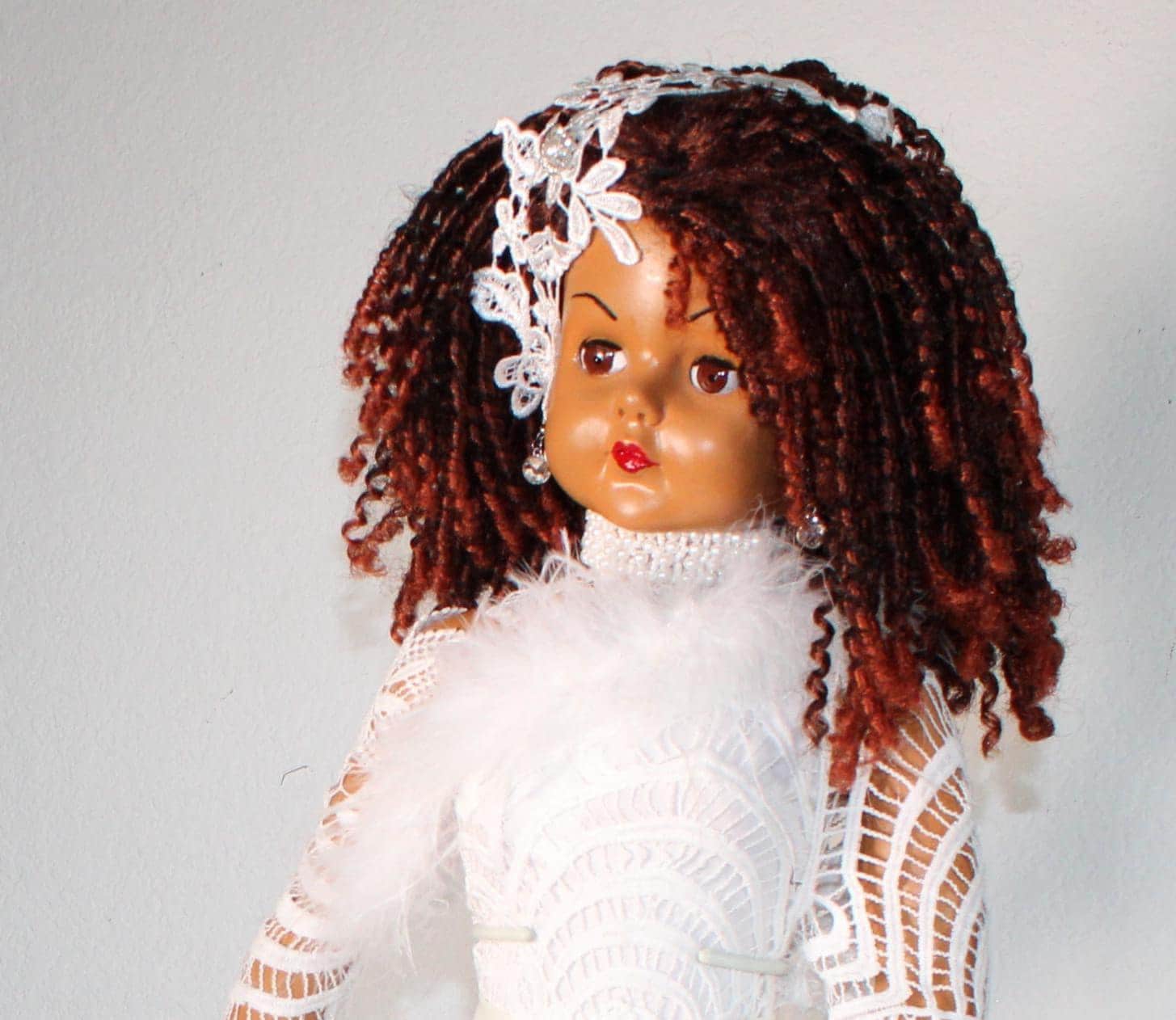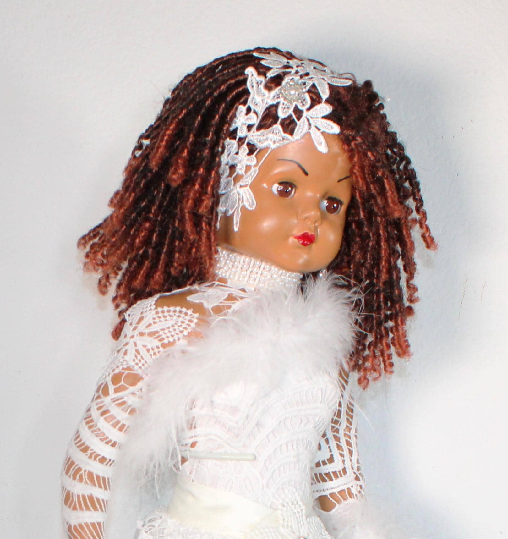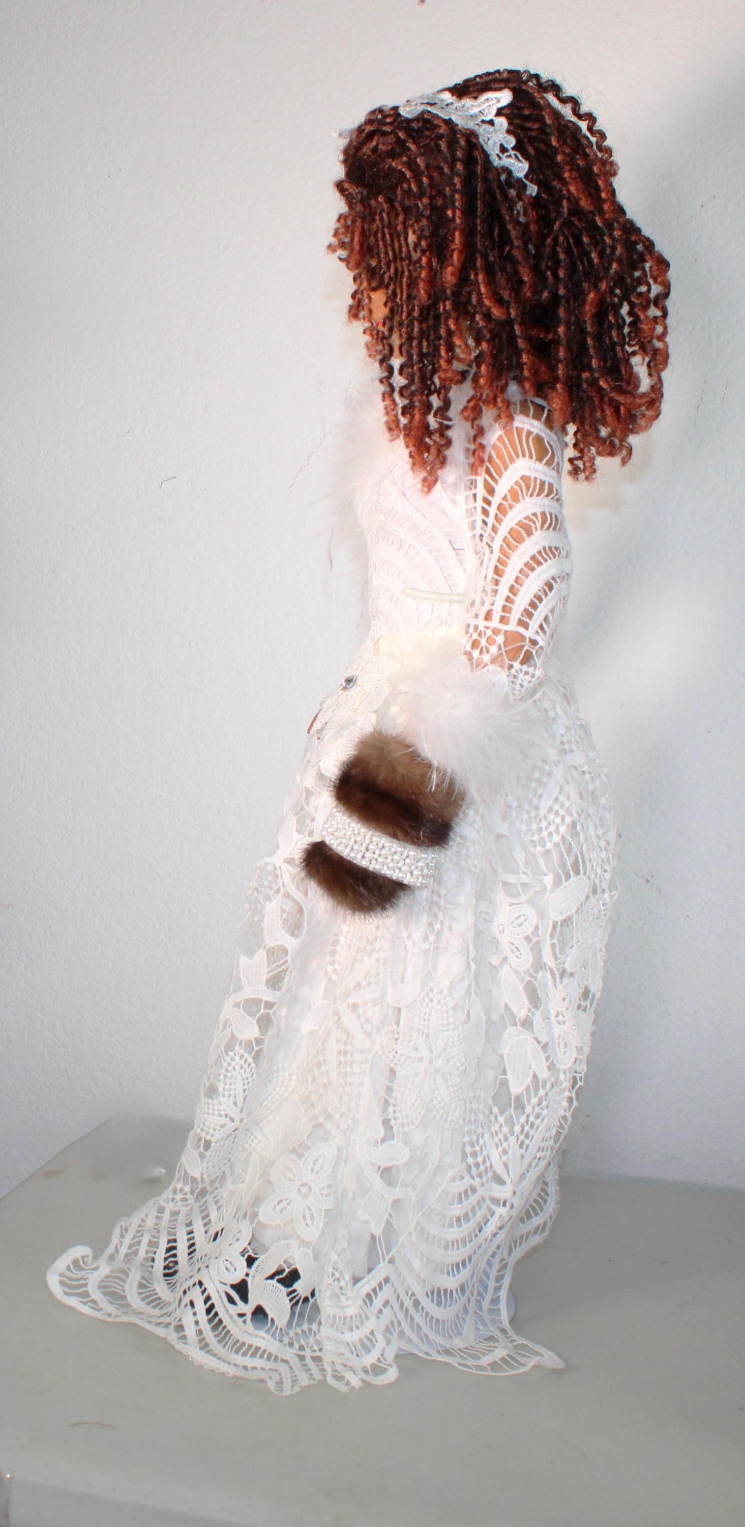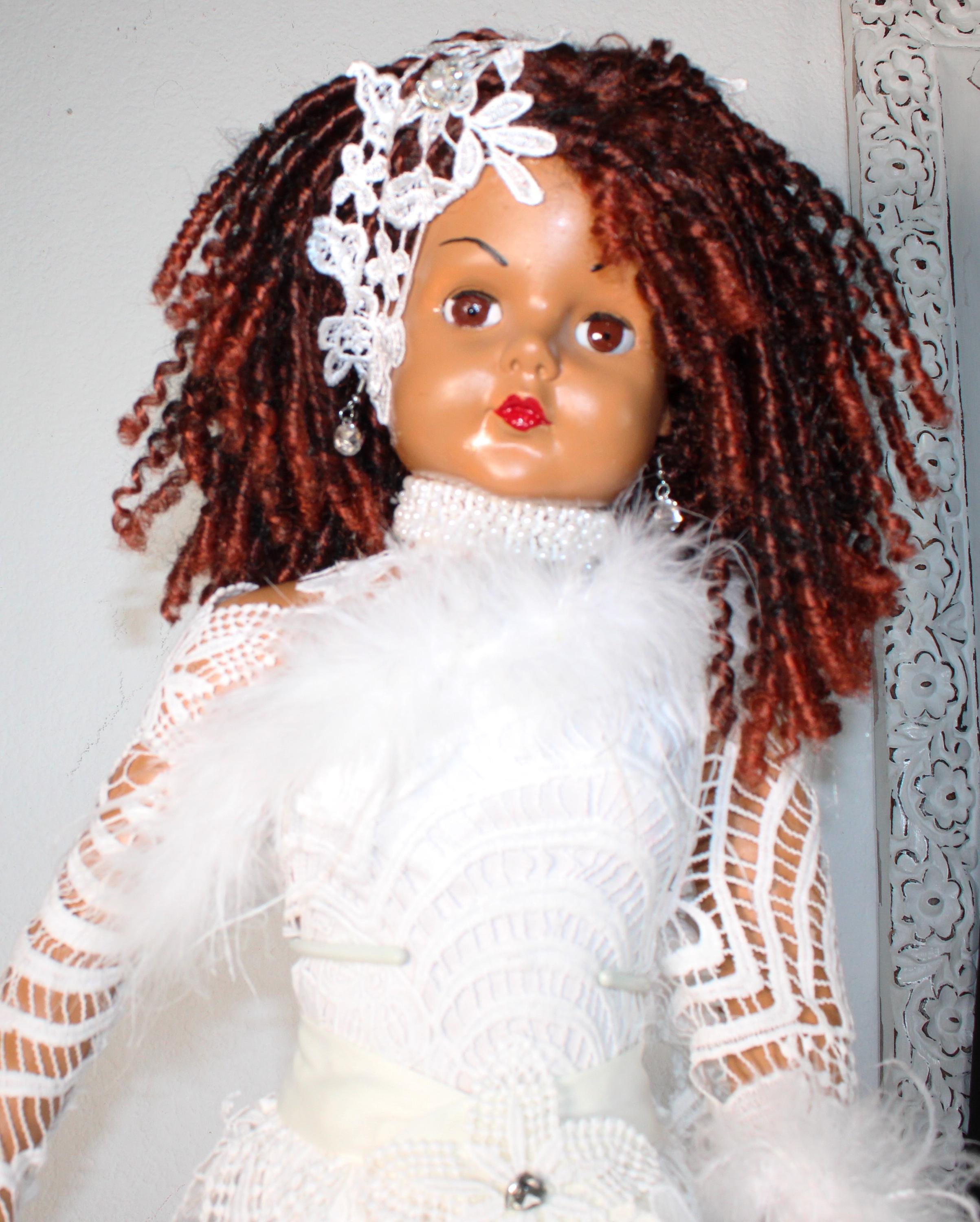 "MEESHAH"....A very tall 30" African American Doll. Dressed to the 9's in an elegant white applique lace evening ensemble. One shoulder dress accented with a touch of bling and boa feather trim. Long kinky curled hair with matching head band. Rhinestone dangle earrings to the ears and wearing black slippers. Mink muff in hand. Made of handpainted soft rubber and vinyl.