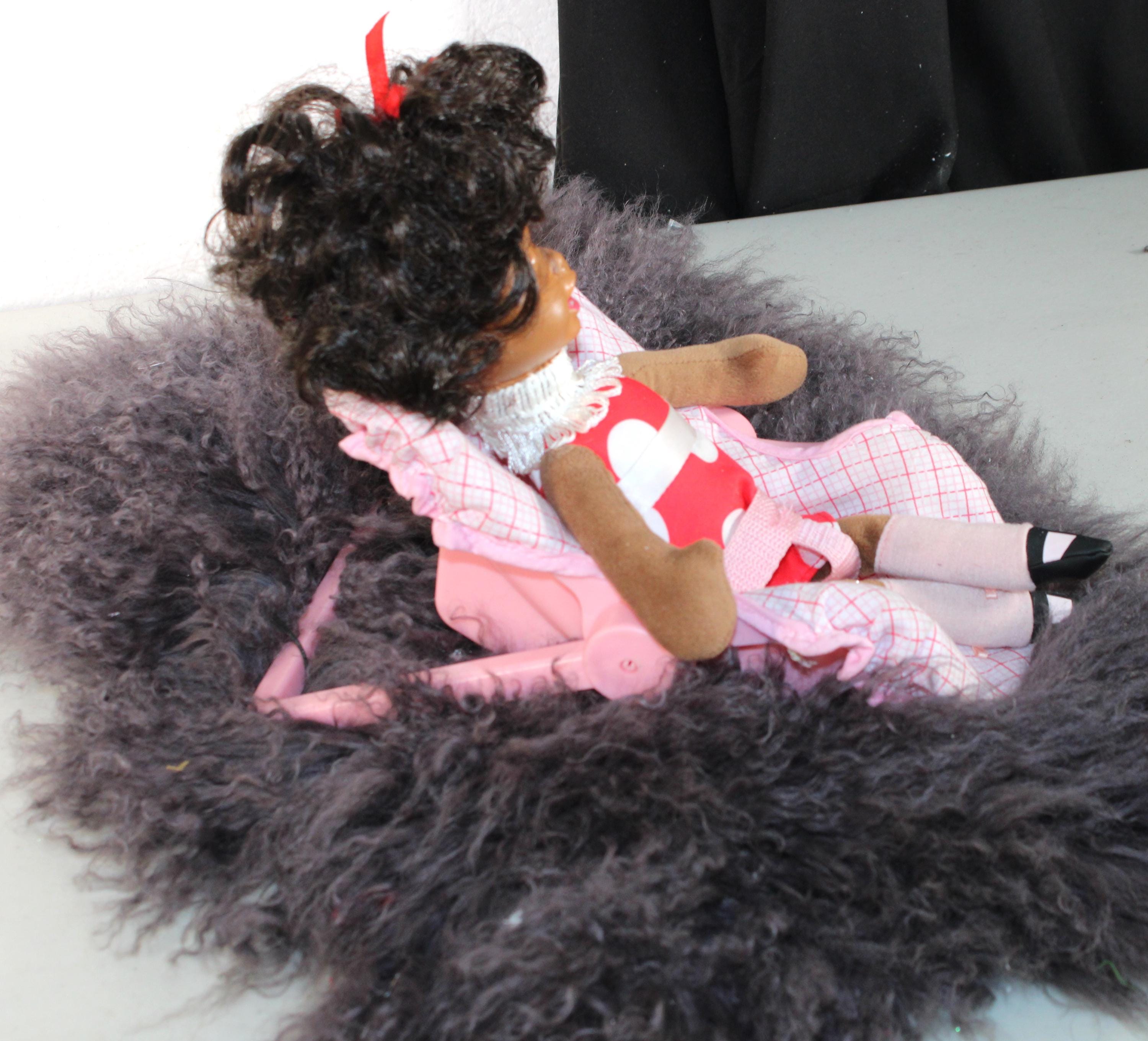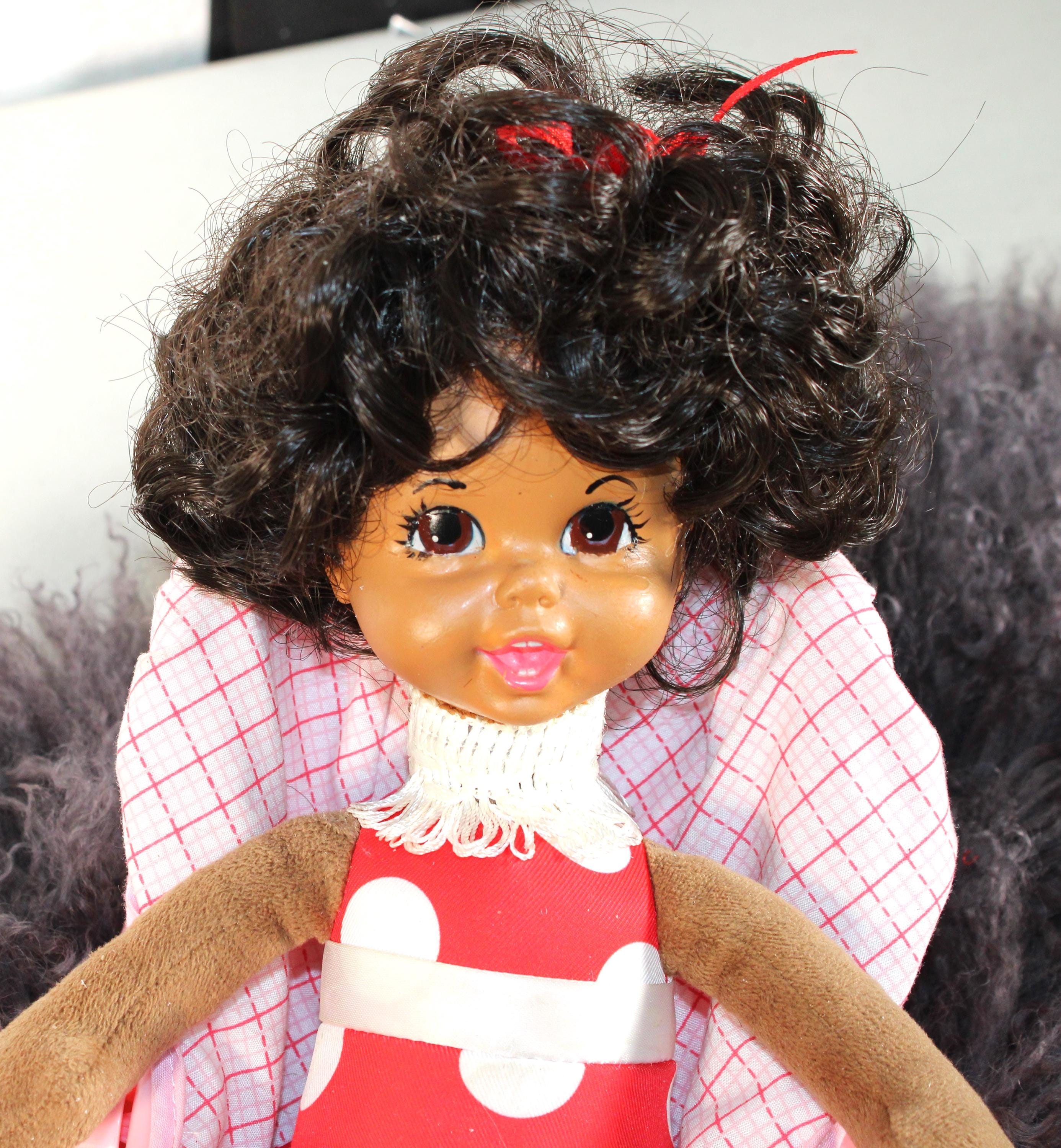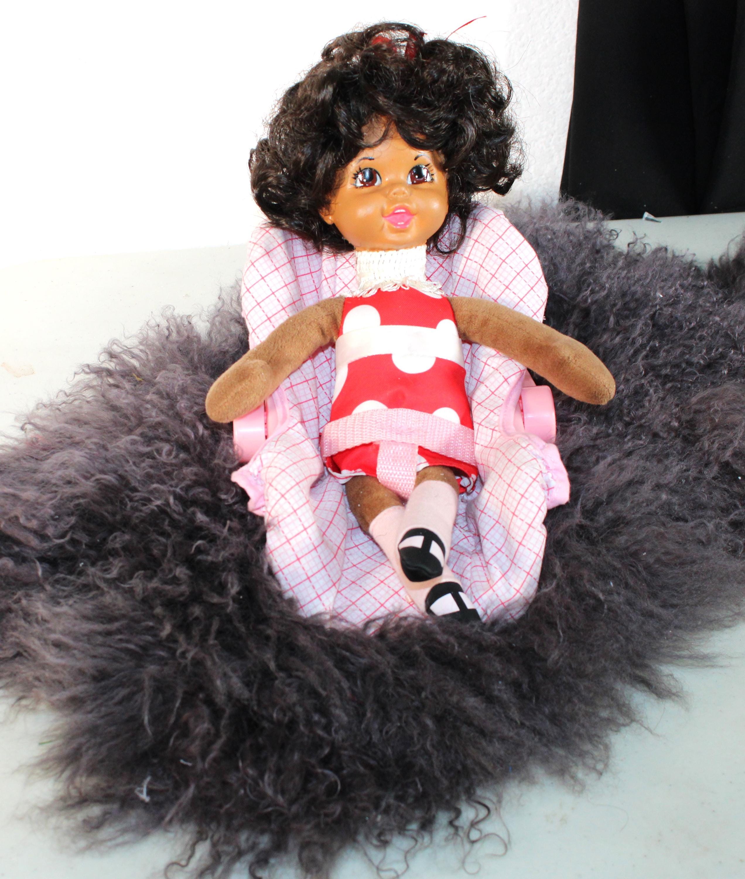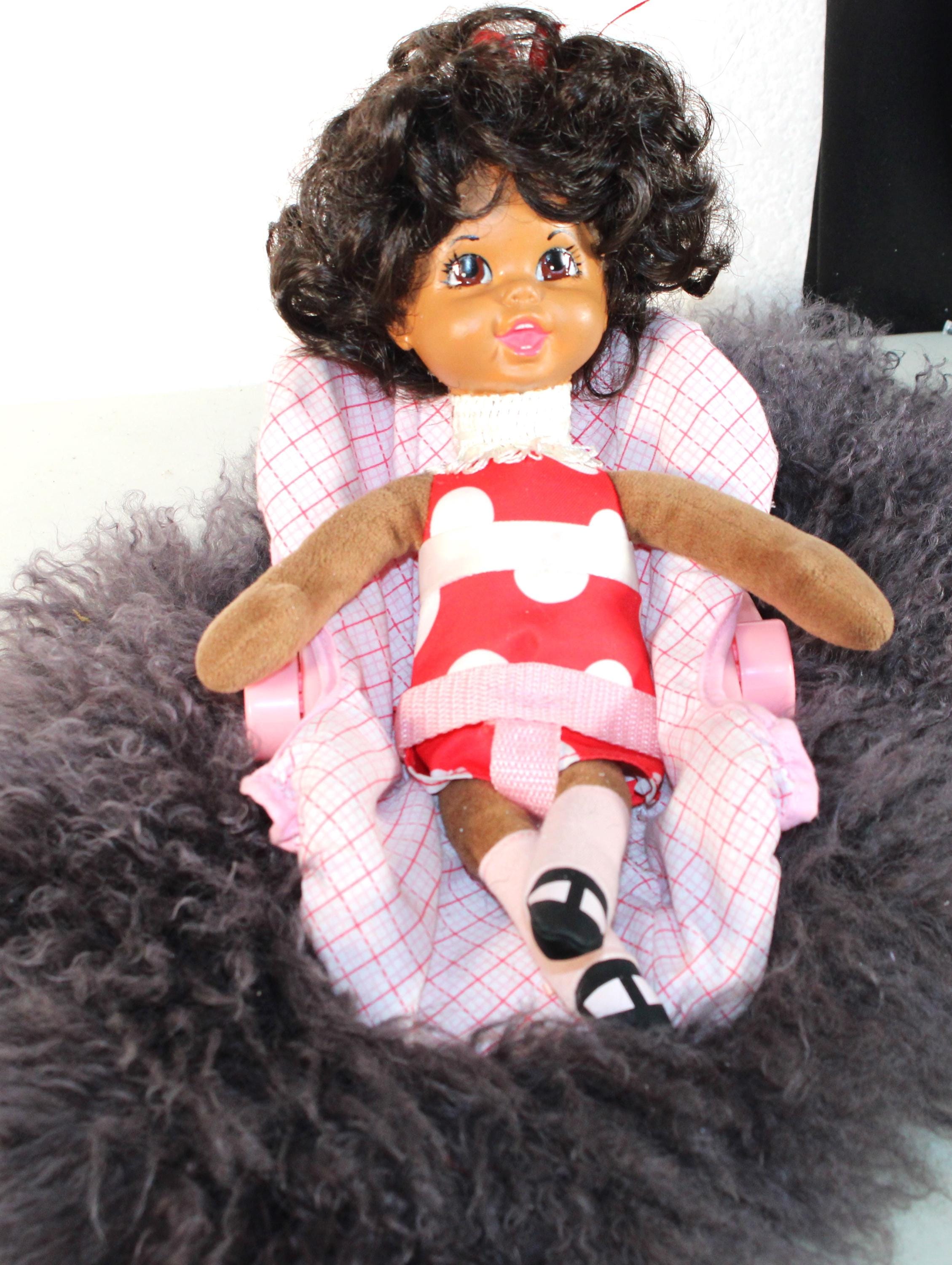 Angela... is an interactive 13" African American doll, relaxing in her car seat for the ride over to "NANA's for a sleep over. Dressed in a casual ensemble of red and white with black mary jane shoes. Short black curly hair with ribbon and big brown eyes. Car seat comes with. Battery operated, she talks and lights up when finger button is pressed. Made of soft vinyl and fabric.