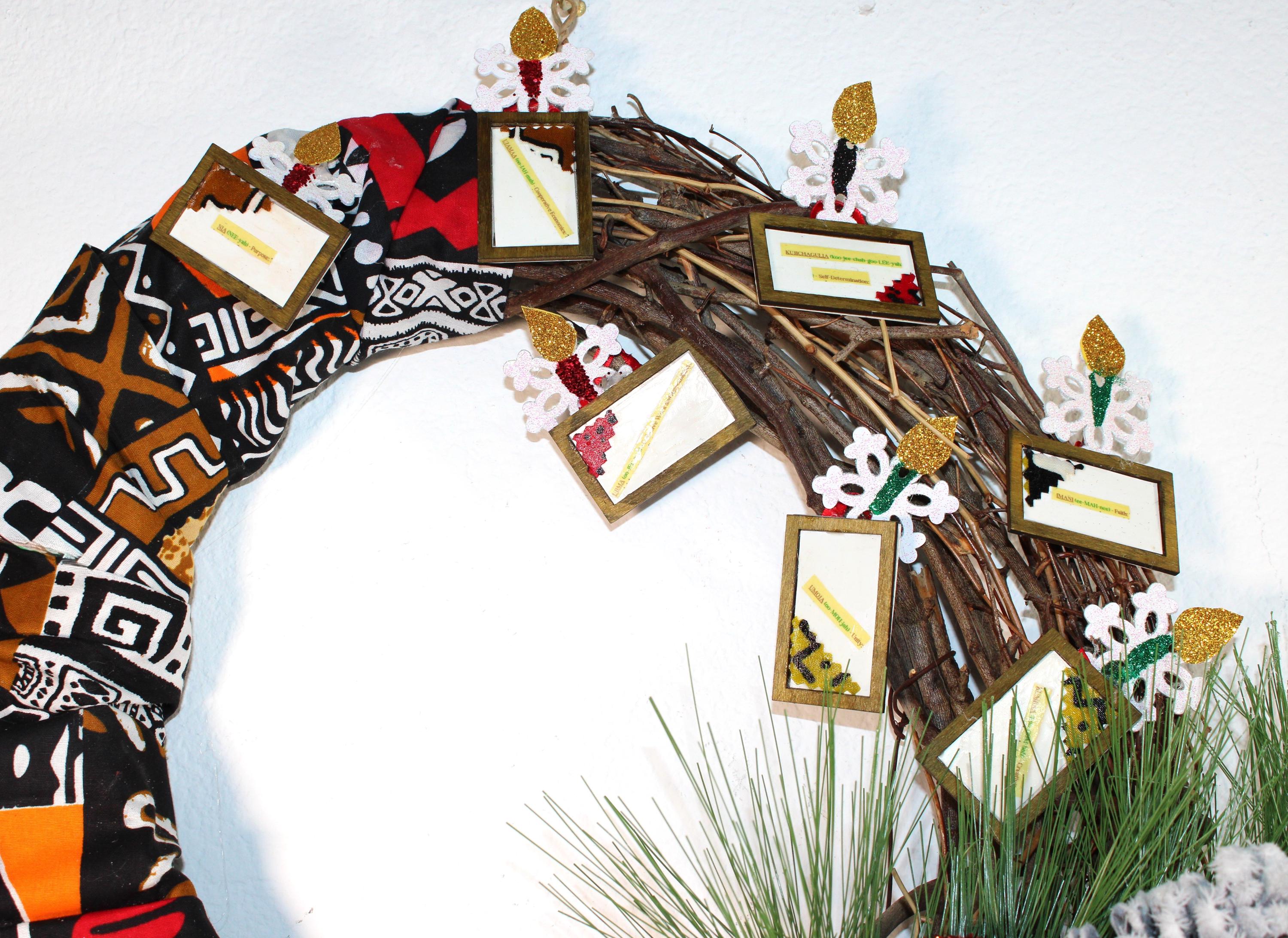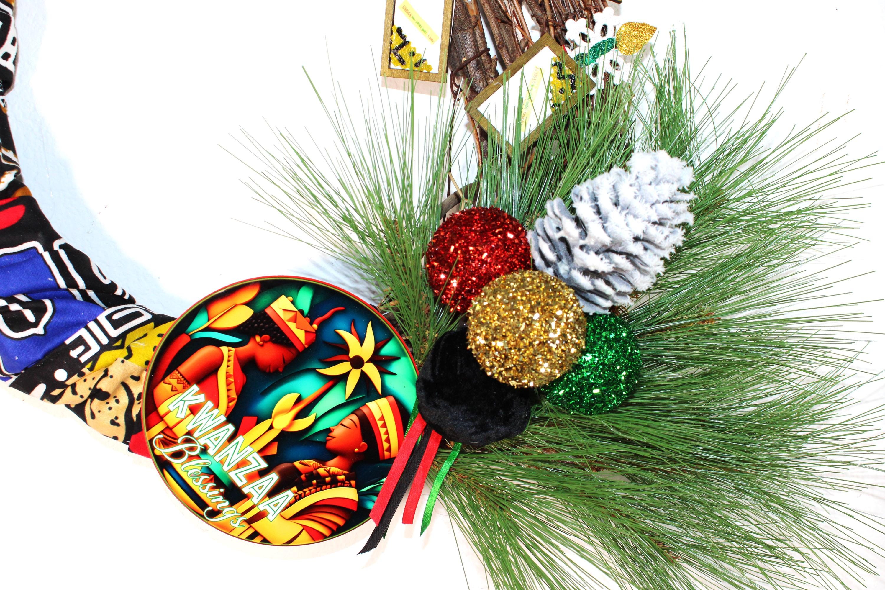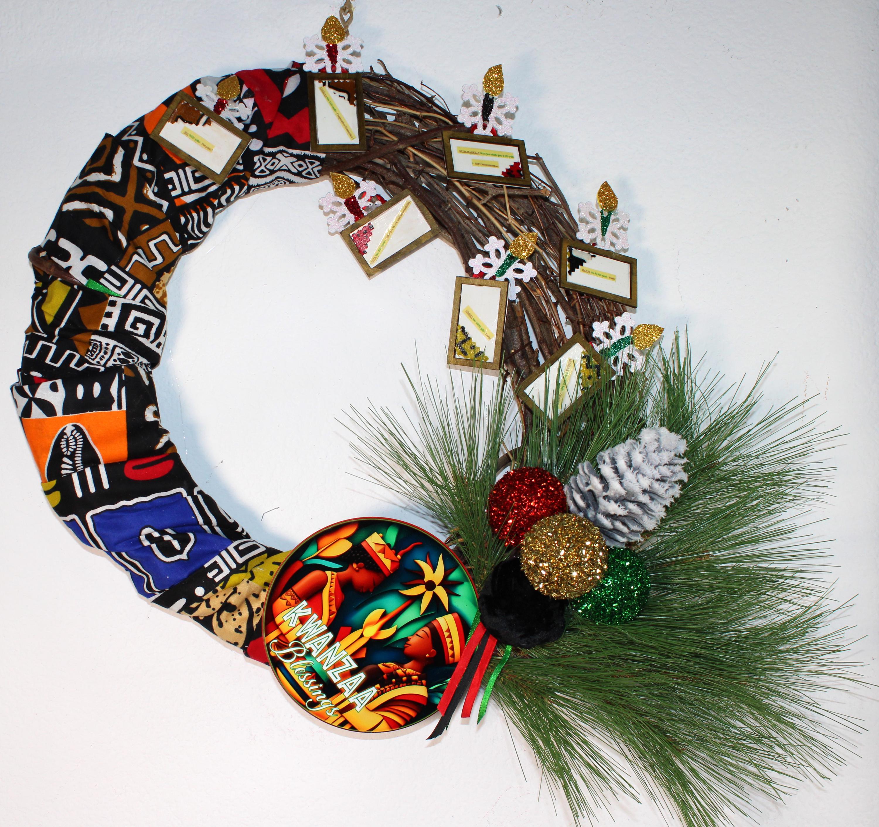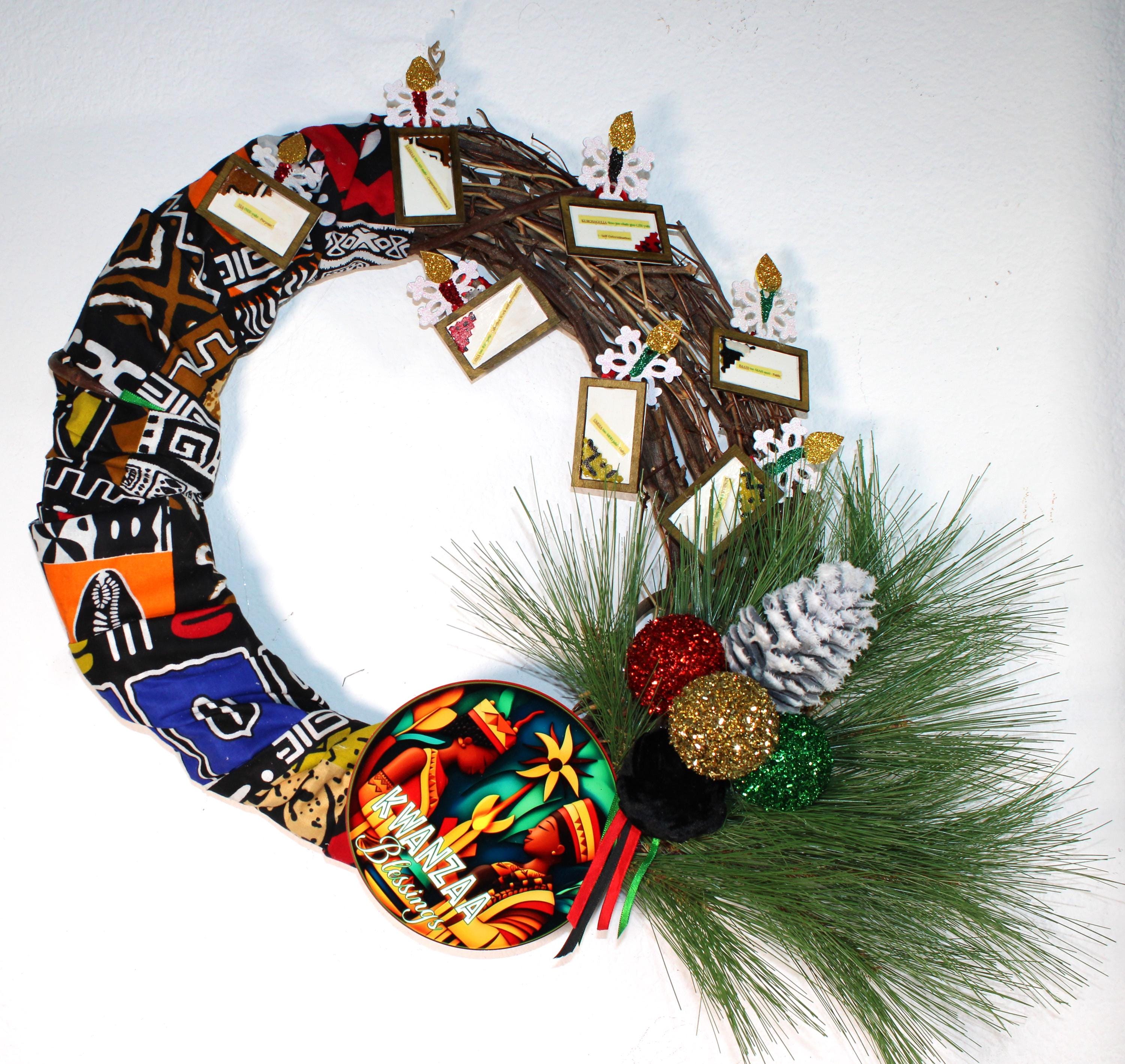 A KWANZAA BLESSING Door Wreath featuring 7 framed Kwanzaa Principles with lighted candles on a grapevine and Kente clothed wreath. Decorated with metal KWANZAA BLESSING greeting sign surrounded with ethnic colored ornaments and ribbons, flocked pine cones and greenery.