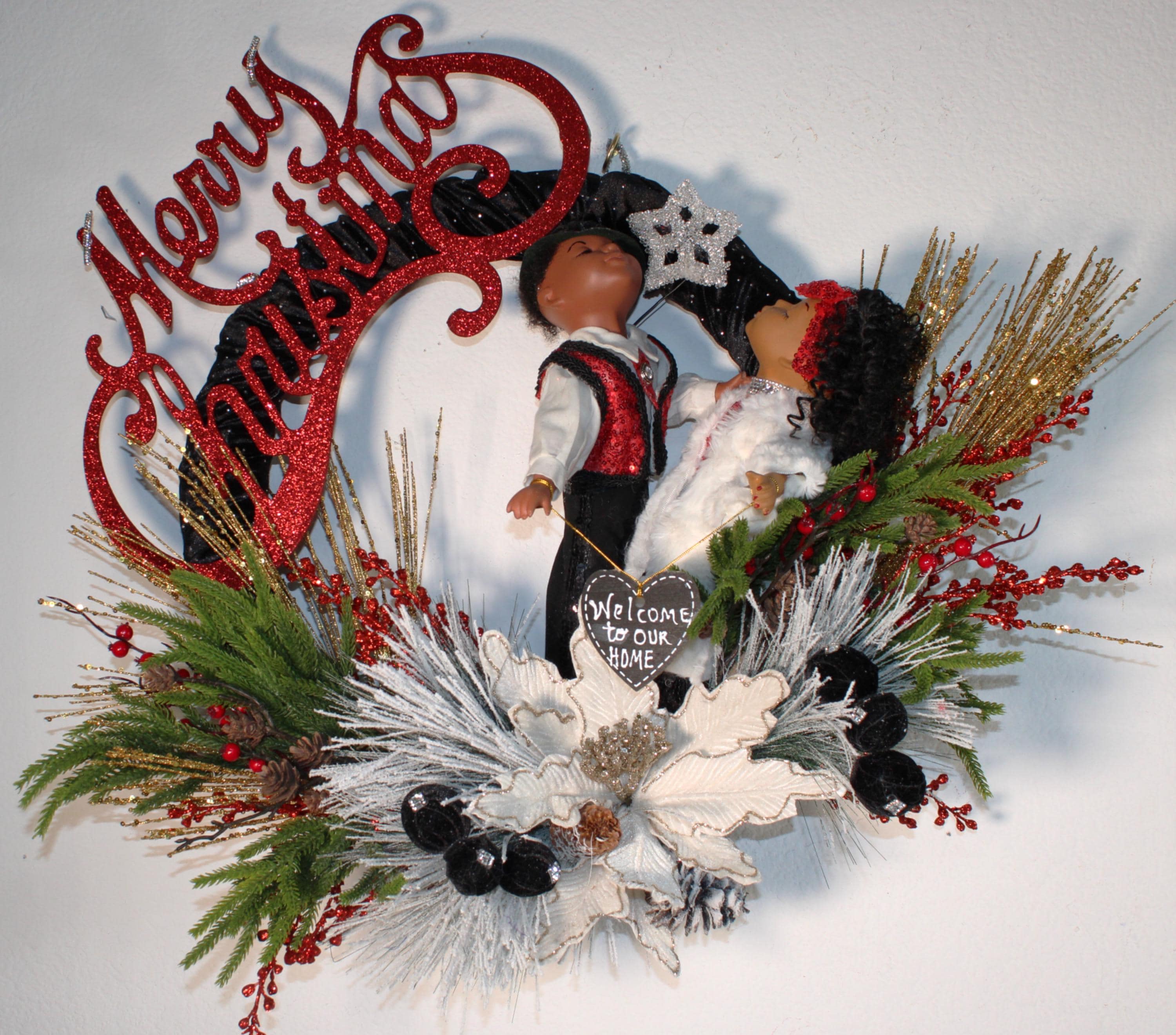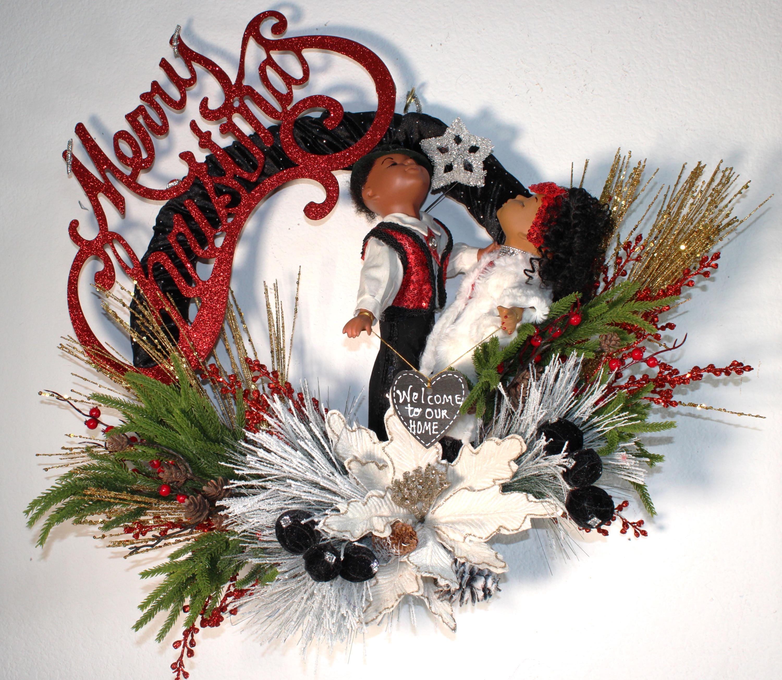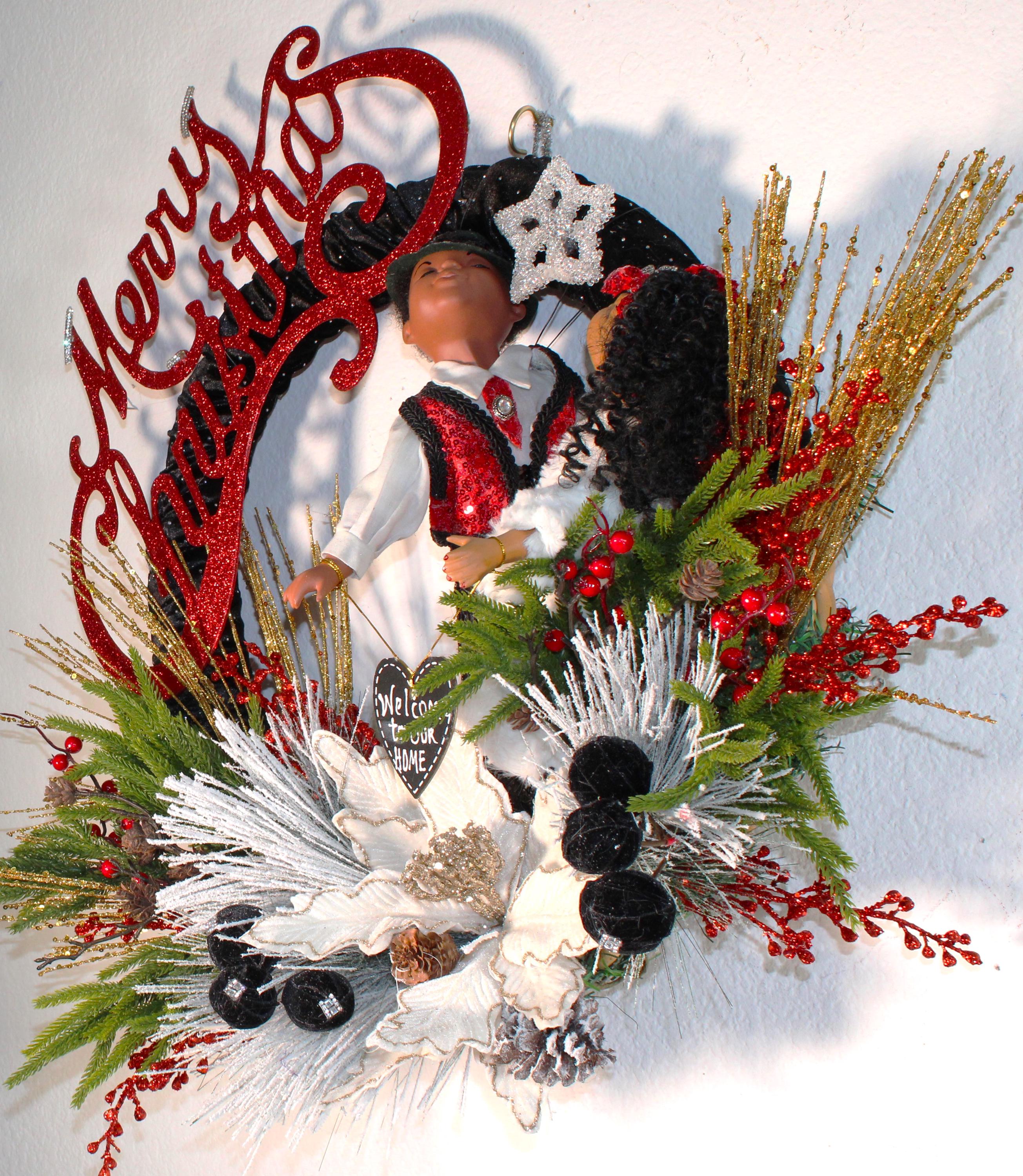 Kissing Porcelain Dolls all up dressed in sequins and fur are there to greet and welcome your friends to your home for the holiday season. IF BLING IS YOUR THING....then this very elegant CHRISTMAS Wreath is specifically designed for YOUR door this holiday. Large vine wreath covered with black velvet fabric that's embedded with tiny rhinestones. Decorated with colorful Christmas florals and greenery, a large glitter coated Merry Christmas sign and rhinestone topped pom poms blanketing the center gold tipped poinsettia. I also accept personalized prepaid special orders.