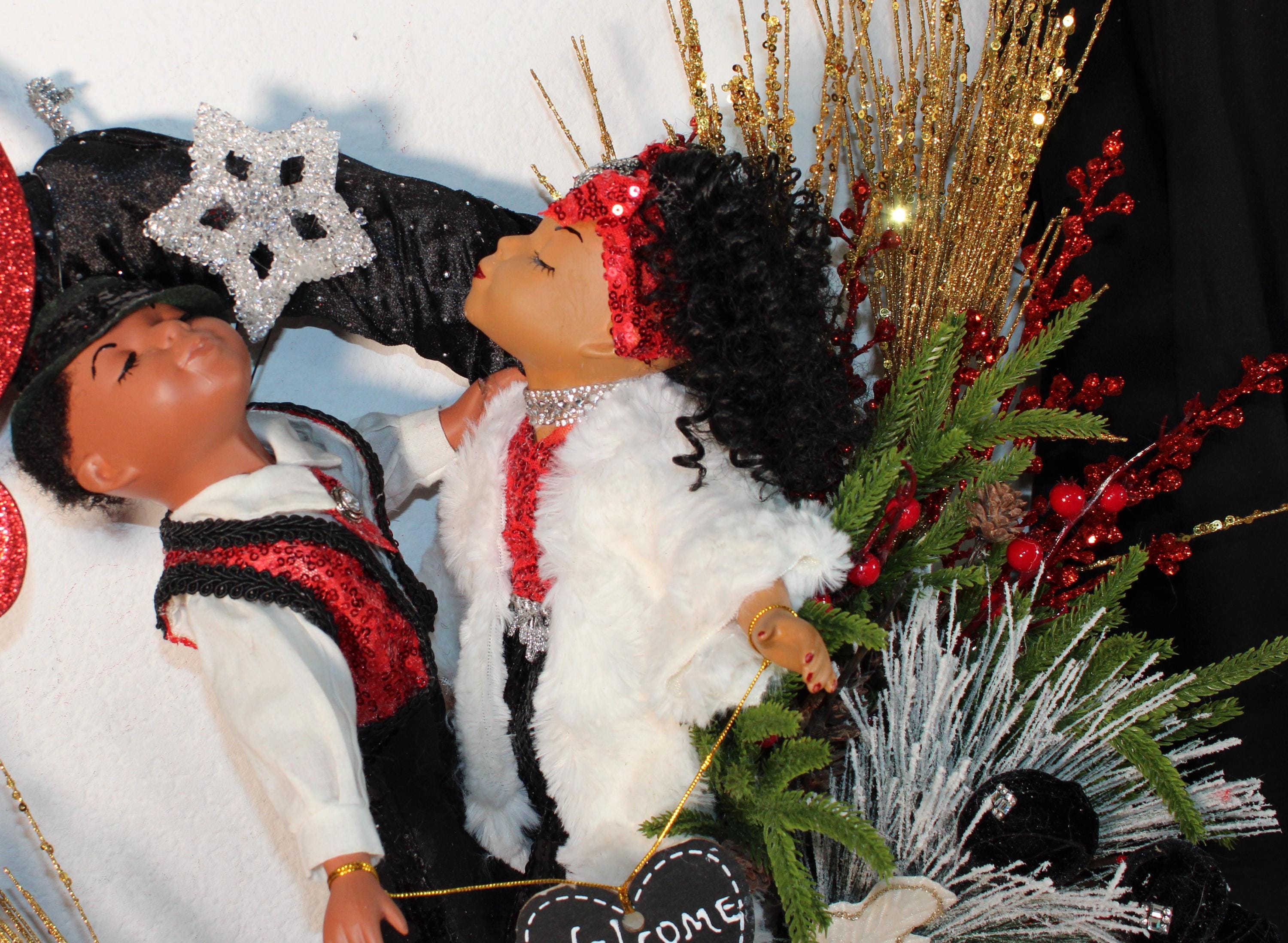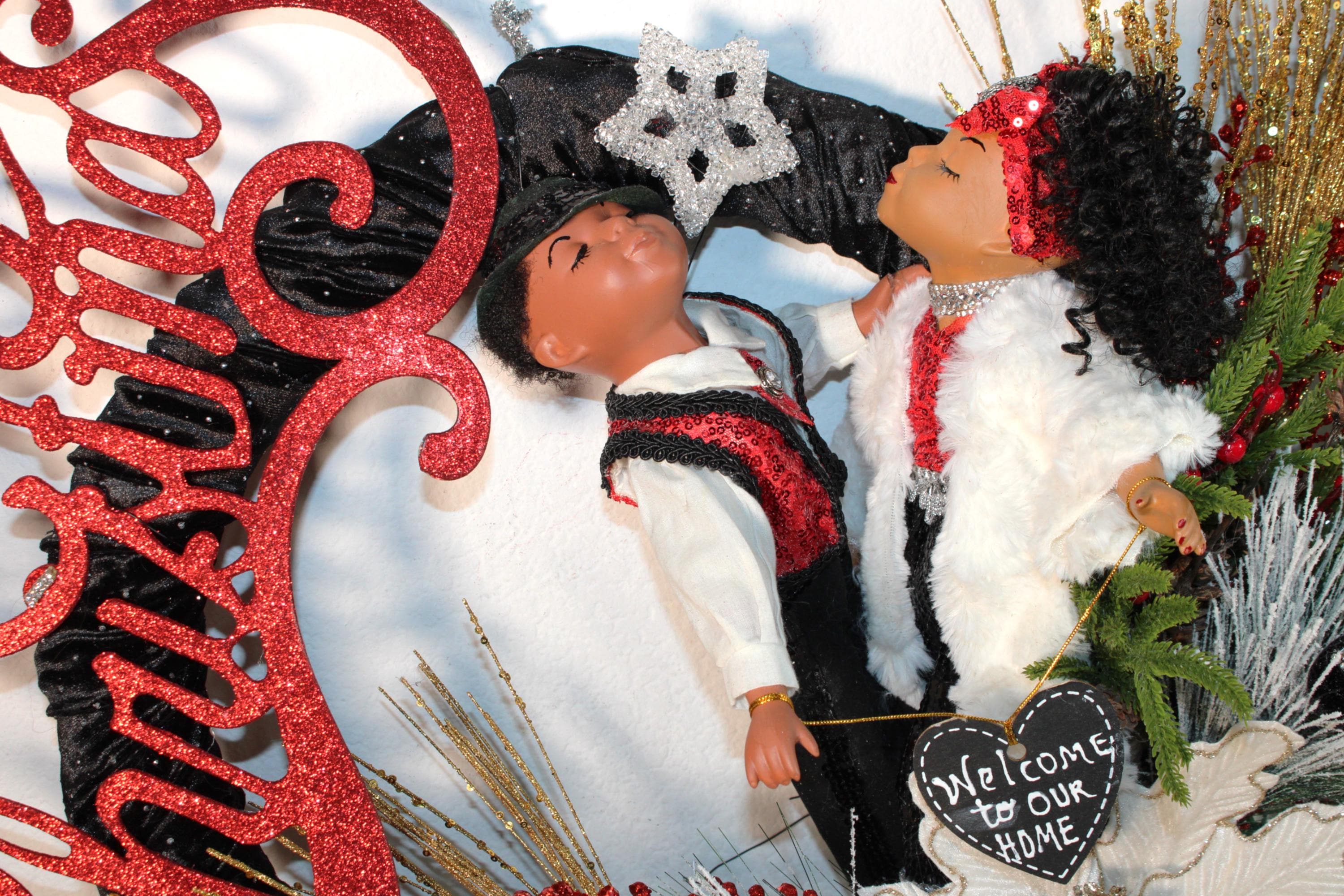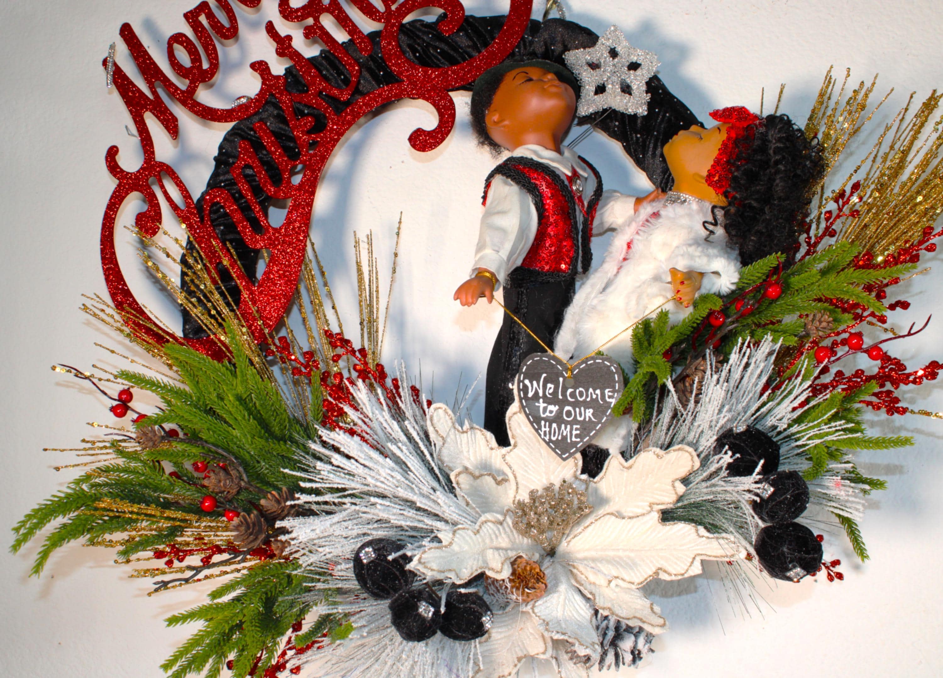 Kissing Porcelain Dolls all up dressed in sequins and fur are there to greet and welcome your friends to your home for the holiday season. IF BLING IS YOUR THING....then this very elegant CHRISTMAS Wreath is specifically designed for YOUR door this holiday. Large vine wreath covered with black velvet fabric that's embedded with tiny rhinestones. Decorated with colorful Christmas florals and greenery, a large glitter coated Merry Christmas sign and rhinestone topped pom poms blanketing the center gold tipped poinsettia. I also accept personalized prepaid special orders.
