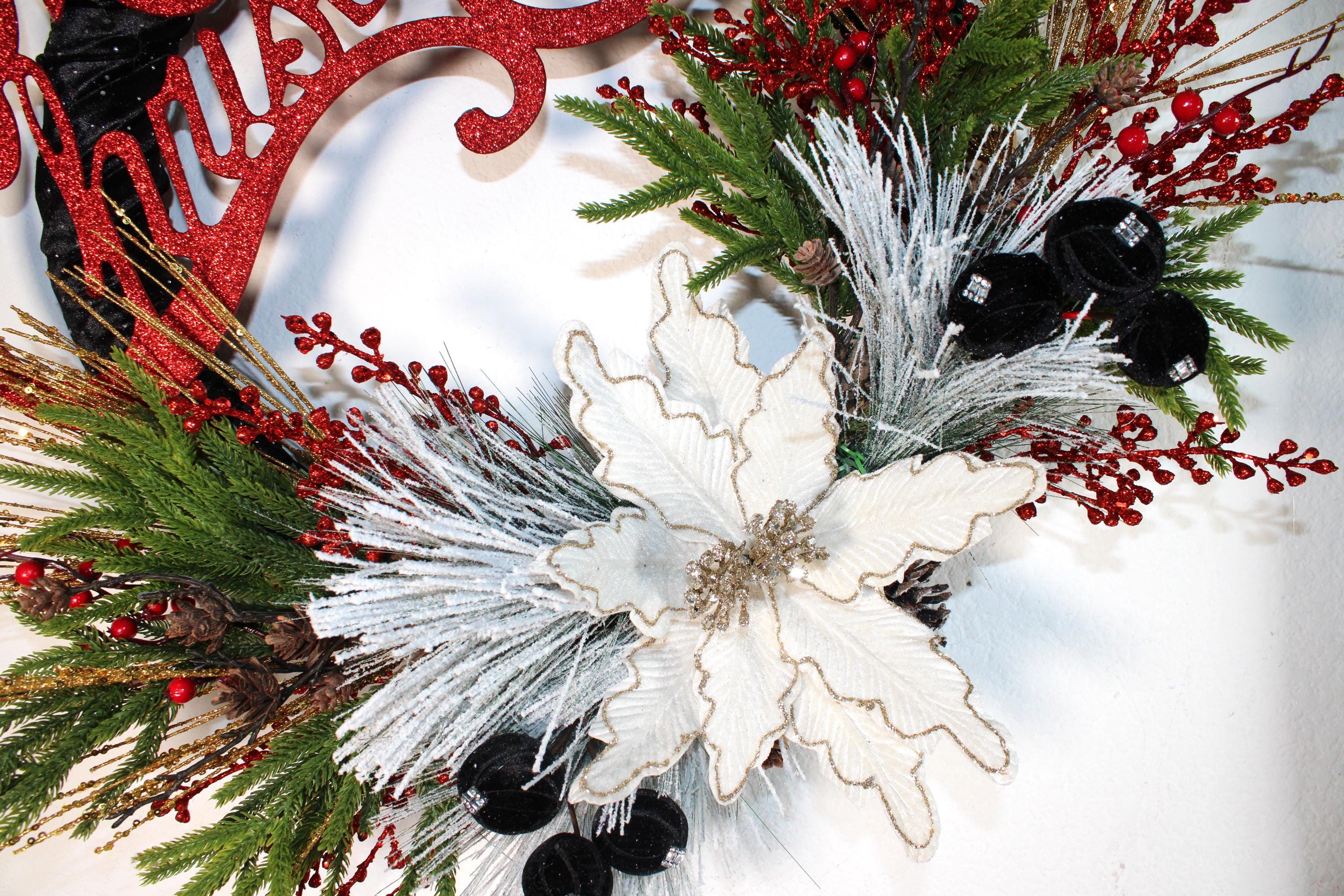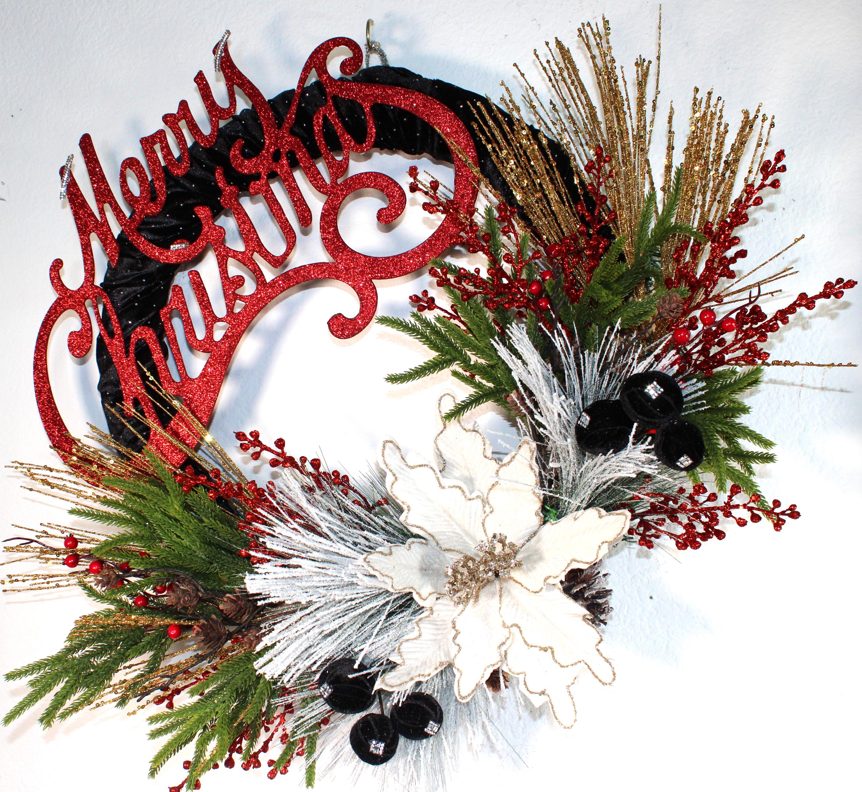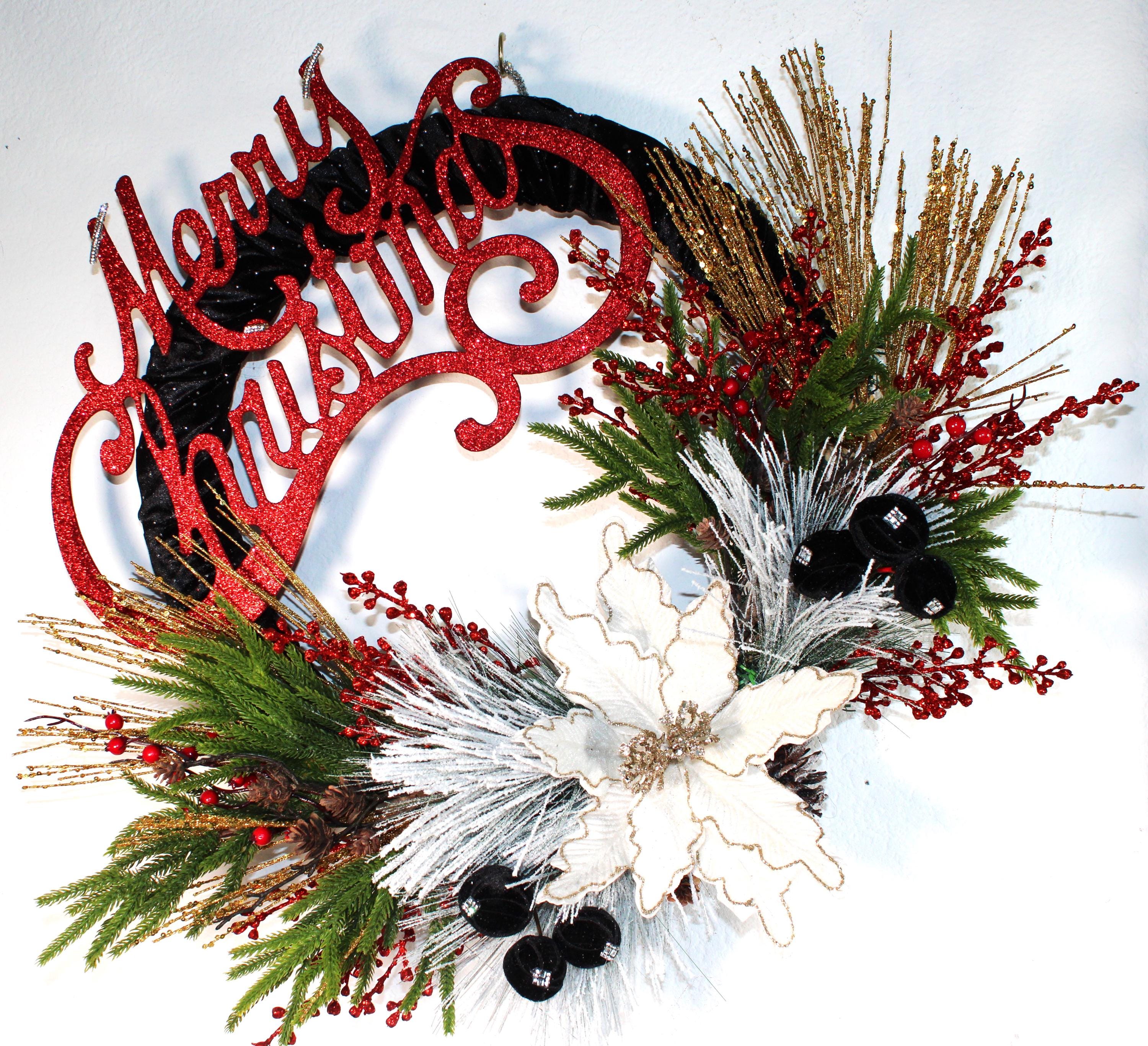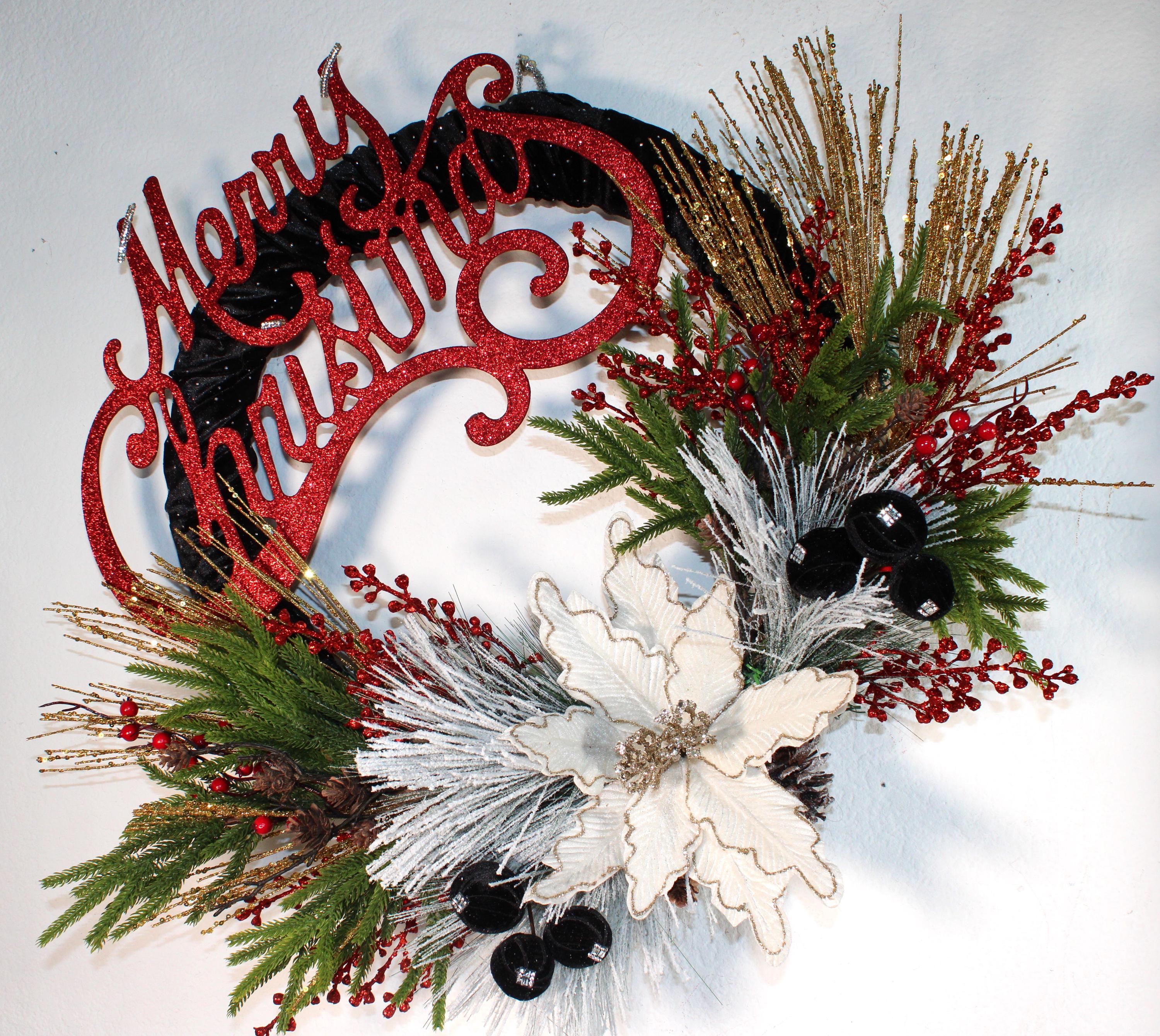 IF BLING IS YOUR THING....then this very elegant CHRISTMAS Wreath is specifically designed for YOUR door this holiday. Large vine wreath covered with black velvet fabric that's embellished with embedded with tiny rhinestones. Decorated with colorful Christmas florals and greenery, a large glitter coated Merry Christmas sign and rhinestone topped pom poms blanketing the center gold tipped poinsettia. I accept prepaid special orders.