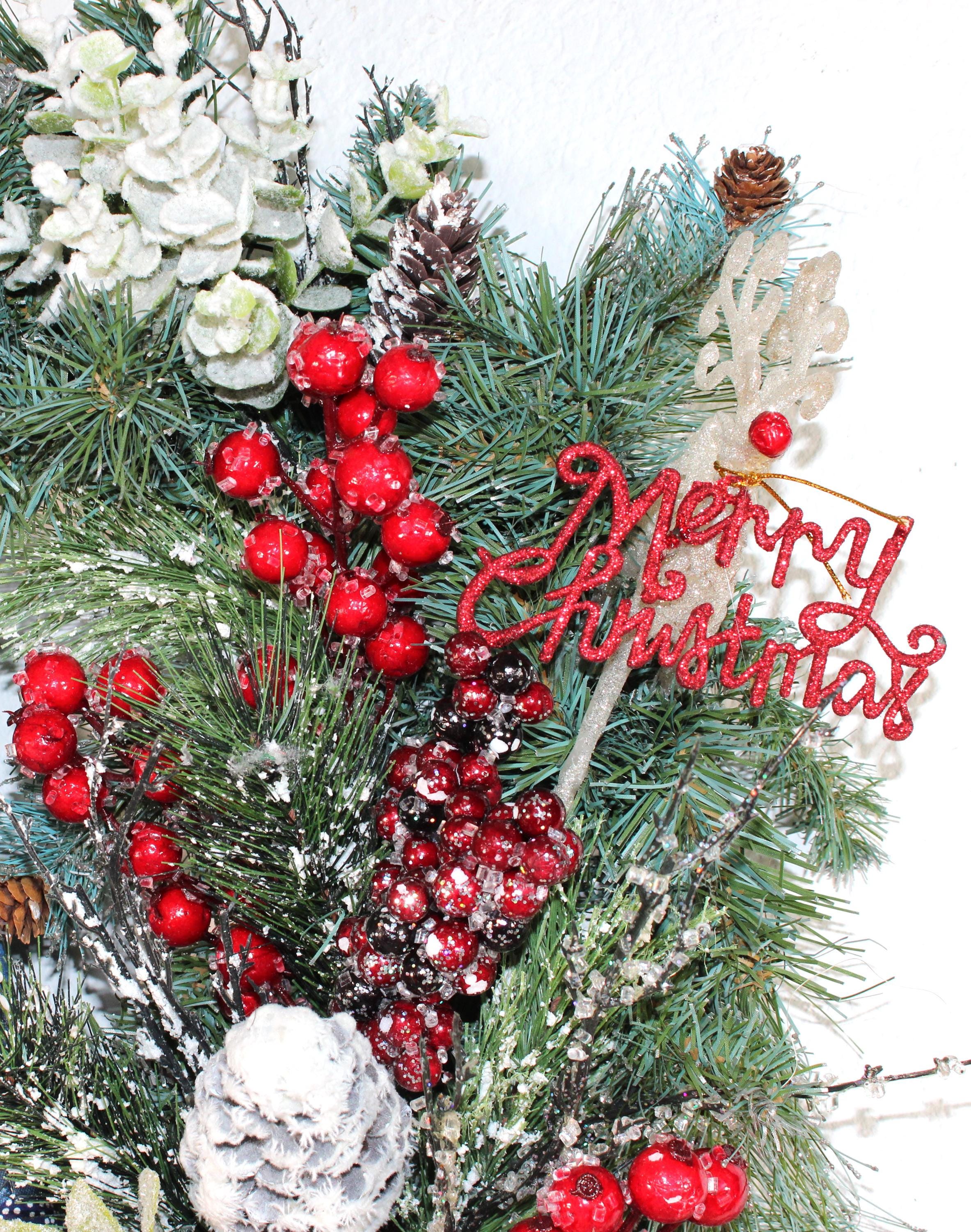 CHRISTMAS/WELCOME TO OUR HOME...An African American Holiday Door Wreath featuring Porcelain kissing dolls dressed in ethnic attire with tones of blue, white and black. Green Wreath accented with flocked Christmas florals, flocked pine cones, a red nose reindeer with a red glitter Merry Christmas greeting. WELCOME to OUR HOME sign in the hand of the lady. Snowflake in the hand of the gent.
