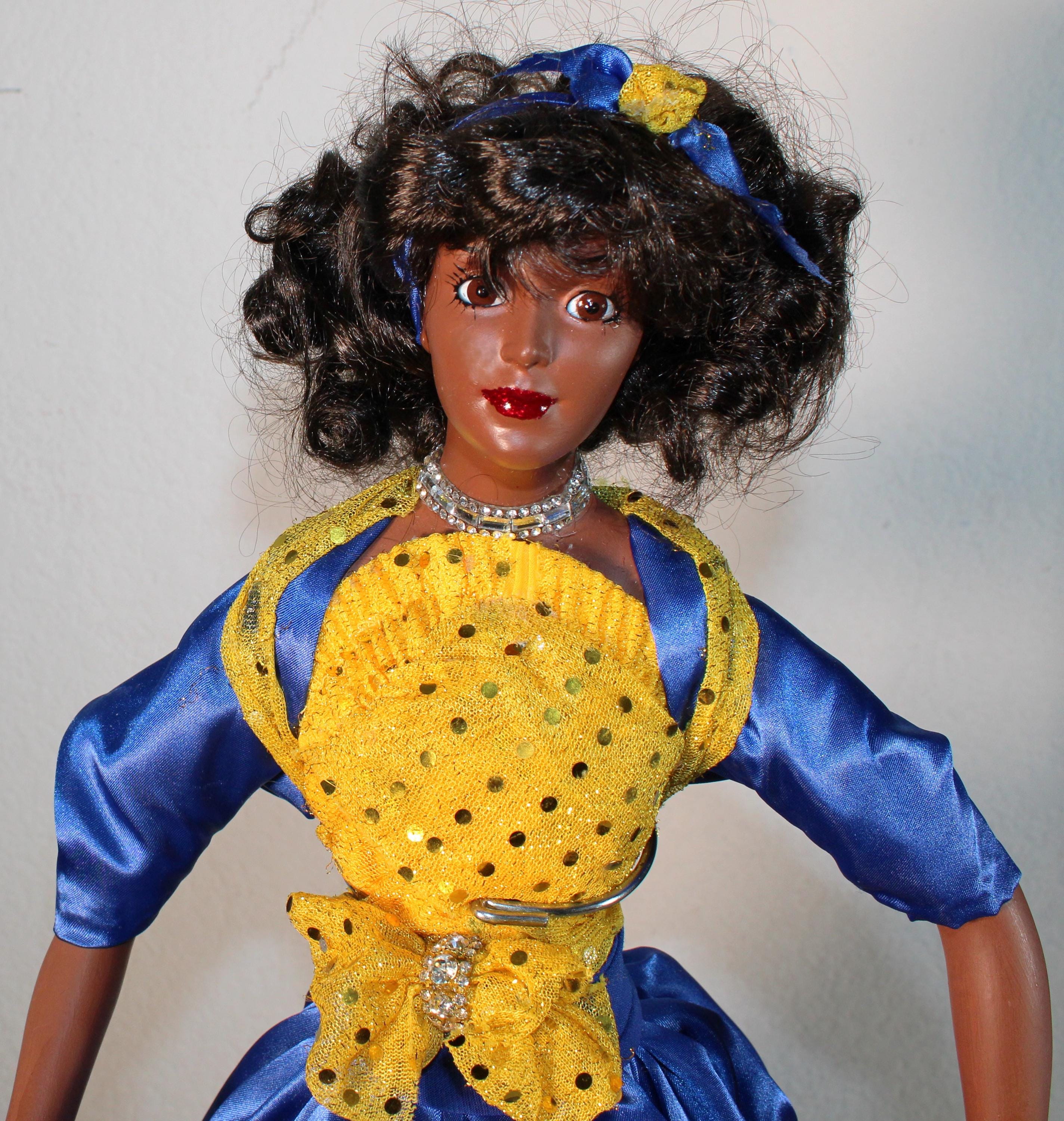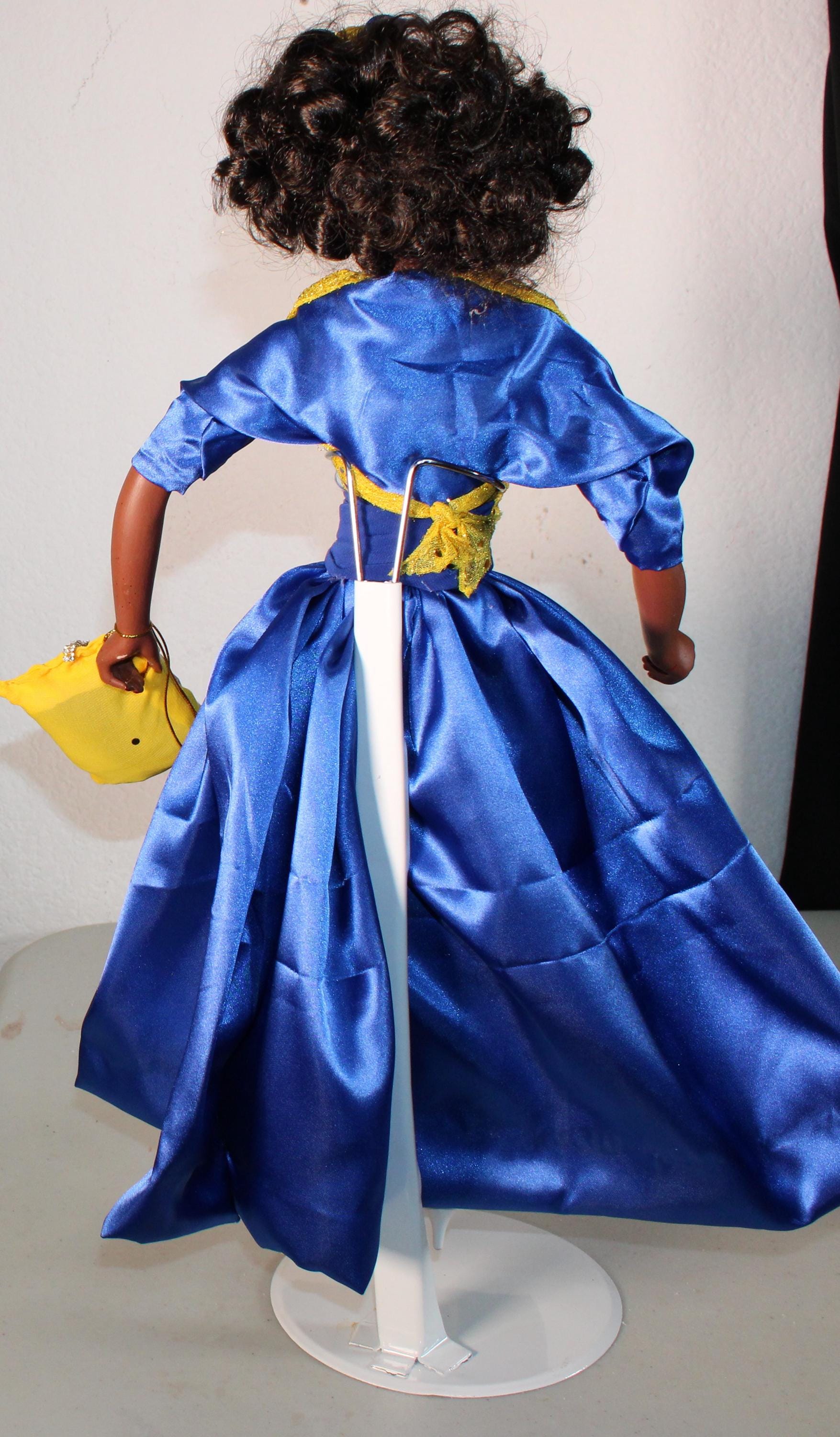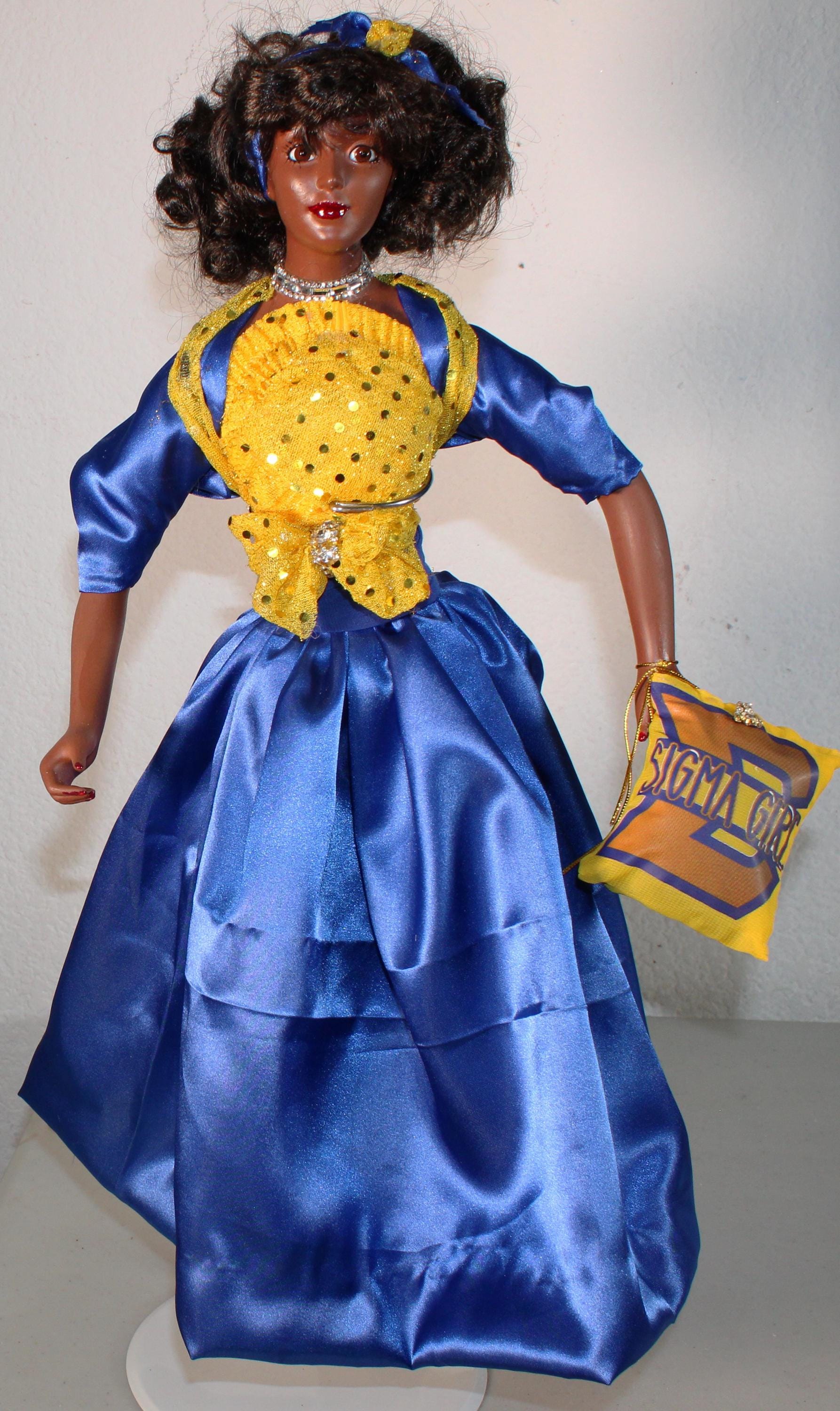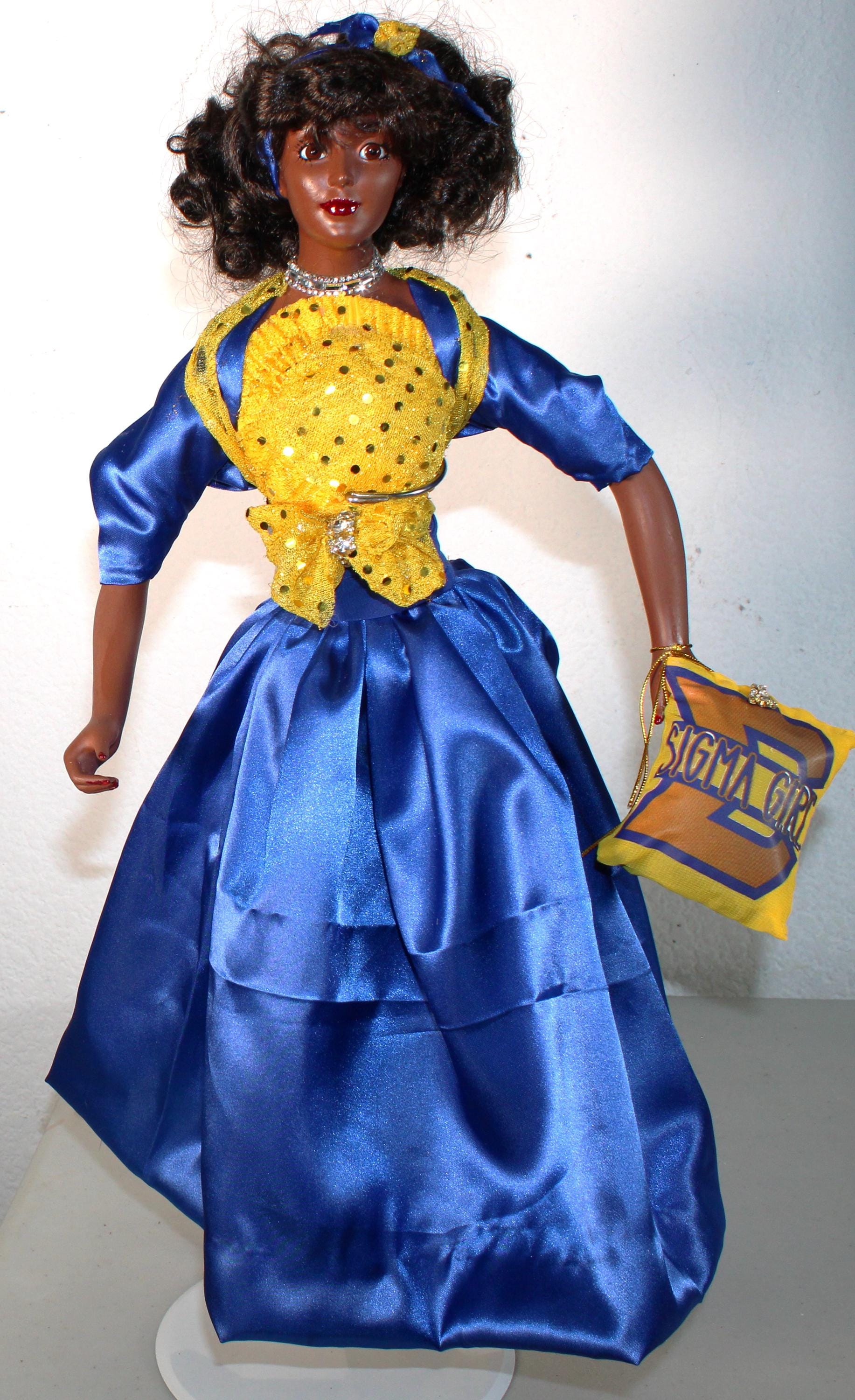SIGMA GAMMA RHO.....An 20" African American Soror Girl with beautiful brown eyes. Dressed in an ensemble that bares her signature colors of blue and gold with rhinestone accessories. Matching shoes, logo handbag. Curly black hair with a matching headband. Made of hand painted porcelain and fabric.