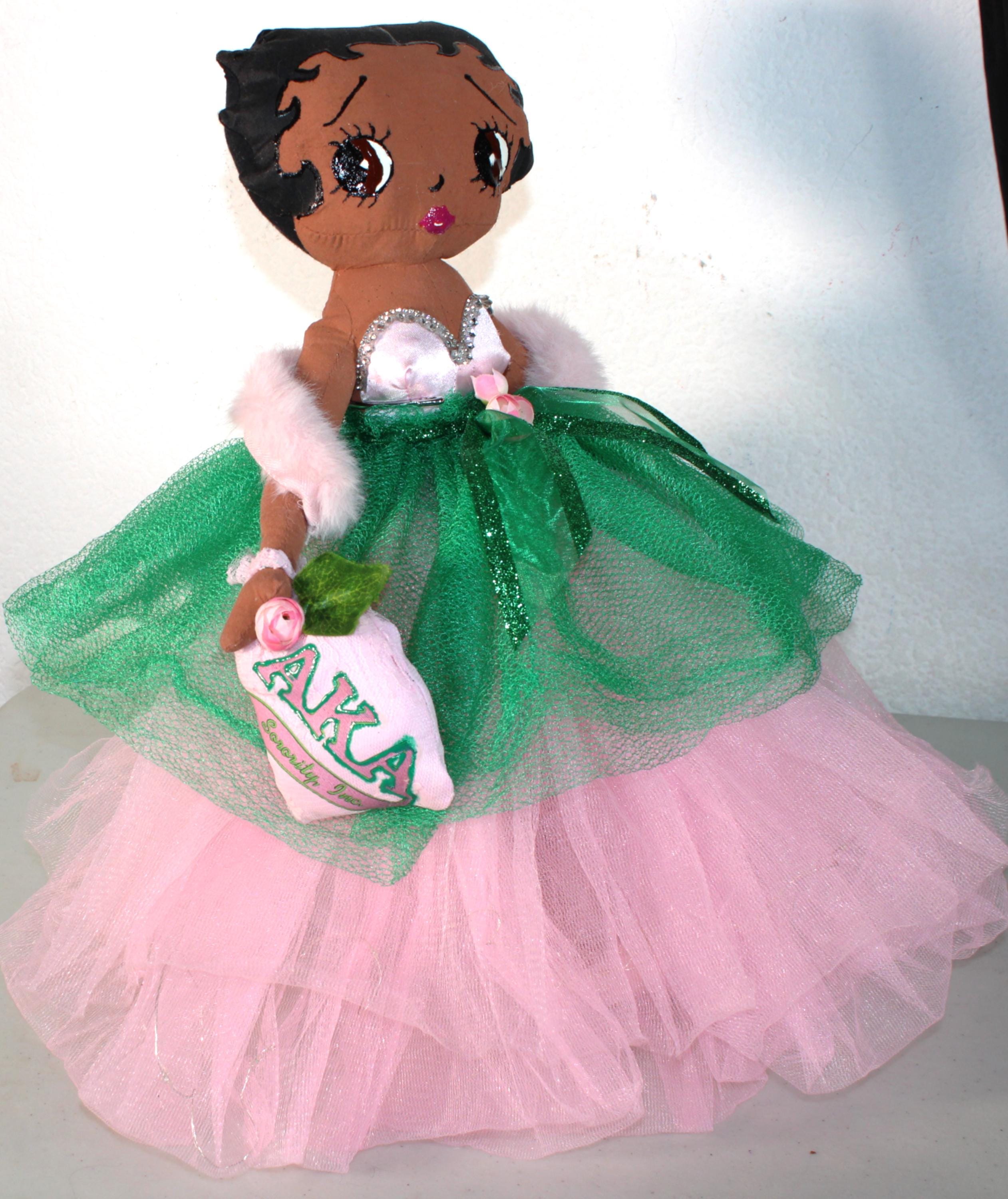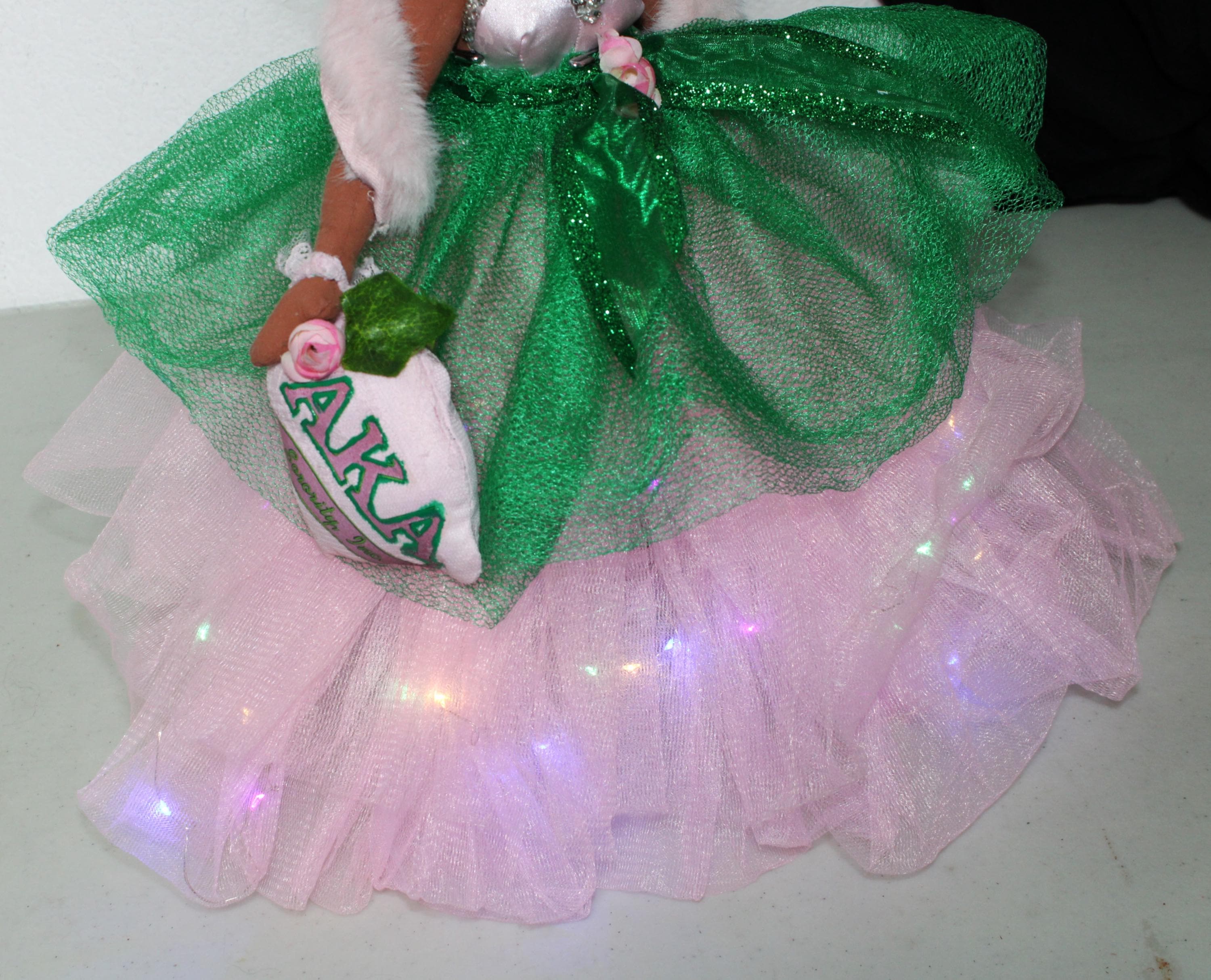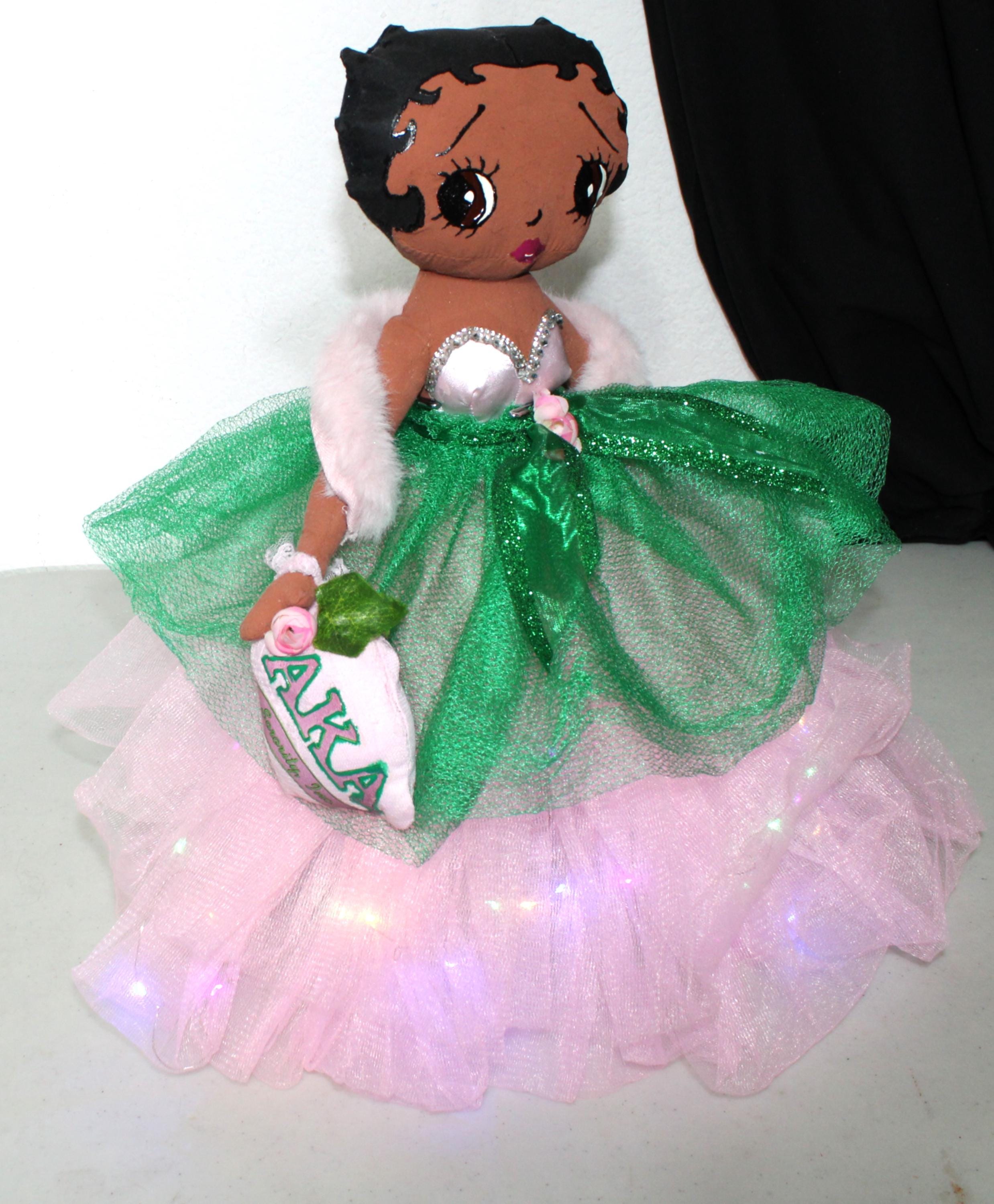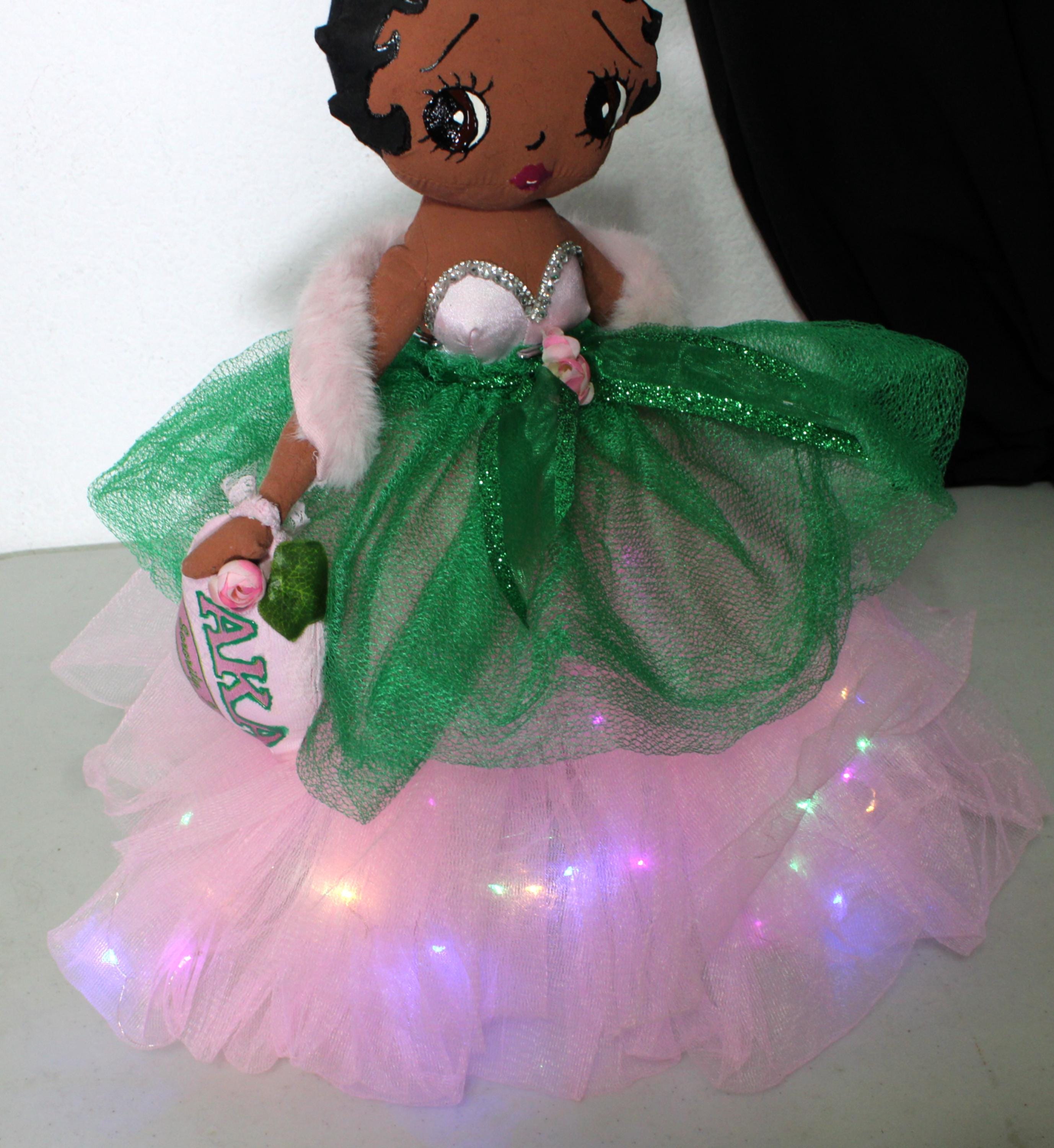 AKA.....A 17" African American Betty Boop in a signature colors of pink and green. Sparkling pink skirt that lights up (battery operated) with a satin rhinestone trimmed bustier. Green tulip net overlay with metallic ribbon belt Matching shoes, faux fur shawl and earrings. Logo lettered handbag. Made of handpainted fabric.
