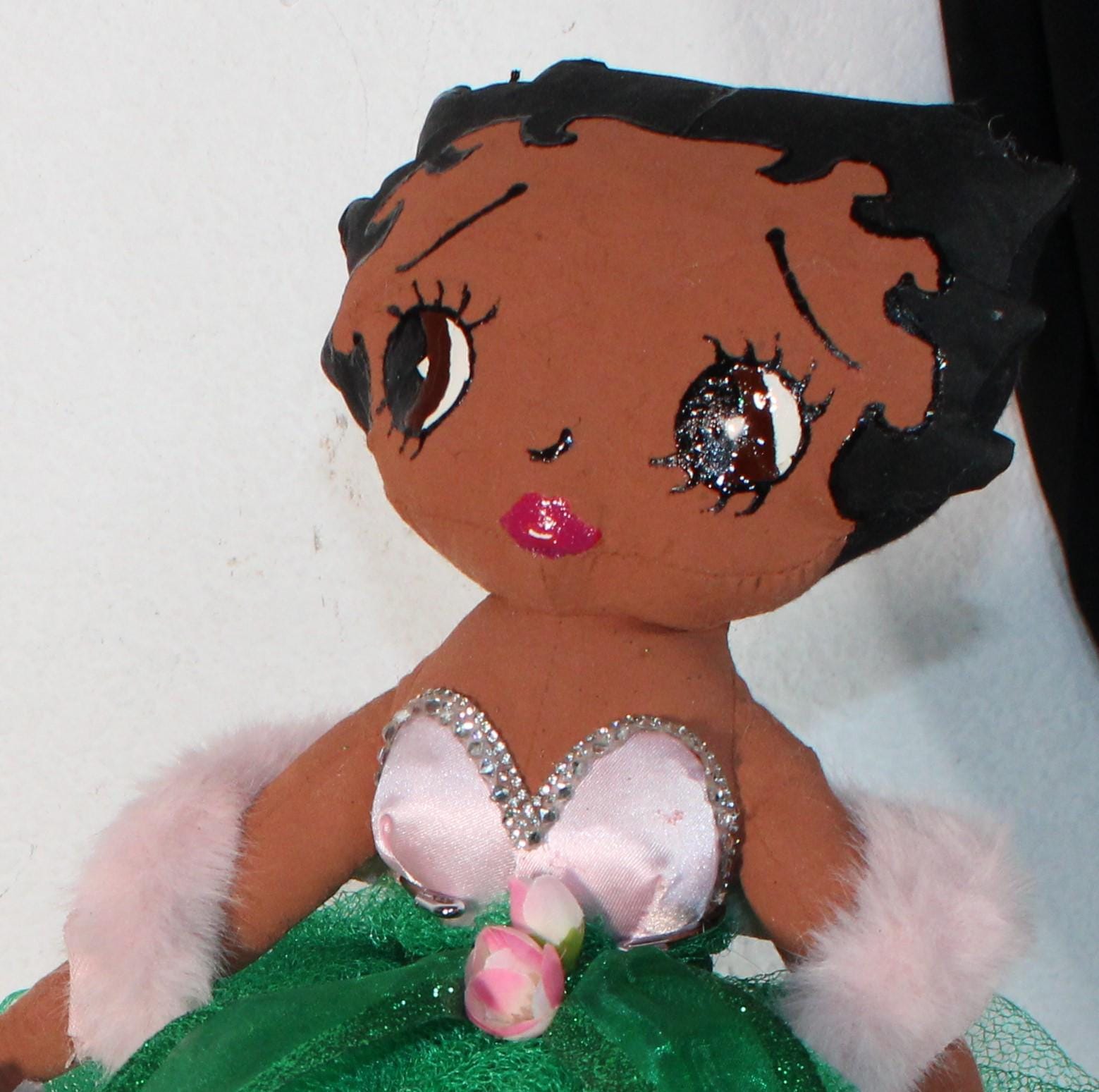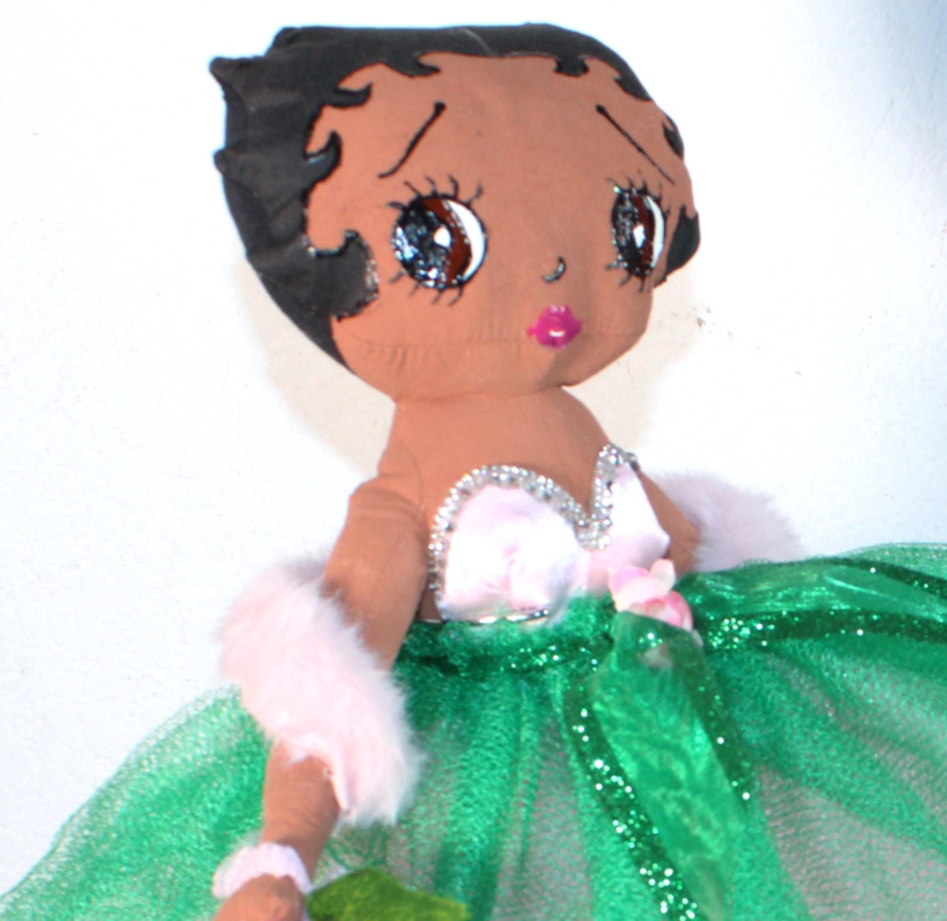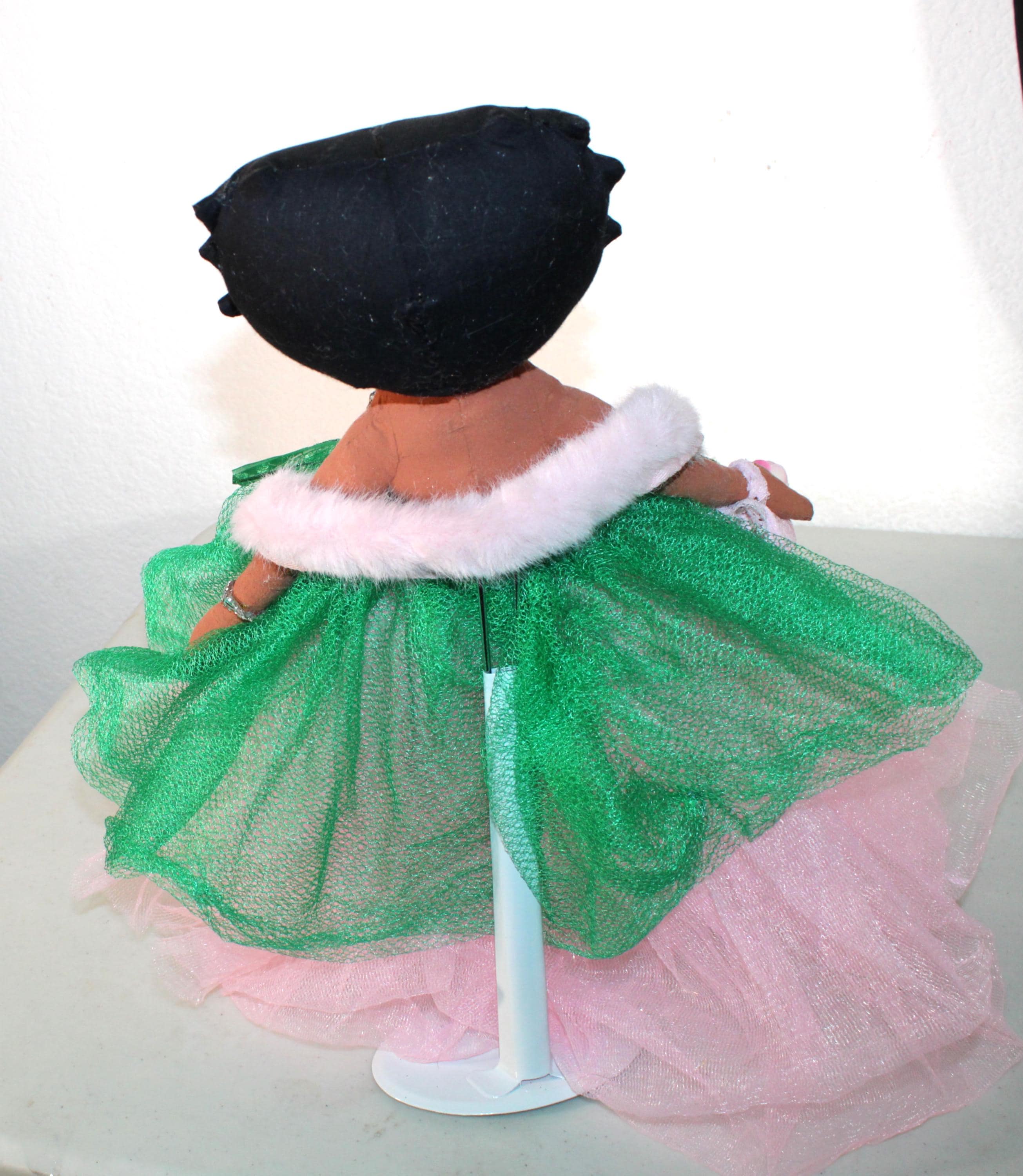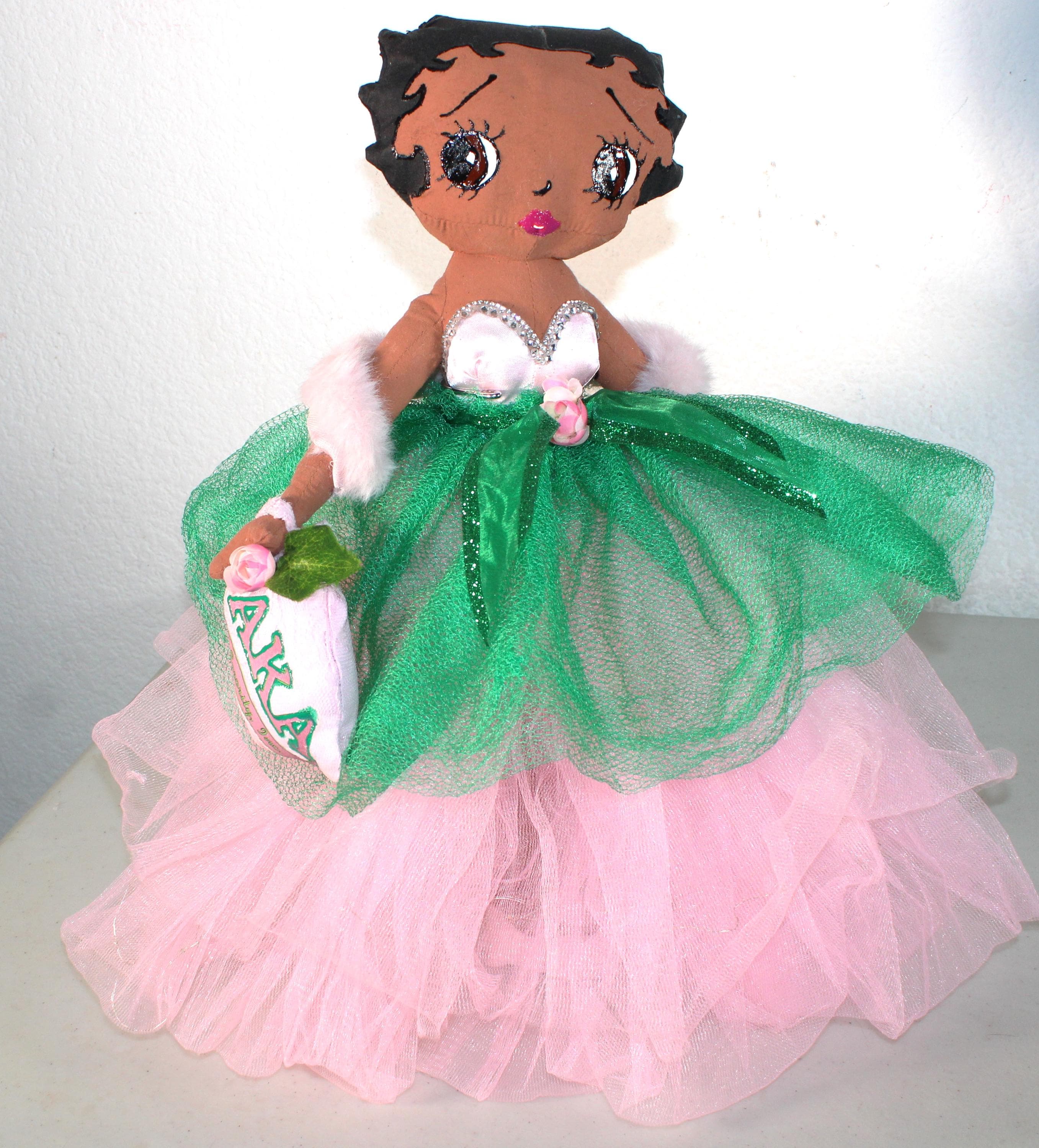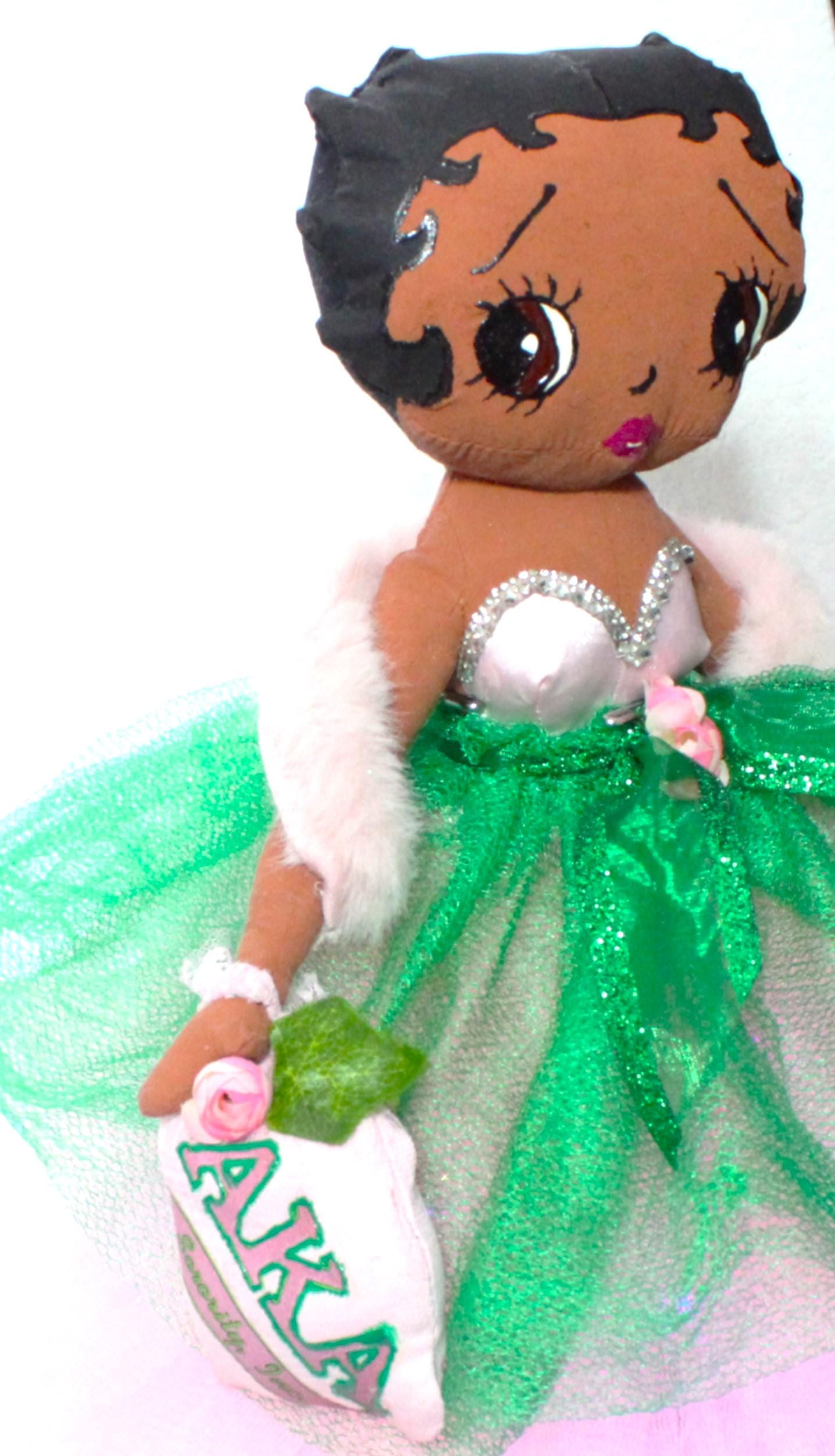 AKA.....A 17" African American Betty Boop in a signature colors of pink and green. Sparkling pink skirt that lights up (battery operated) with a satin rhinestone trimmed bustier. Green tulip net overlay with metallic ribbon belt Matching shoes, faux fur shawl and earrings. Logo lettered handbag. Made of handpainted fabric.