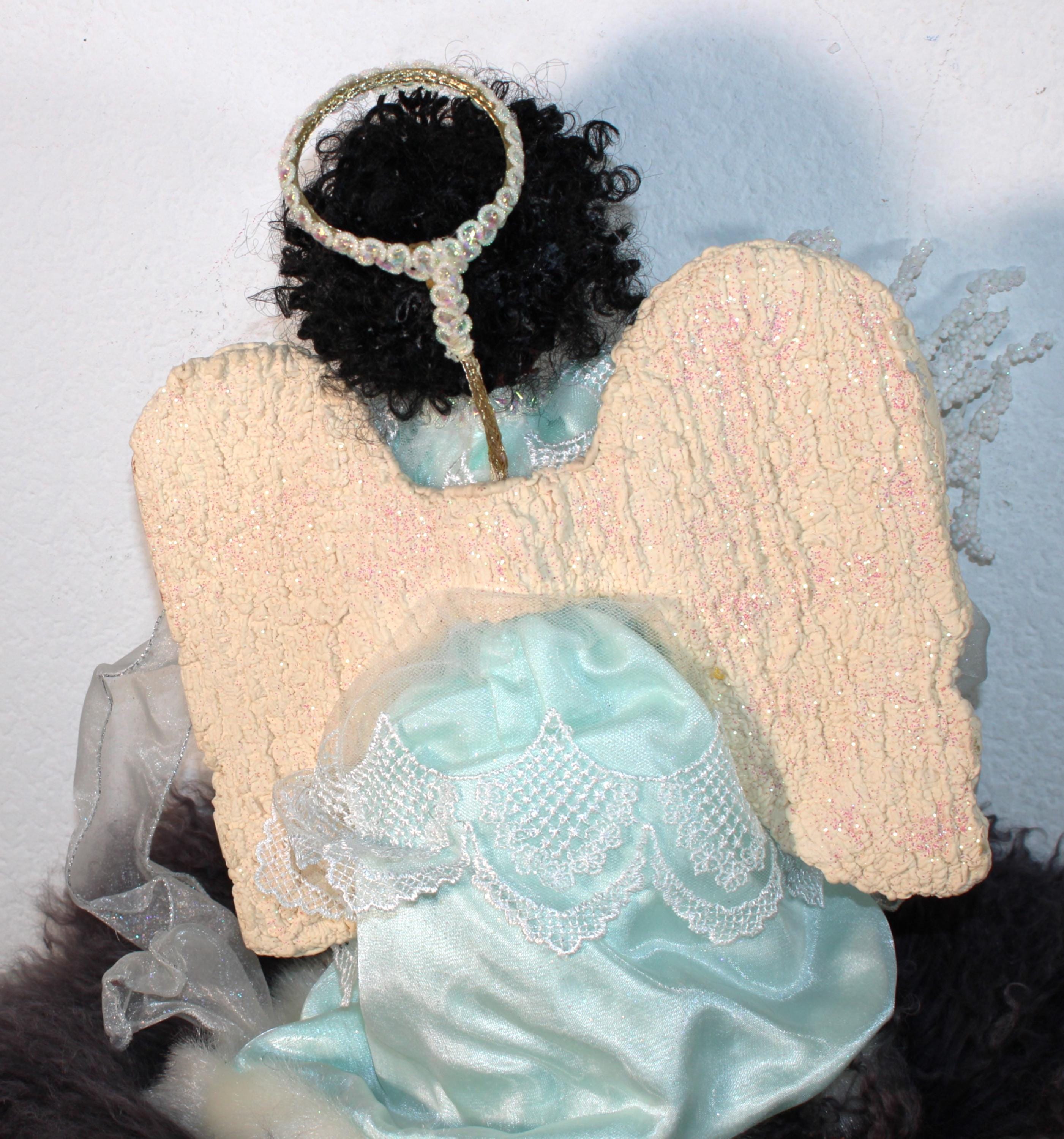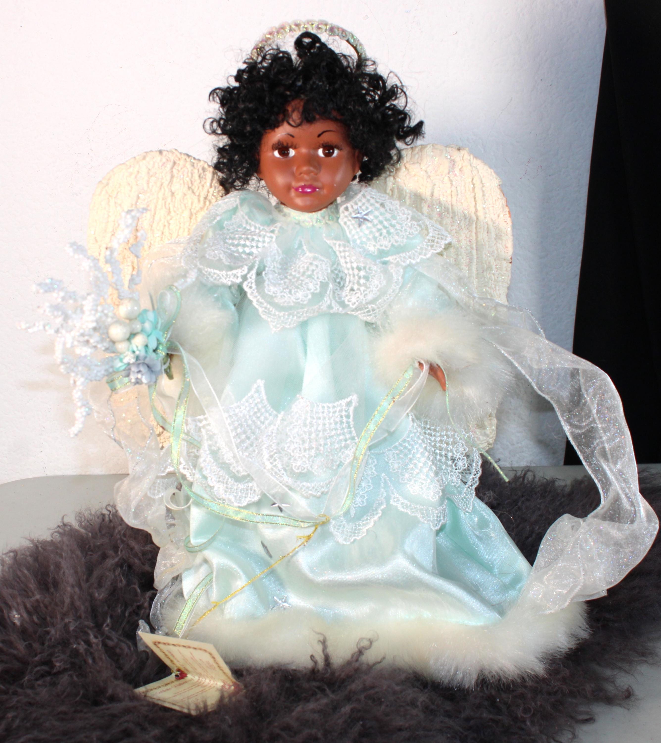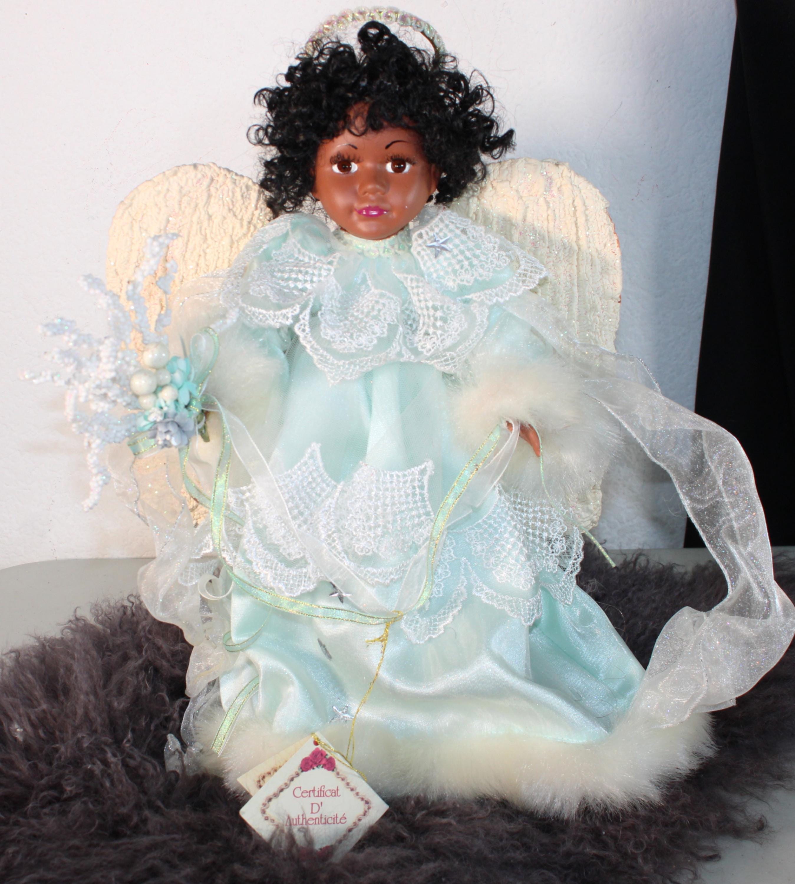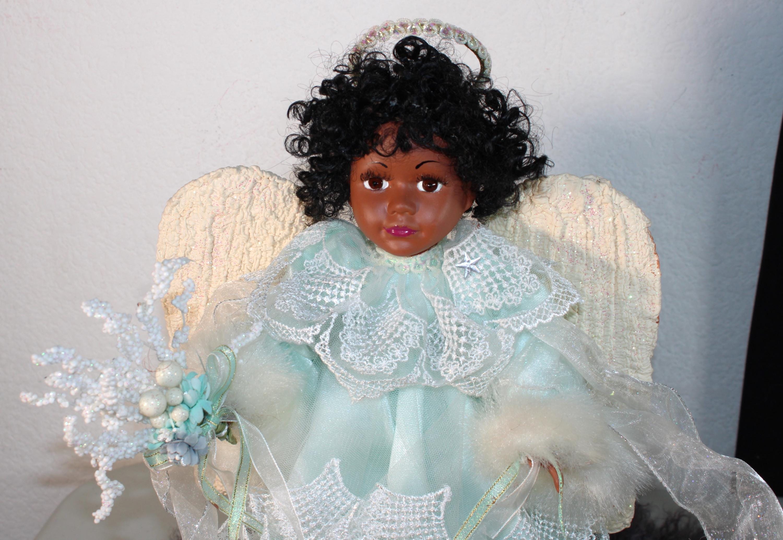 An ANGEL to WATCH OVER YOU....An African American 14" Porcelain Angel doll wearing a turquoise and cream ensemble with a textured wings. Curly black hair adorned with a halo. Authentic tag attached. Made of handpainted porcelain and fabric.