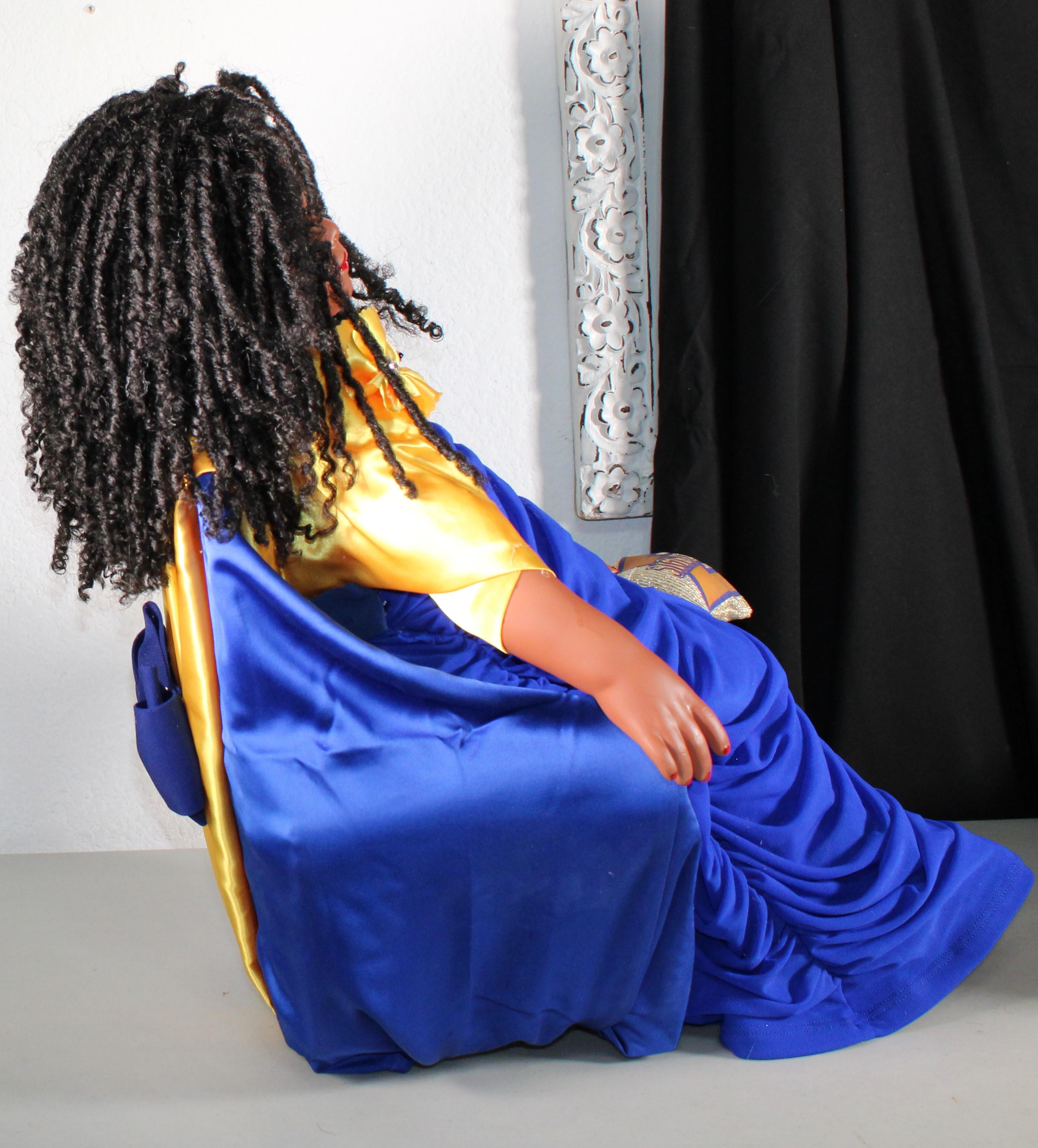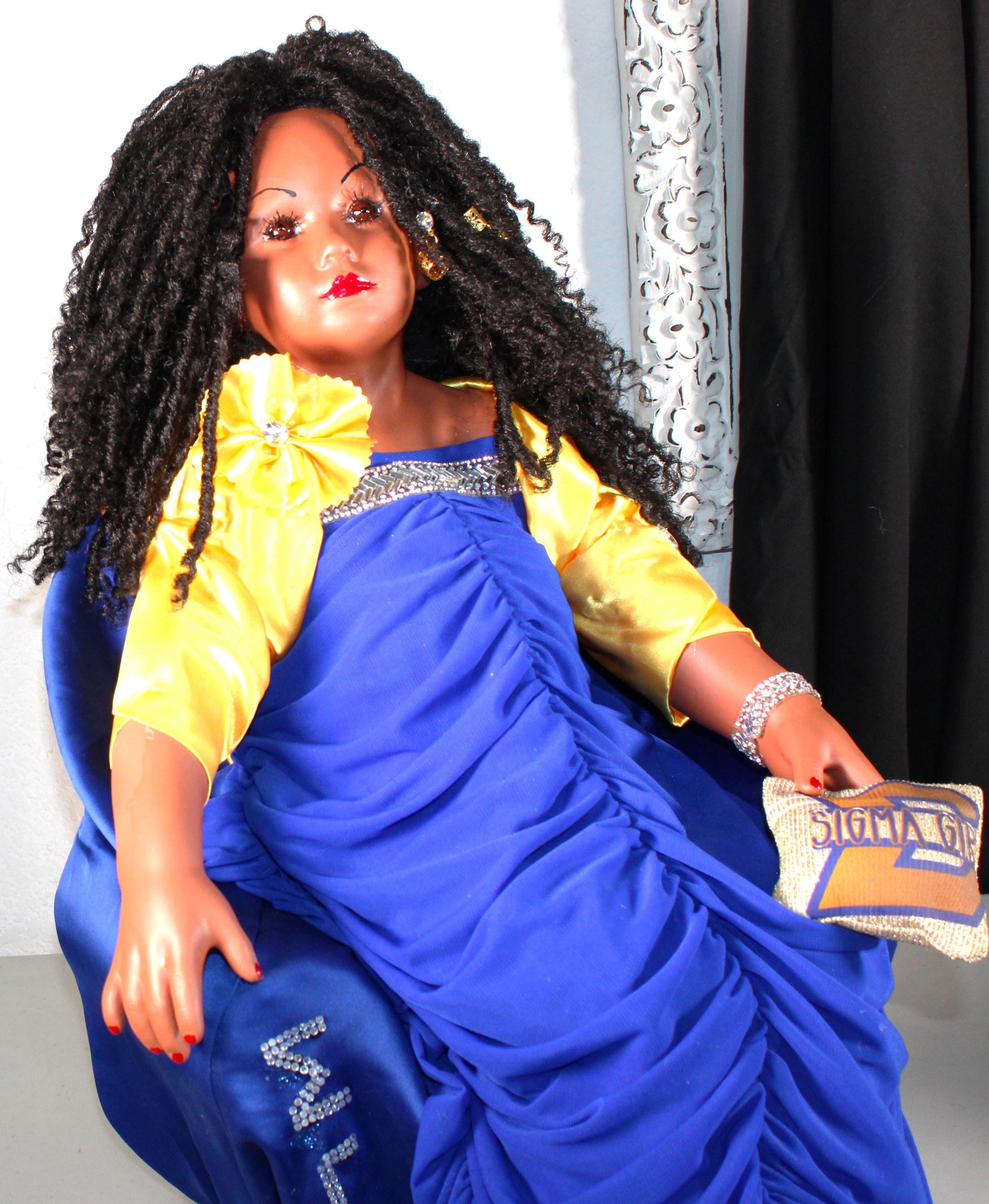 SIGMA GIRL...A 22" African American Porcelain Doll in signature colors of Sigma Gamma Rho with a touch of bling. Relaxing in her logo colored easy chair that's included. Long black kinky coiled hair. . Matching shoes and handbag.
