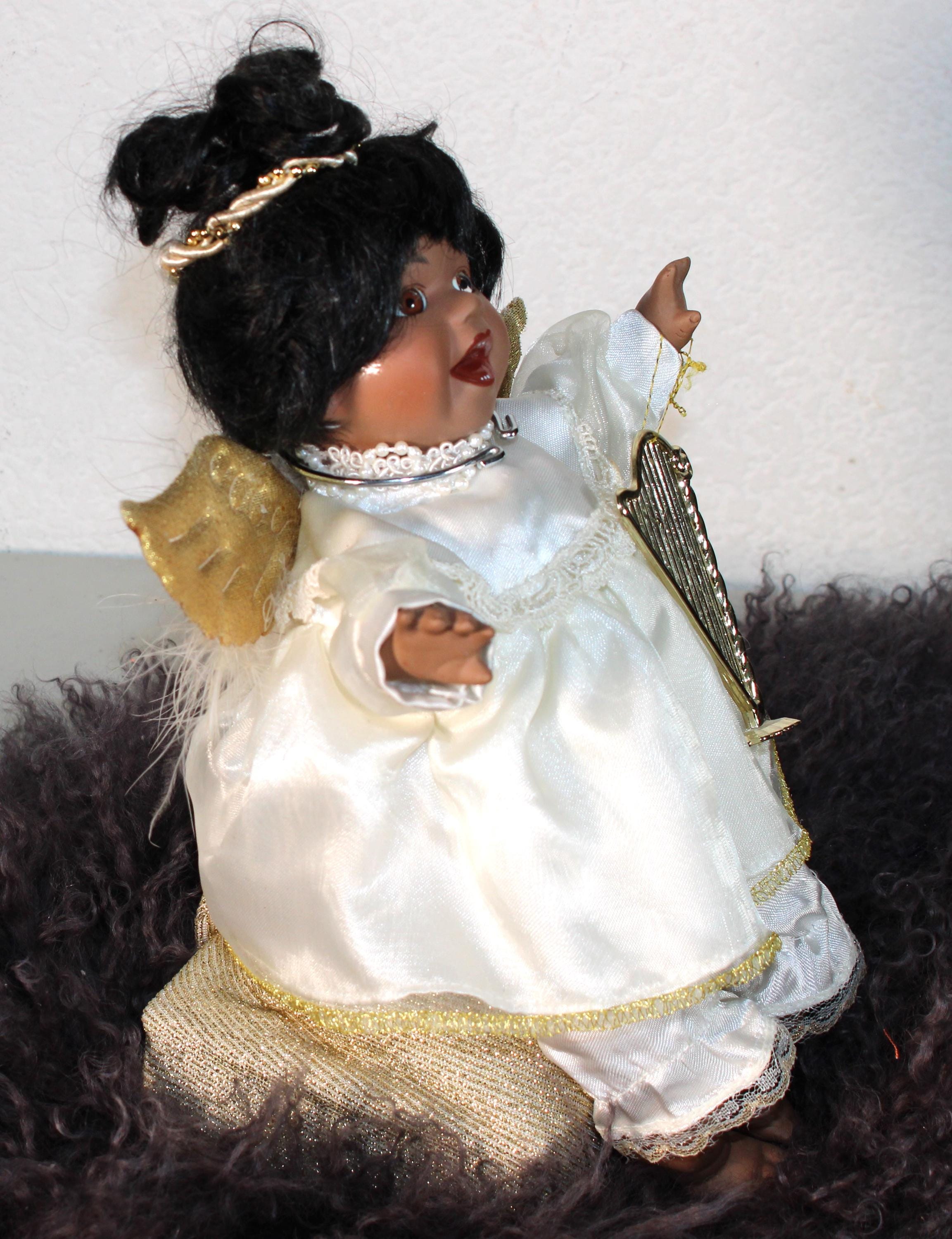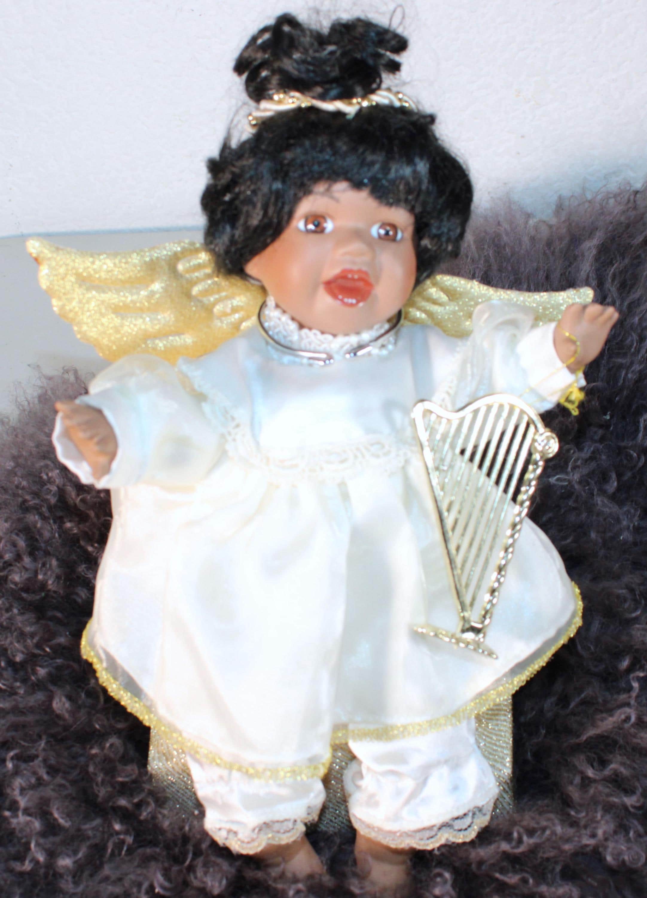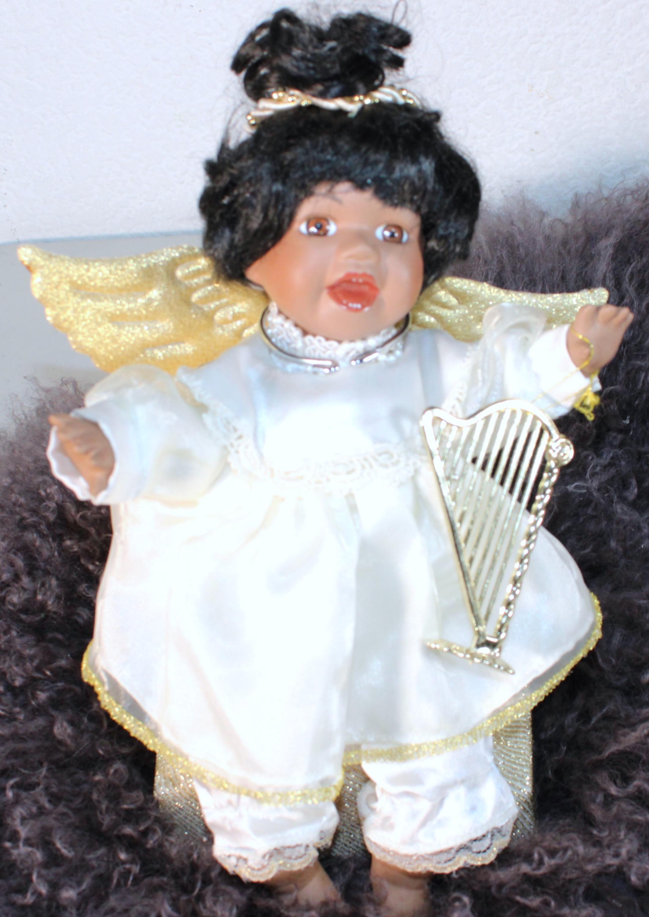 THE PRAISE ANGEL....An African American 10" Porcelain Angel doll with open arms, ready to make music with her harp. Dressed in an ensemble of cream and gold and sitting atop a wind up music box that plays gospel music. Glitter gold wings. Curly black hair adorned with a halo. Made of porcelain and fabric.
