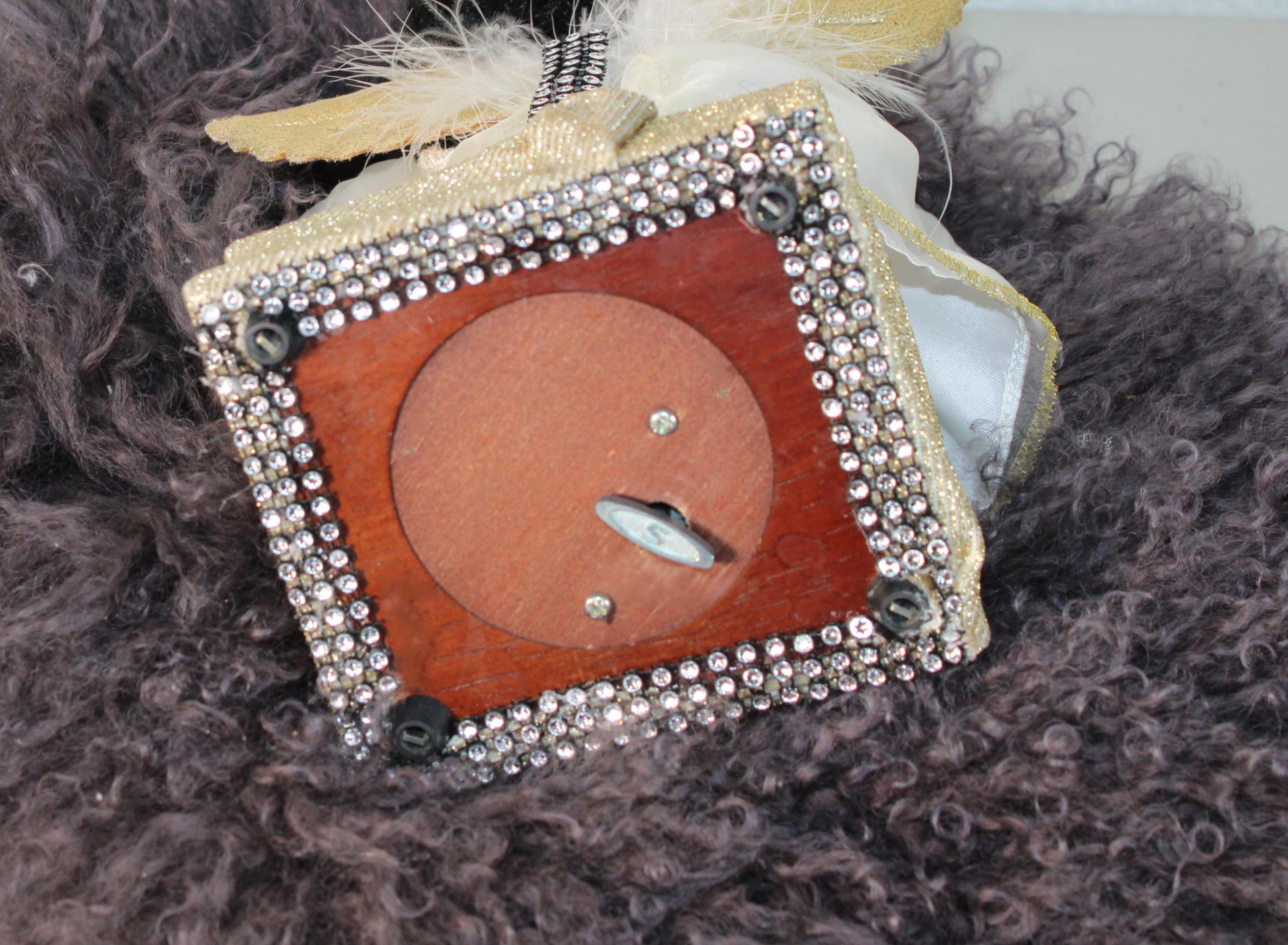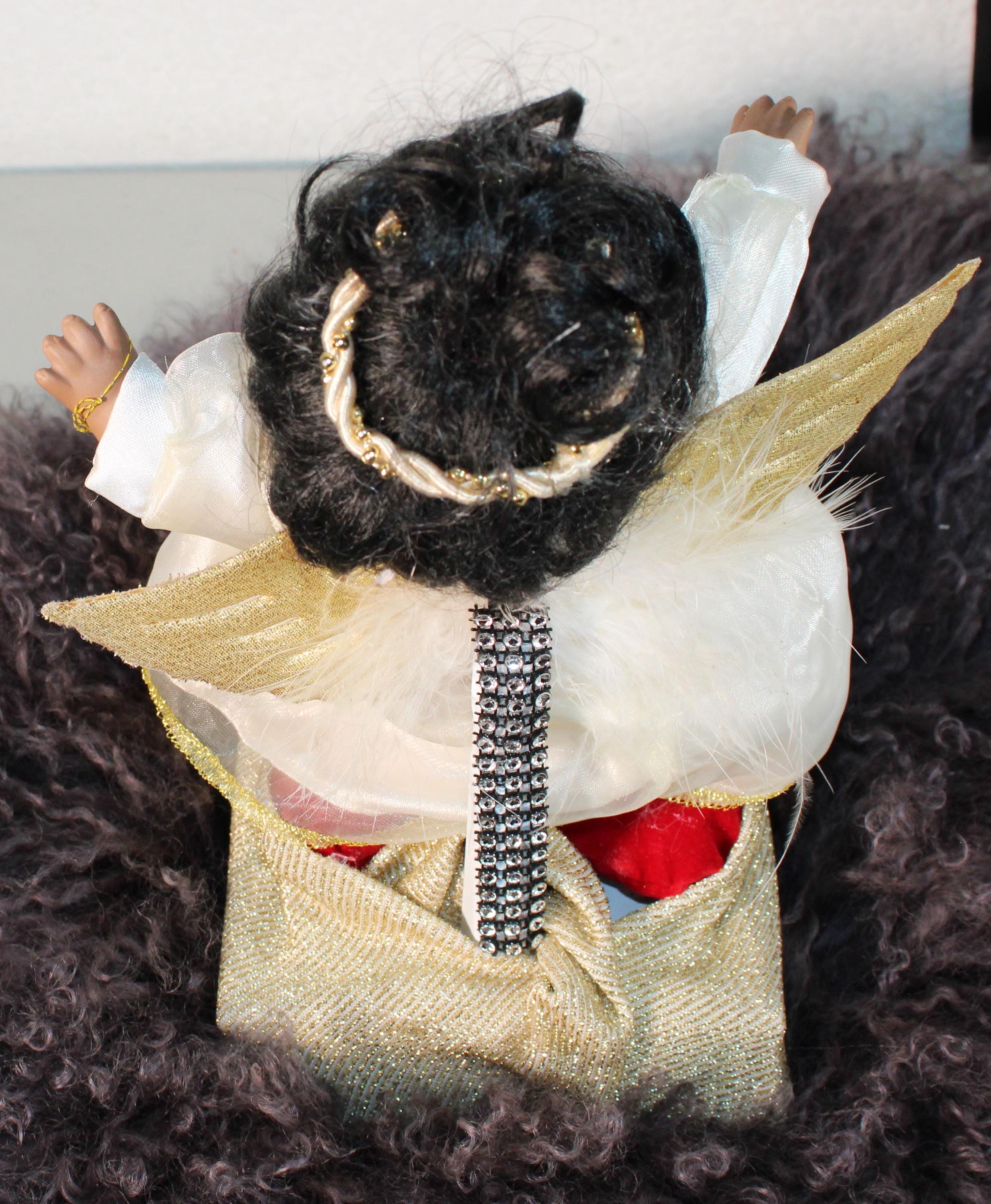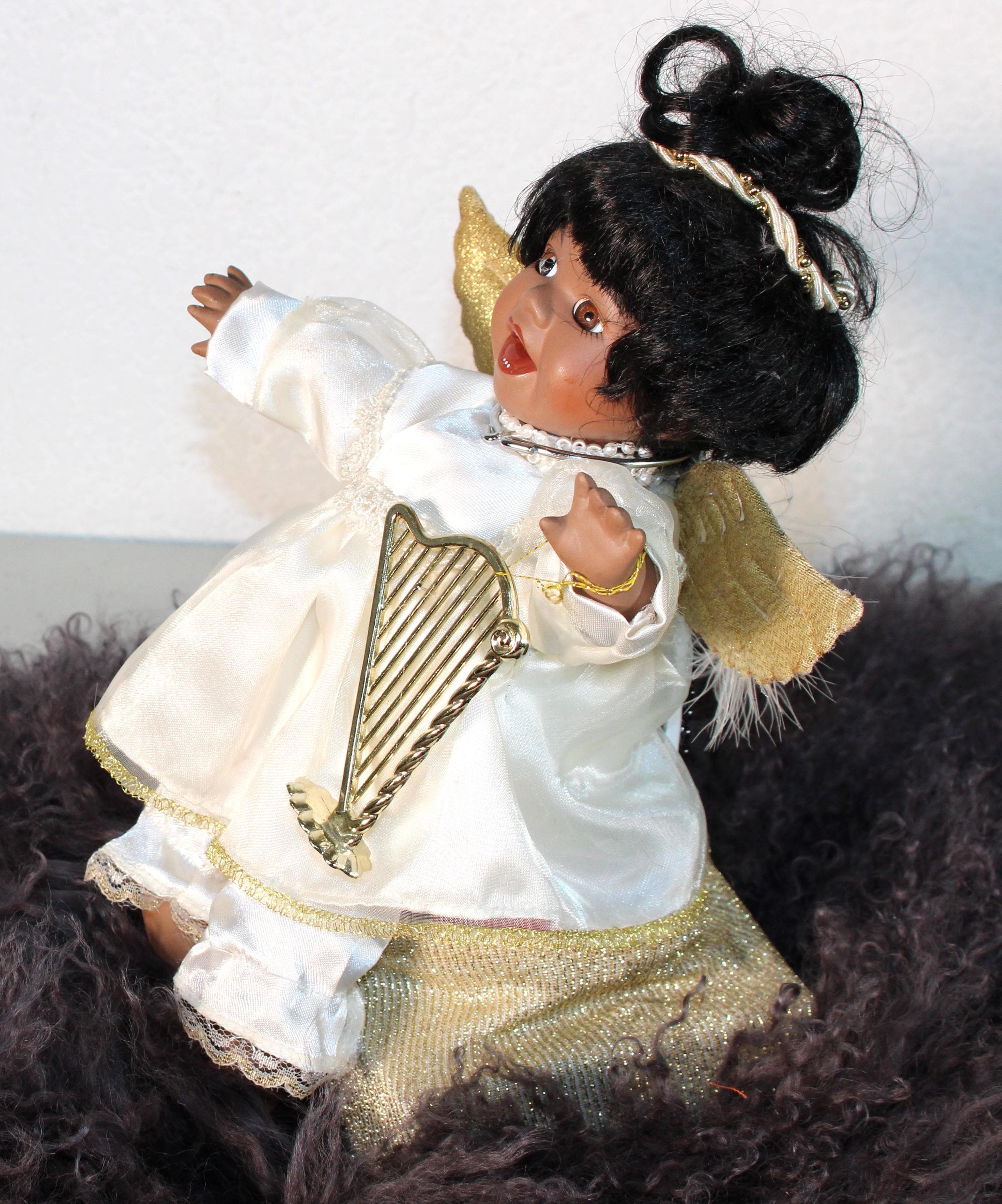 THE PRAISE ANGEL....An African American 10" Porcelain Angel doll with open arms, ready to make music with her harp. Dressed in an ensemble of cream and gold and sitting atop a wind up music box that plays gospel music. Glitter gold wings. Curly black hair adorned with a halo. Made of porcelain and fabric.