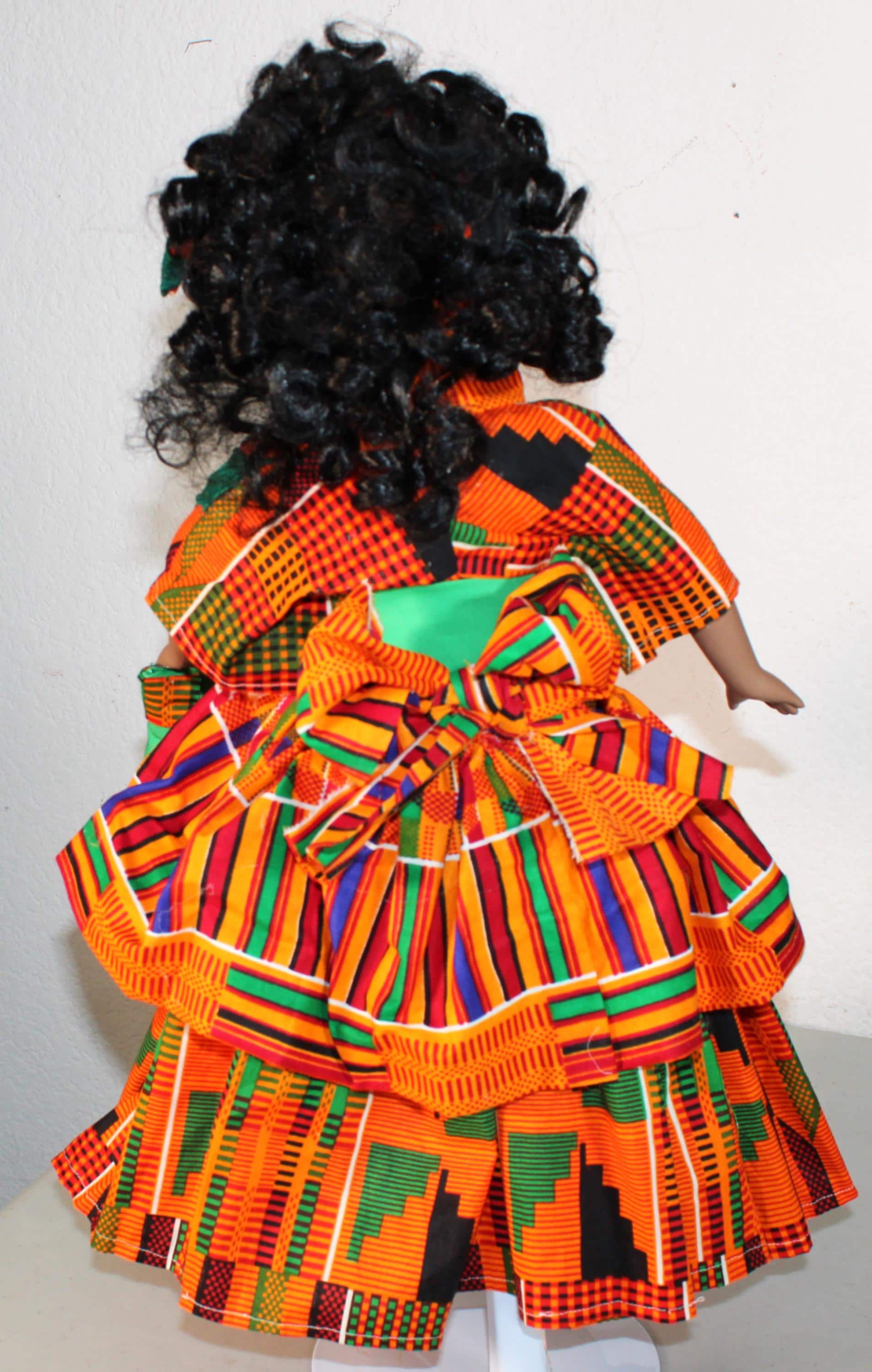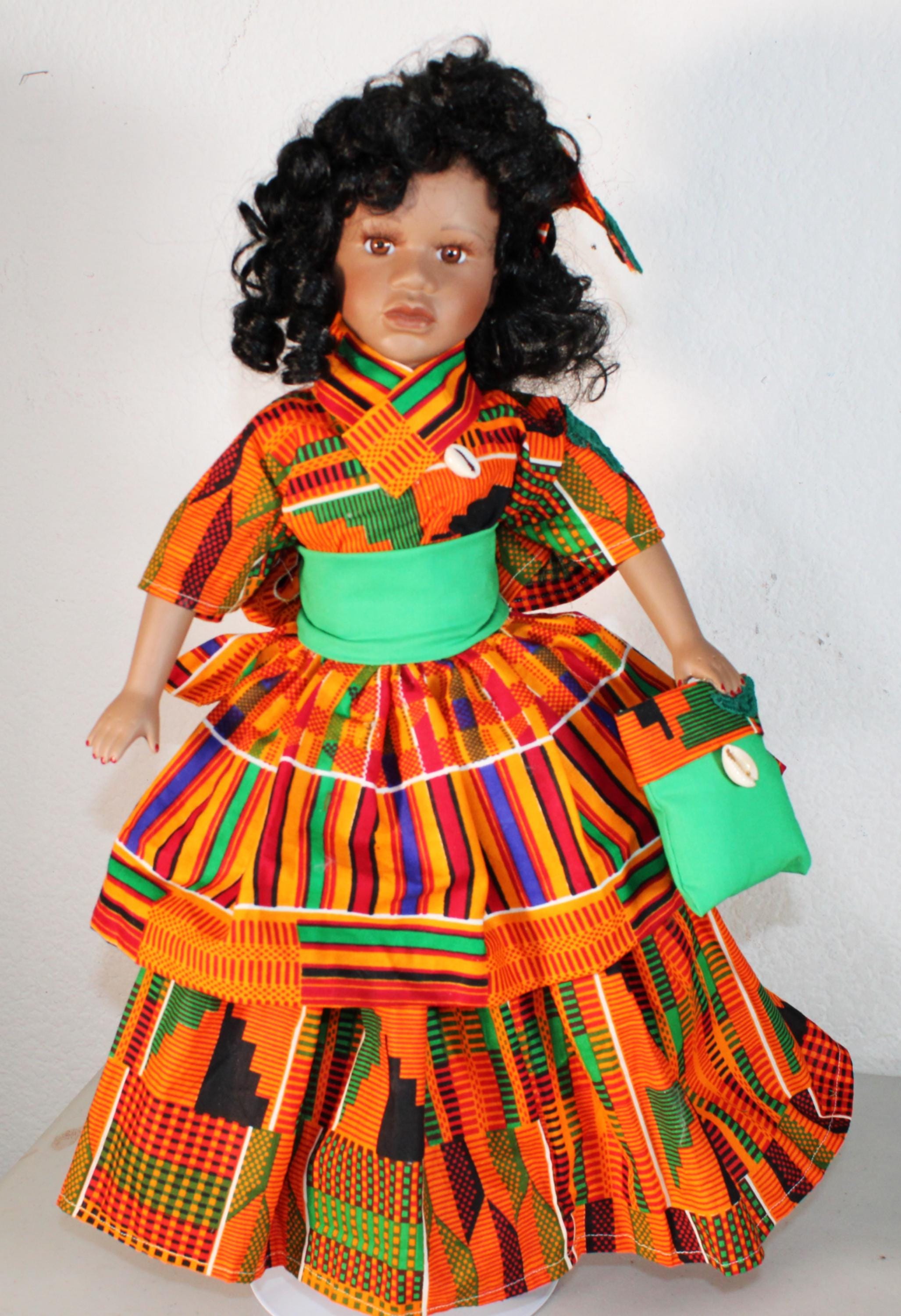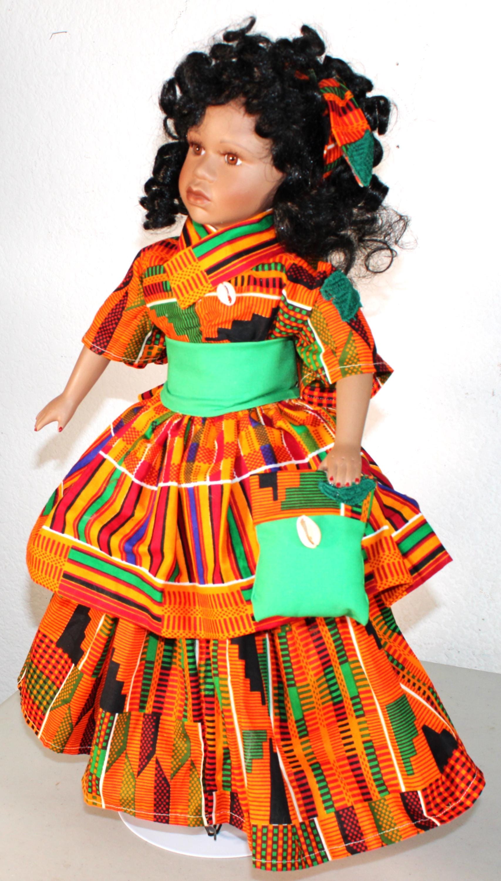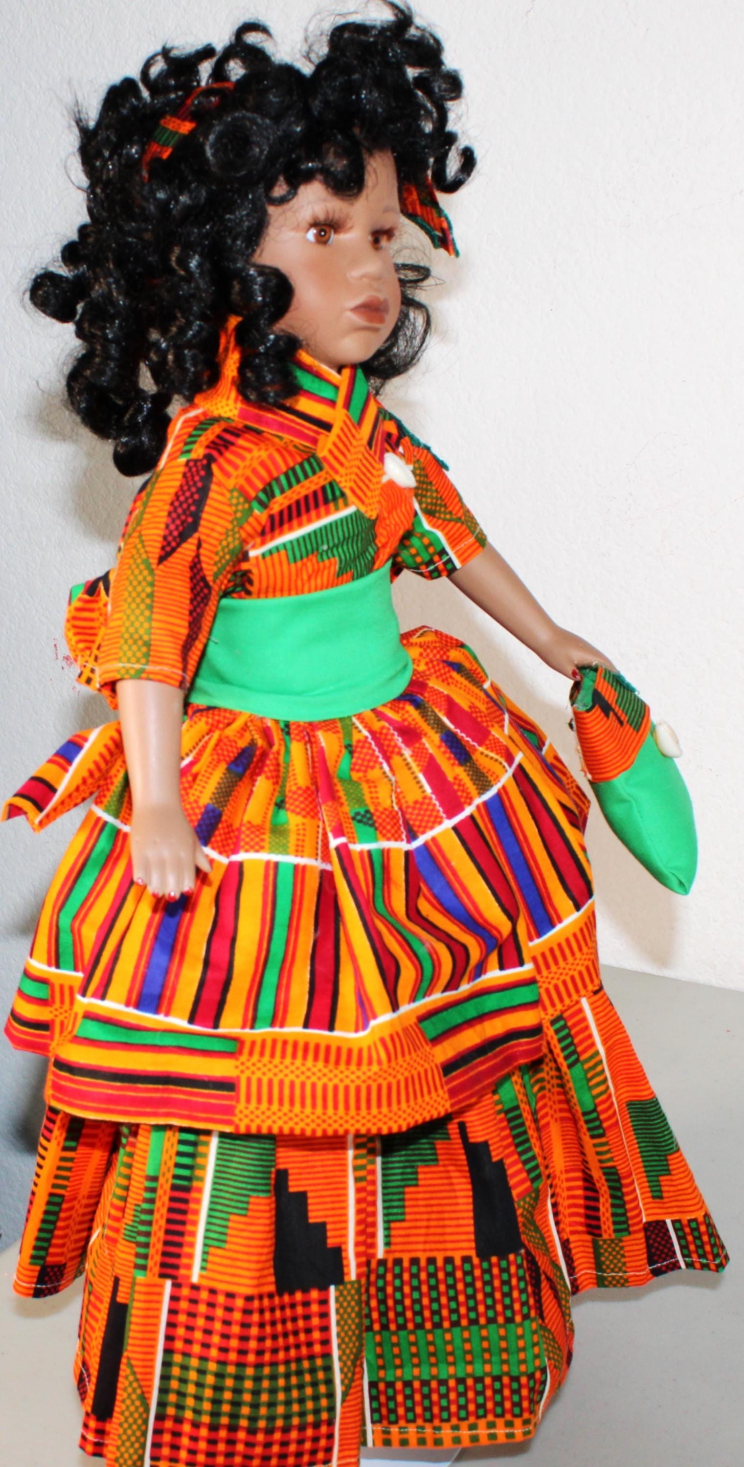 YHANNA.... An African American Porcelain 19" Doll dressed in an ethnic Kente cloth ensemble accented with chowry shells. Hand bag in hand with matching shoes. Black curly hair with matching headband. Made of porcelain and fabric.