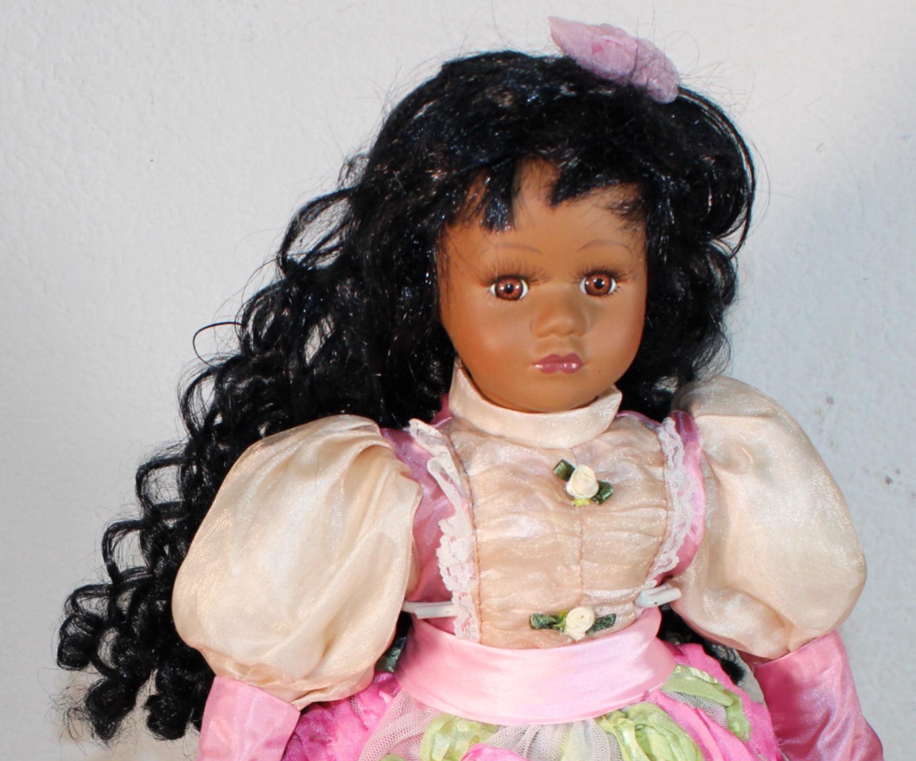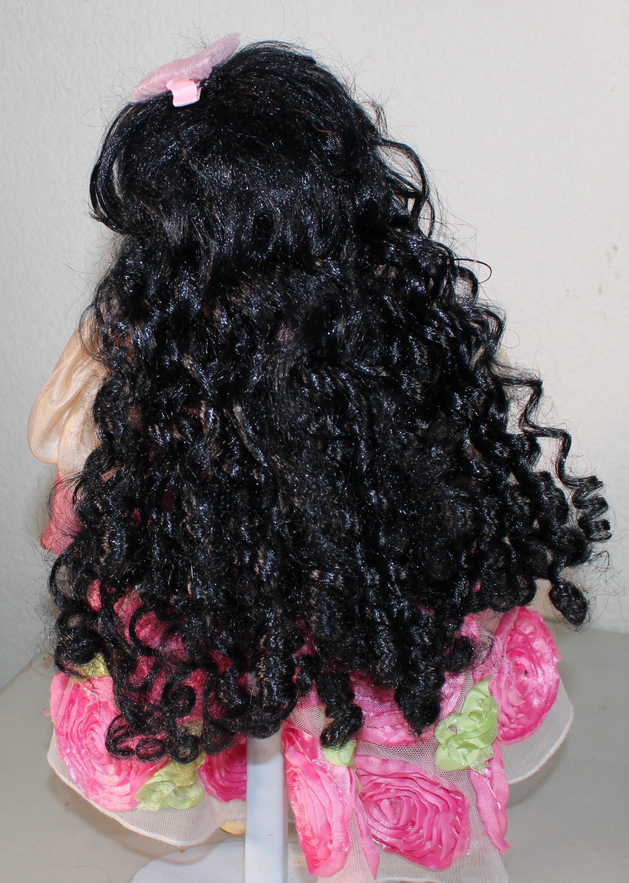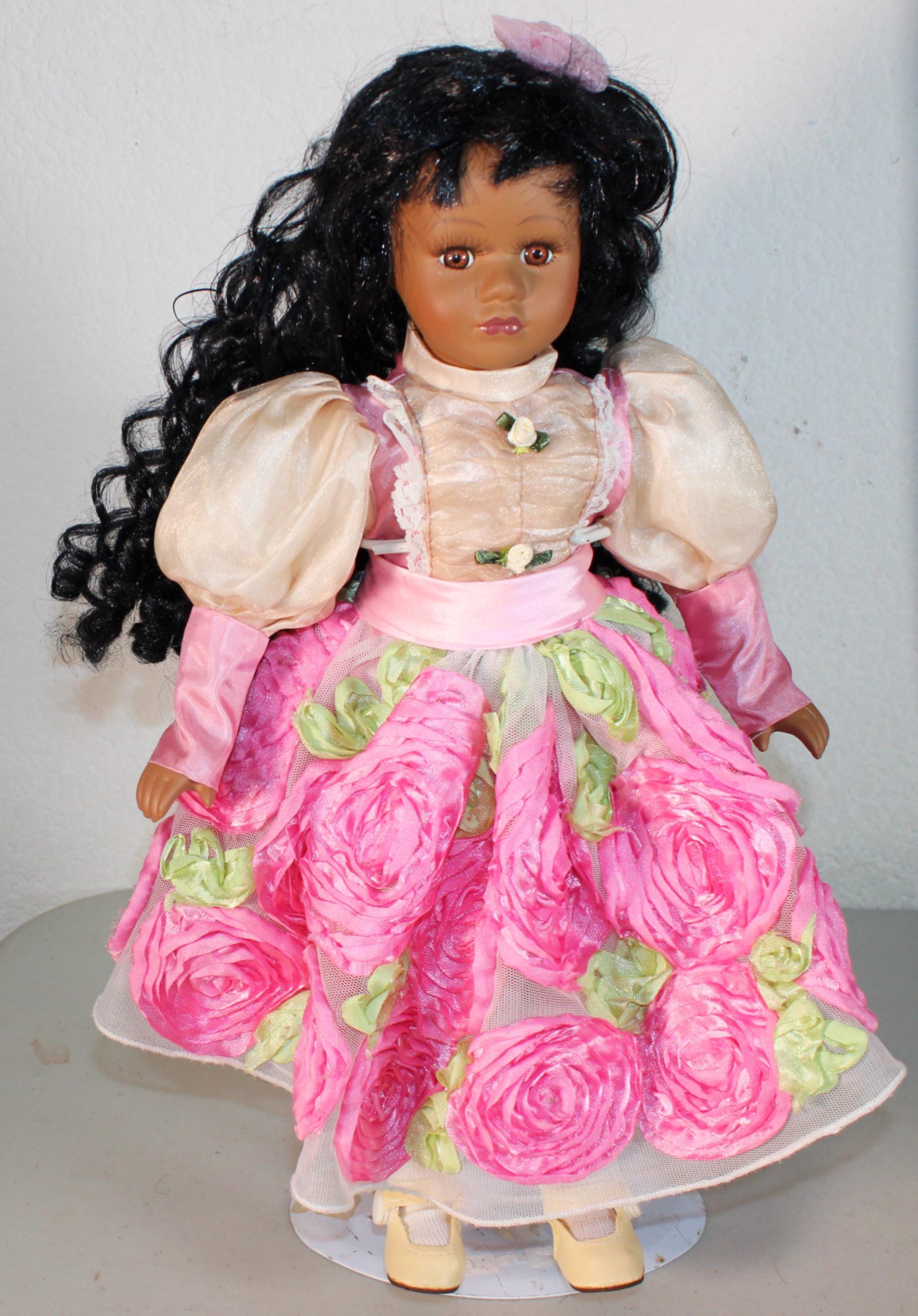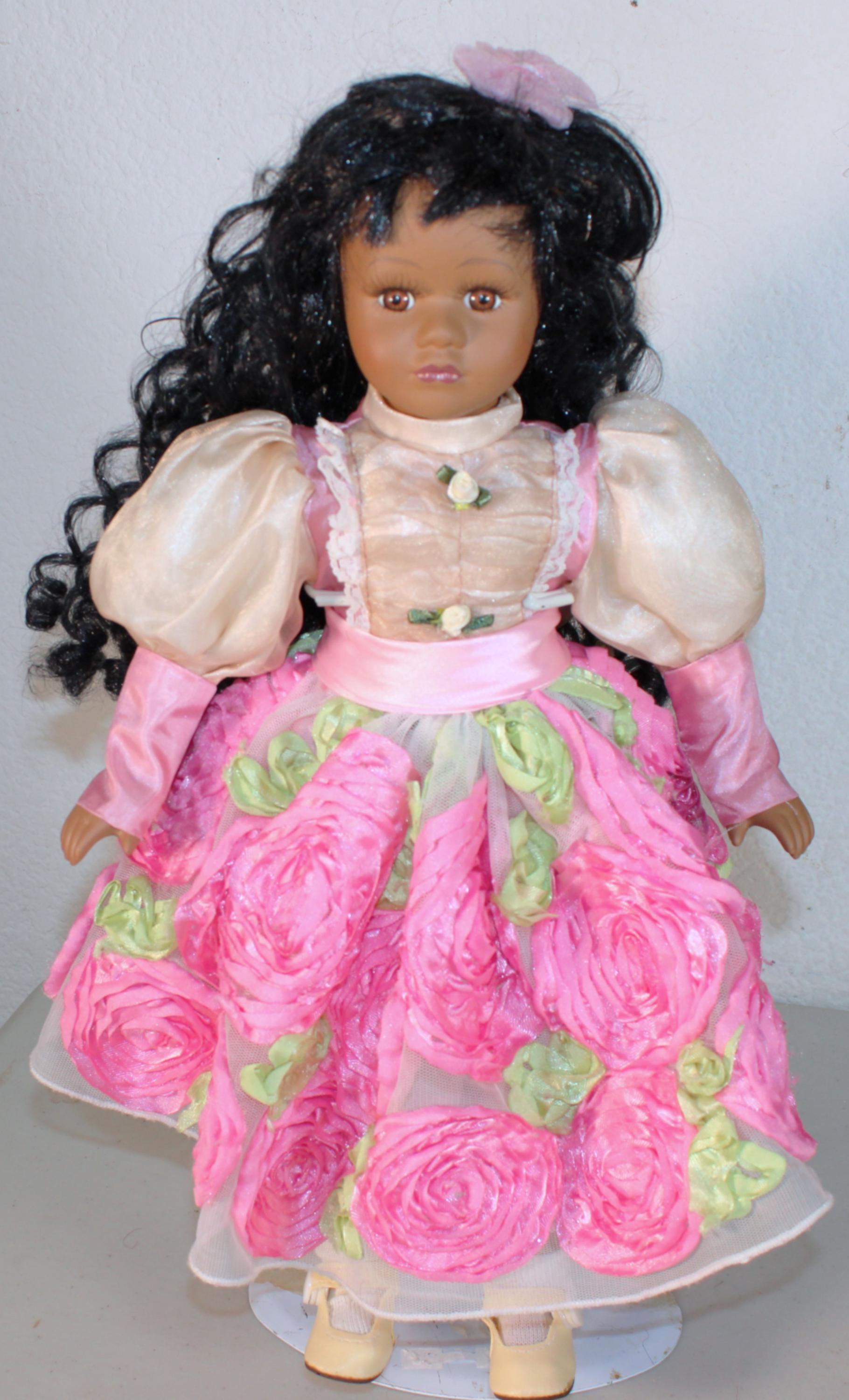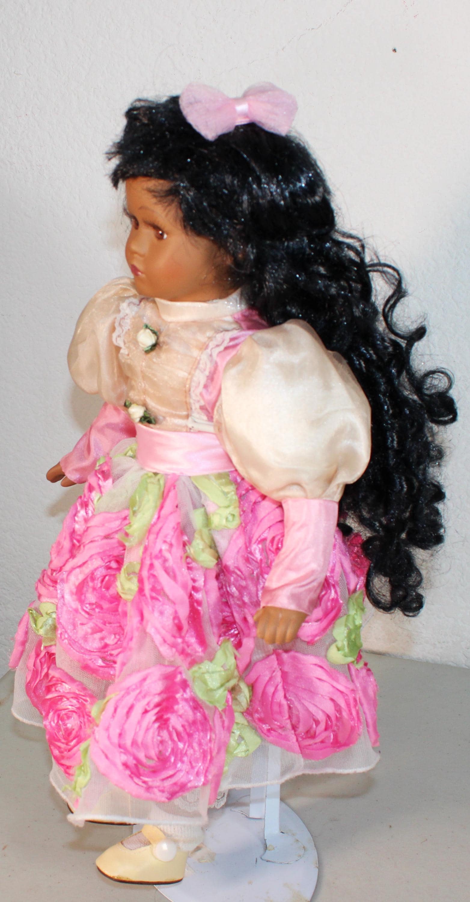 BRIANNA.....A 17" AA porcelain doll with beautiful brown eye. Dressed "party perfect" a pink and green floral dress and matching bow to her long black curly hair.. Made of porcelain and fabric.