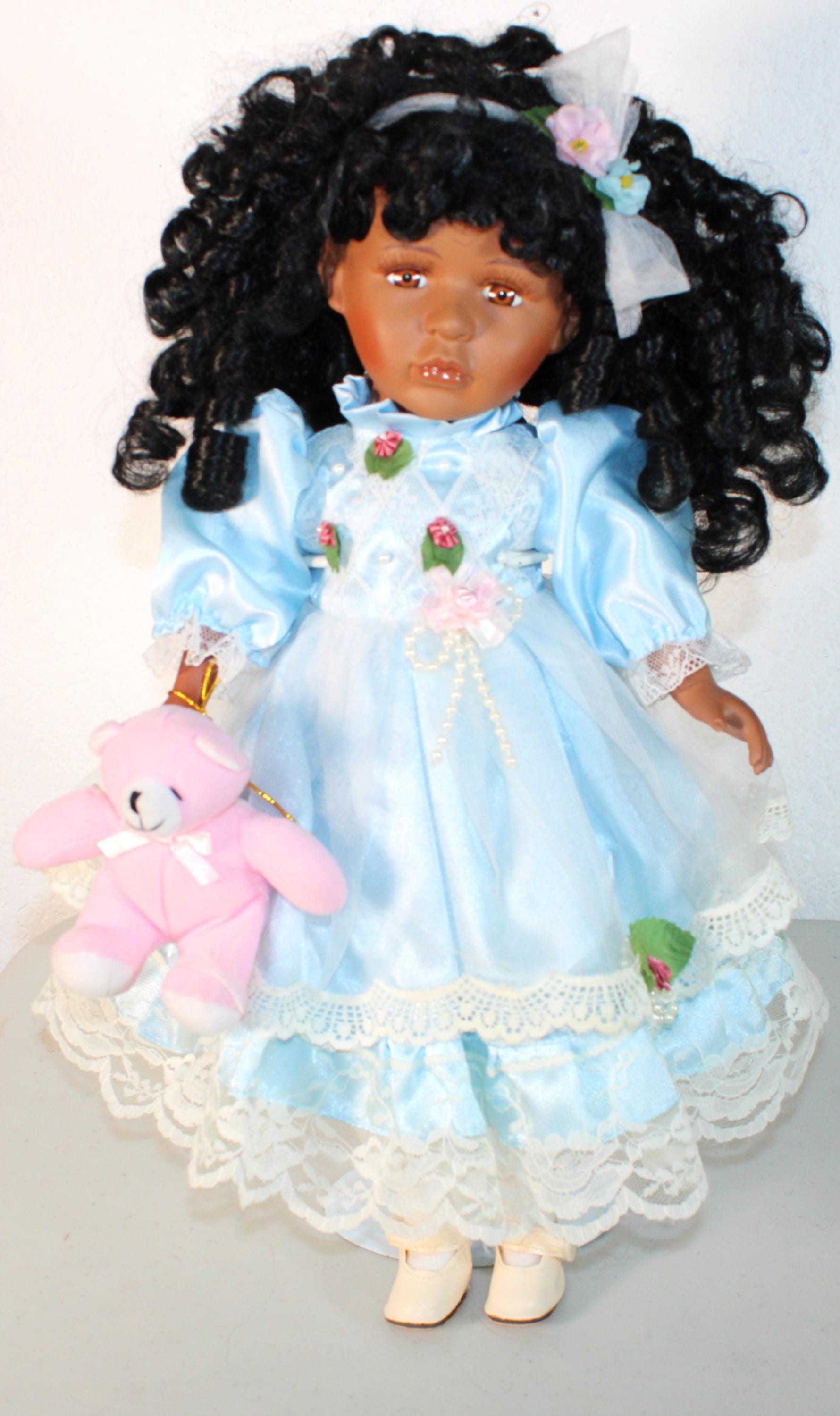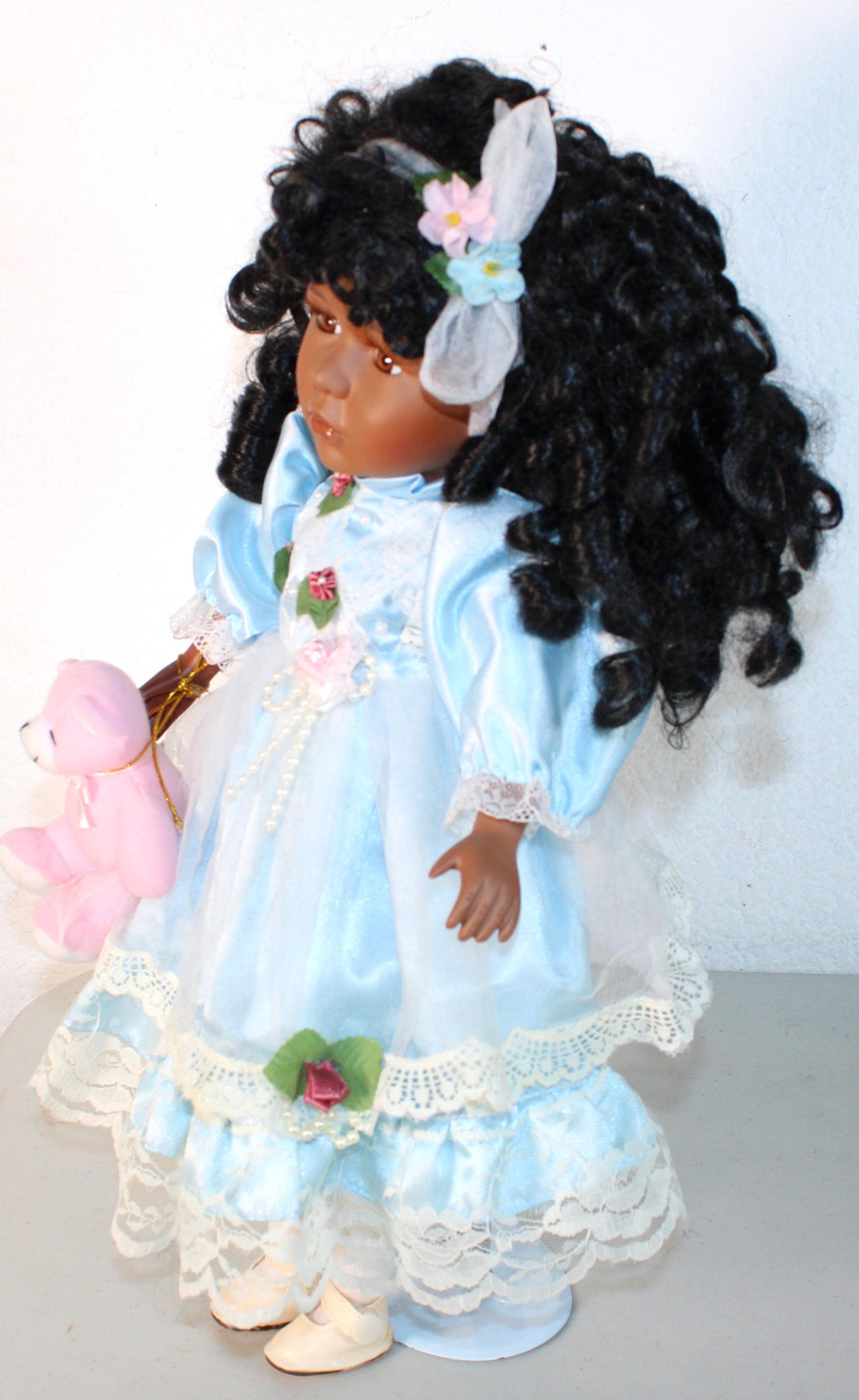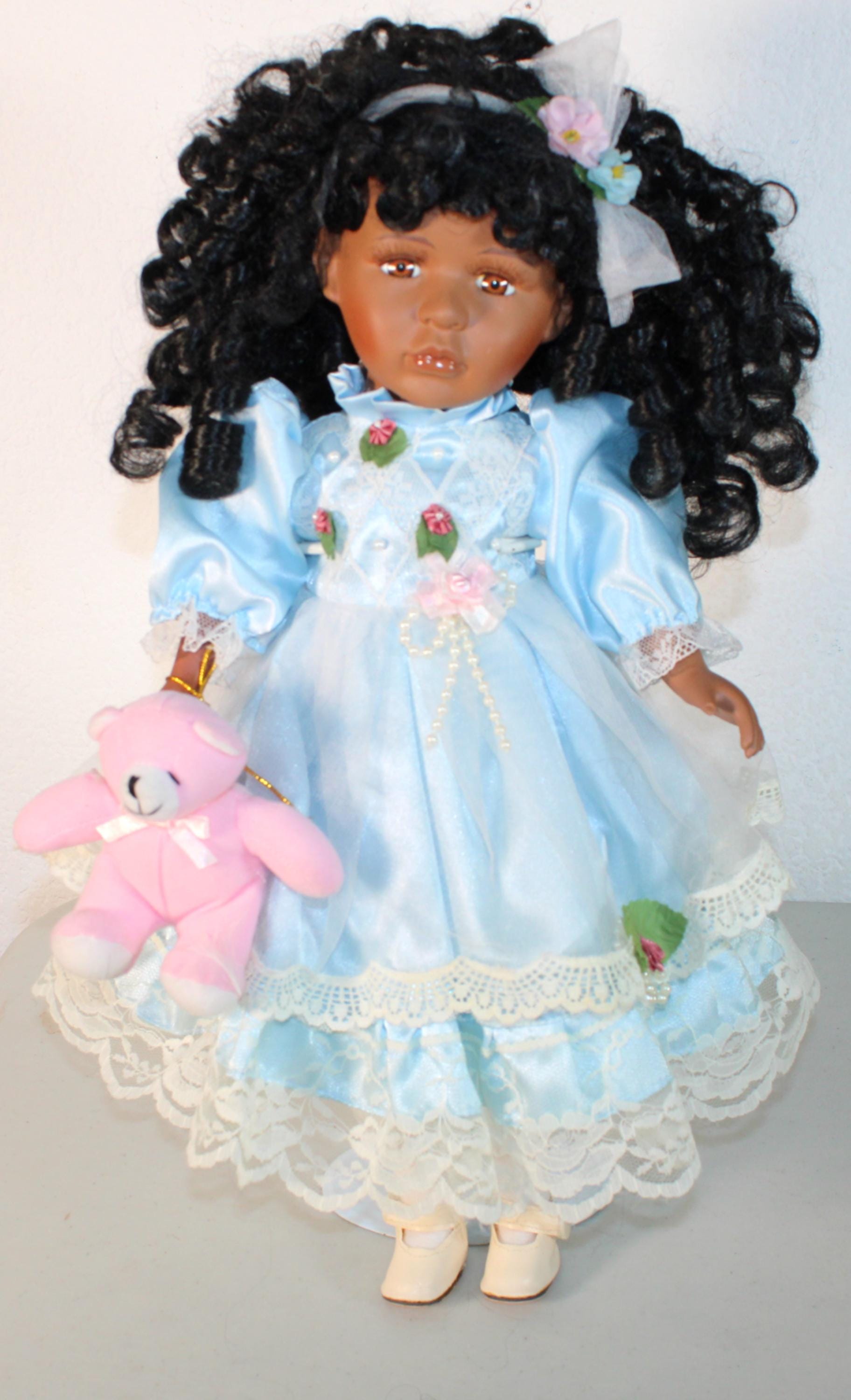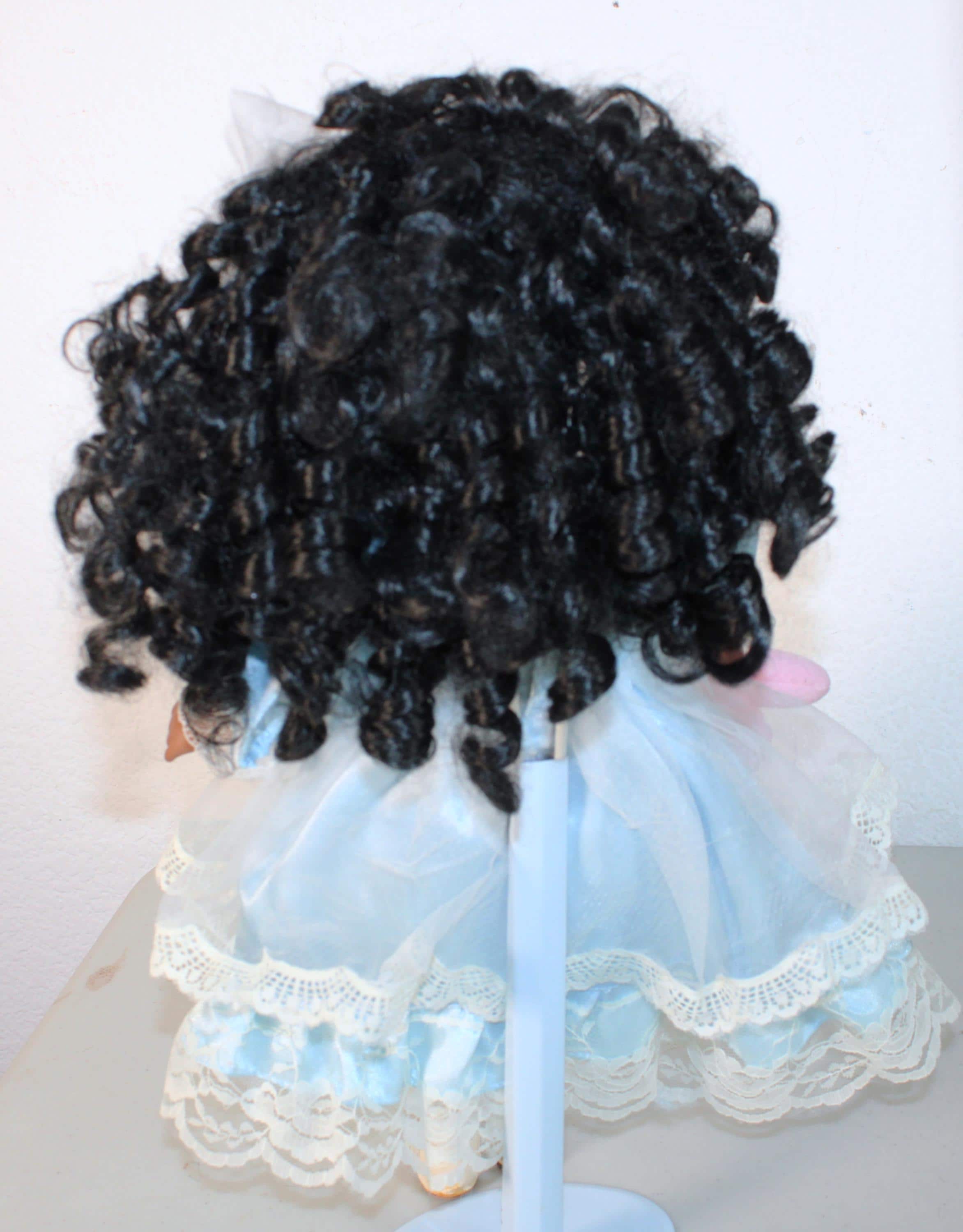 KNICKKY.....A 17" AA porcelain doll dressed in a frilly blue party ensemble trimmed with a tulle overlay and accented with pastel florals. Matching shoes and socks. Big brown eyes and long curly hair with a ribbon. Made of porcelain and fabric.