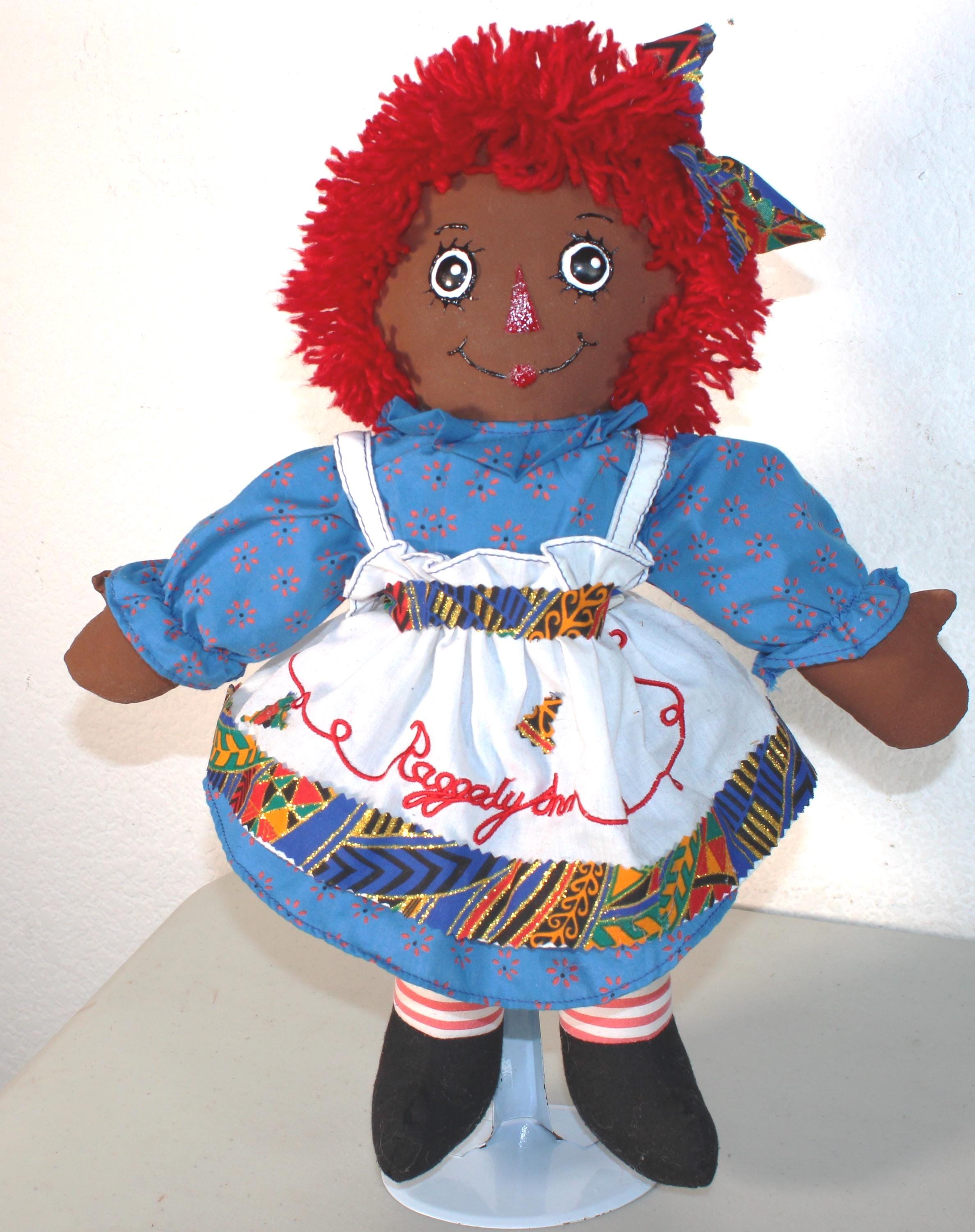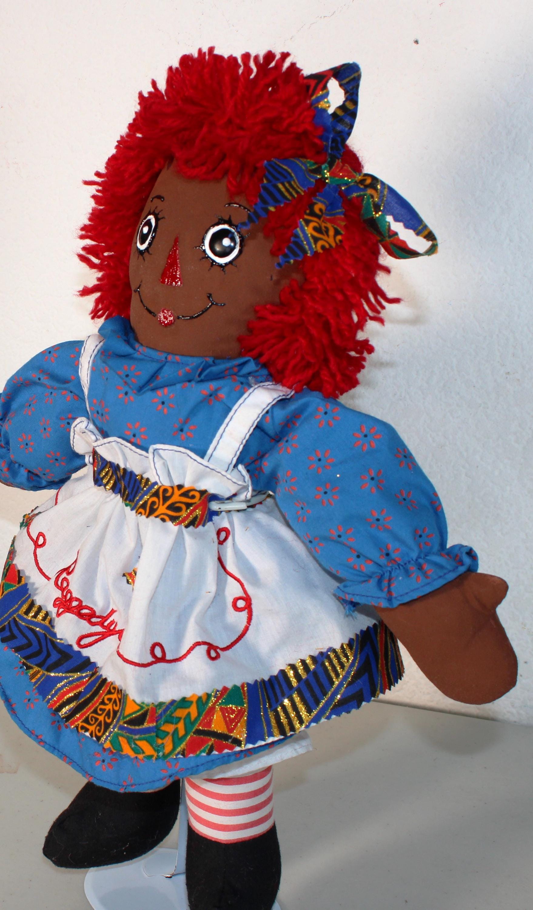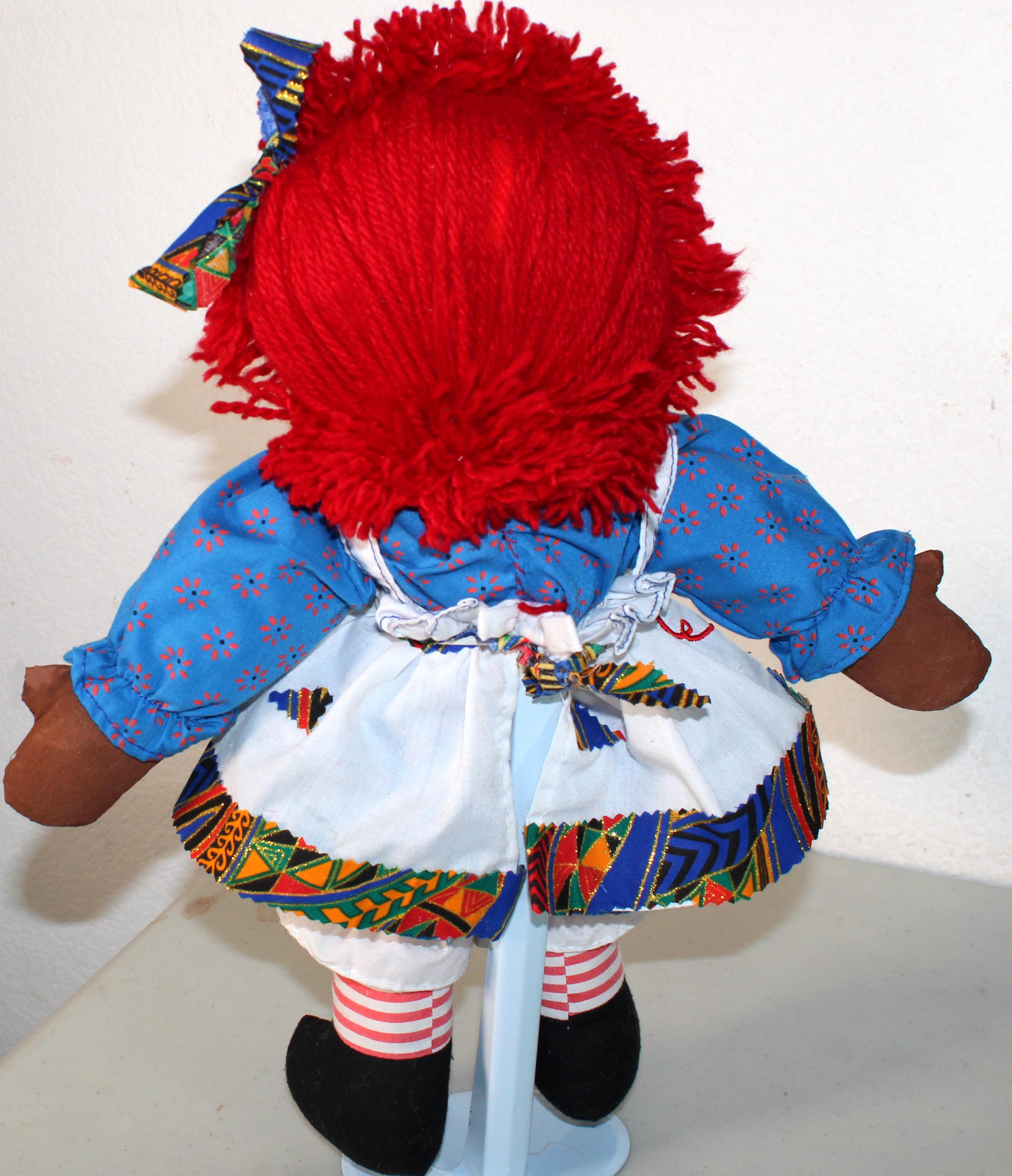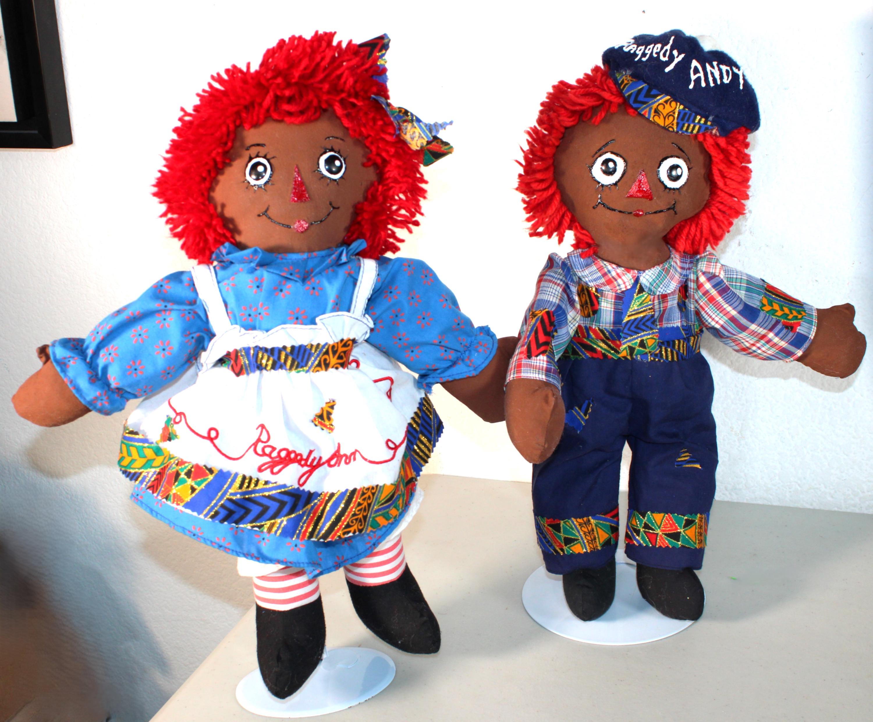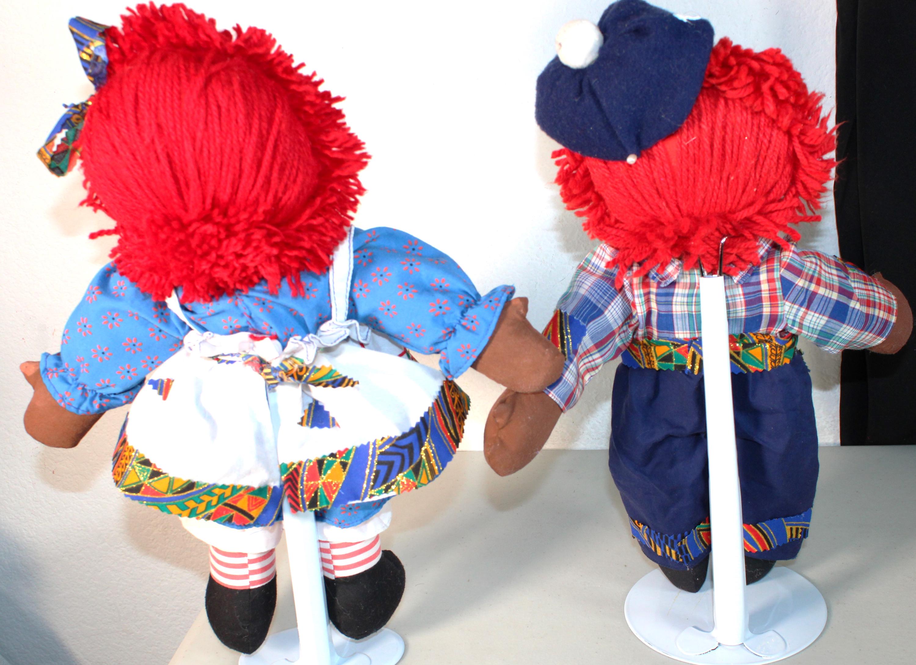 A pair of (16") African American Raggety Ann/ Andy Doll Set with colorful dress and blue britches. Both ensembles accented with a touch of African blue and metallic gold kente print. Matching shirt, blue britches and hat for Andy. Dress with pinafore for Ann with matching hair ribbon. Bright red yard hair. Made of fabric. Handpainted.