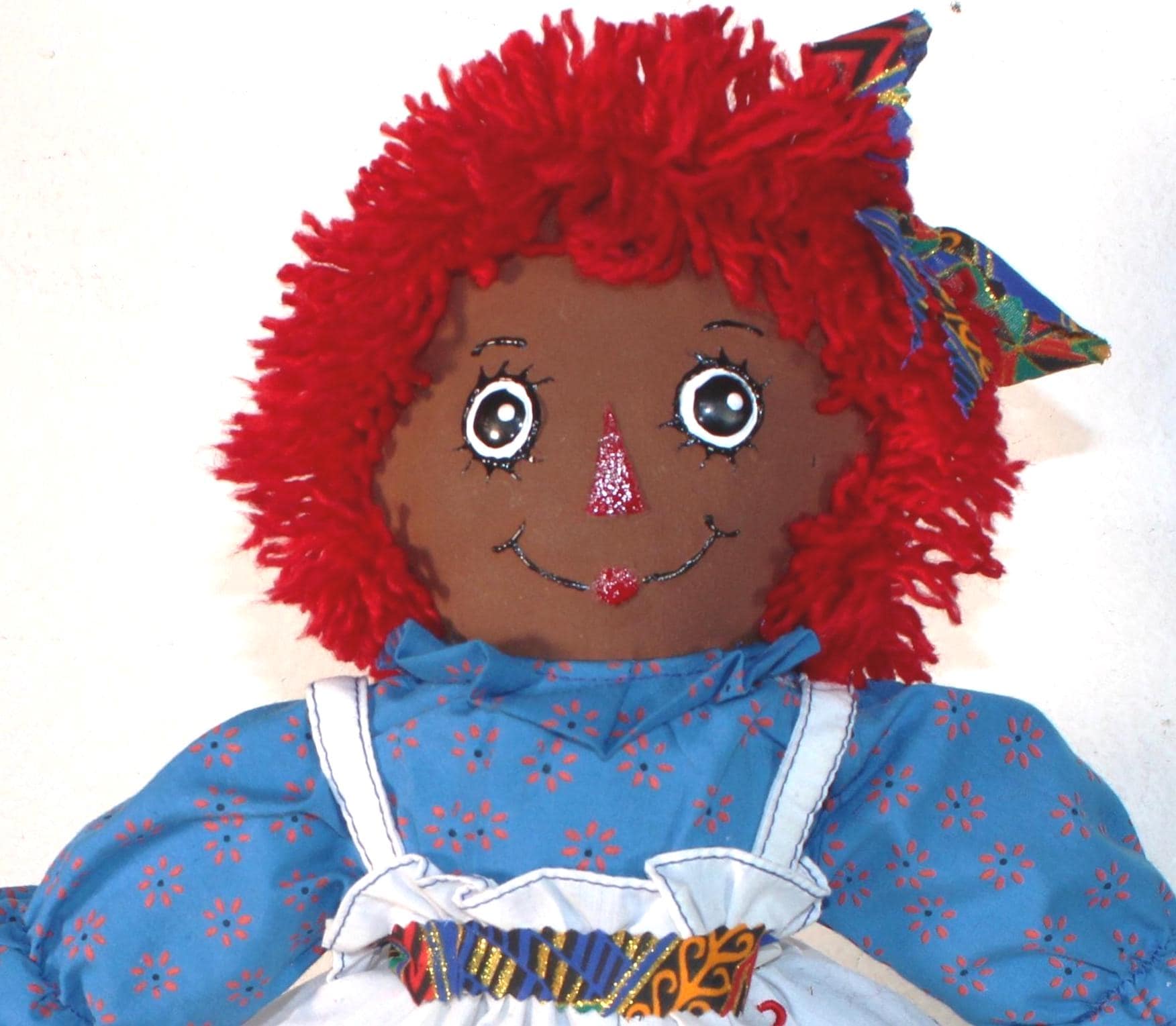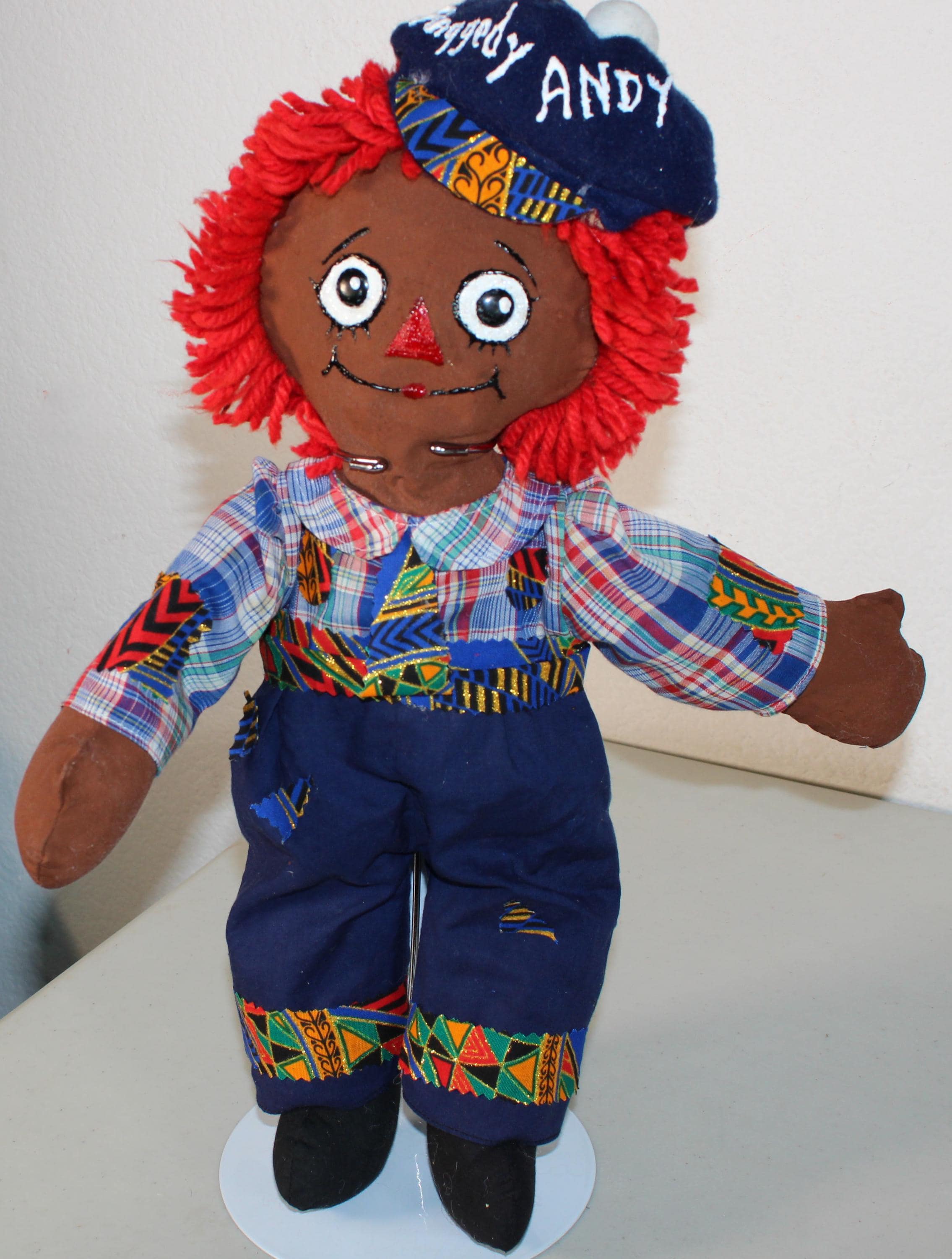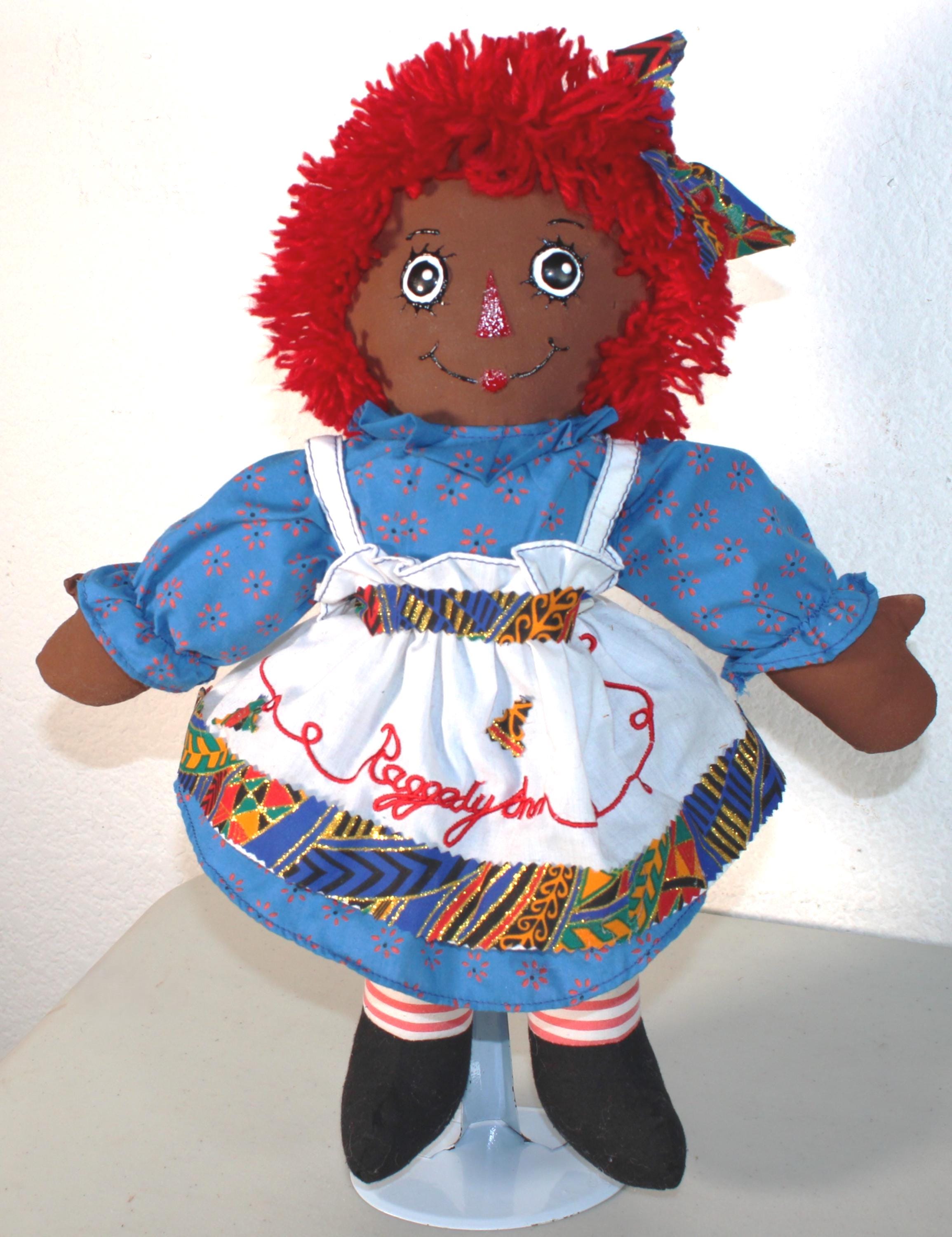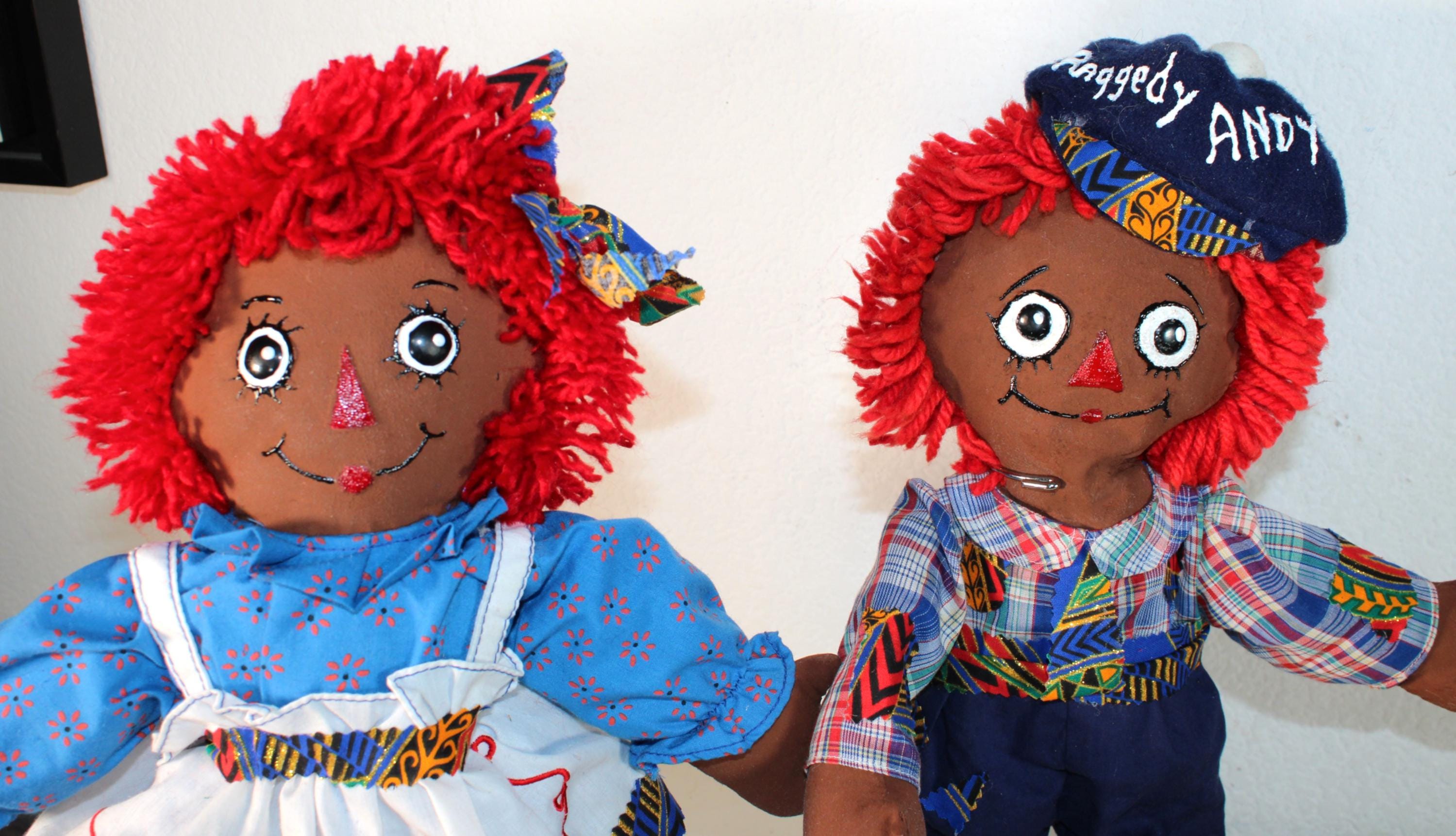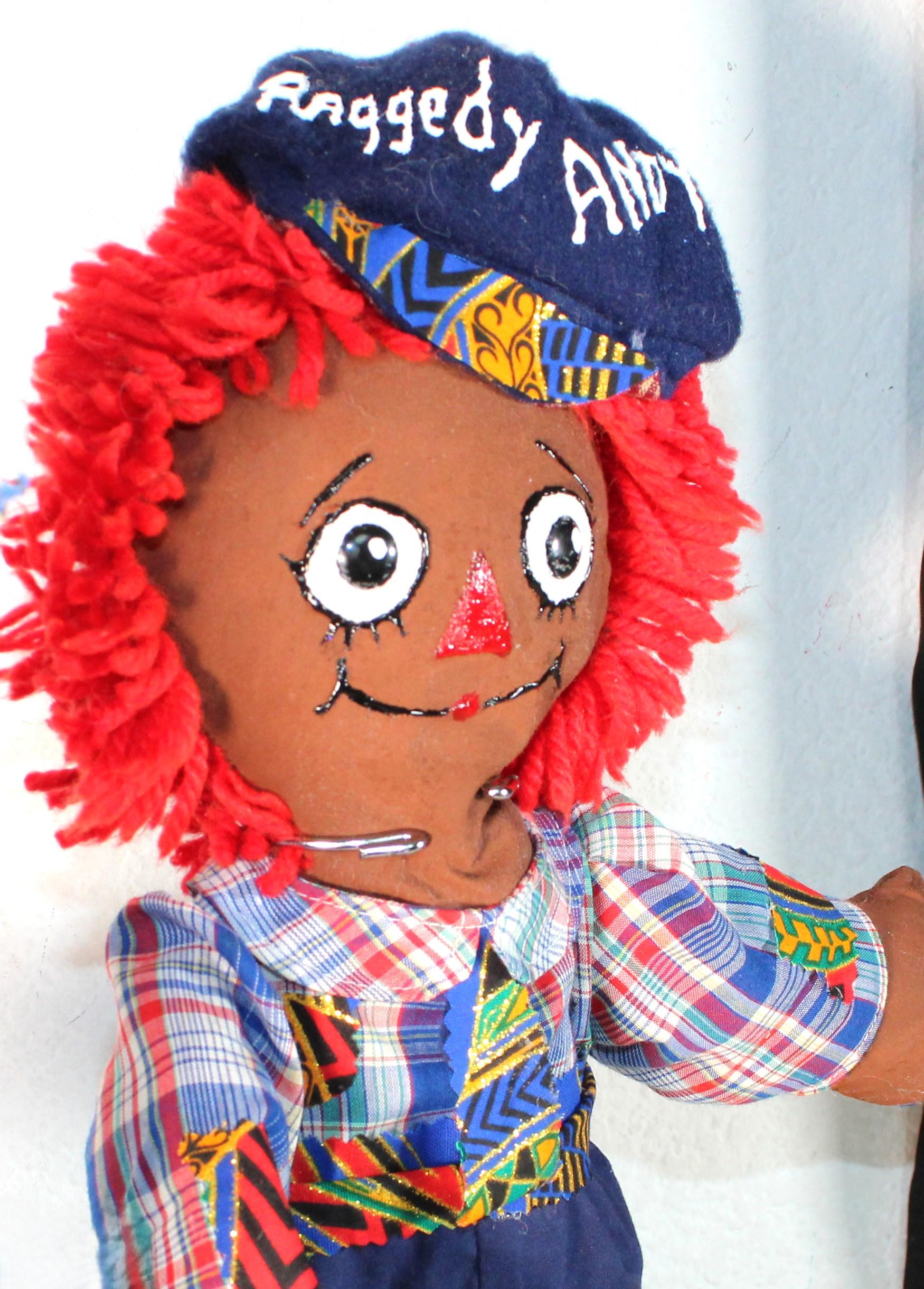 A pair of (16") African American Raggety Ann/ Andy Doll Set with colorful dress and blue britches. Both ensembles accented with a touch of African blue and metallic gold kente print. Matching shirt, blue britches and hat for Andy. Dress with pinafore for Ann with matching hair ribbon. Bright red yard hair. Made of fabric. Handpainted.