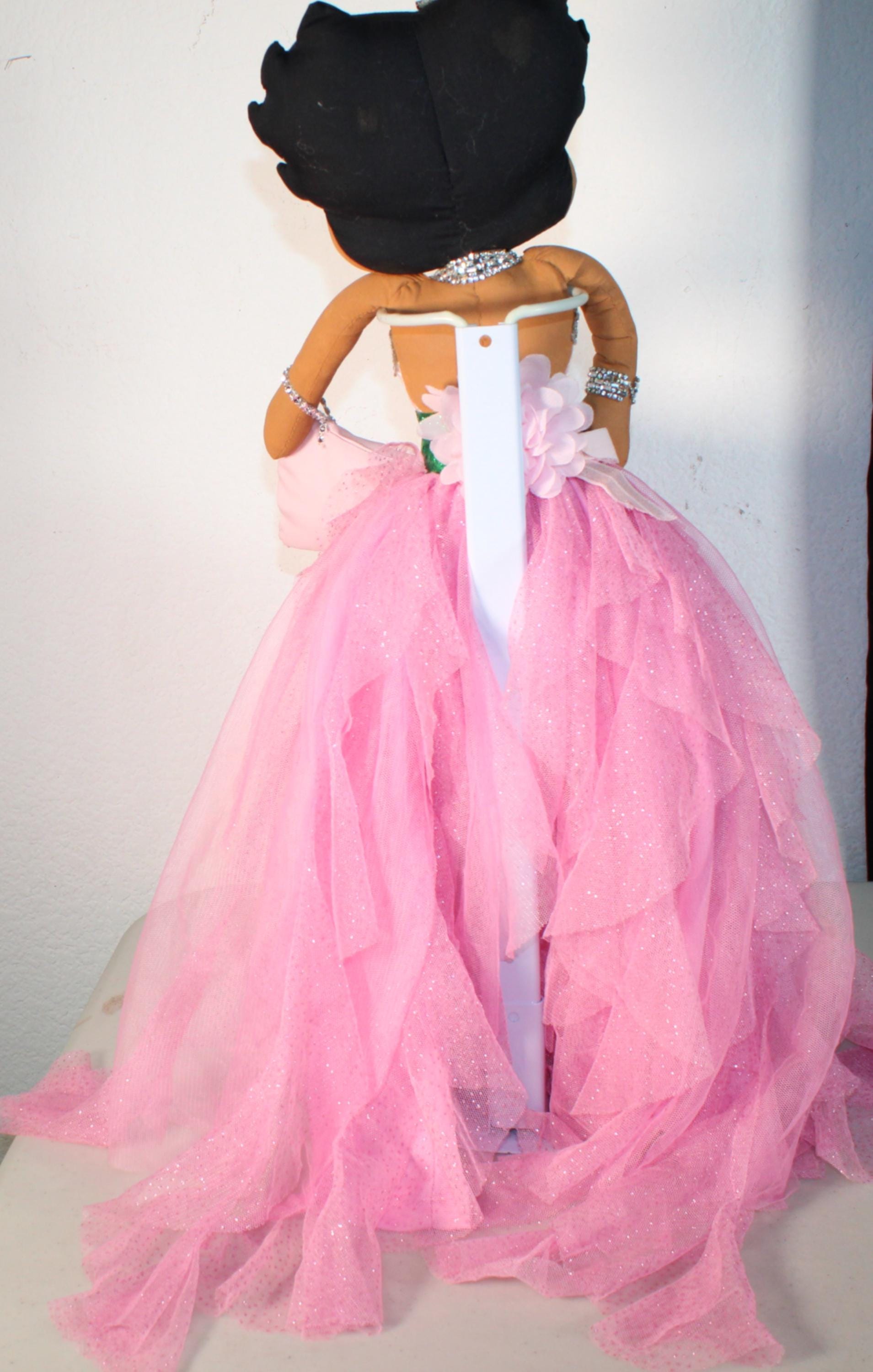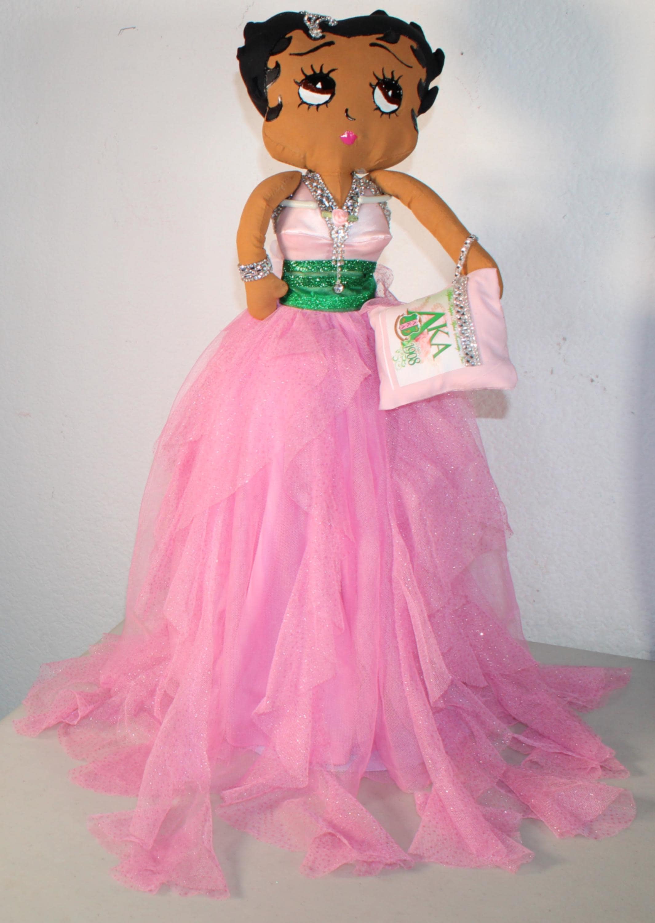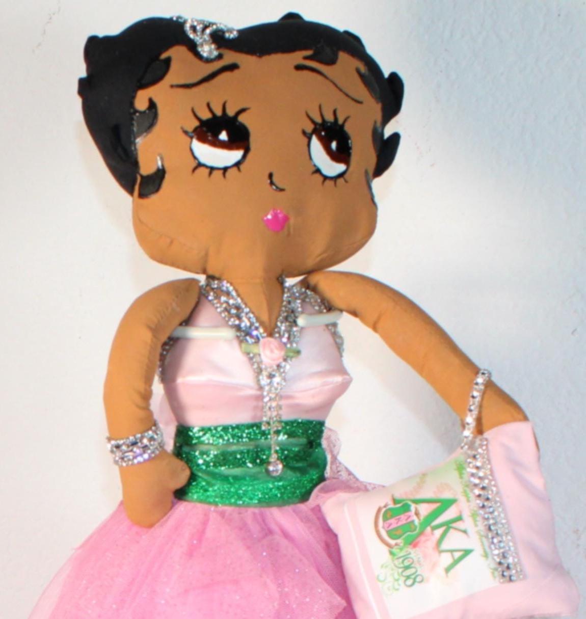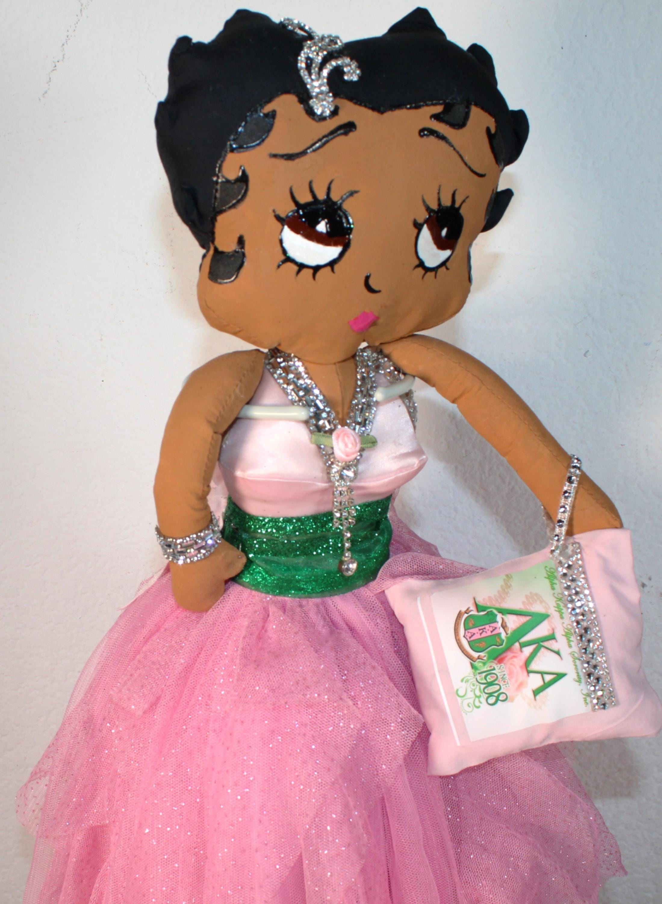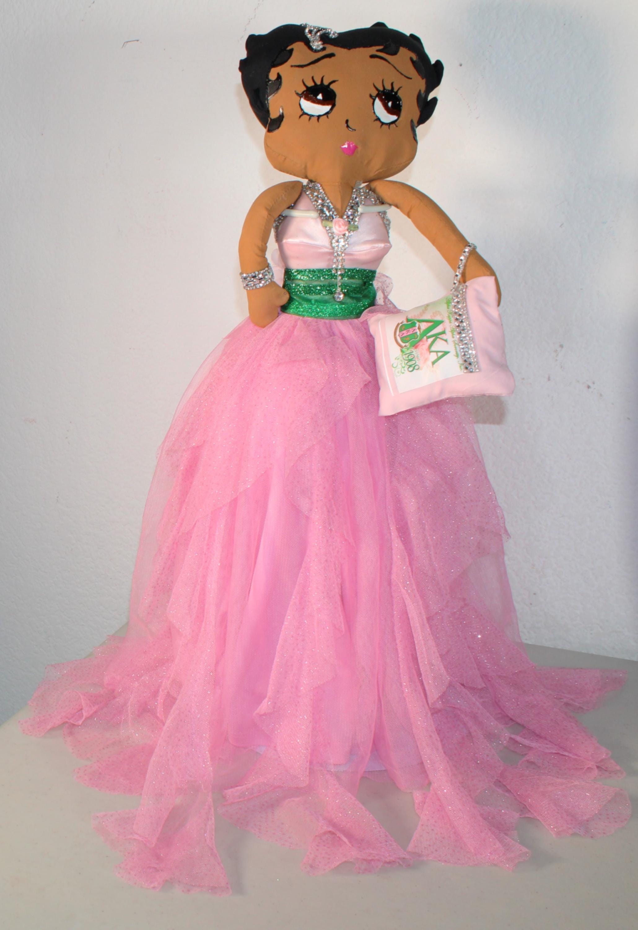 AKA.....An 18" African American Betty Boop in a signature colors of pink and green. Sparkling pink asymetrical skirt withtons of frills. Satin, rhinestone trimmed bustier with sparkly green cumberbund. Matching shoes and earrings. Logo lettered handbag. Made of handpainted fabric.
