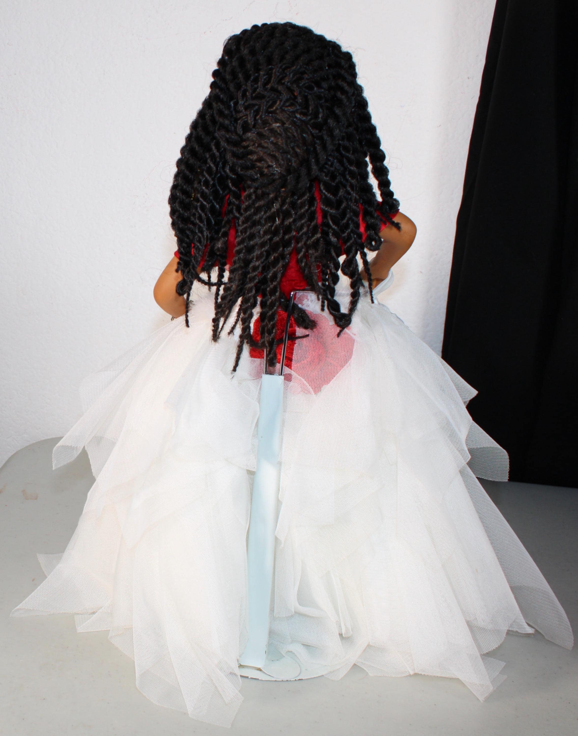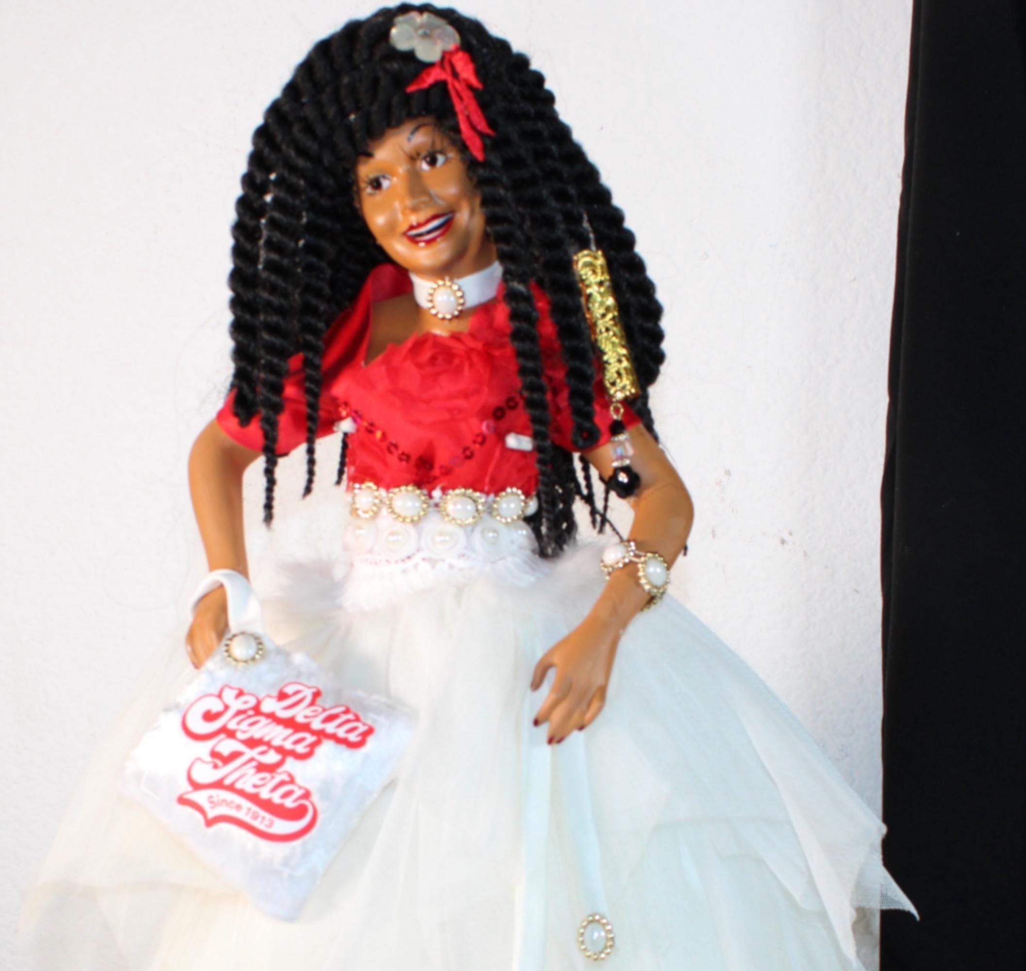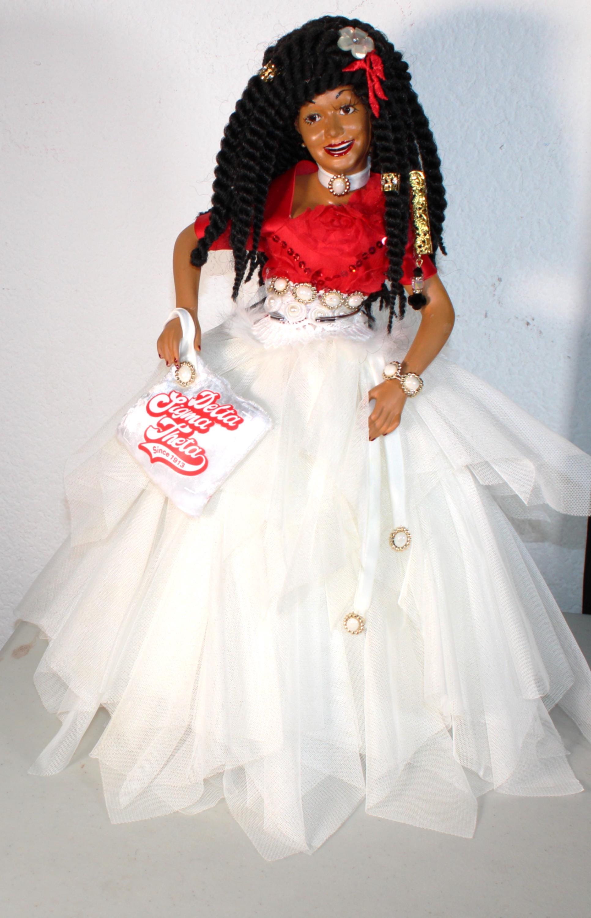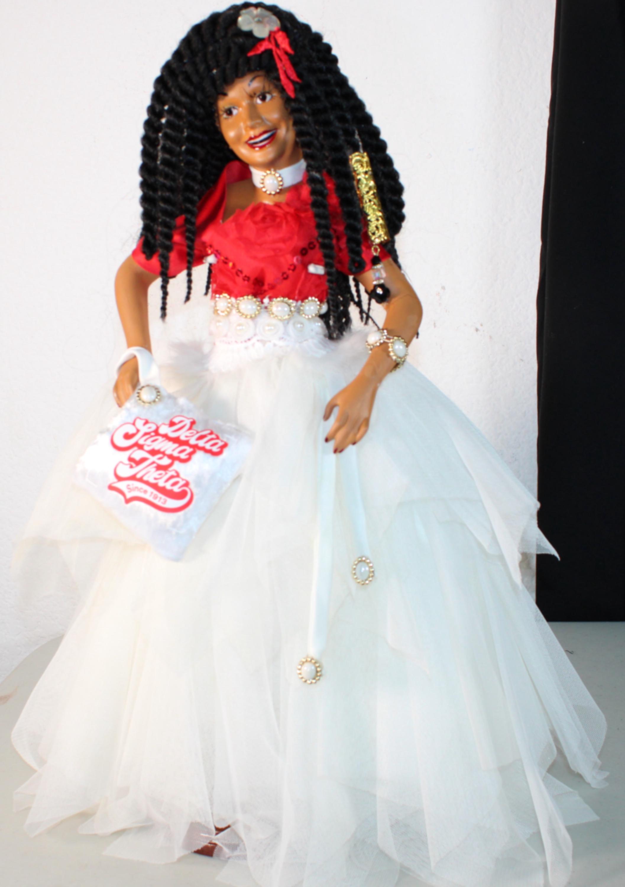 GALYNDA....An 18" African American Porcelain Soror doll, Delta. Dressed in signature colors of red and white Accented with touches of bling. Red satin top with sequin embellishments and off centered plunging neckline. A gorgeous tulle asymmetrical skirt with pearl and faux fur waist embellishments. Black hair in sengalese twist with hair adornments. Beautiful brown eyes. Matching handbag with logo in hand. Made of handpainted porcelain and fabric.
