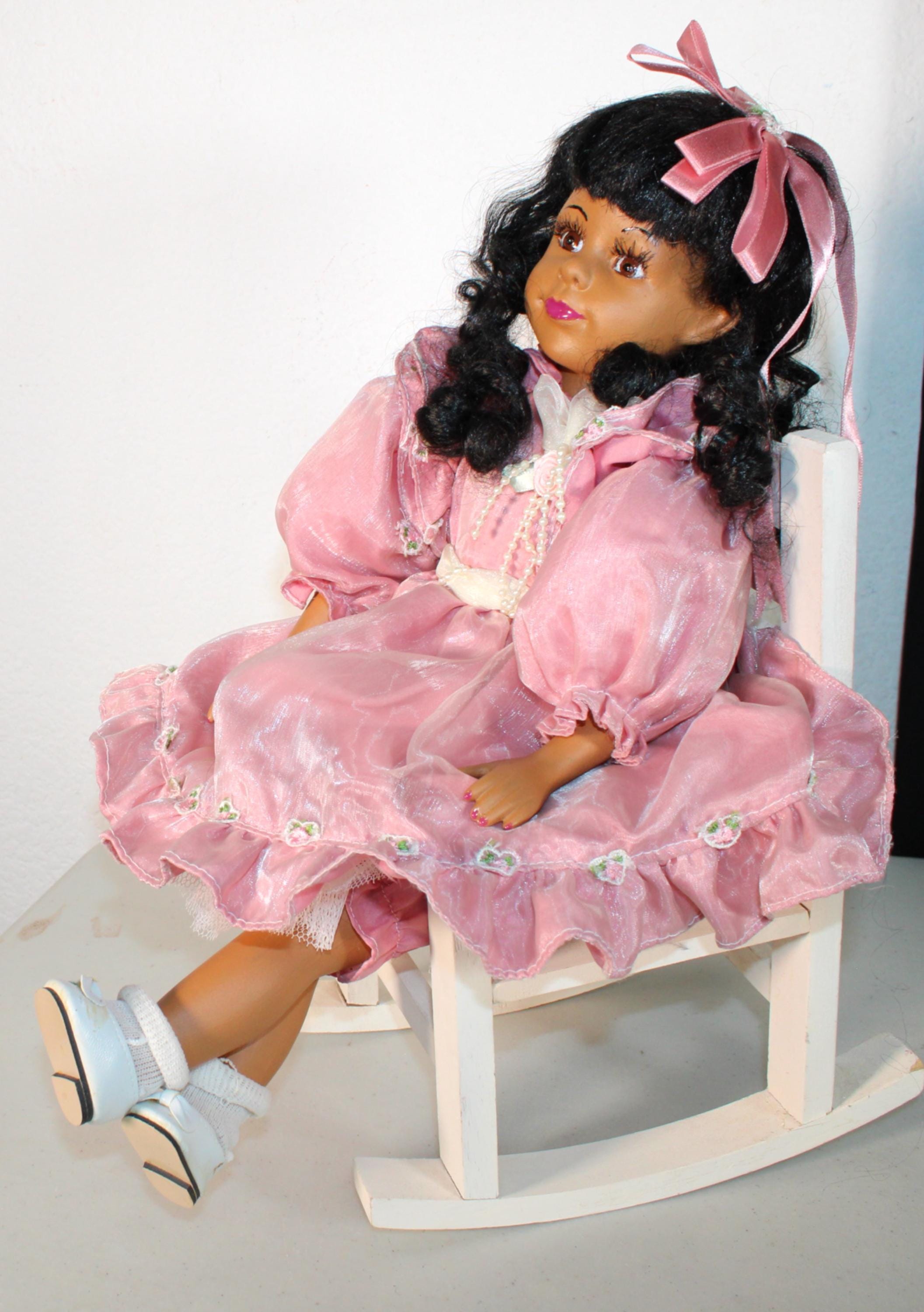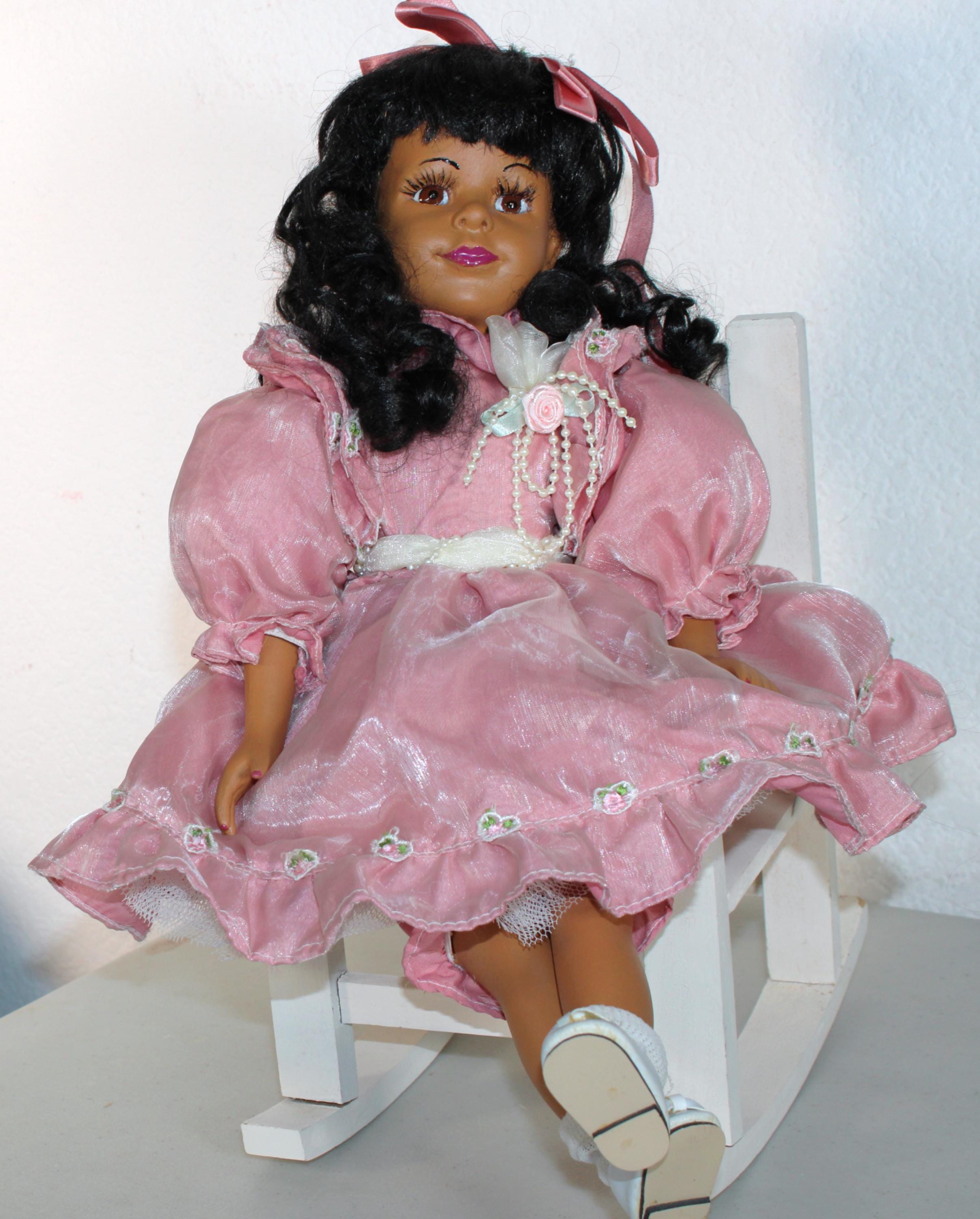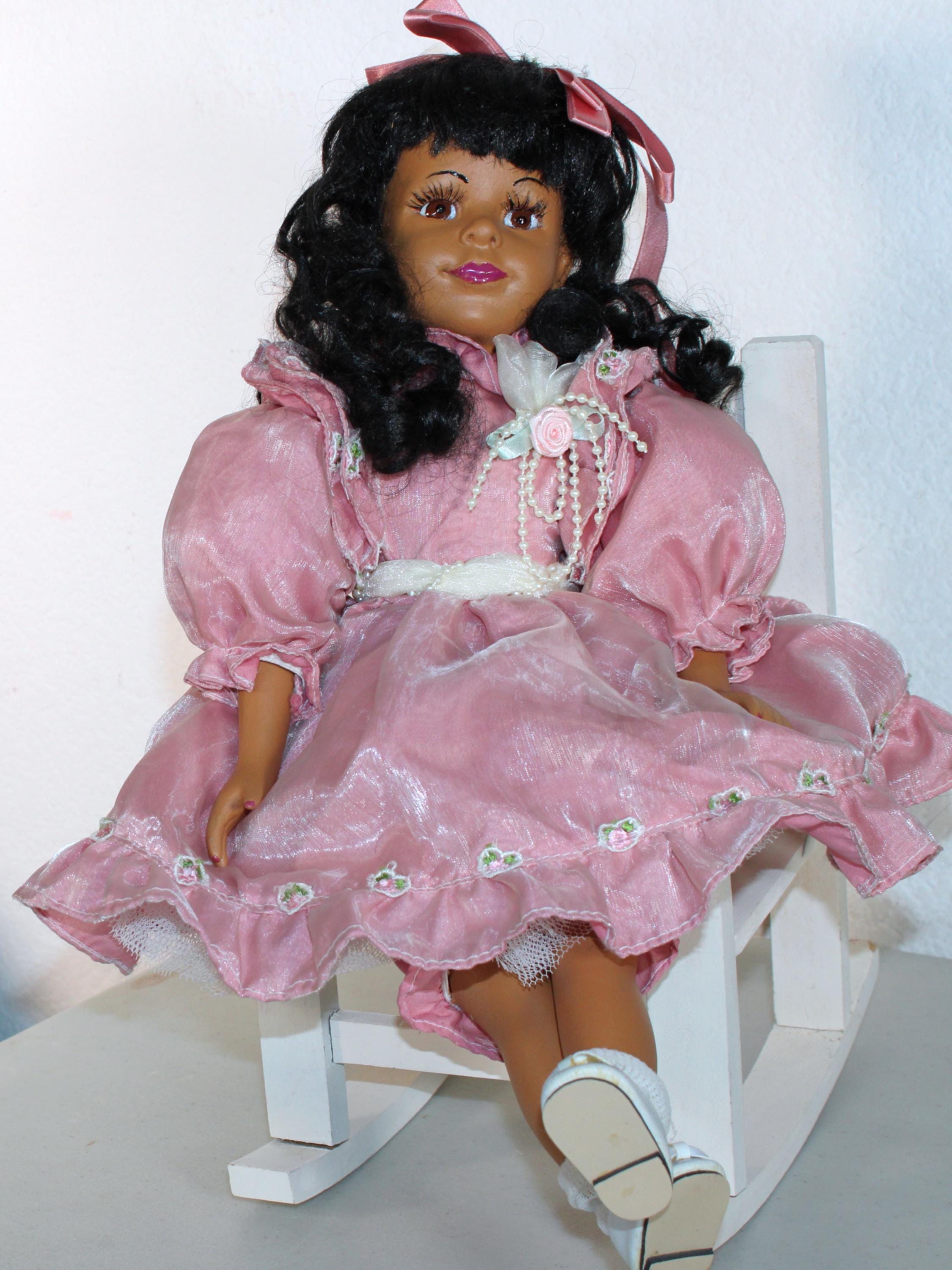 CYNDI.....A 16" African American porcelain girl dressed in a pink party dress embellished with florals and ribbons. Seated in her favorite rocking chair. Matching ribbon to long black curly hair. Made of handpainted porcelain and fabric.