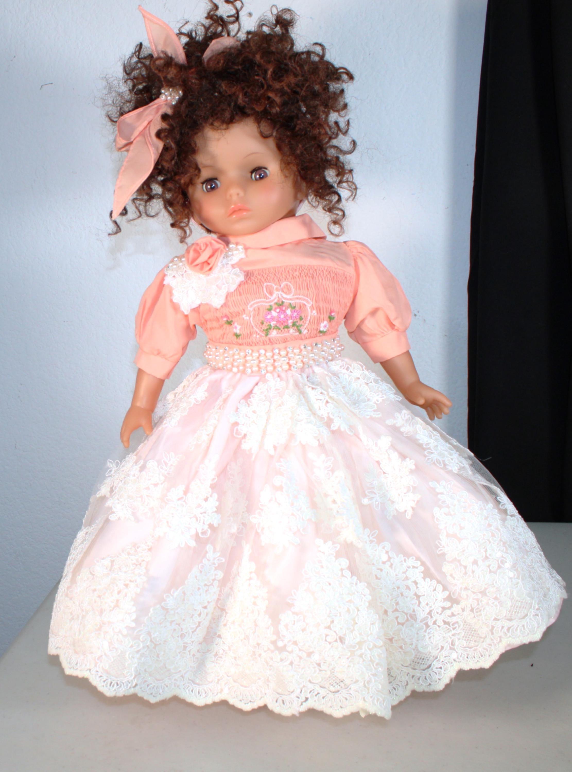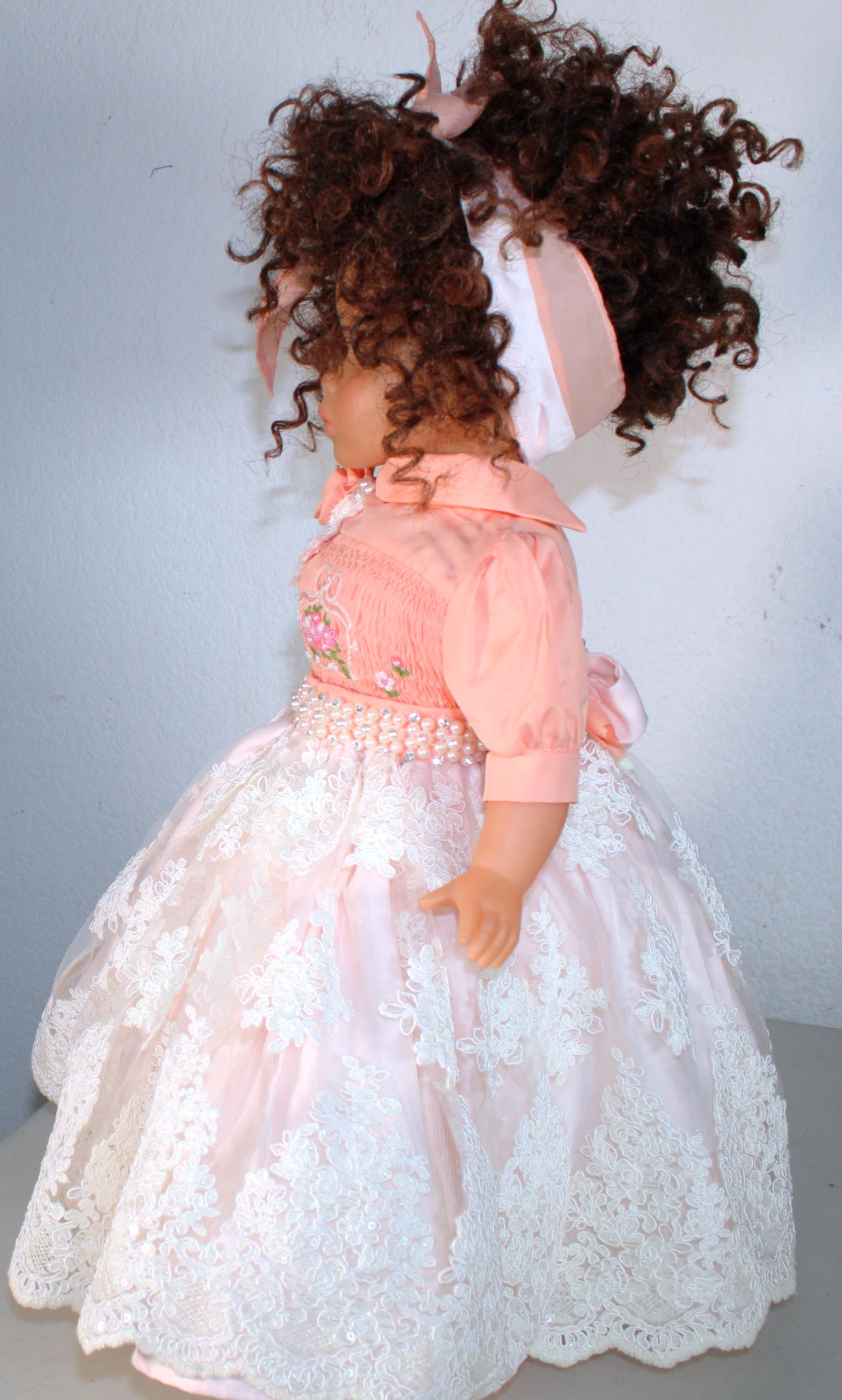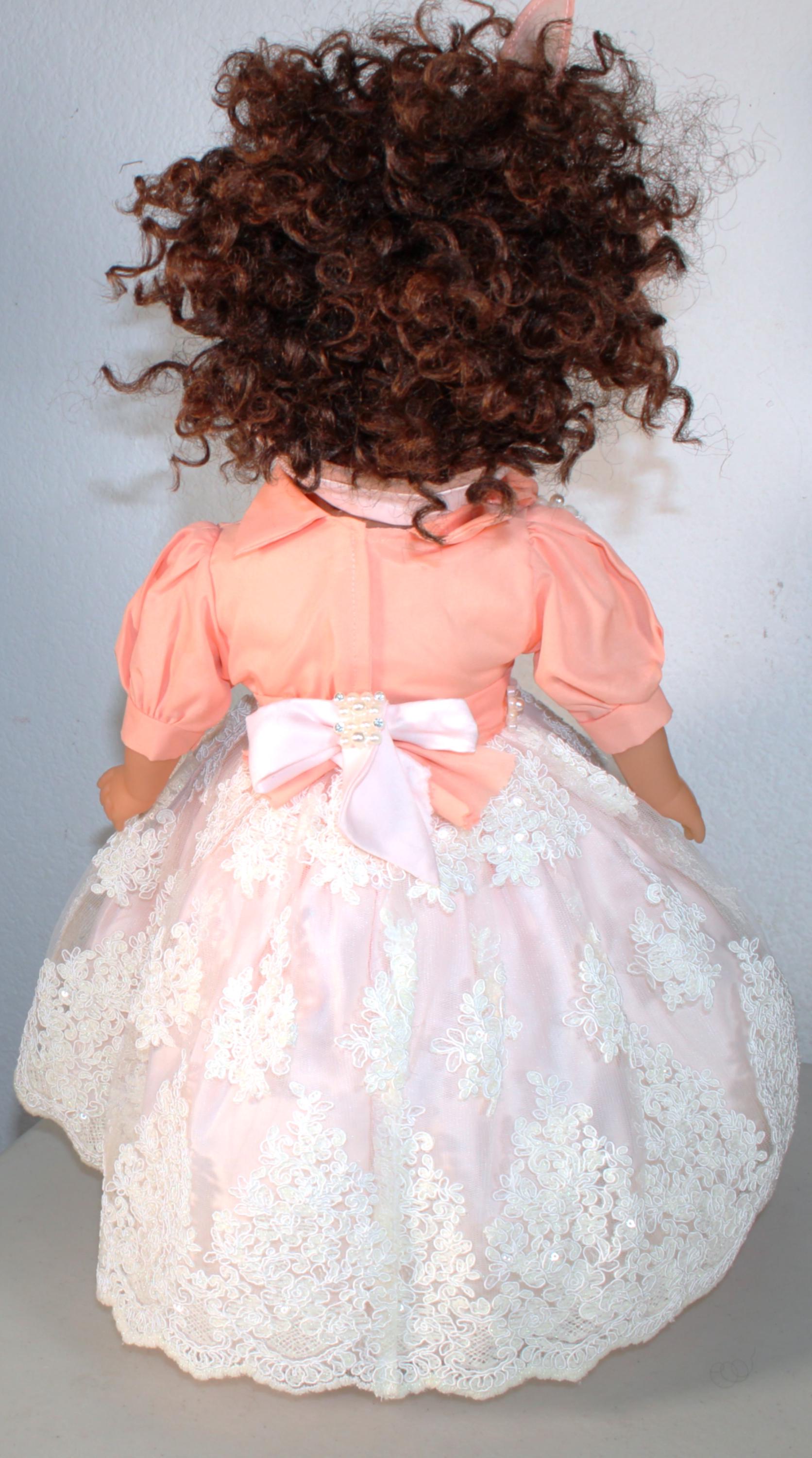 ZAYDIA.... An 18" African American Doll with big beautiful brown eyes is dressed in a beautiful lace and sequin party dress. Matching socks and shoes. All of course with touches of bling. Short Kinky curly hair. Made of vinyl and fabric.