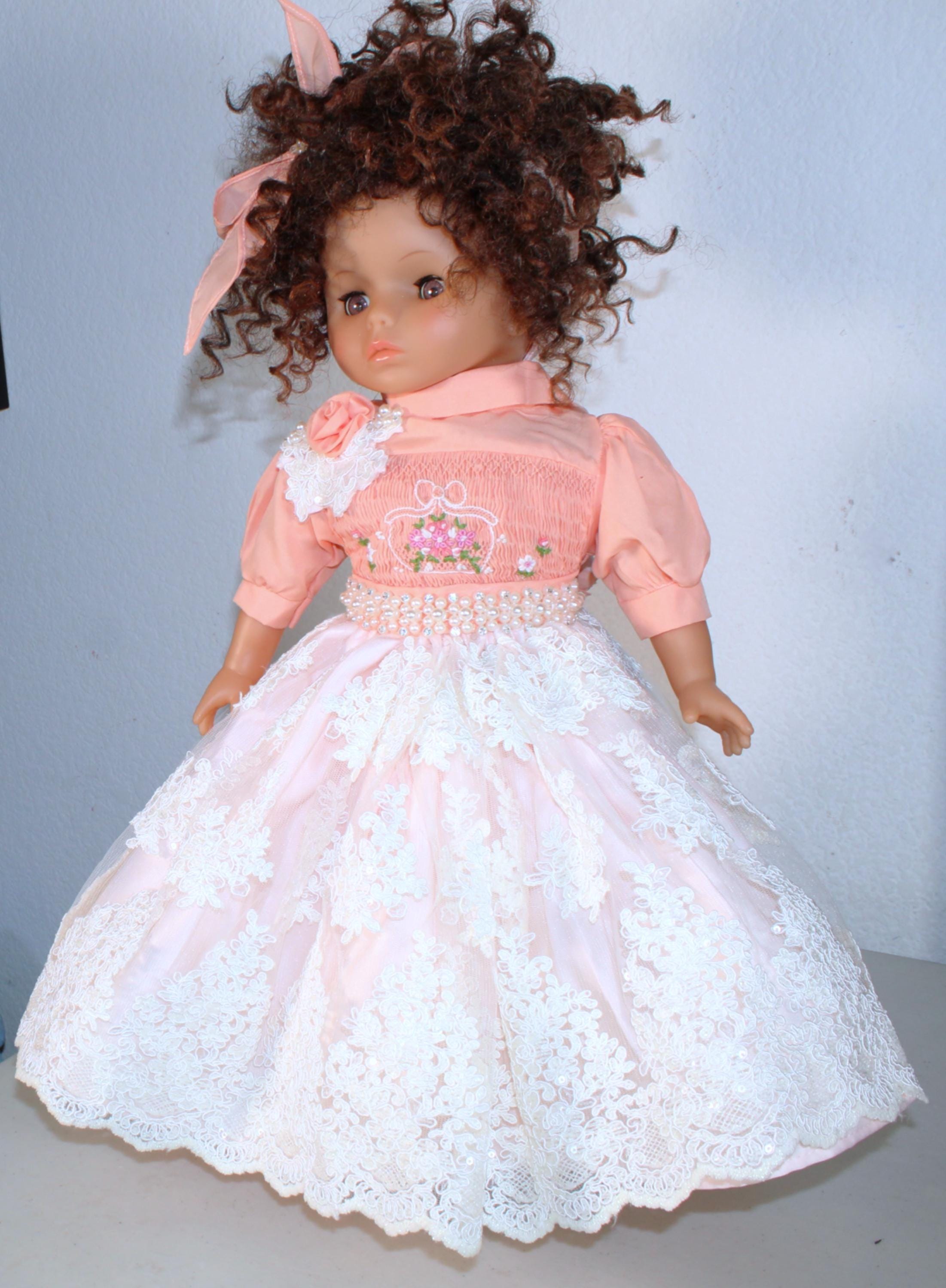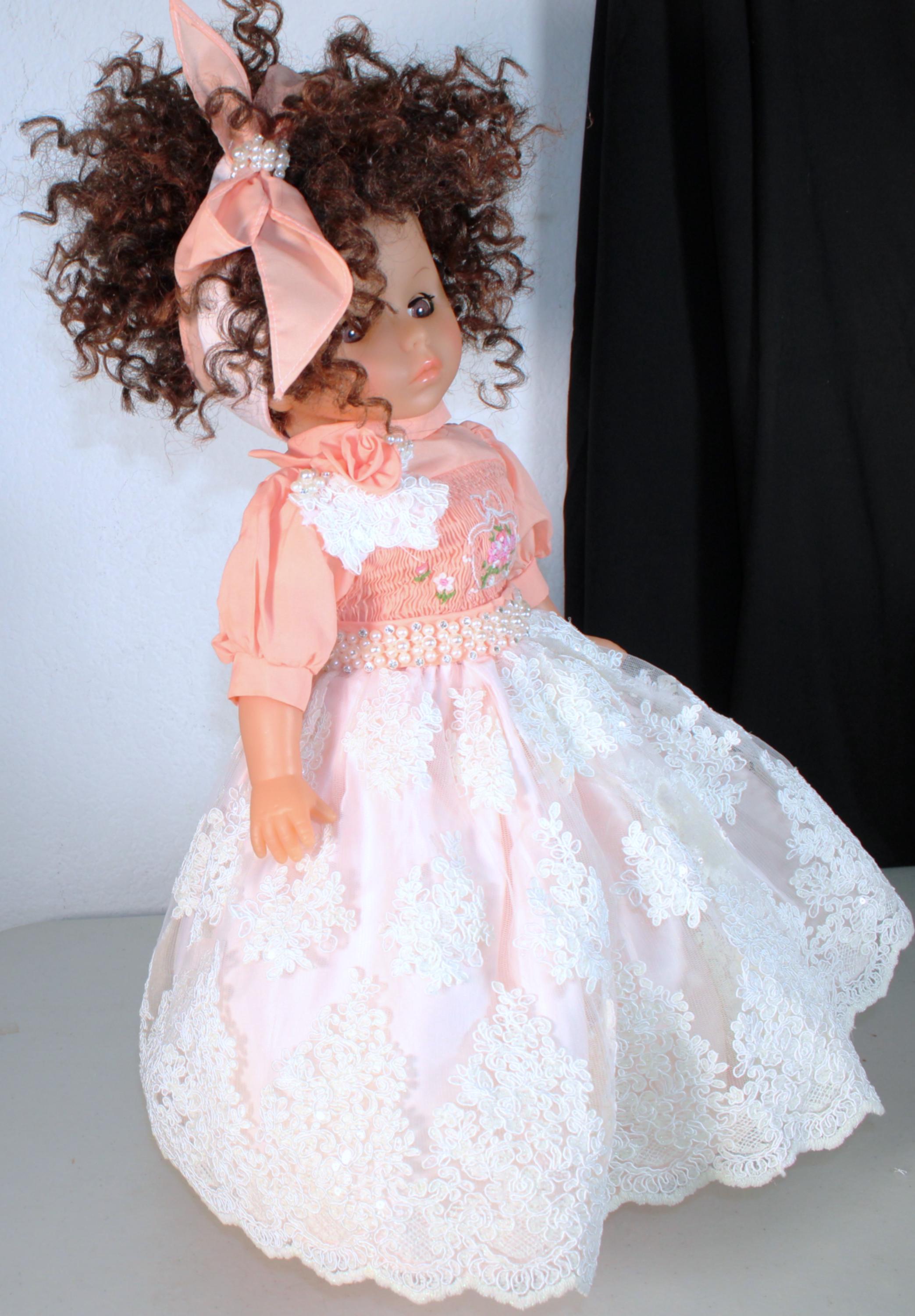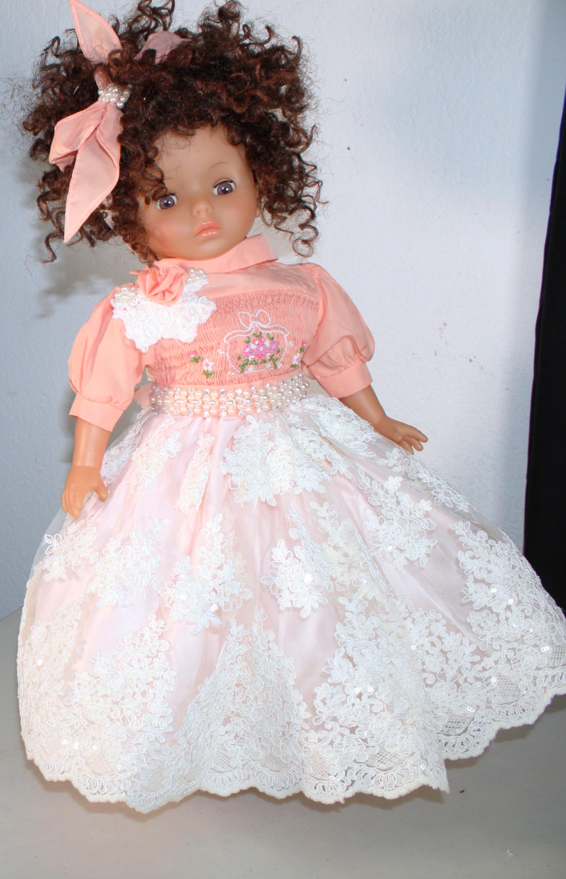 ZAYDIA.... An 18" African American Doll with big beautiful brown eyes is dressed in a beautiful lace and sequin party dress. Matching socks and shoes. All of course with touches of bling. Short Kinky curly hair. Made of vinyl and fabric.