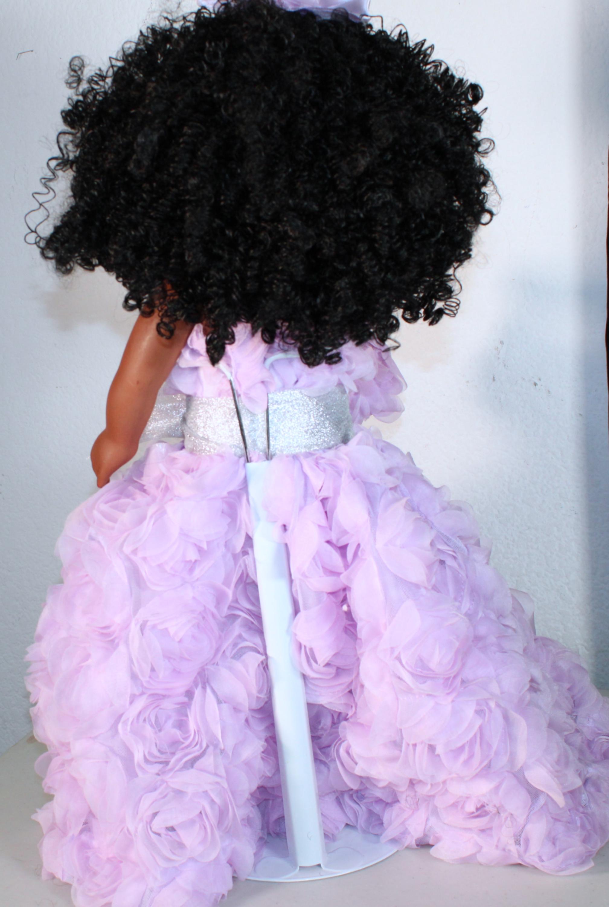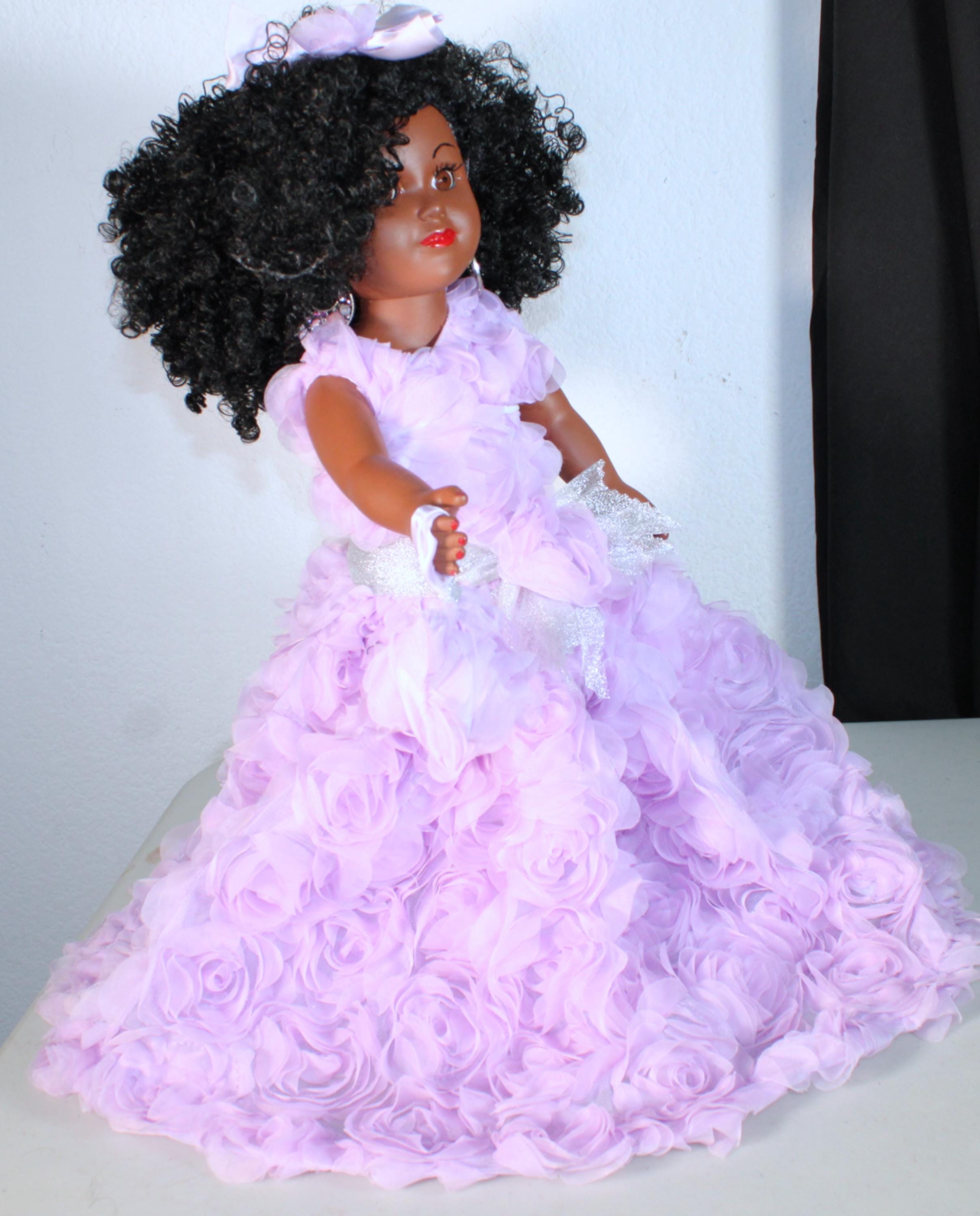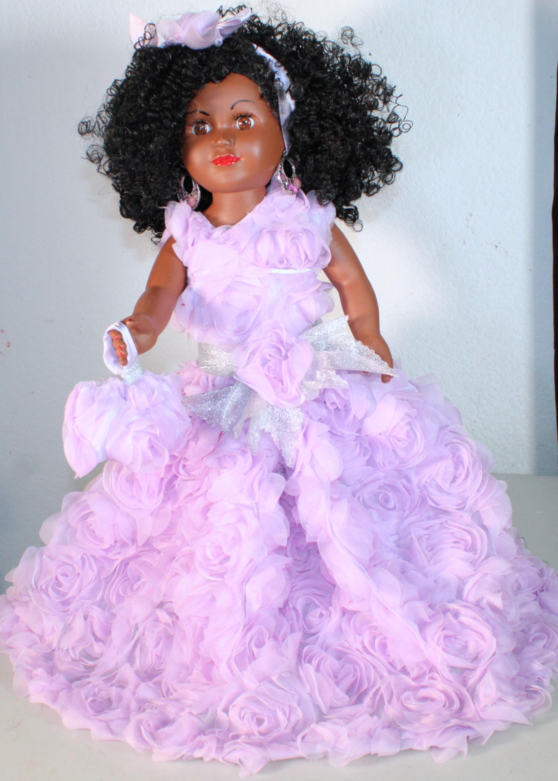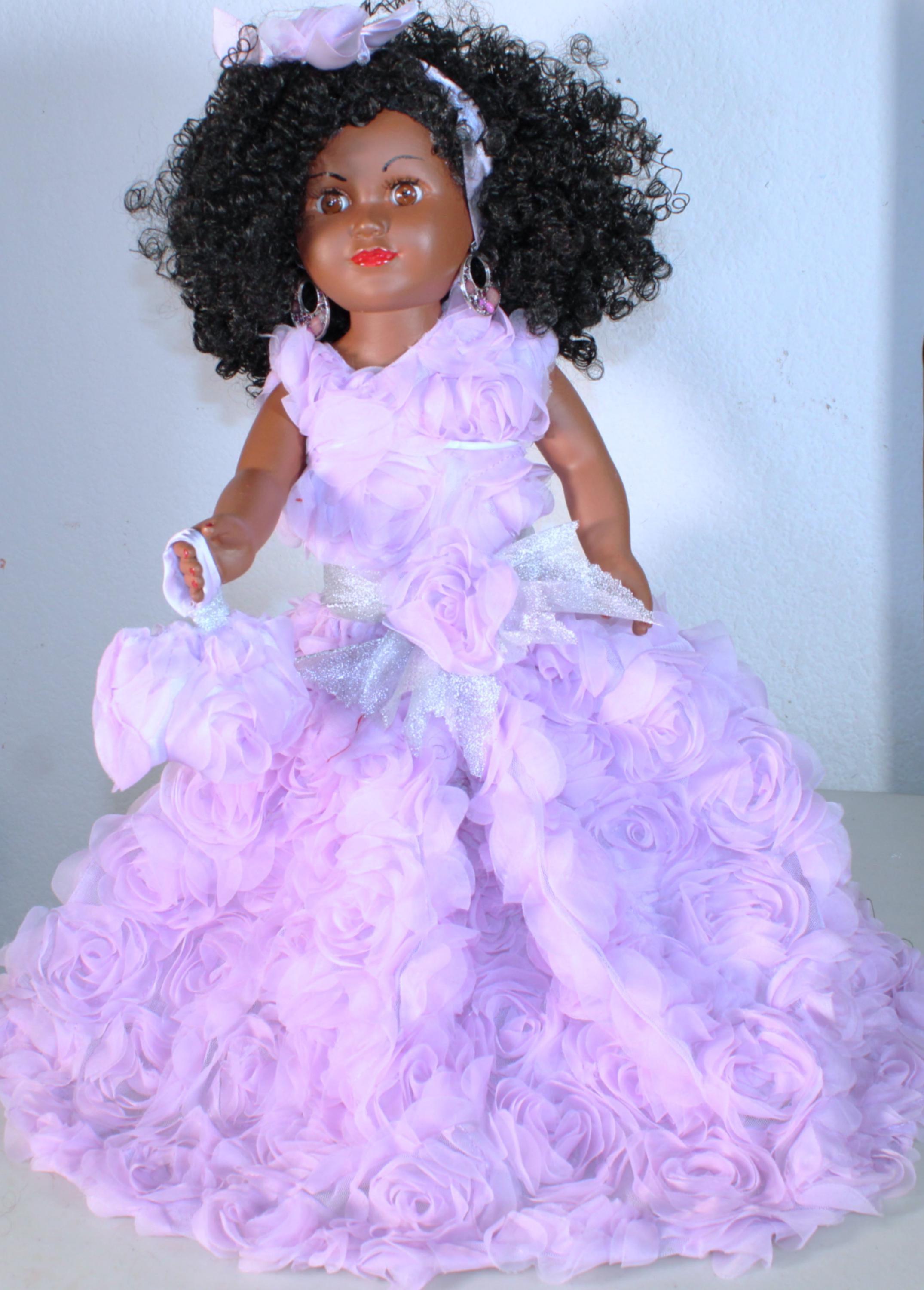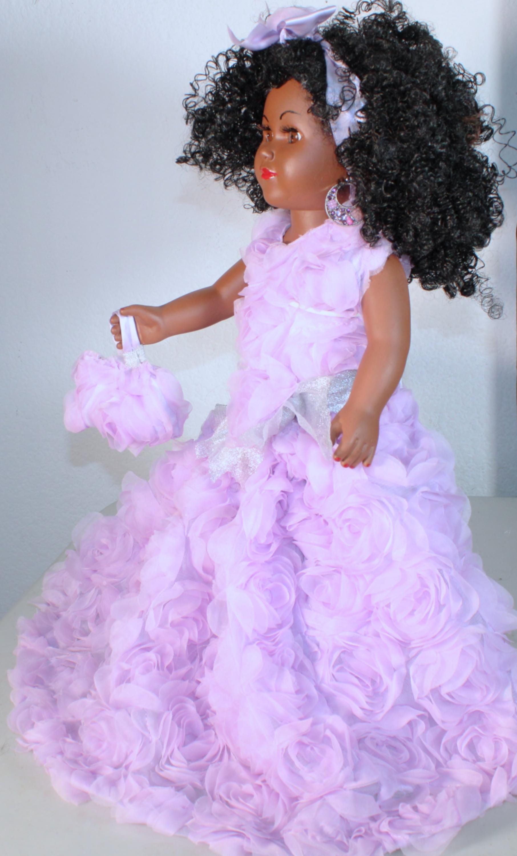 JOANIE...An 18" African American Doll all decked out in a light purple rose embellished ensemble. Big beautiful brown eyes and kinky curly black hair. Matching head band and handbag. Dangle earrings. Made of vinyl and fabric.