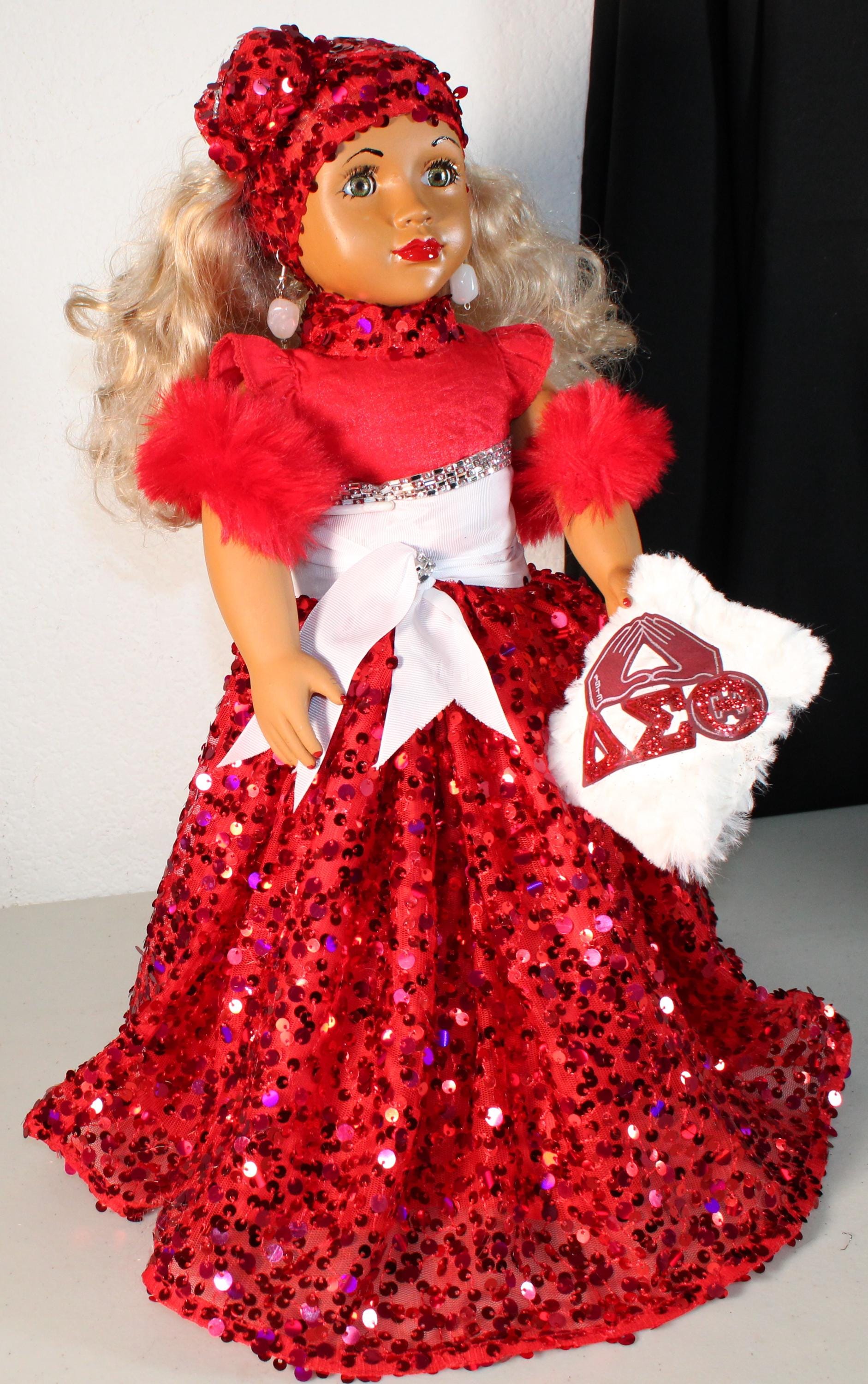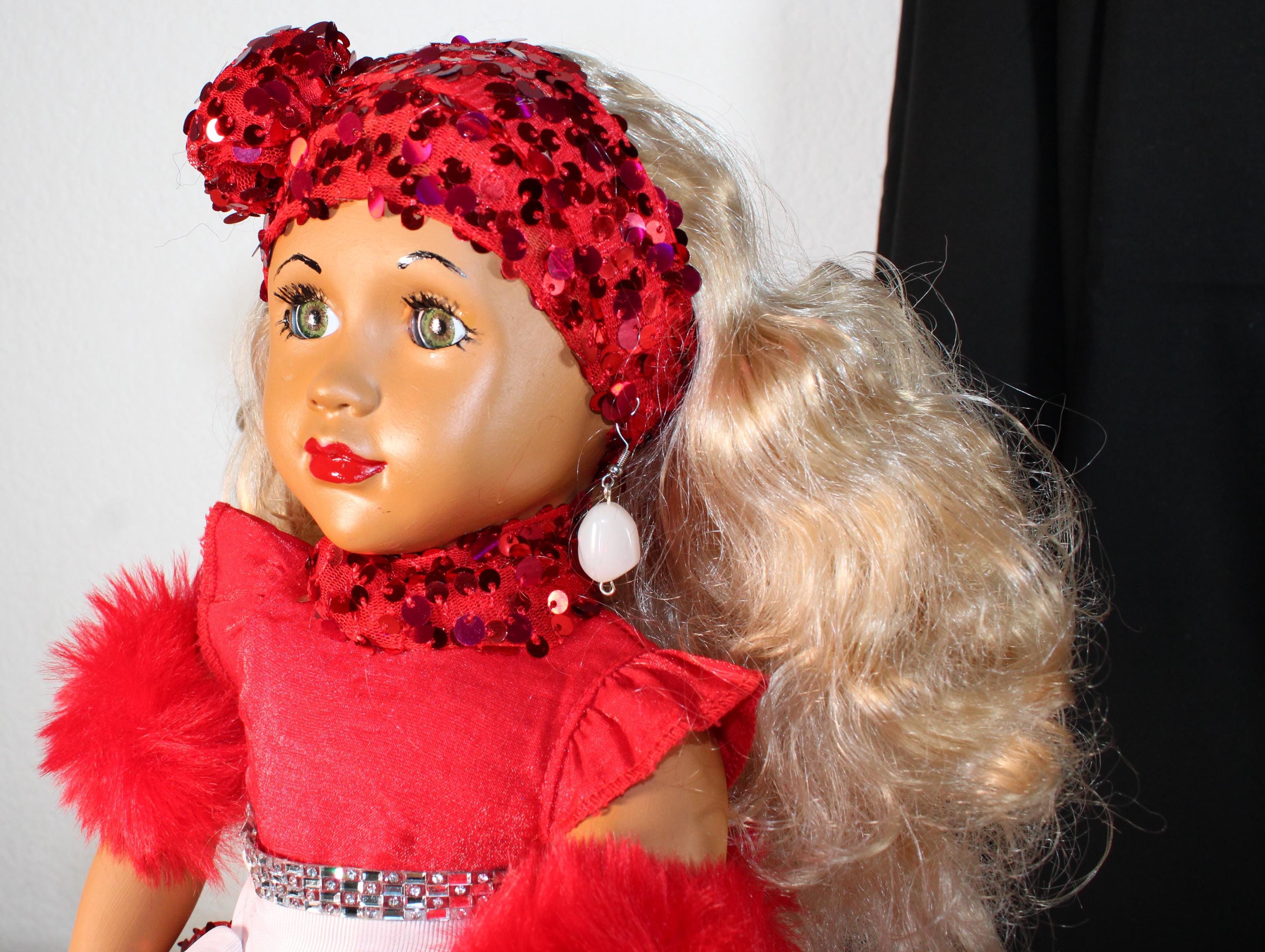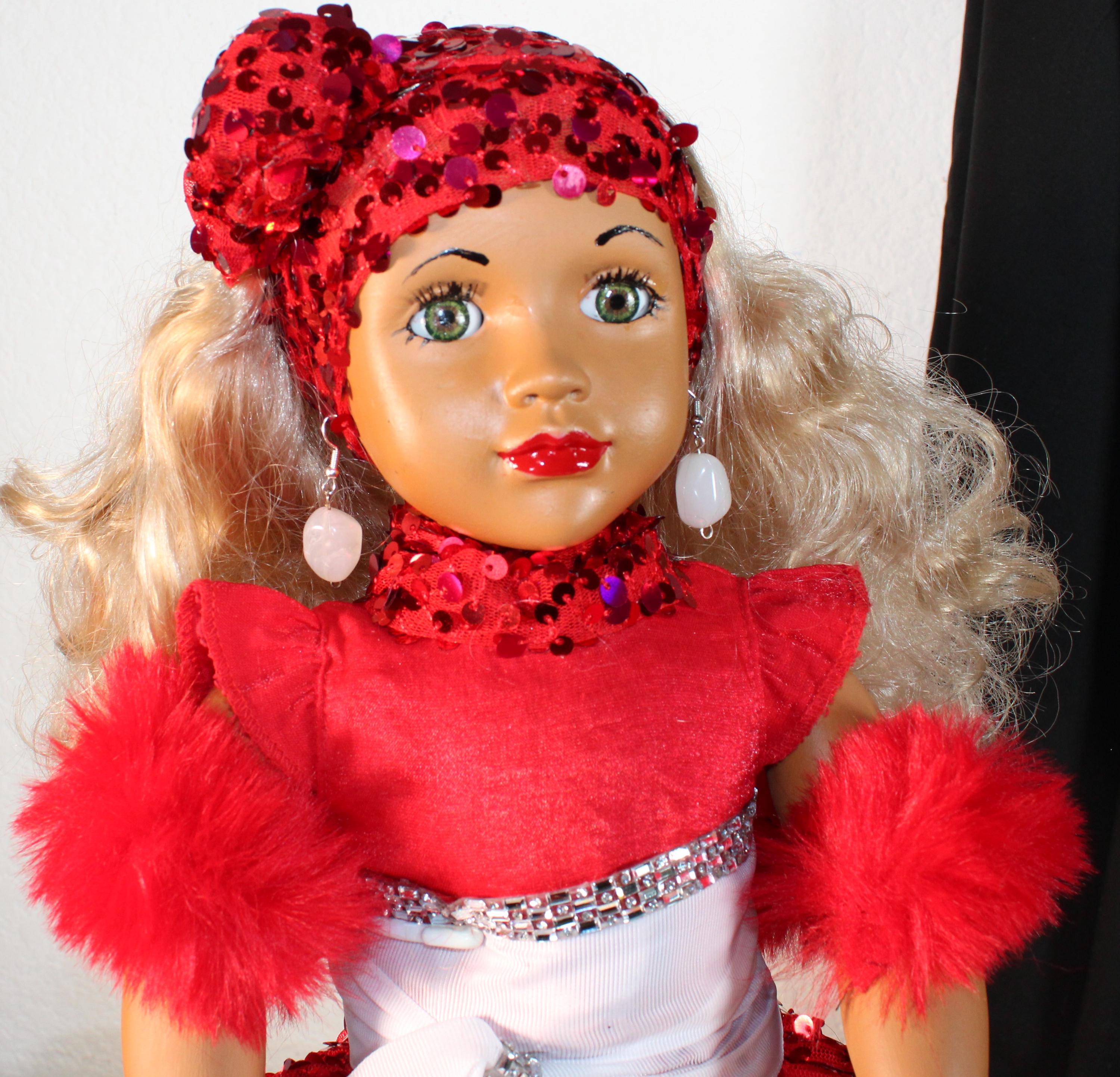 KeKe...An 18" Black Girl dressed in a sequin ensemble in signature colors of red and white with a touch of bling. Dangle earrings, logo handbag in hand and matching faux fur shawl. Has long curly blond hair with sequin headband. Made of hard vinyl and fabric body. Gorgeous hazel eyes.