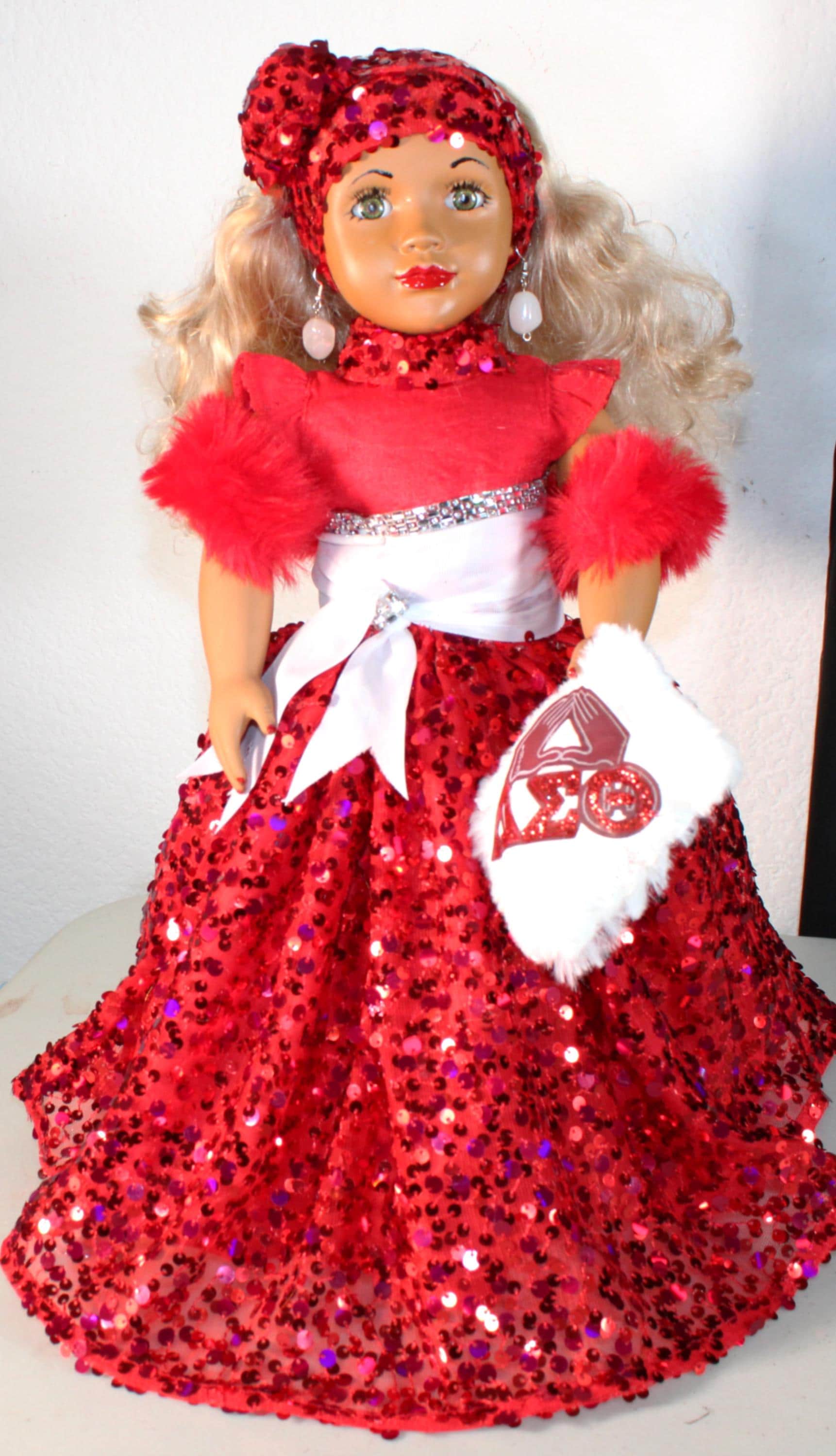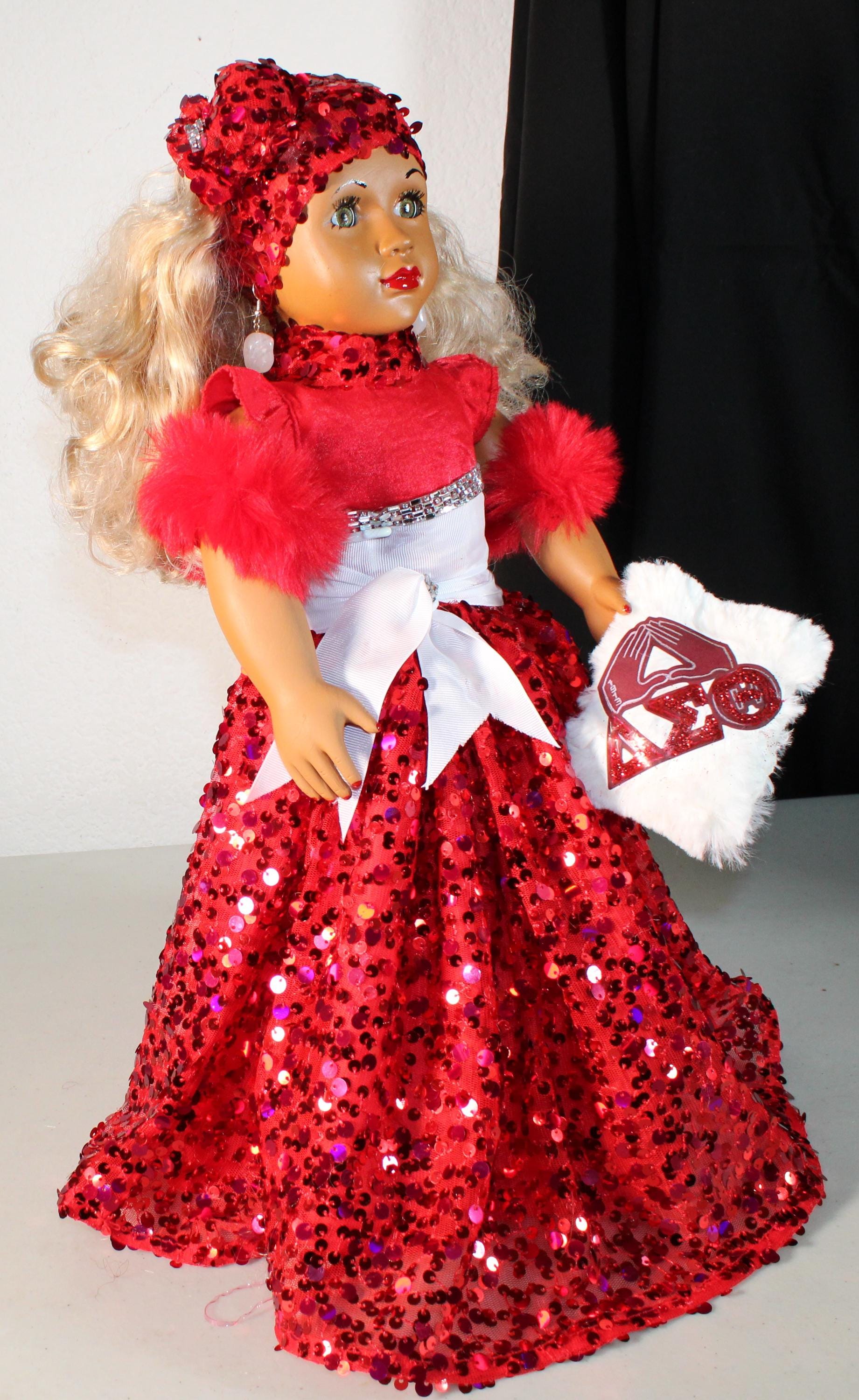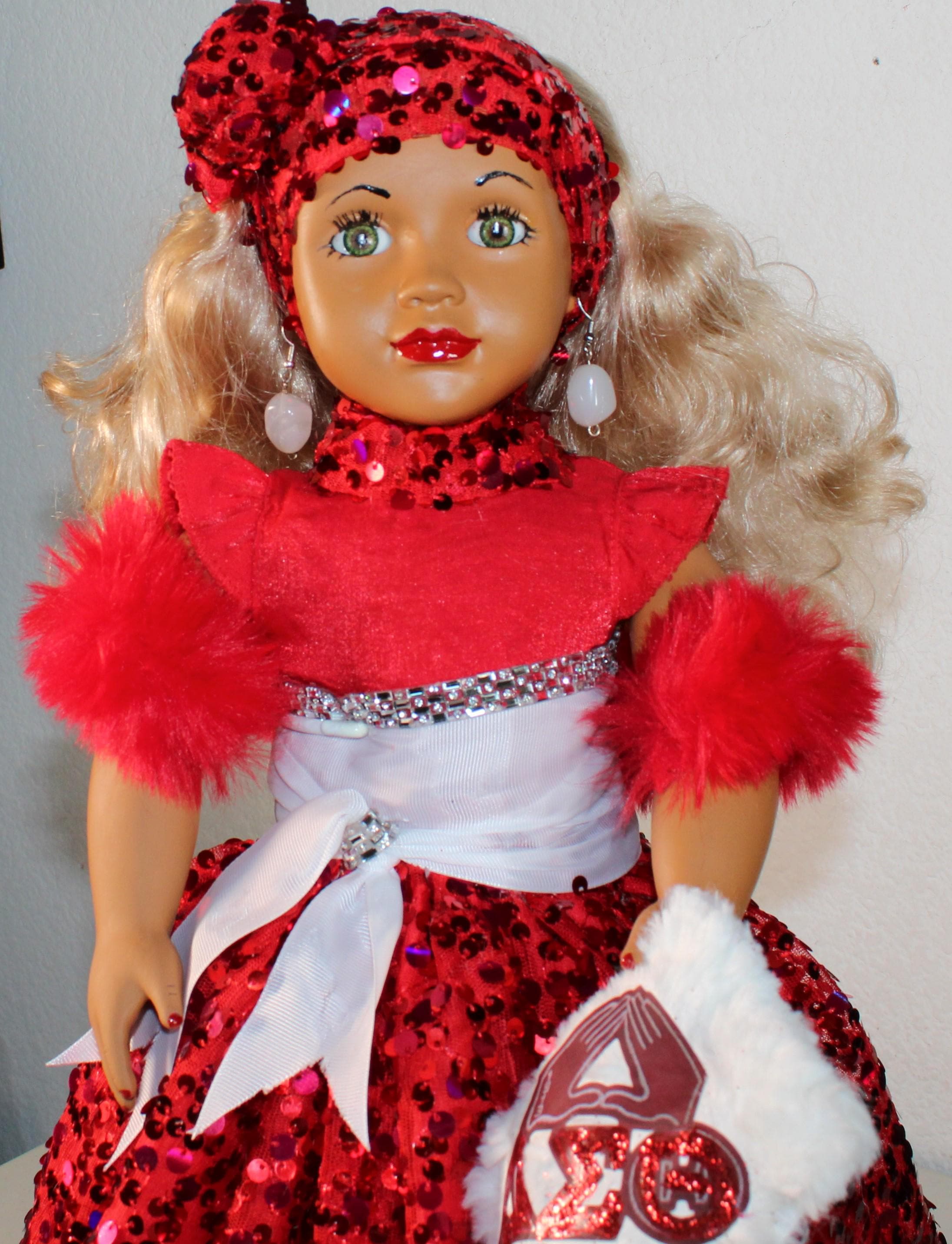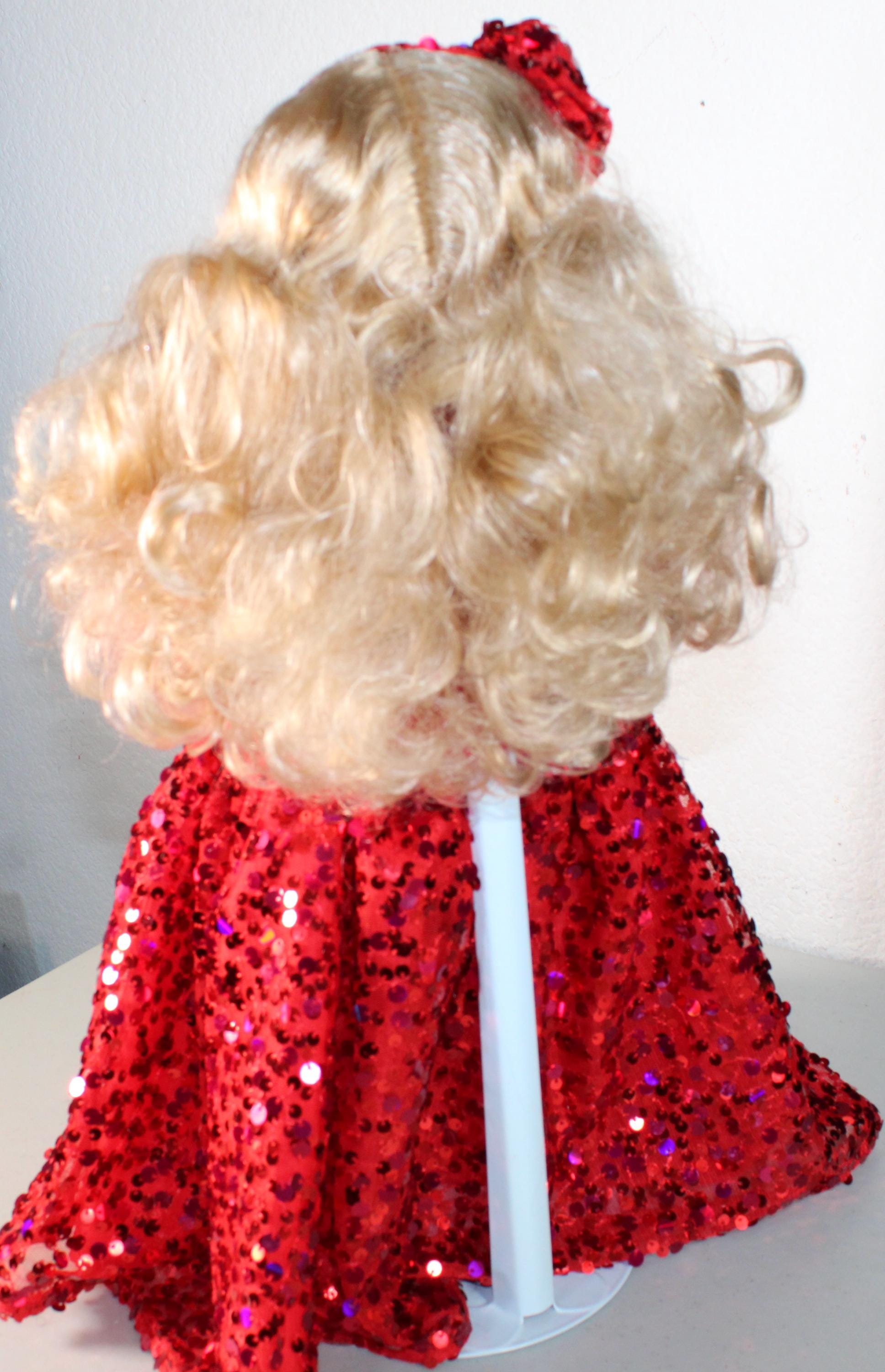 KeKe...An 18" Black Girl dressed in a sequin ensemble in signature colors of red and white with a touch of bling. Dangle earrings, logo handbag in hand and matching faux fur shawl. Has long curly blond hair with sequin headband. Made of hard vinyl and fabric body. Gorgeous hazel eyes.