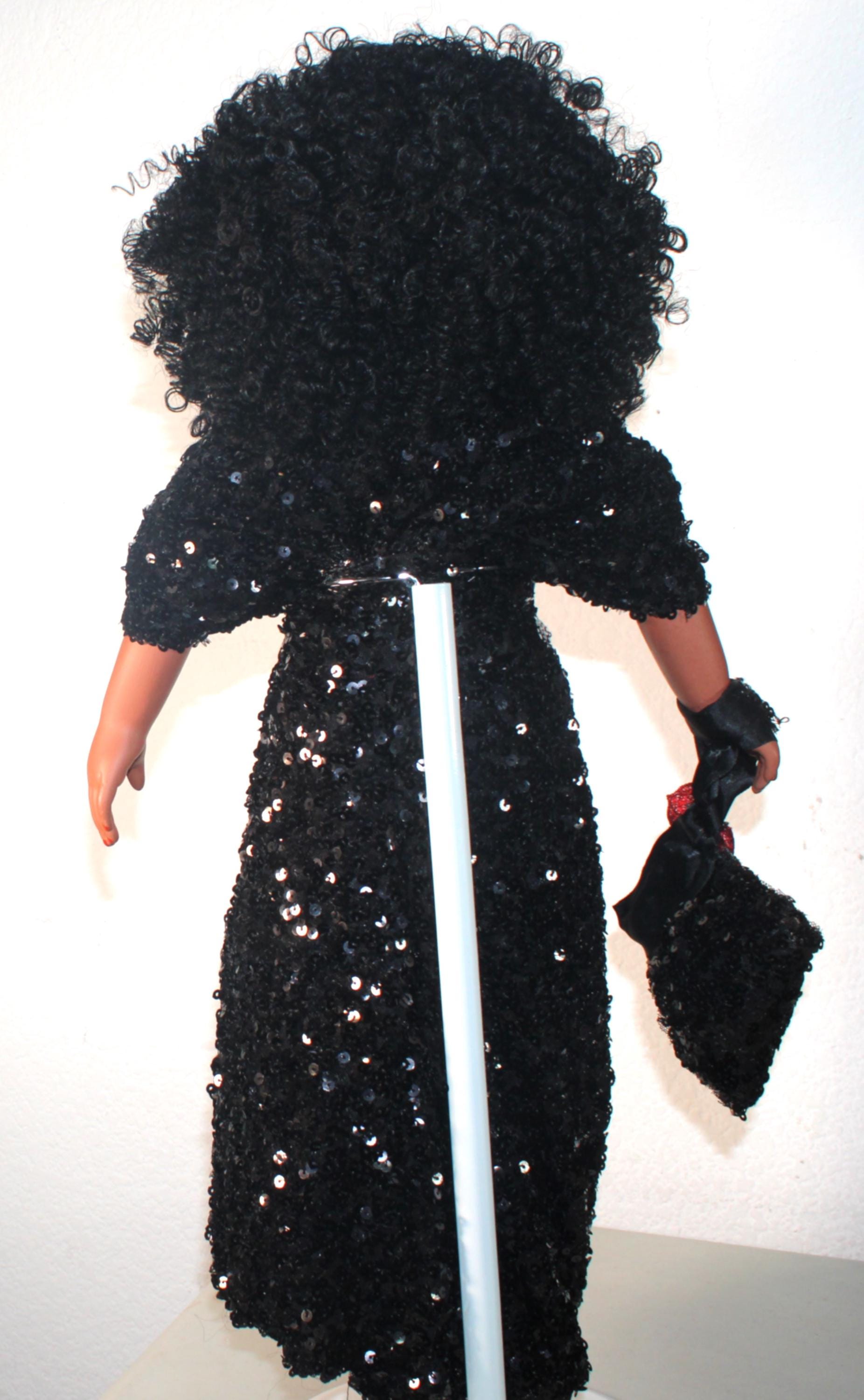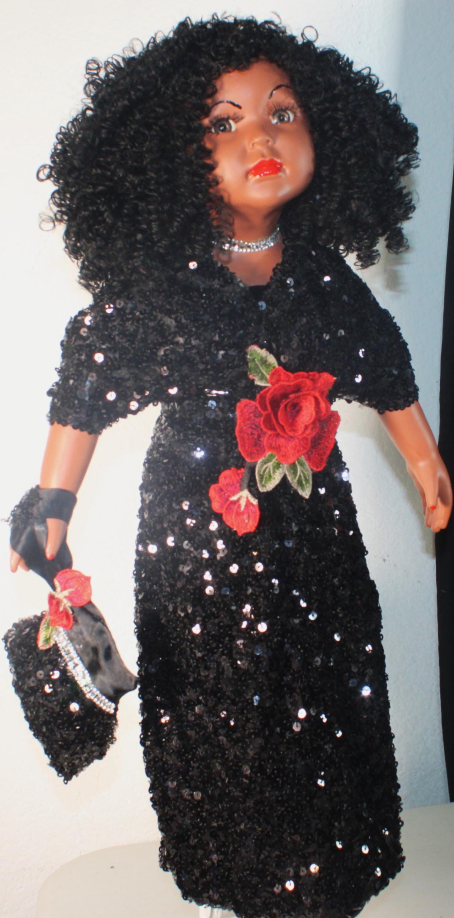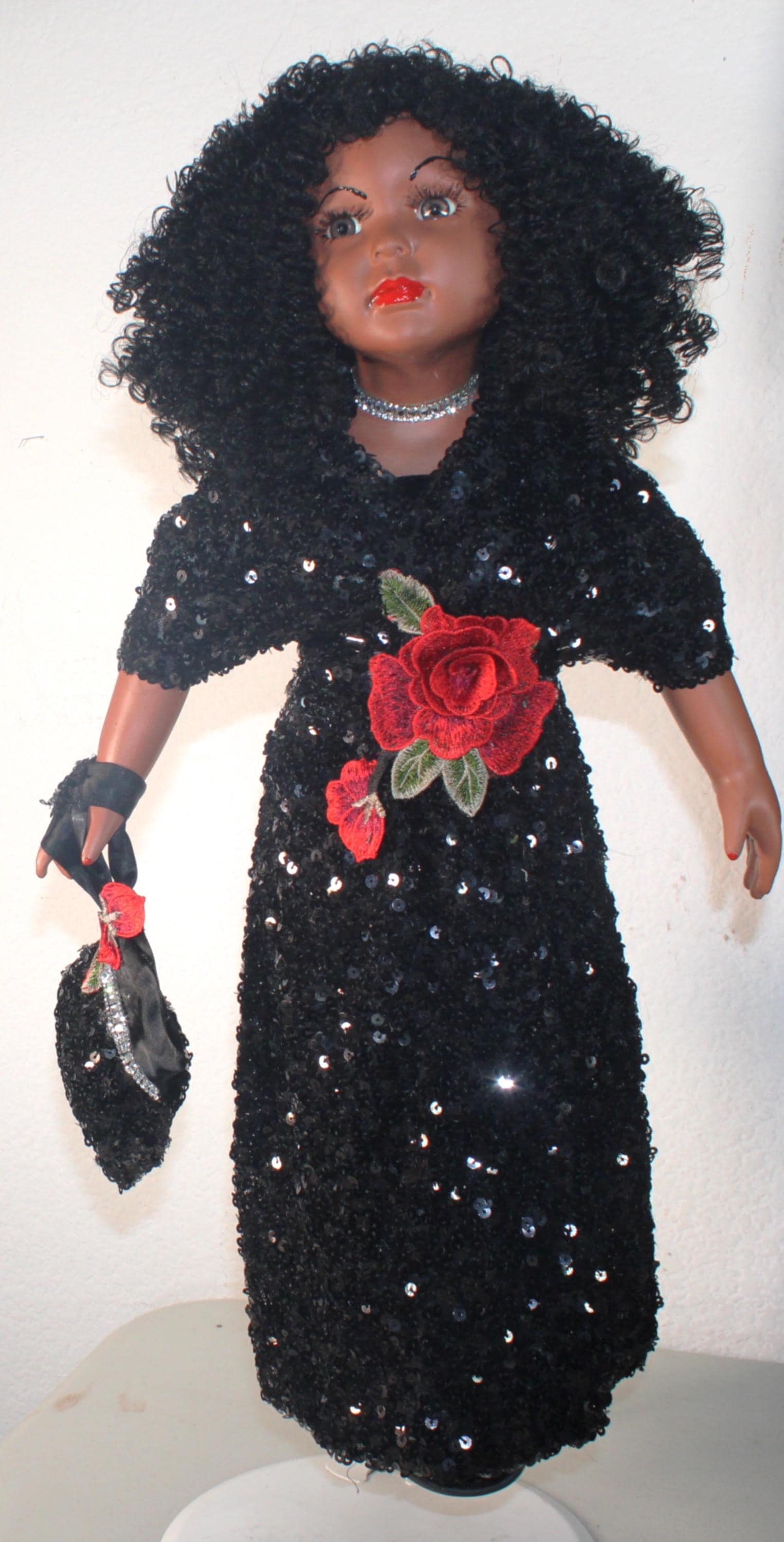MORIAH....Porcelain African American doll 24". An elegant lady dressed in show stopping evening wear of black sequins with a red floral accent and rhinestone jewelry. Kinky curly black hair. Matching handbag. Beautiful hazel eyes. Made of handpainted porcelain and fabric.
