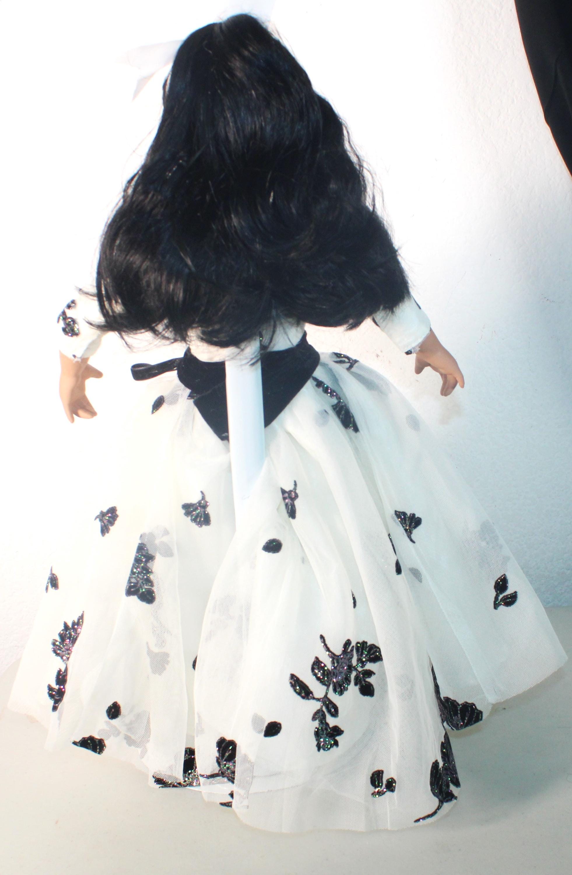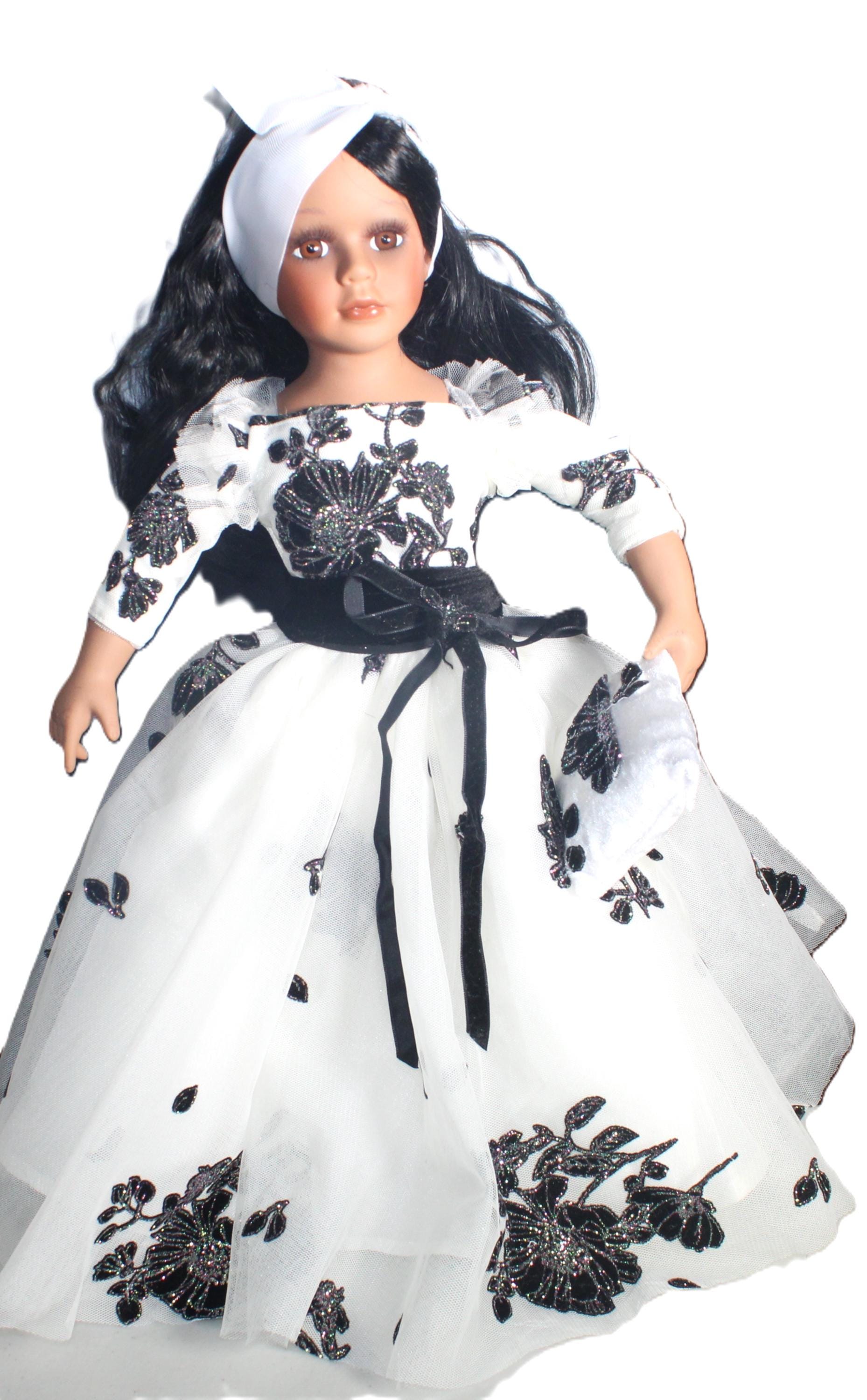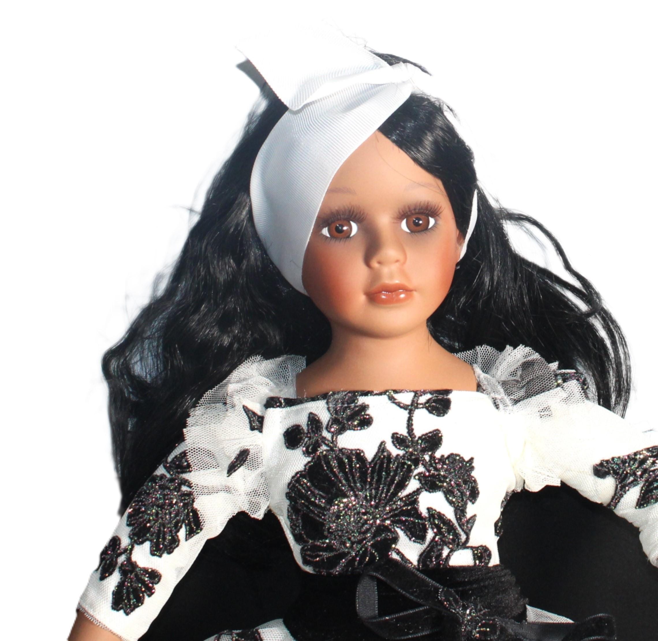 ENDIA.. An exotic Porcelain African American 17" doll in a black and white tulle party dress, accented with black irridescent sparkles. Matching handbag. Shoulder length wavy black hair with headband. Beautiful brown eyes. Made of porcelain and fabric. Sure to add glamour and class to your doll collection.
