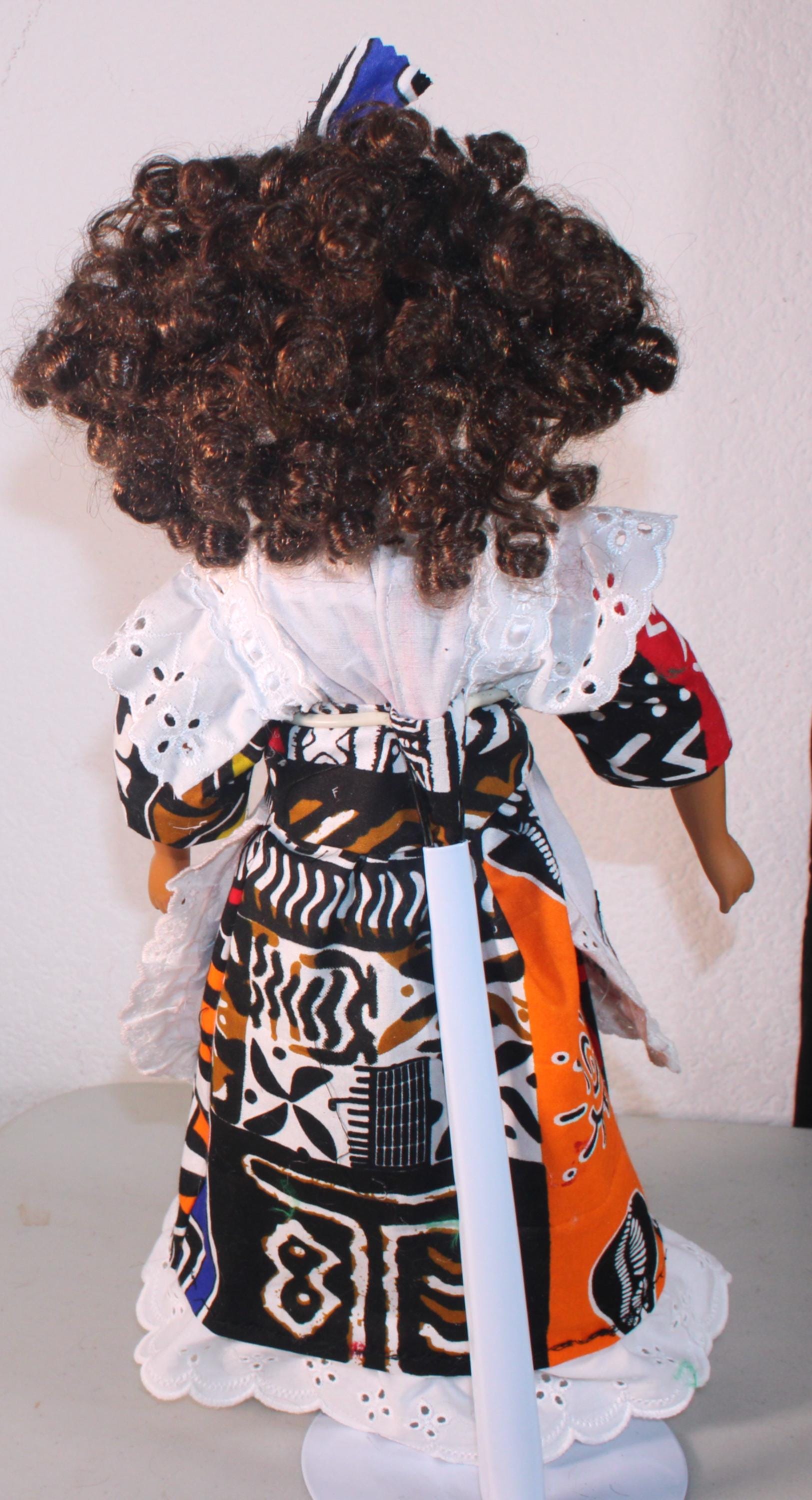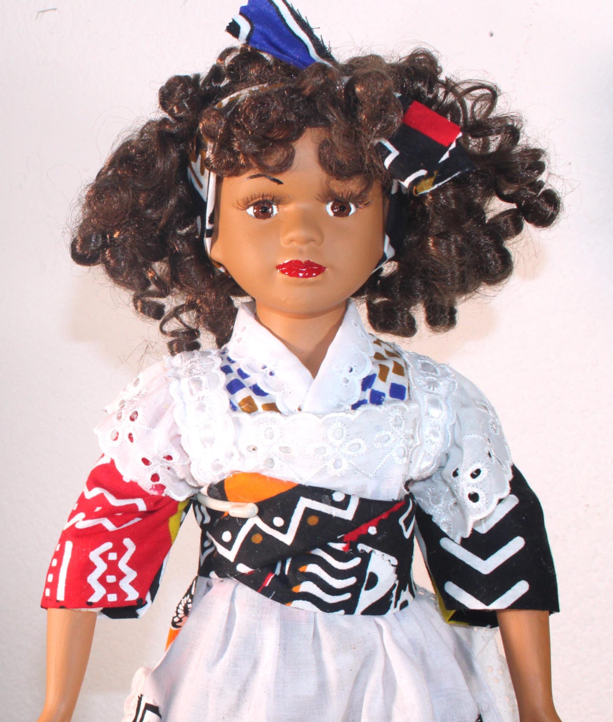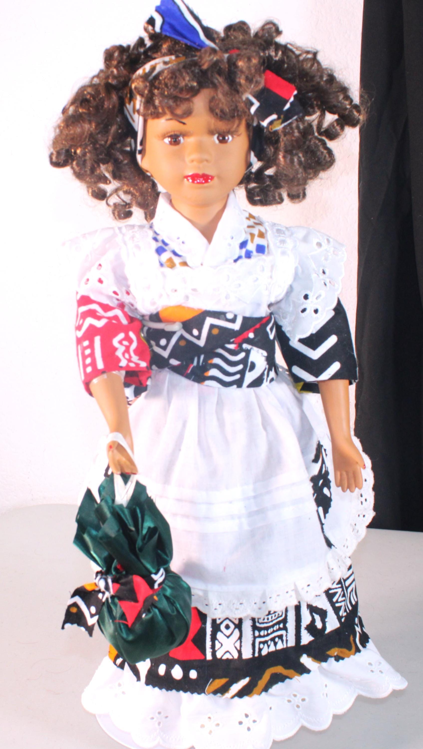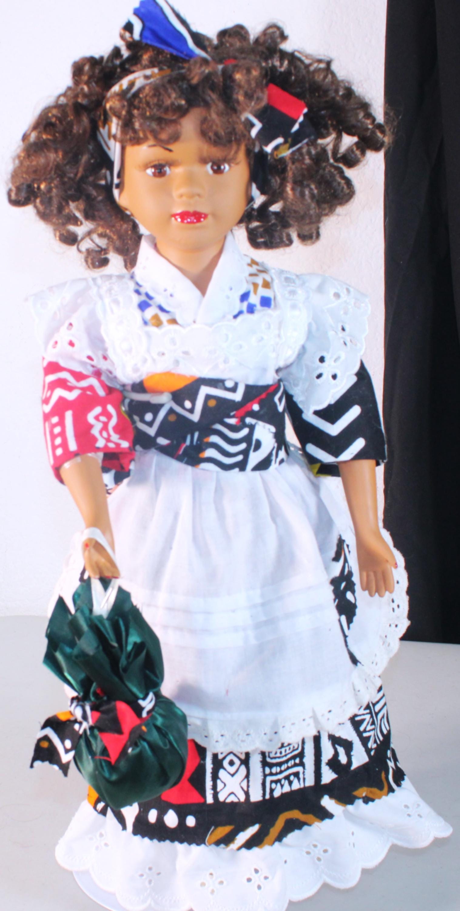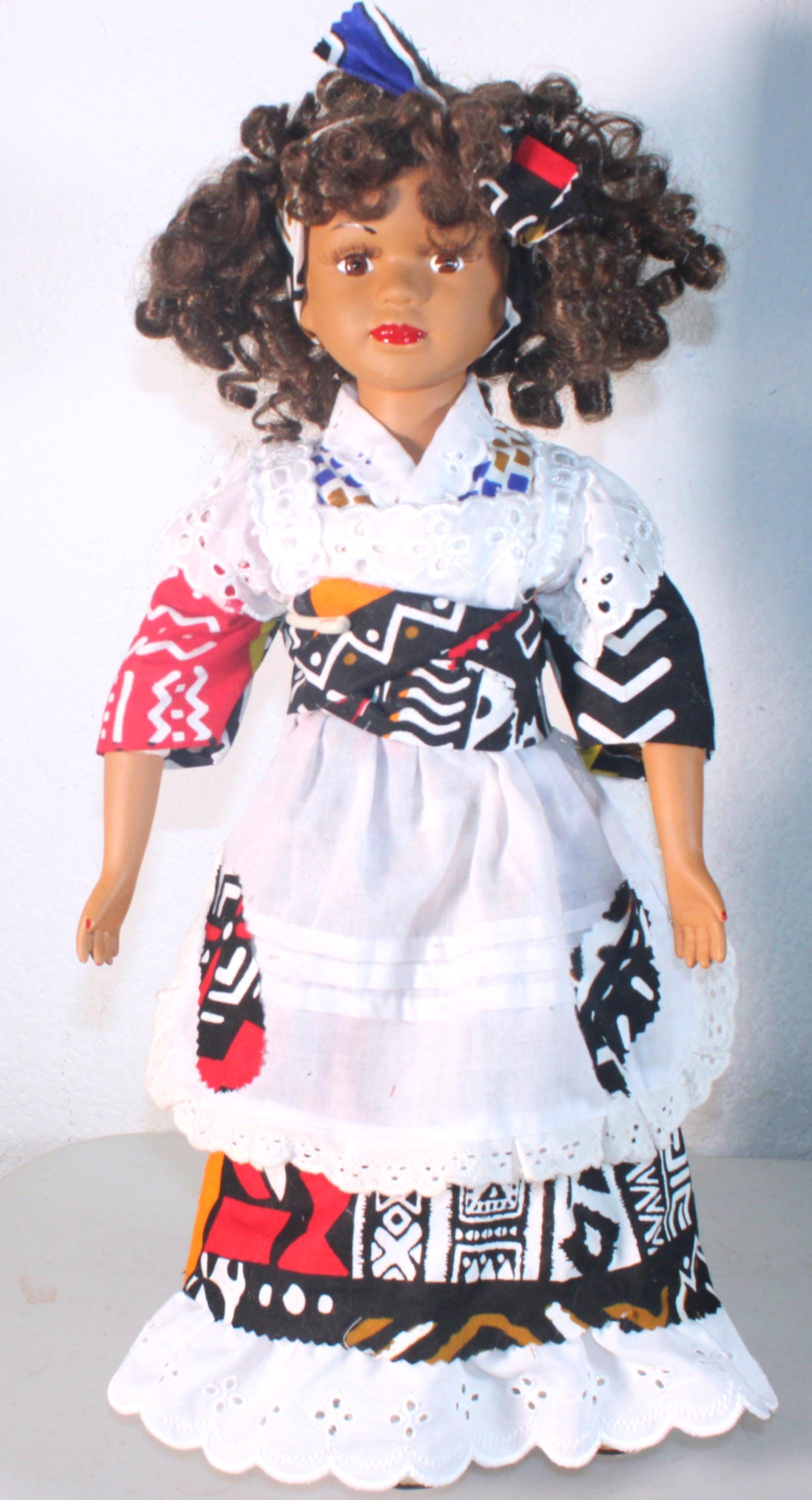 JUJI.... An African name that means: One who is greatly loved. She is a 17" African American Porcelain Doll dressed in an ethnic inspired ensemble trimmed with white eyelet pinafore. Matching shoes, socks and satchel. Dark brown curly to hair with headband. Made of handpainted porcelain and fabric.