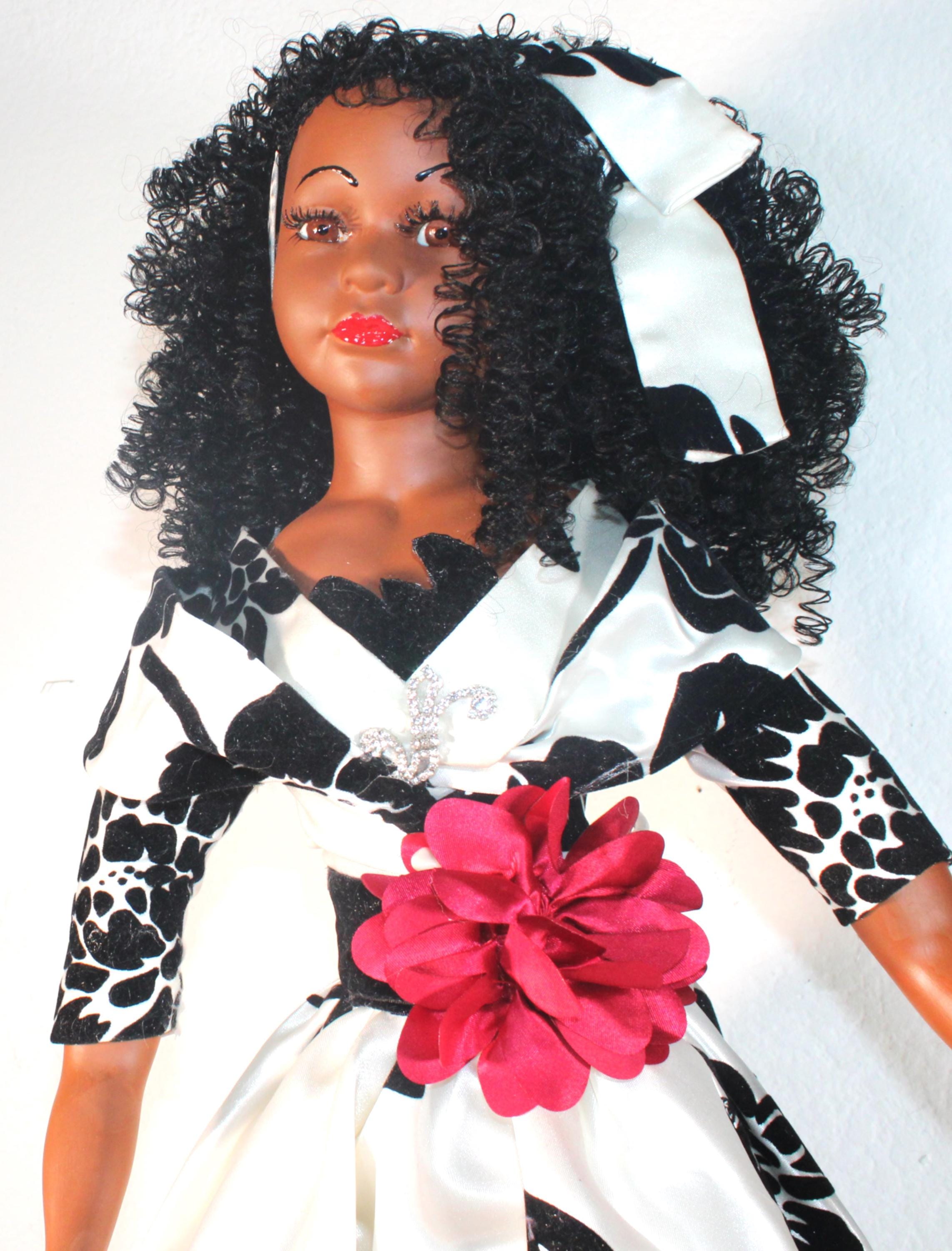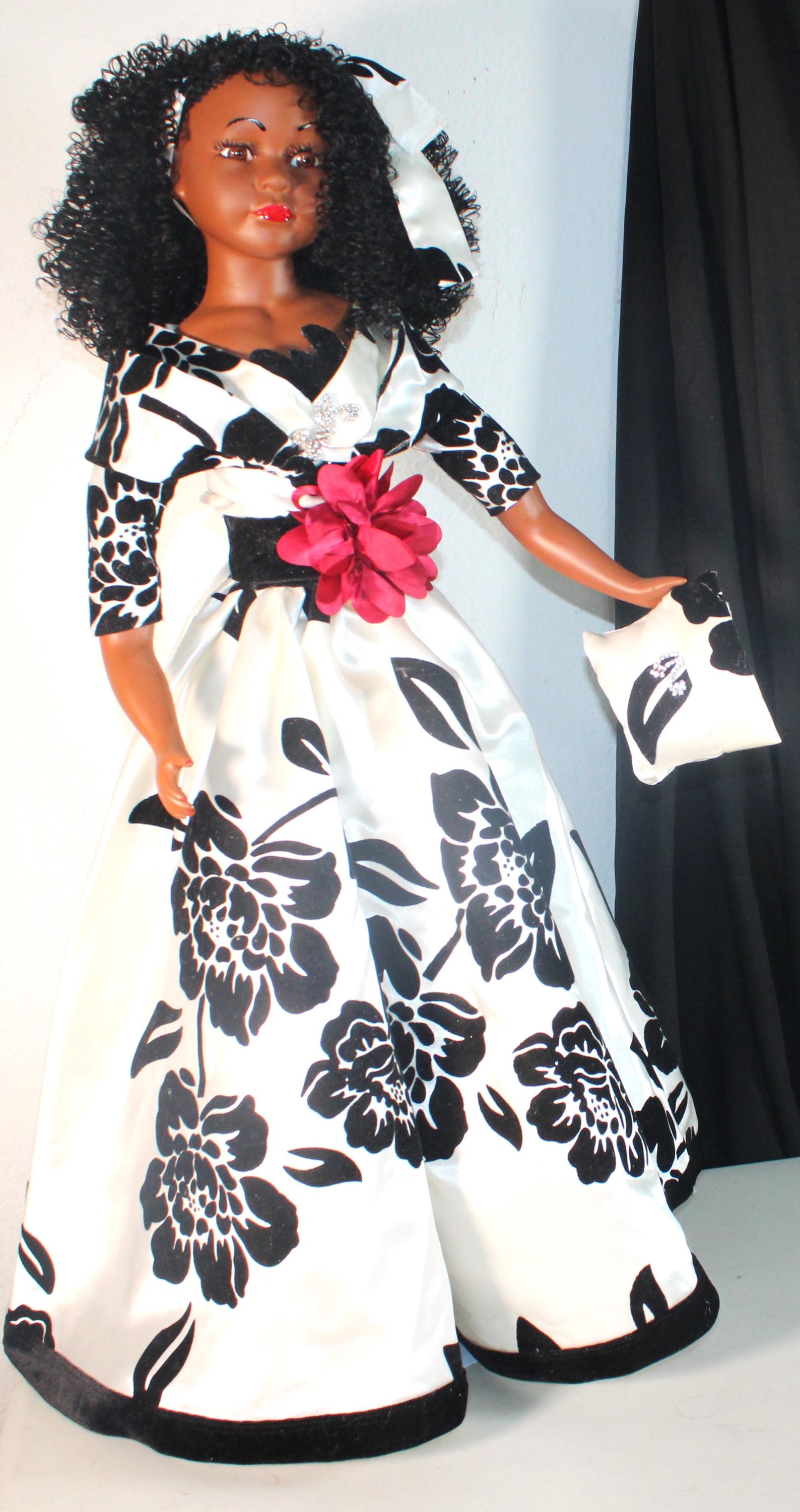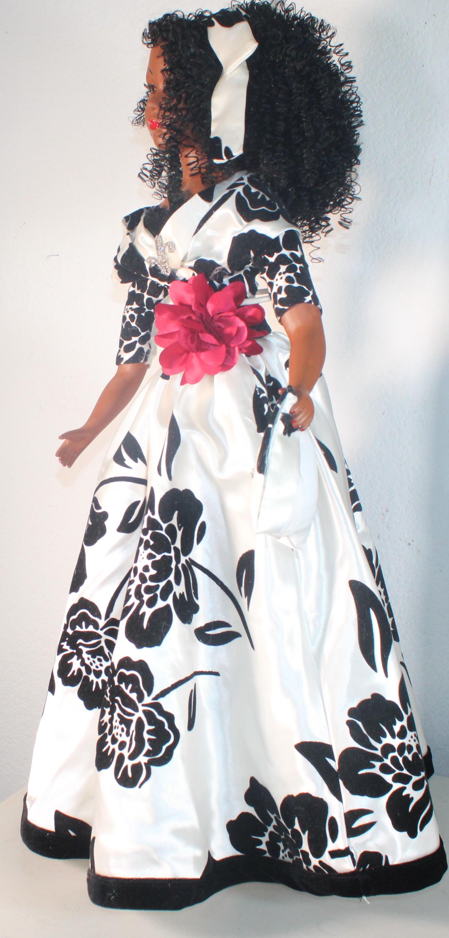SALINA.. A very VERY tall 29" Porcelain African American doll. Dressed in a beautiful black and white party dress, accented with a large red flower at waist. Off the shoulder neckline to top bodice top with a full skirted bottom. Long coiled curly hair topped with a matching headband. Handbag in hand. Big beautiful brown eyes. Made of handpainted porcelain and fabric. Sure to add glamour and class to your doll collection.