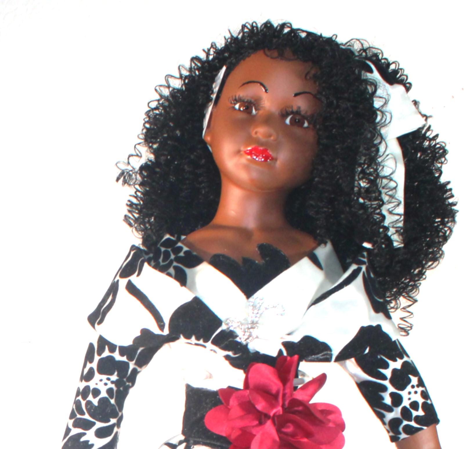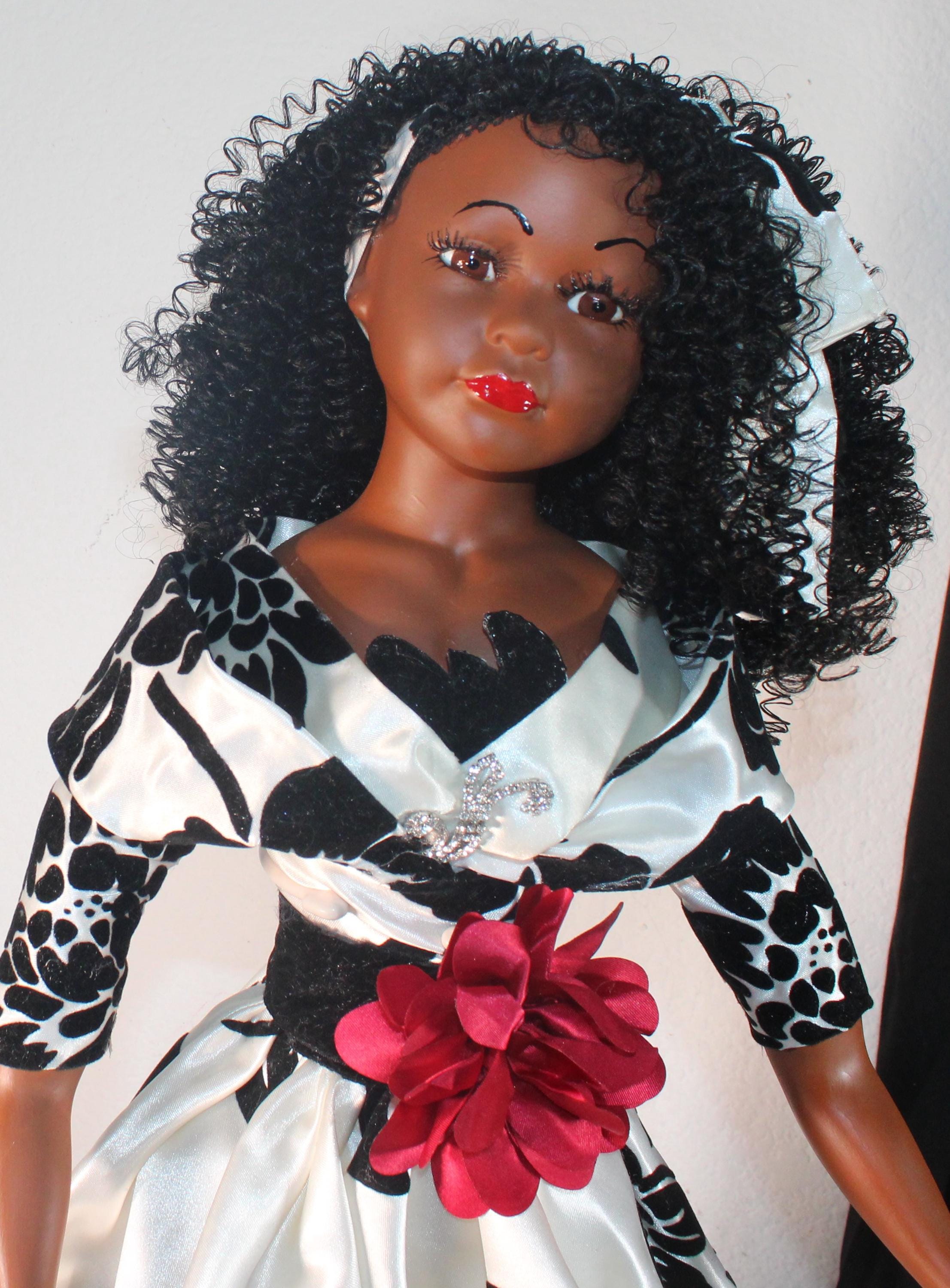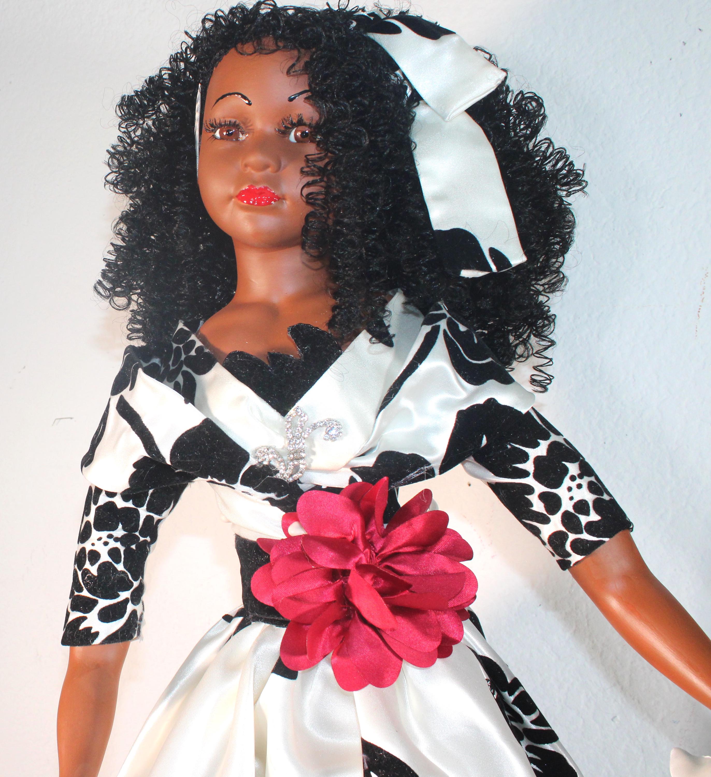 SALINA.. A very VERY tall 29" Porcelain African American doll. Dressed in a beautiful black and white party dress, accented with a large red flower at waist. Off the shoulder neckline to top bodice top with a full skirted bottom. Long coiled curly hair topped with a matching headband. Handbag in hand. Big beautiful brown eyes. Made of handpainted porcelain and fabric. Sure to add glamour and class to your doll collection.
