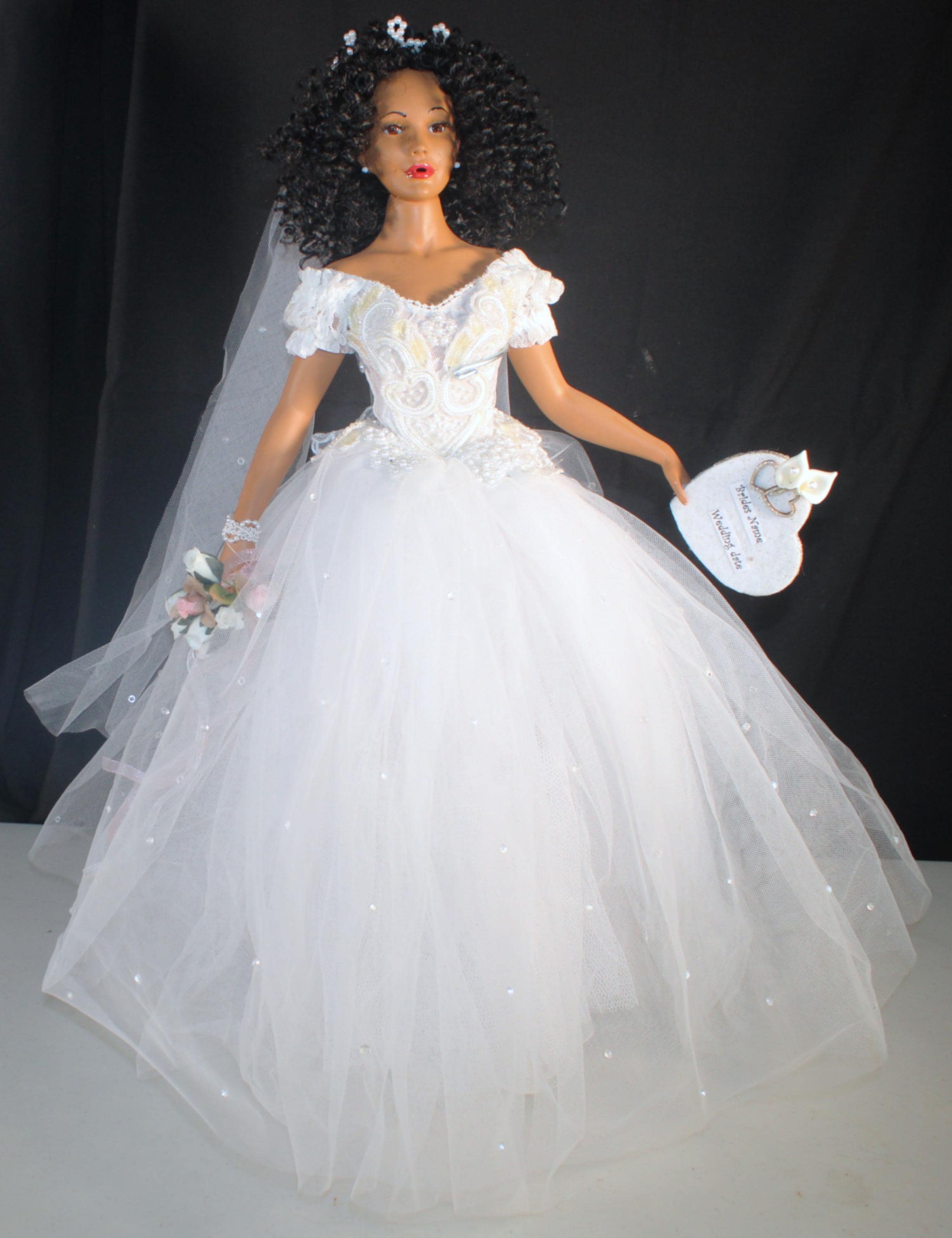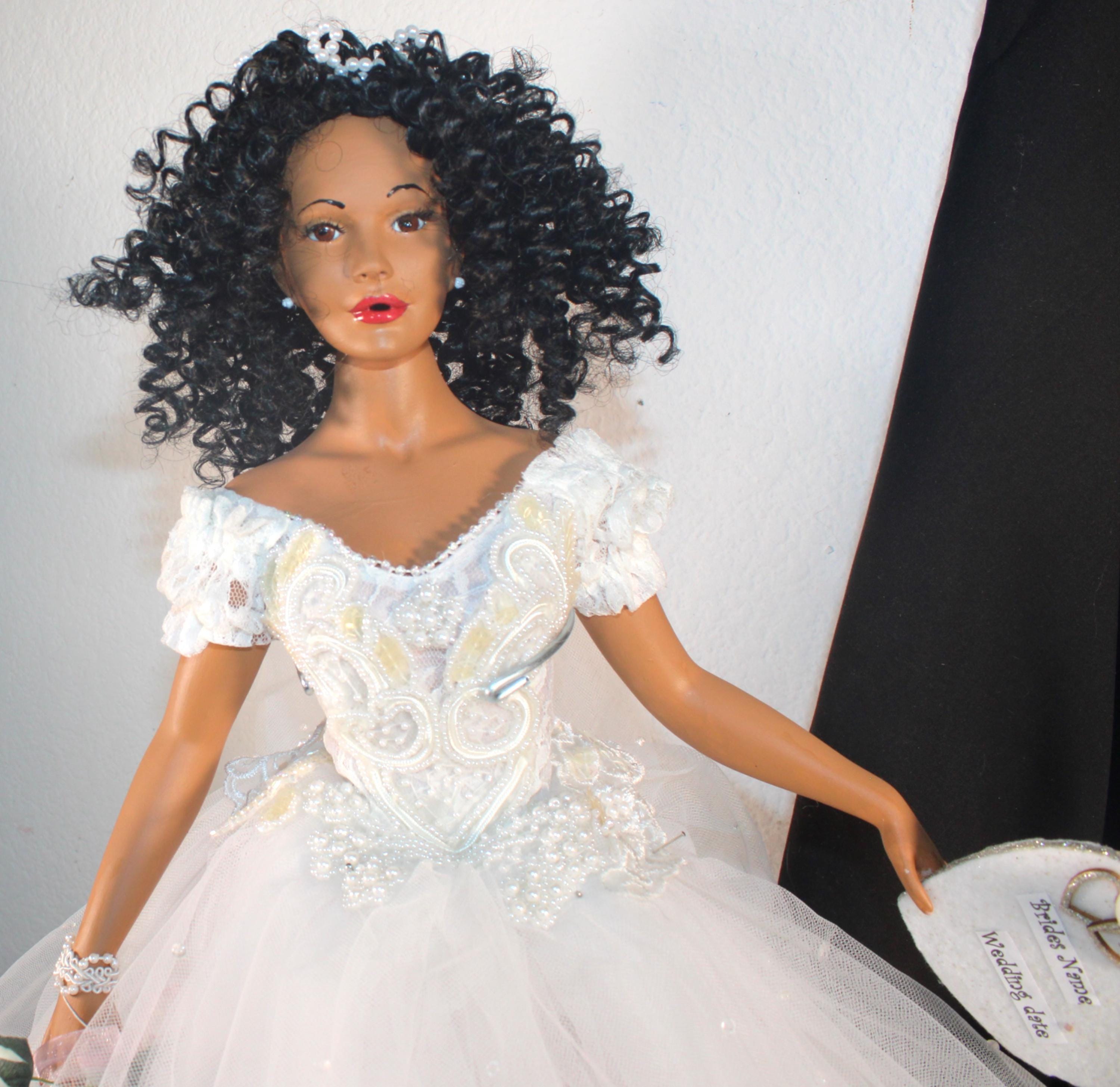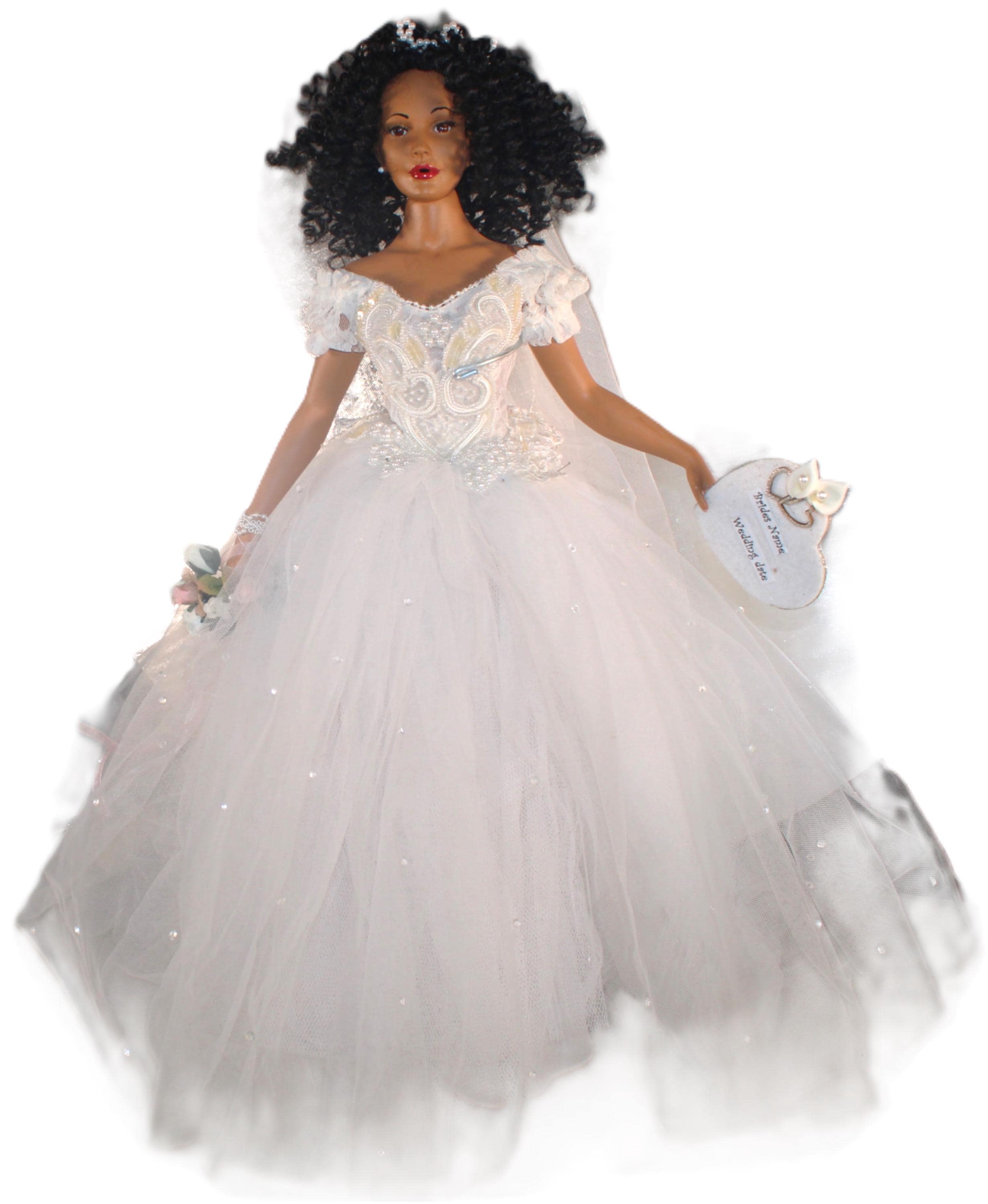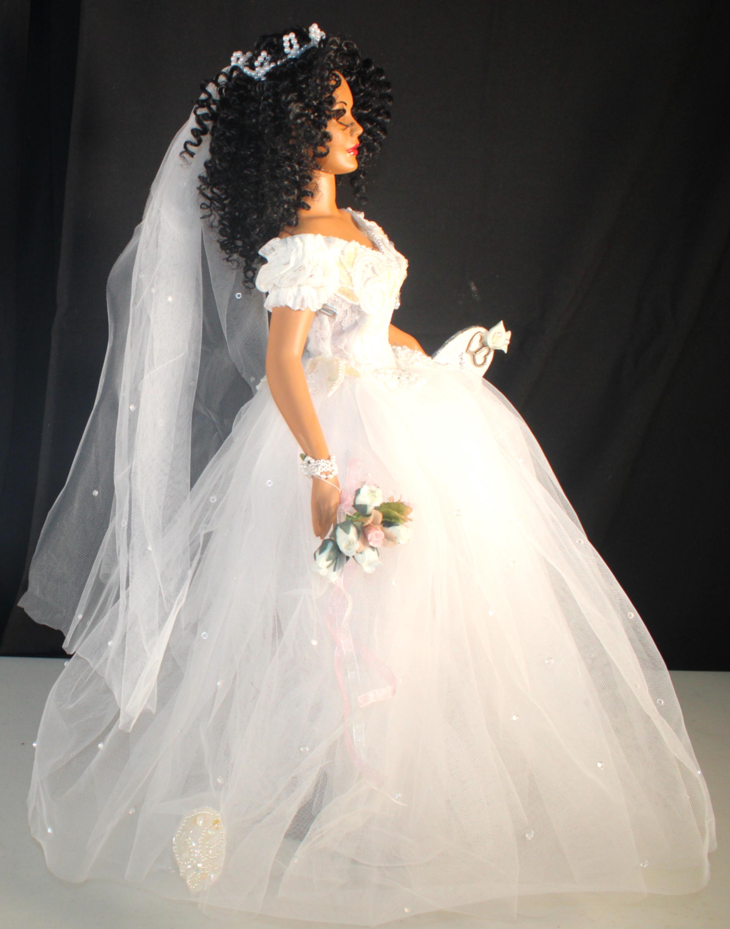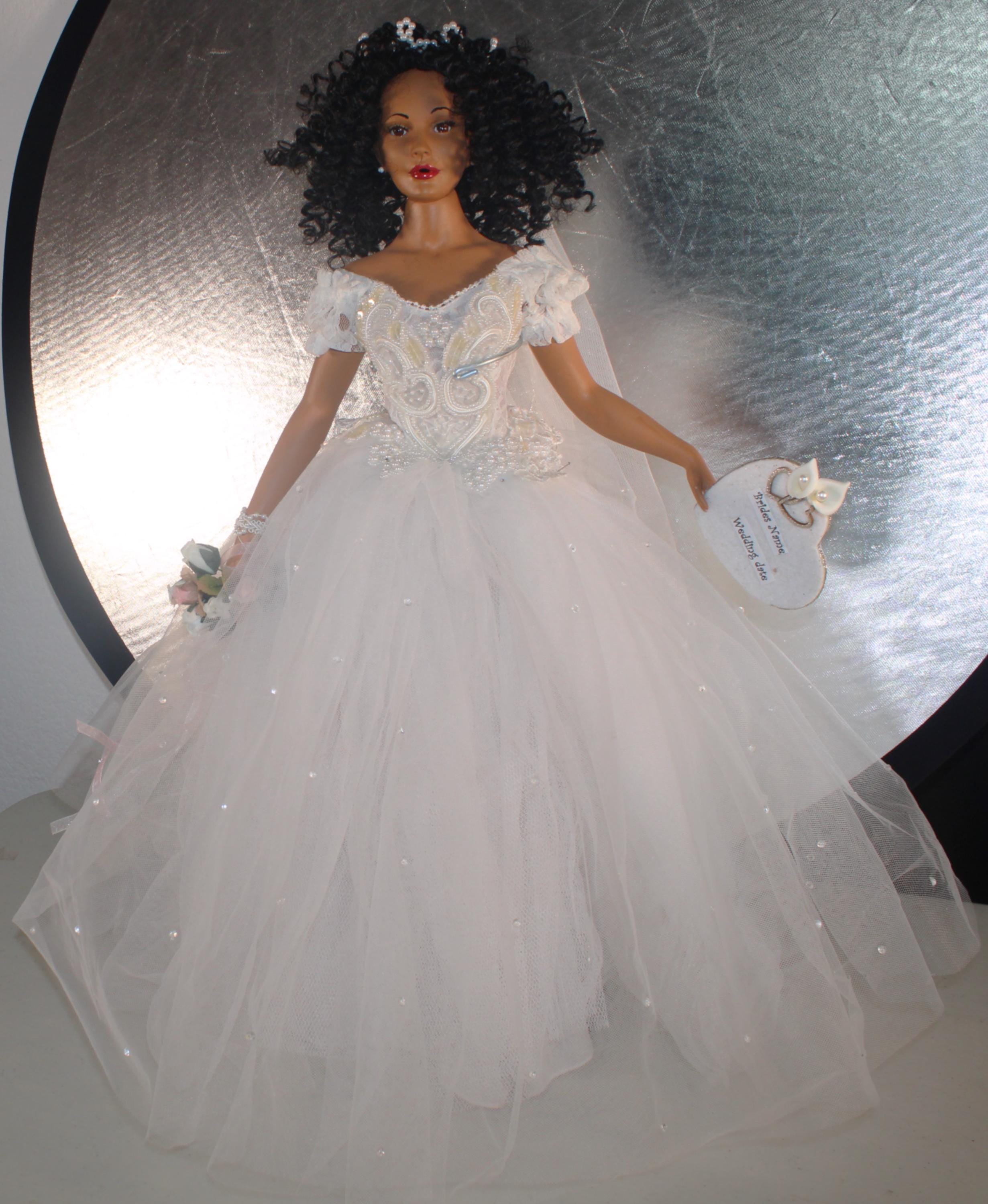 LYRIC....An 18" African American Porcelain commemorative bridal doll with the DATE TO BE REMEMBERED. Dressed in a beautiful white off the shoulder beaded gown and holding a heart that will be personalized with your brides name and the date of her wedding. A perfect shower/wedding gift for the bride who has everything. Made of handpainted porcelain and fabric. Long black kinky curly hair adorned with a beaded floral head piece and veil.